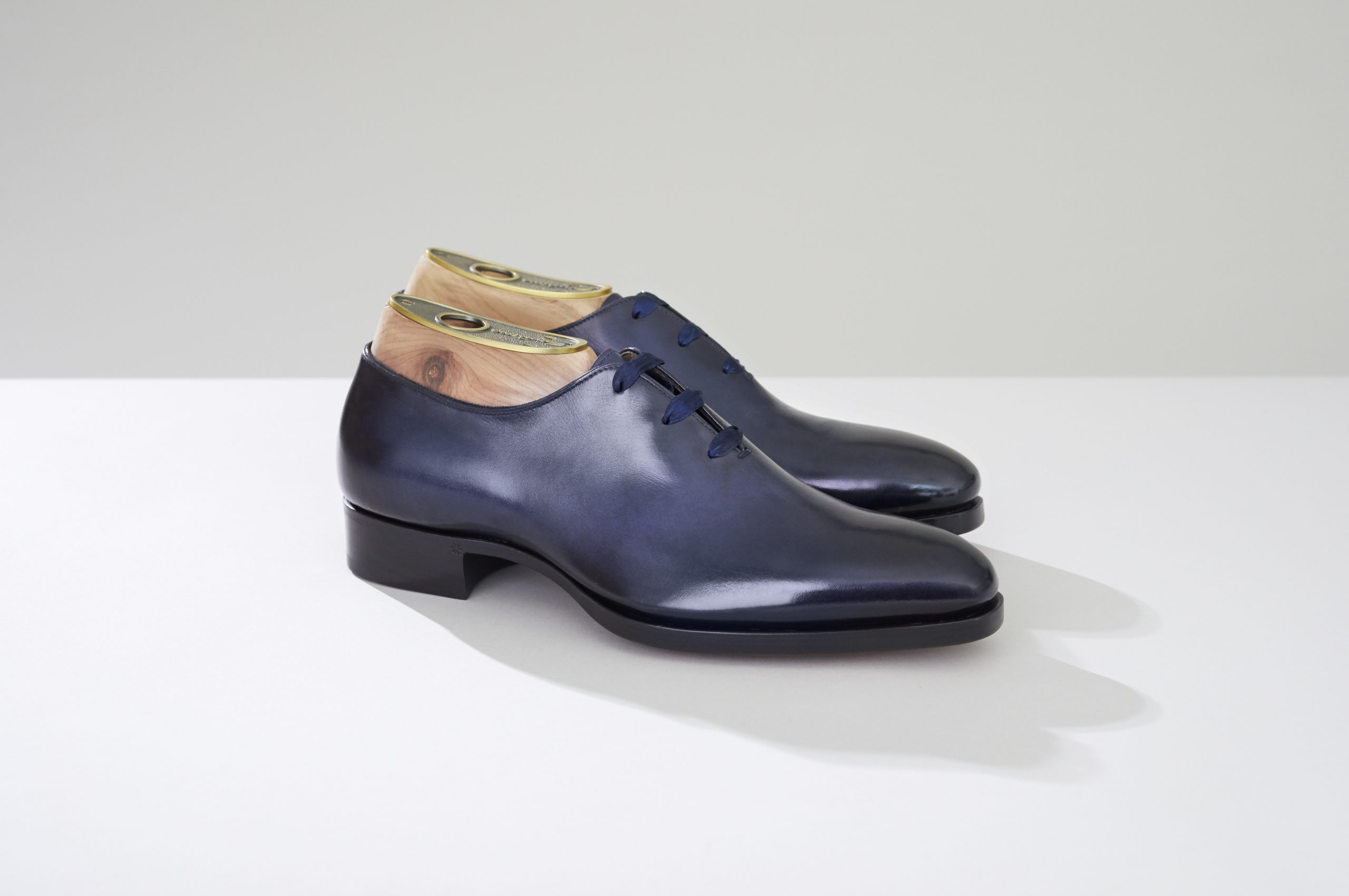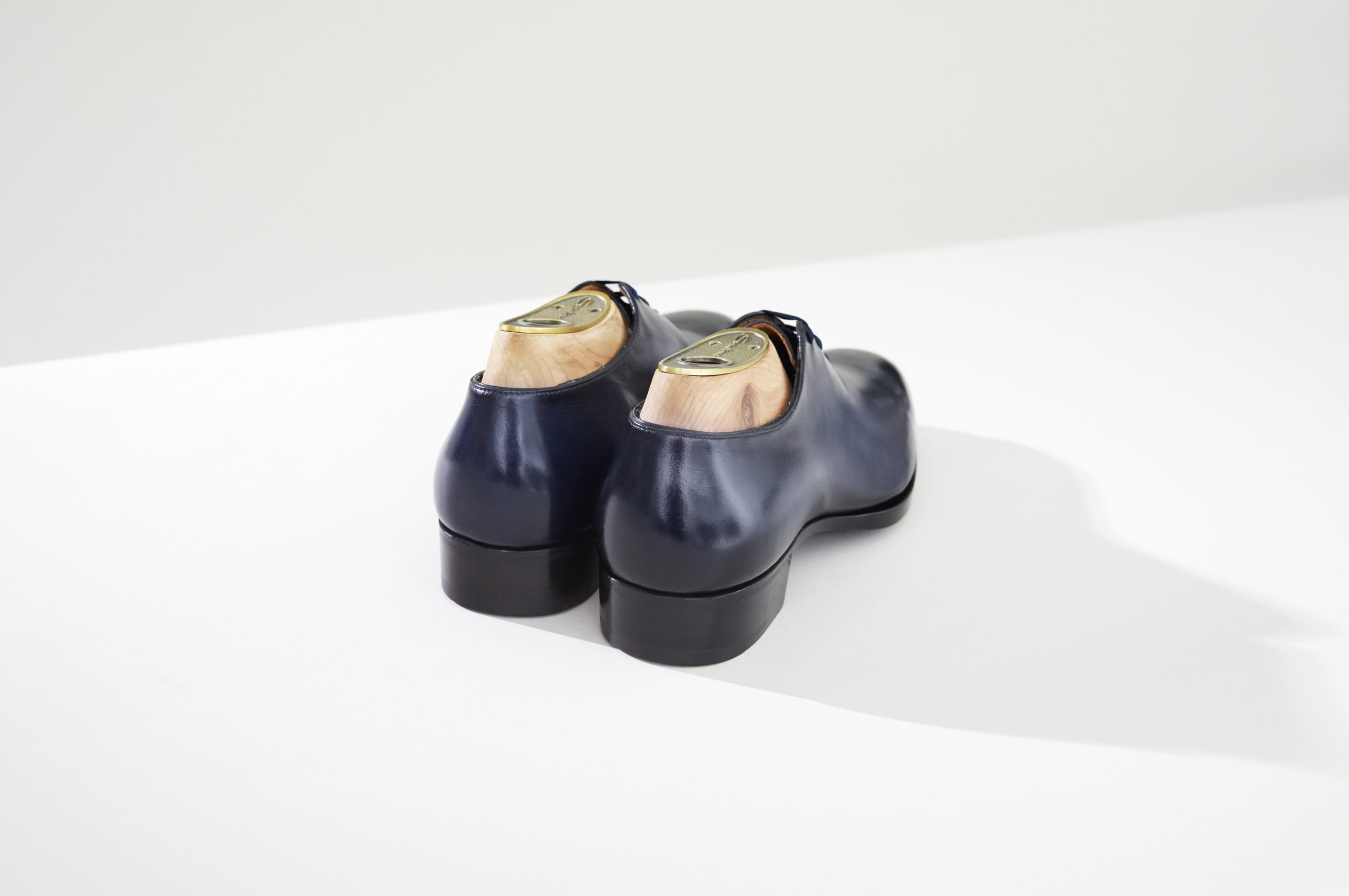Ses techniques de construction sont fermement ancrées dans le savoir-faire sur mesure typique, et il présente des finitions spécifiques, y compris le contrefort et la pointe du talon en cuir pur, la construction Goodyear cousue faite à la main et bien sûr la patine sur le cuir de veau fin.