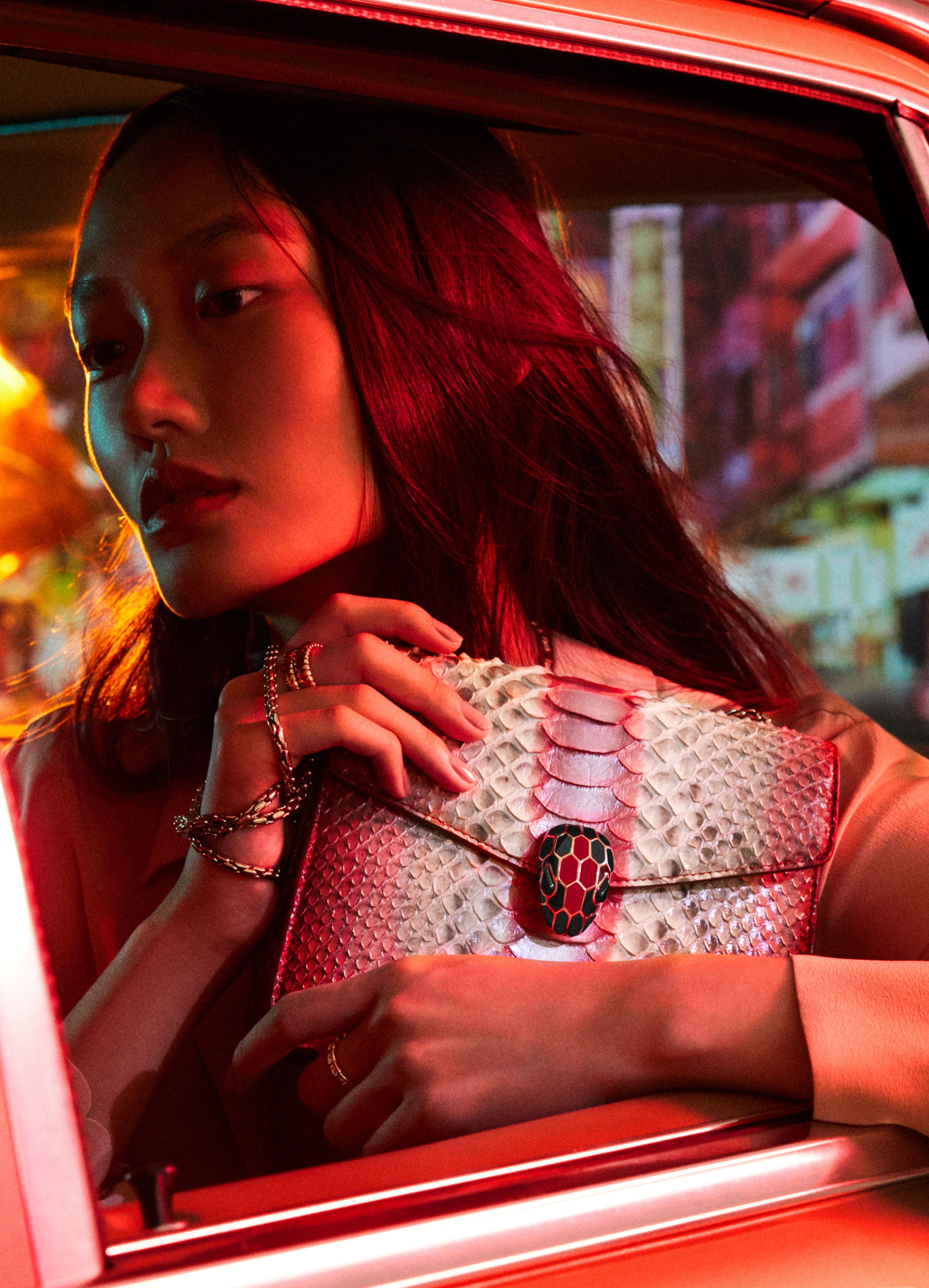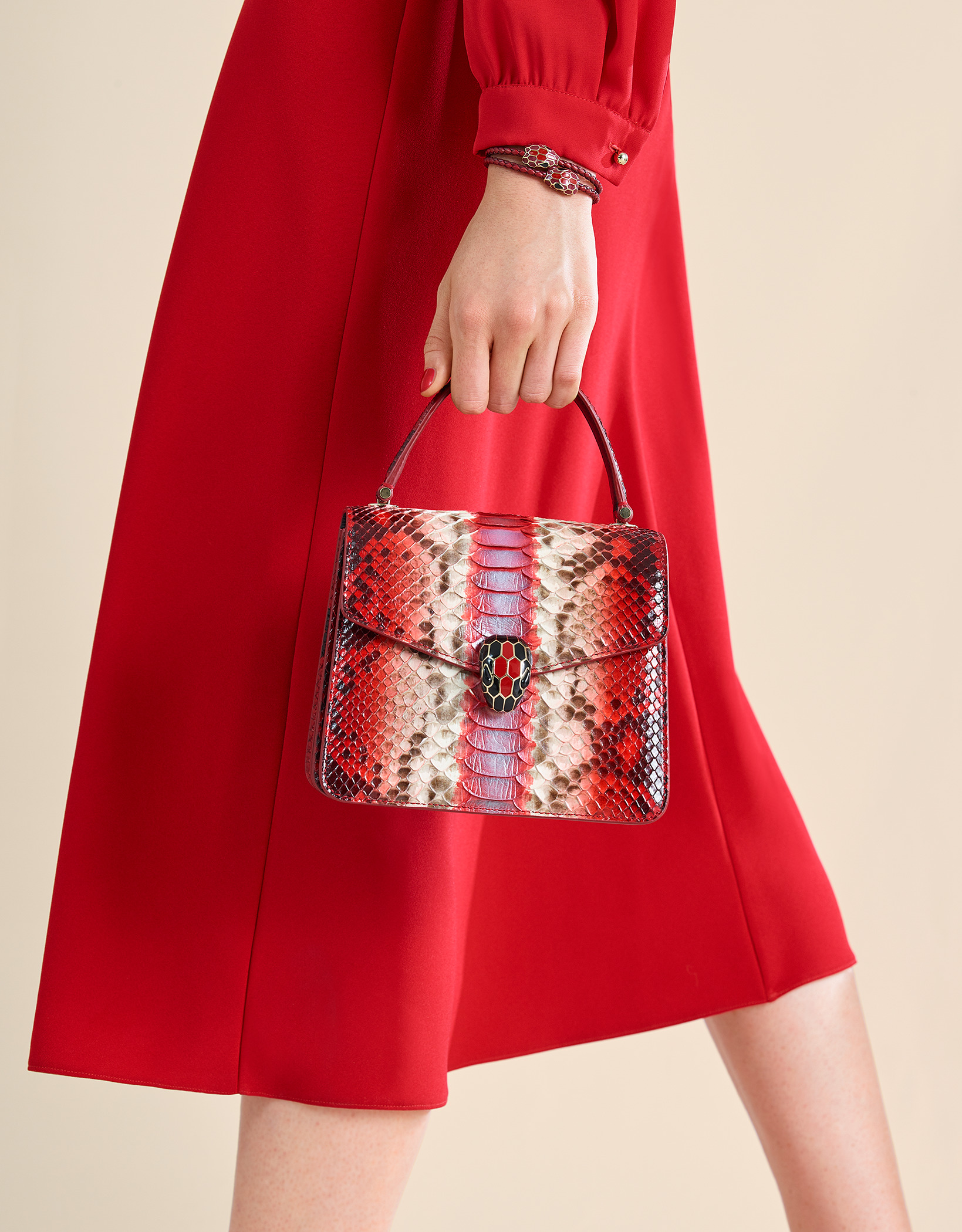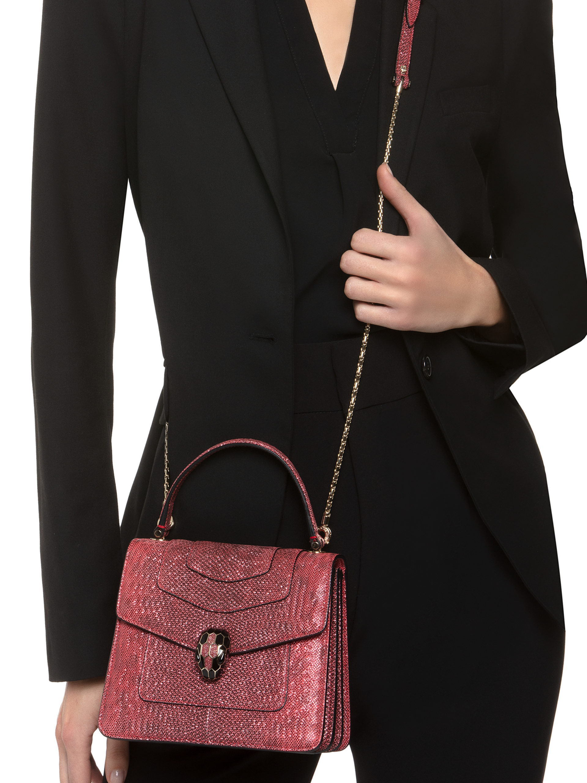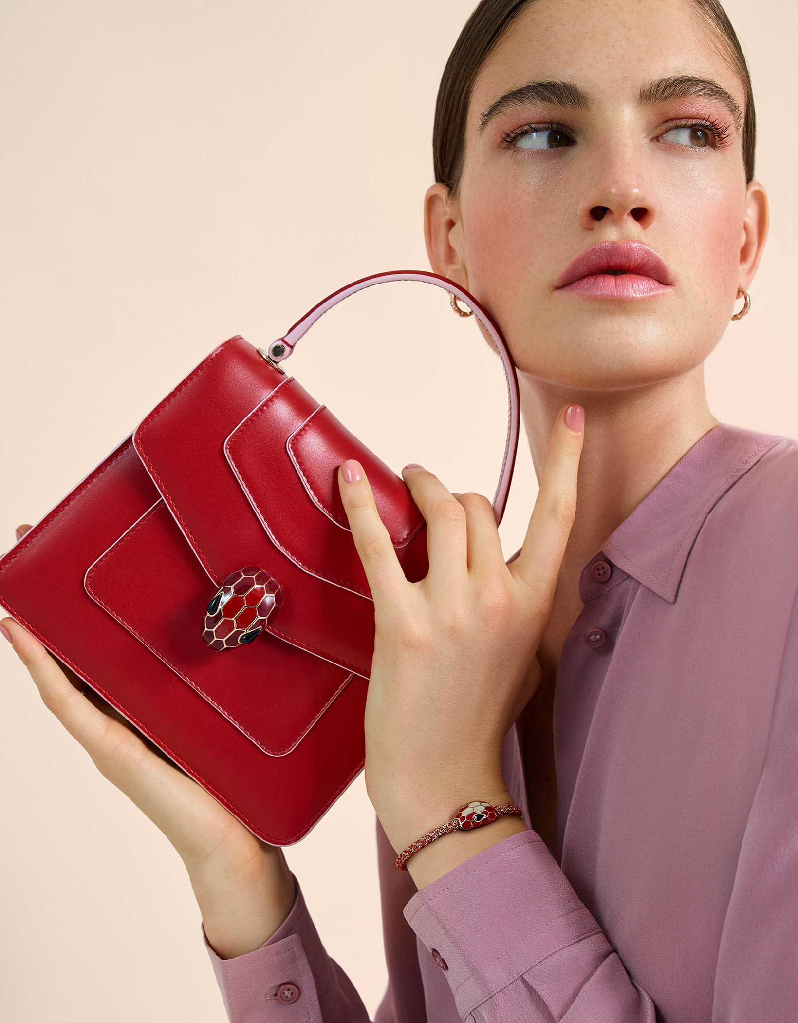 Le karung métallique coloris Ruby Red ainsi que le Shiny karung coloris Carmine Jasper font également leur apparition sur les modèles Serpenti Forever, illuminant d’une touche métallique rouge les formes iconiques de sacs Bvlgari.
