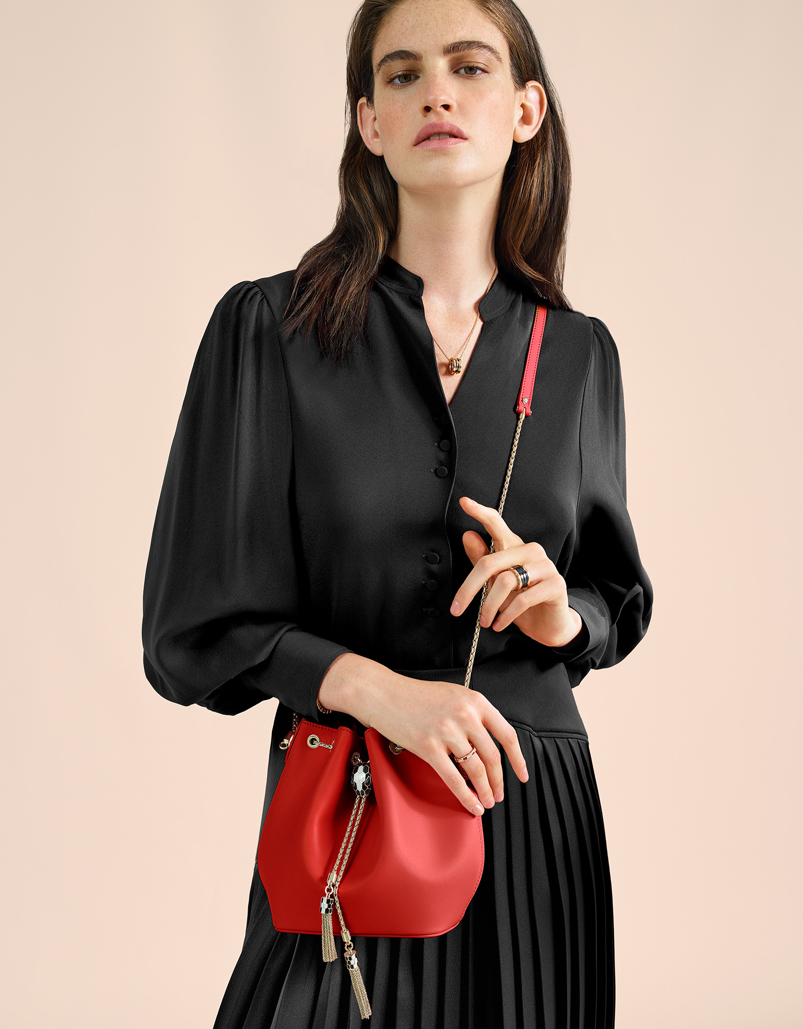 Lui aussi sublimé de couleurs éclatantes, le sac seau Serpenti Forever en cuir ultra-souple, est à la fois pratique et élégant. Disponible en cuir de veau couleur Flash Amethyst et couleur Carmine Jasper, ces deux tonalités rouges infusent une touche moderne à ce modèle retro-chic.