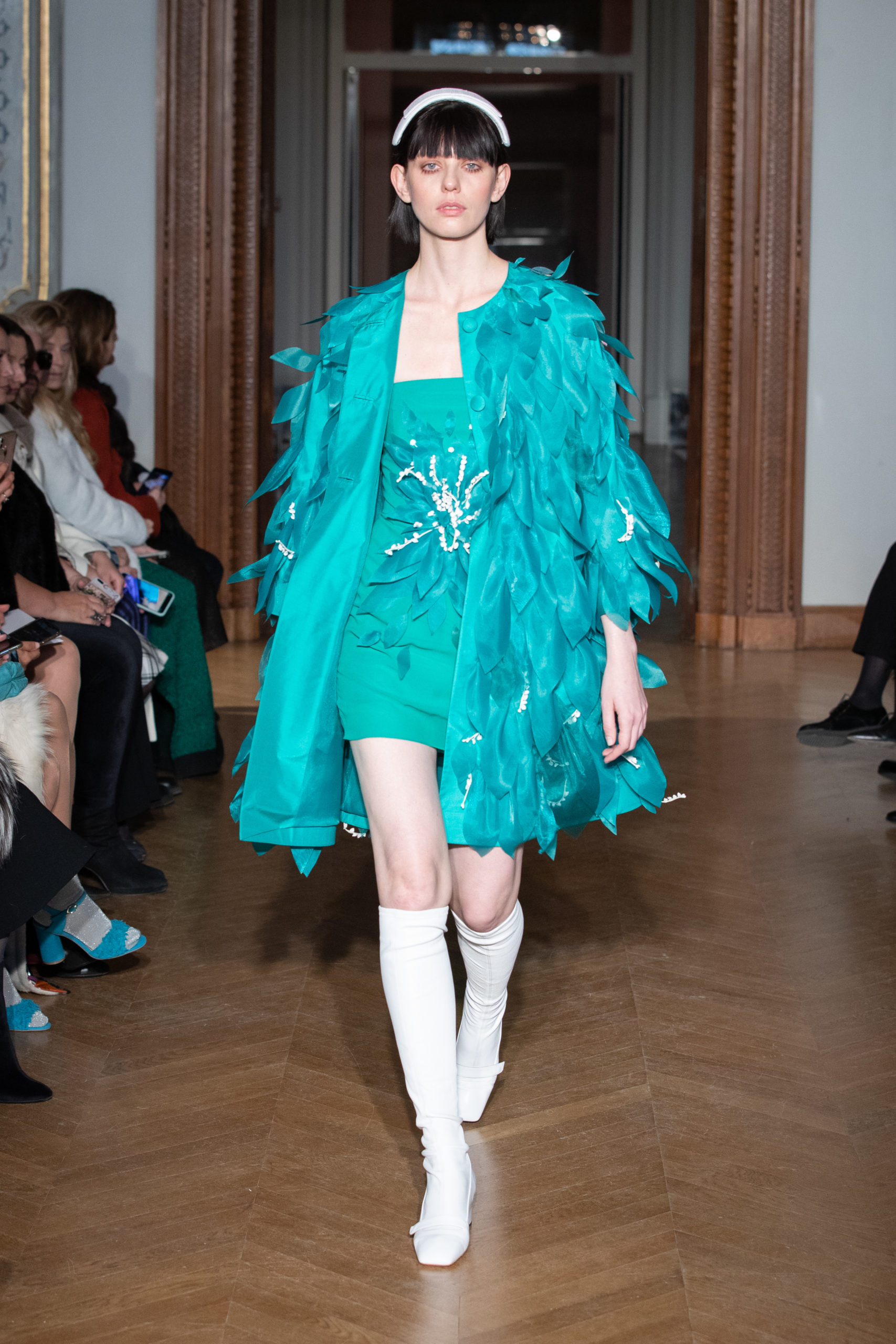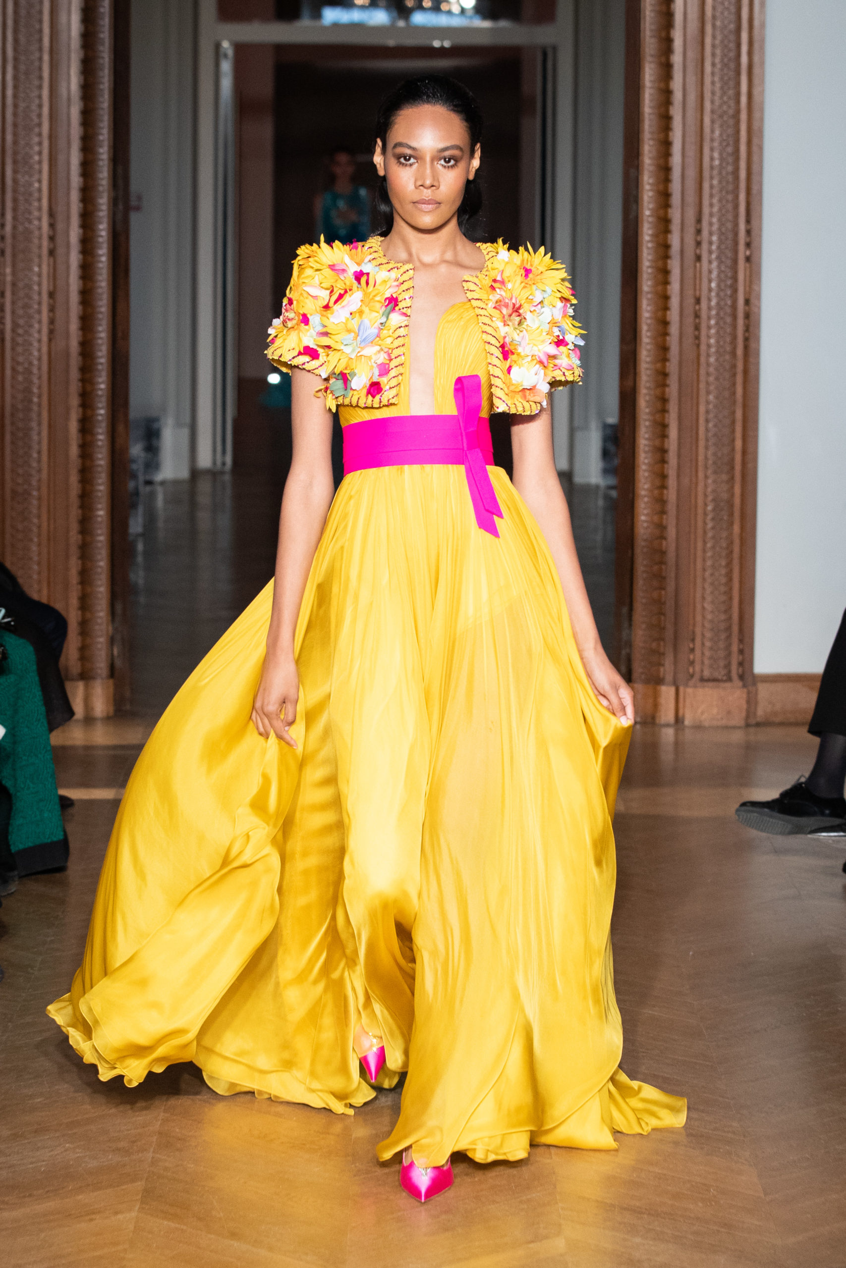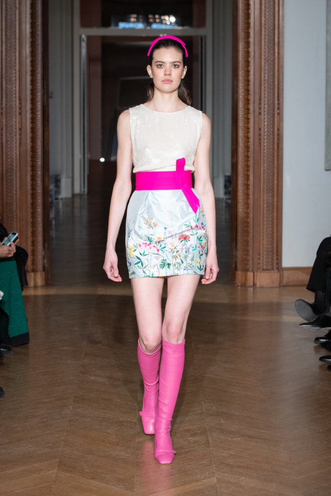 La créatrice Yulia Yanina s’éloigne de son style habituel, centré sur le noir et blanc, pour proposer une nouvelle facette de sa vision : à présent, les vêtements prennent vie dans une palette de tons éclatants, à travers des broderies, des motifs floraux ou des plumes extravagantes.