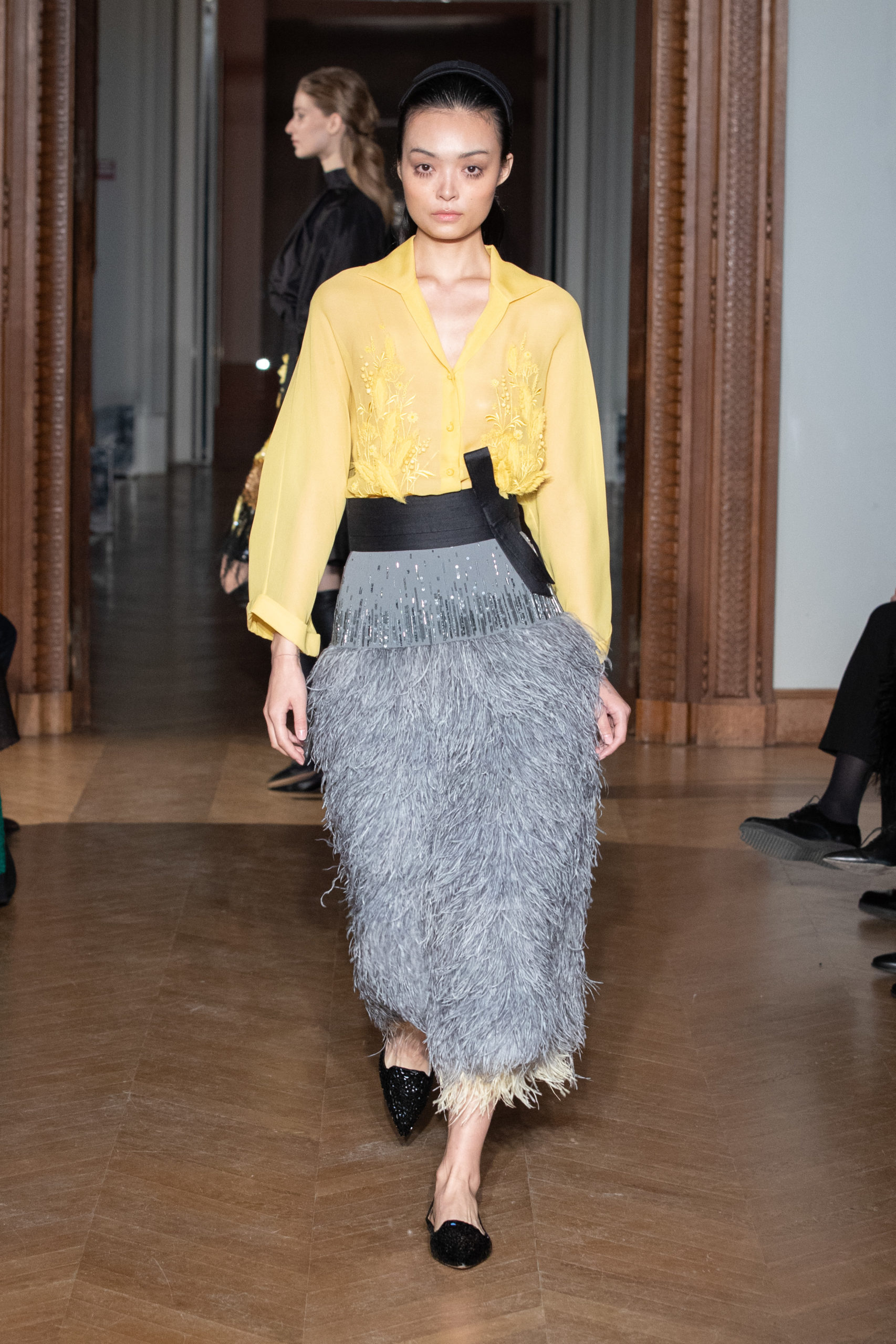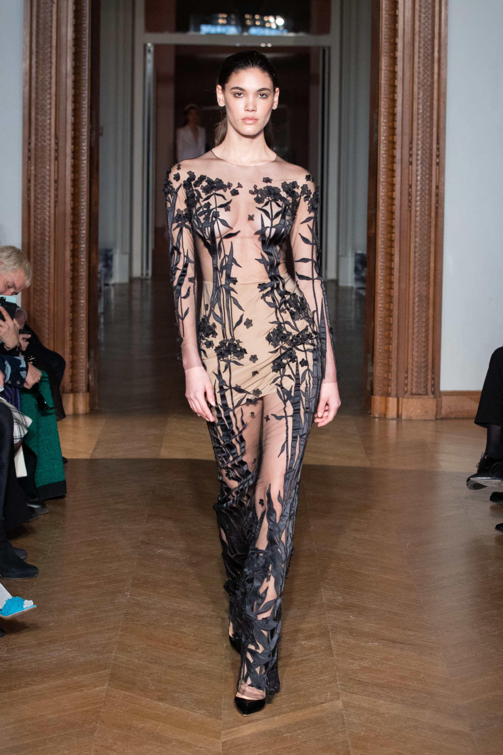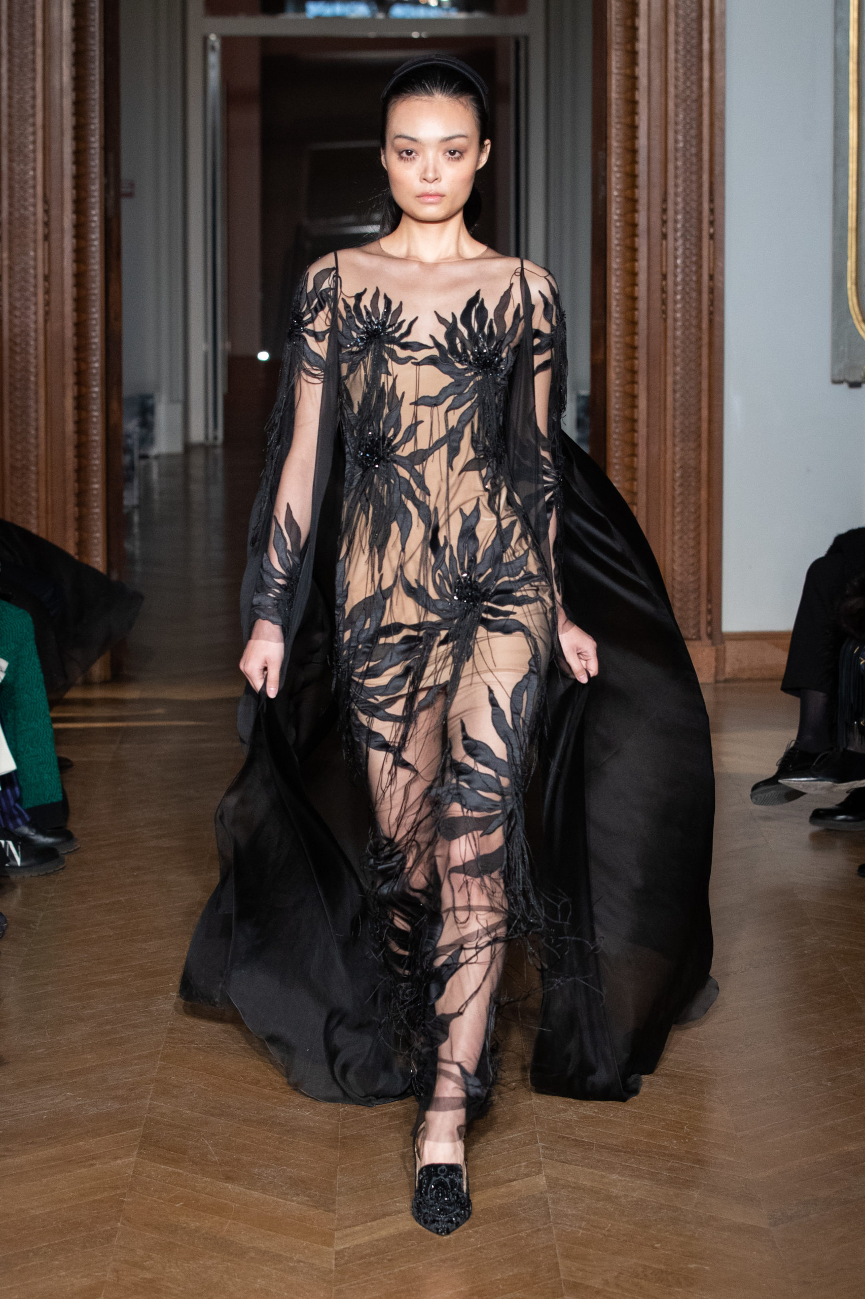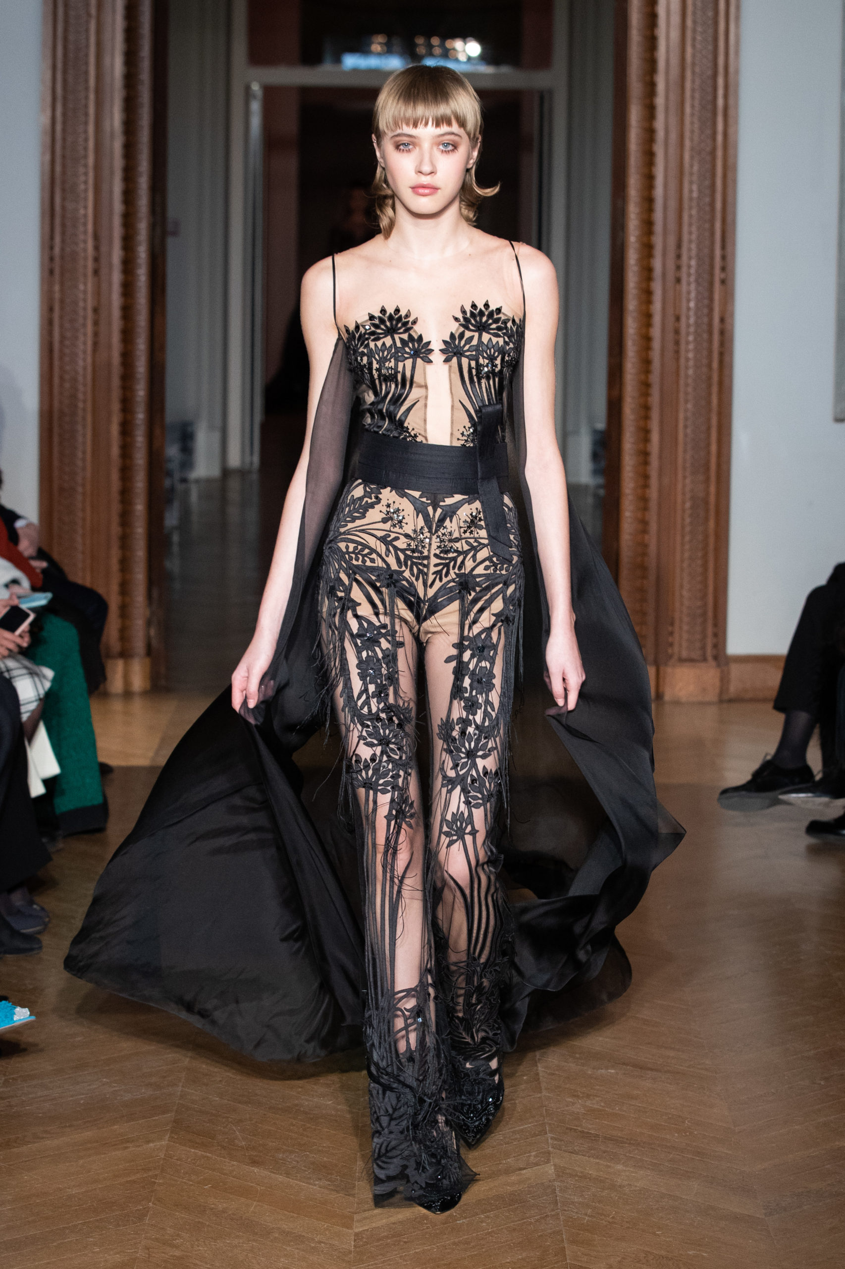 A la fin du défilé, Yanina revient aux pièces classiques de la maison – des robes noires et blanches, avec la célèbre broderie en filigrane.