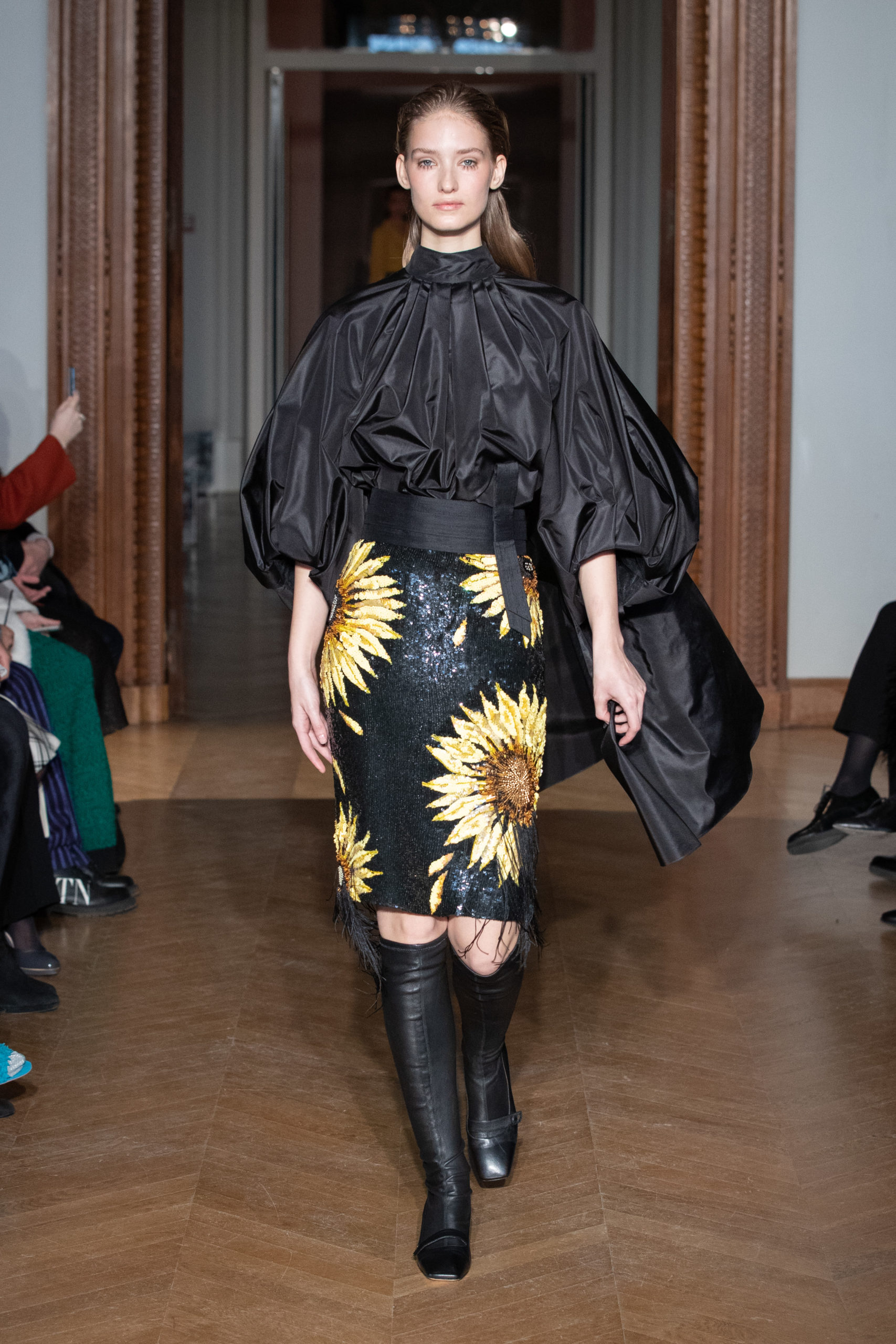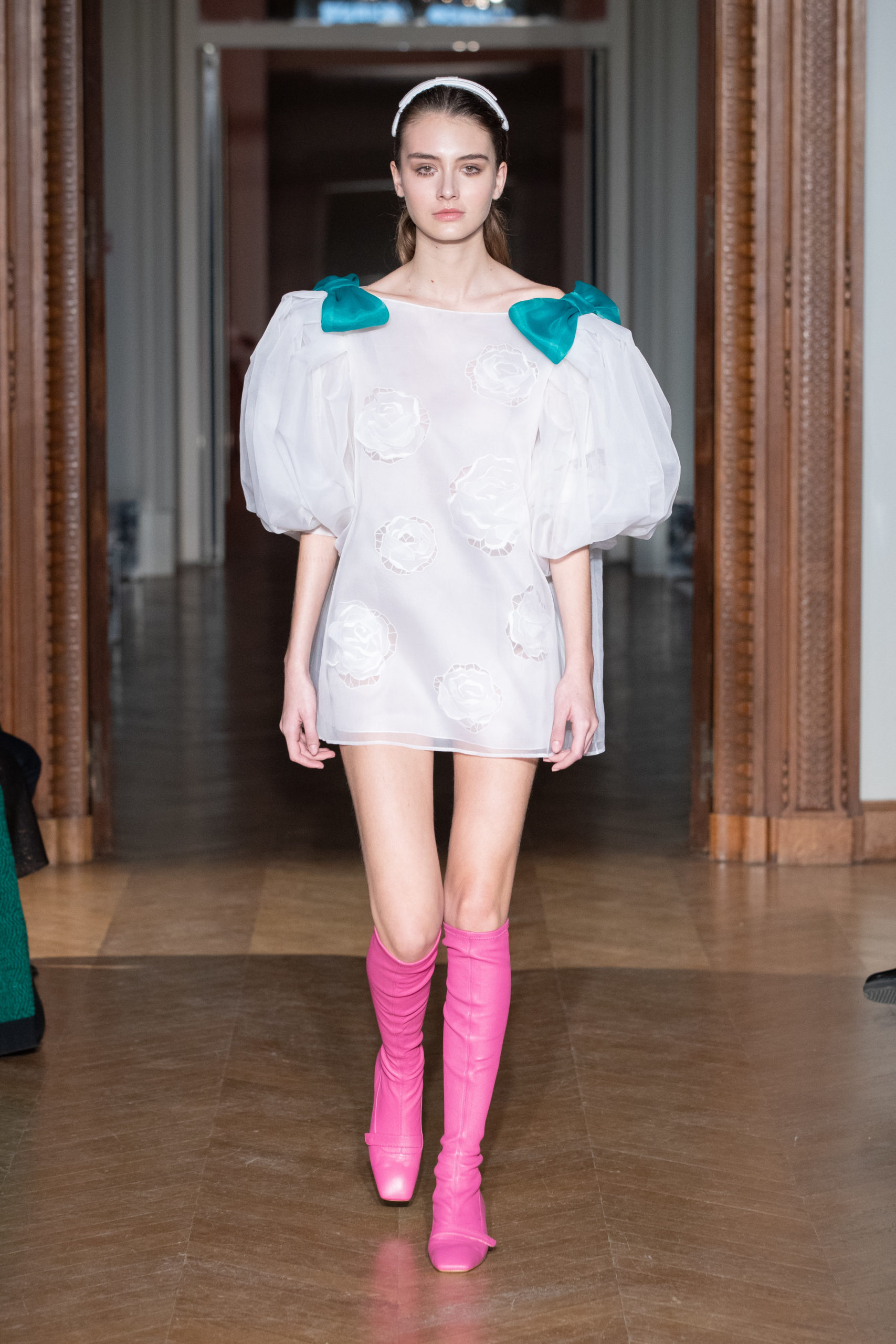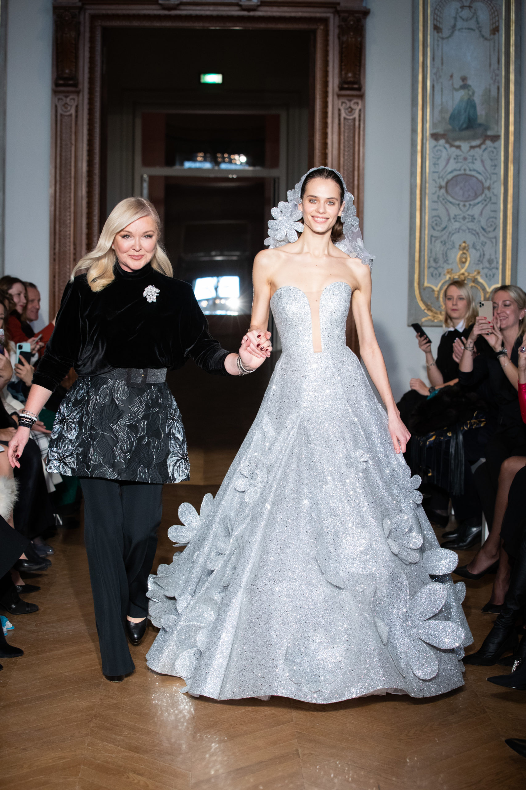 A la fin du défilé, Yanina revient aux pièces classiques de la maison – des robes noires et blanches, avec la célèbre broderie en filigrane.