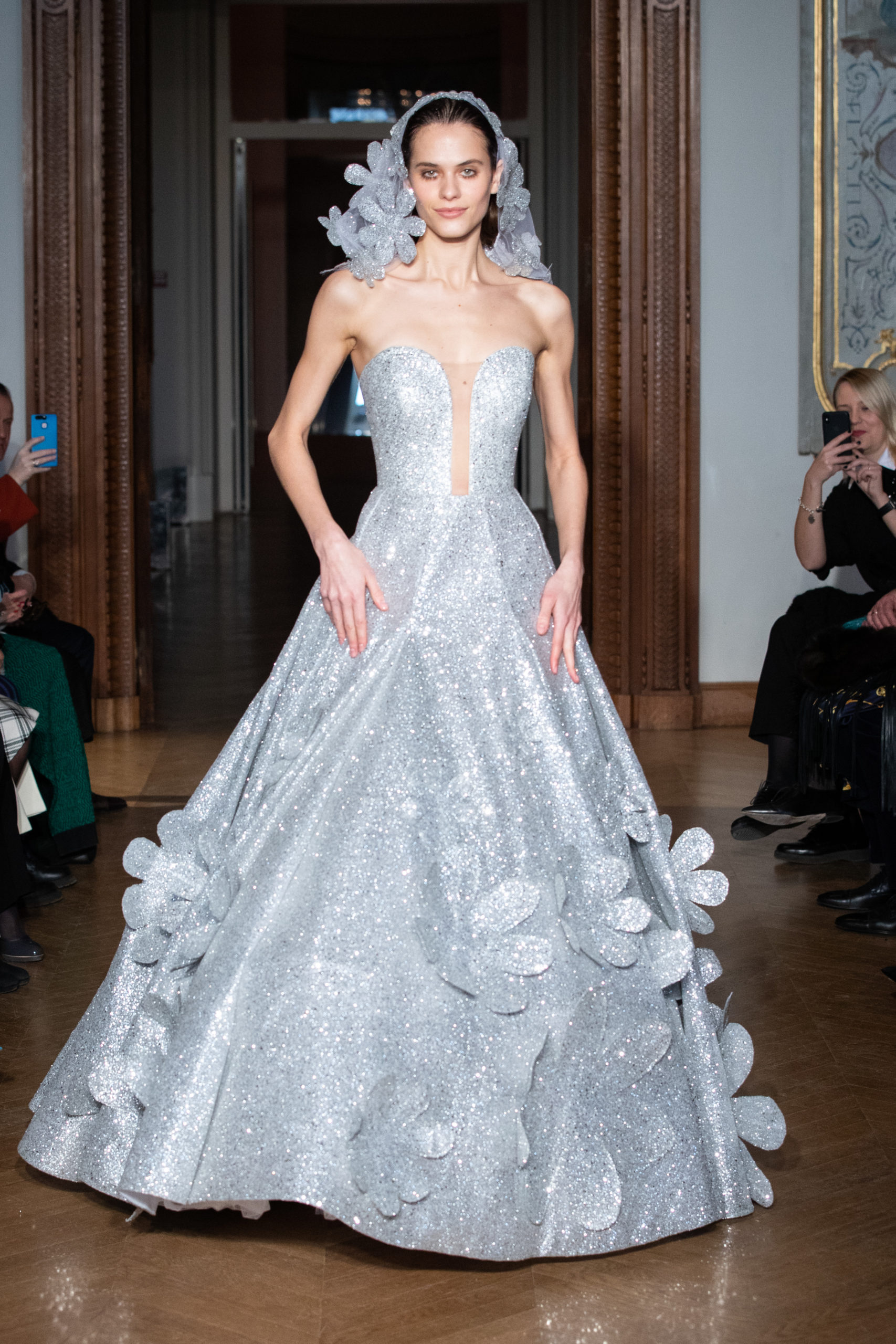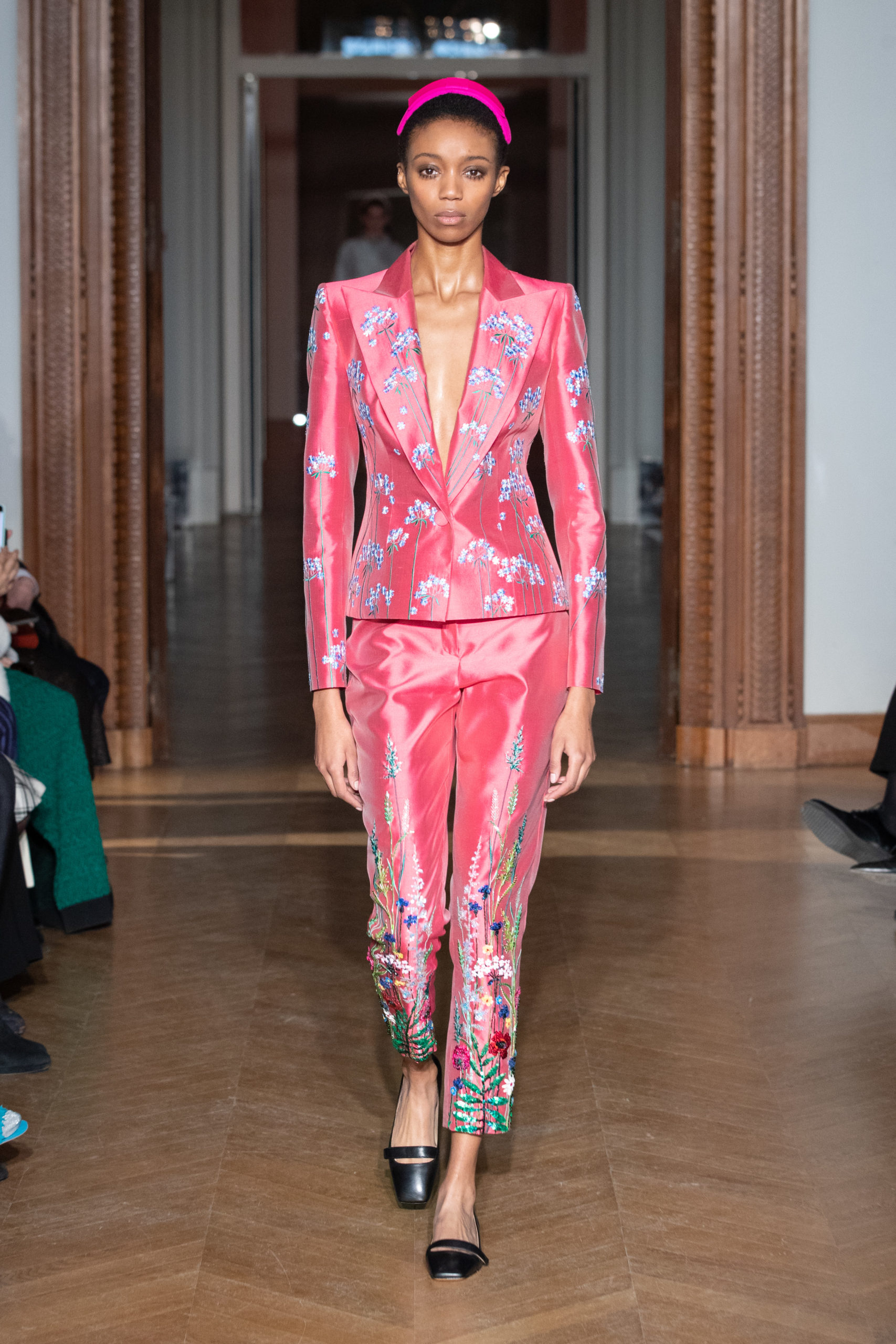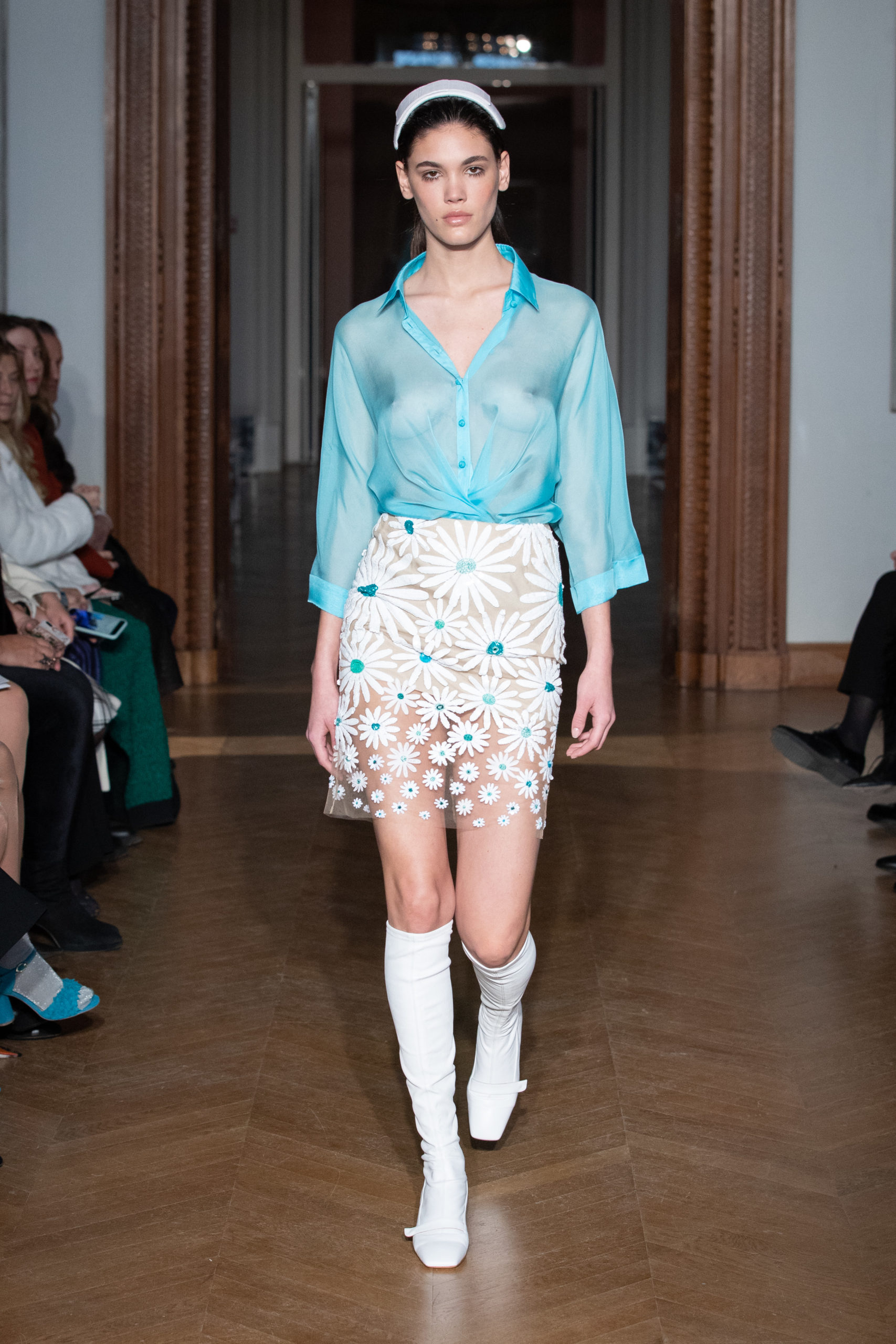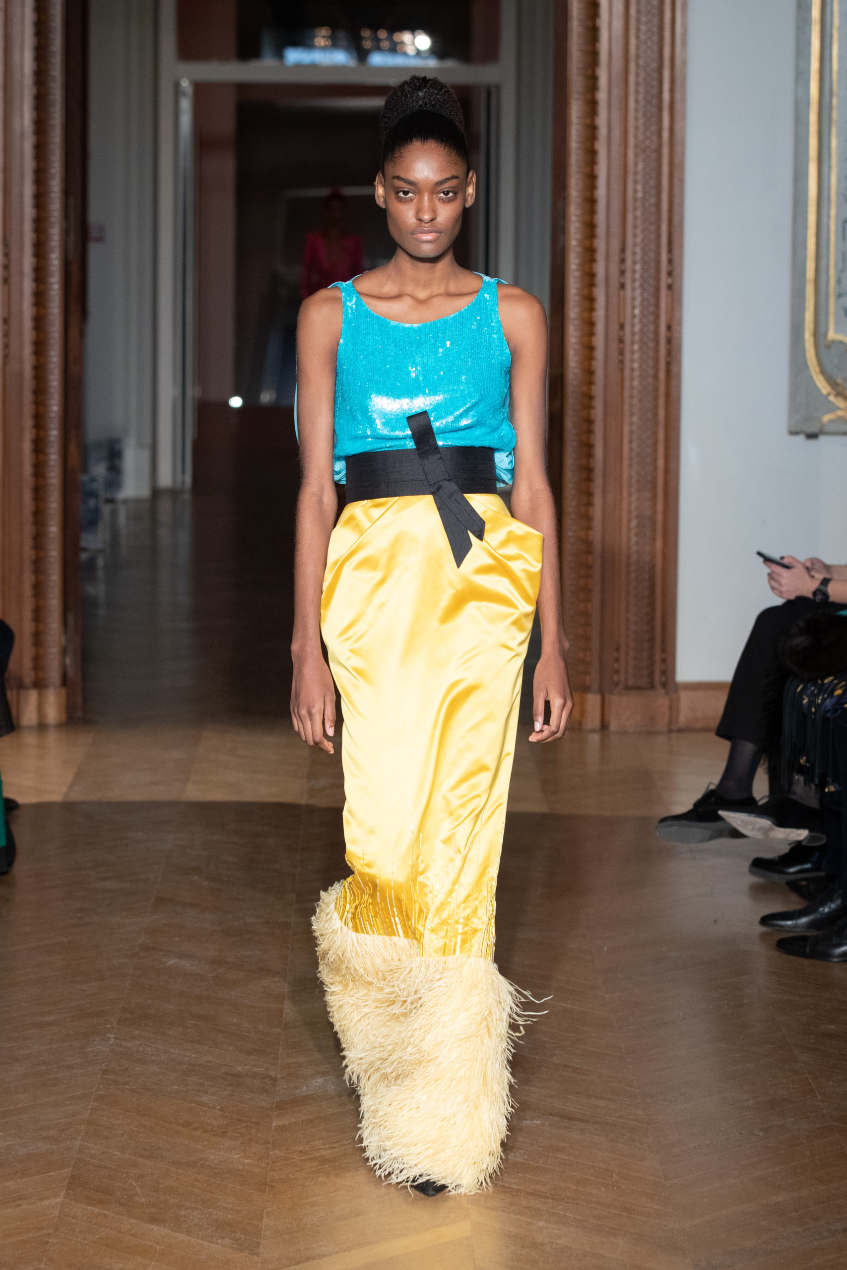 A la fin du défilé, Yanina revient aux pièces classiques de la maison – des robes noires et blanches, avec la célèbre broderie en filigrane.