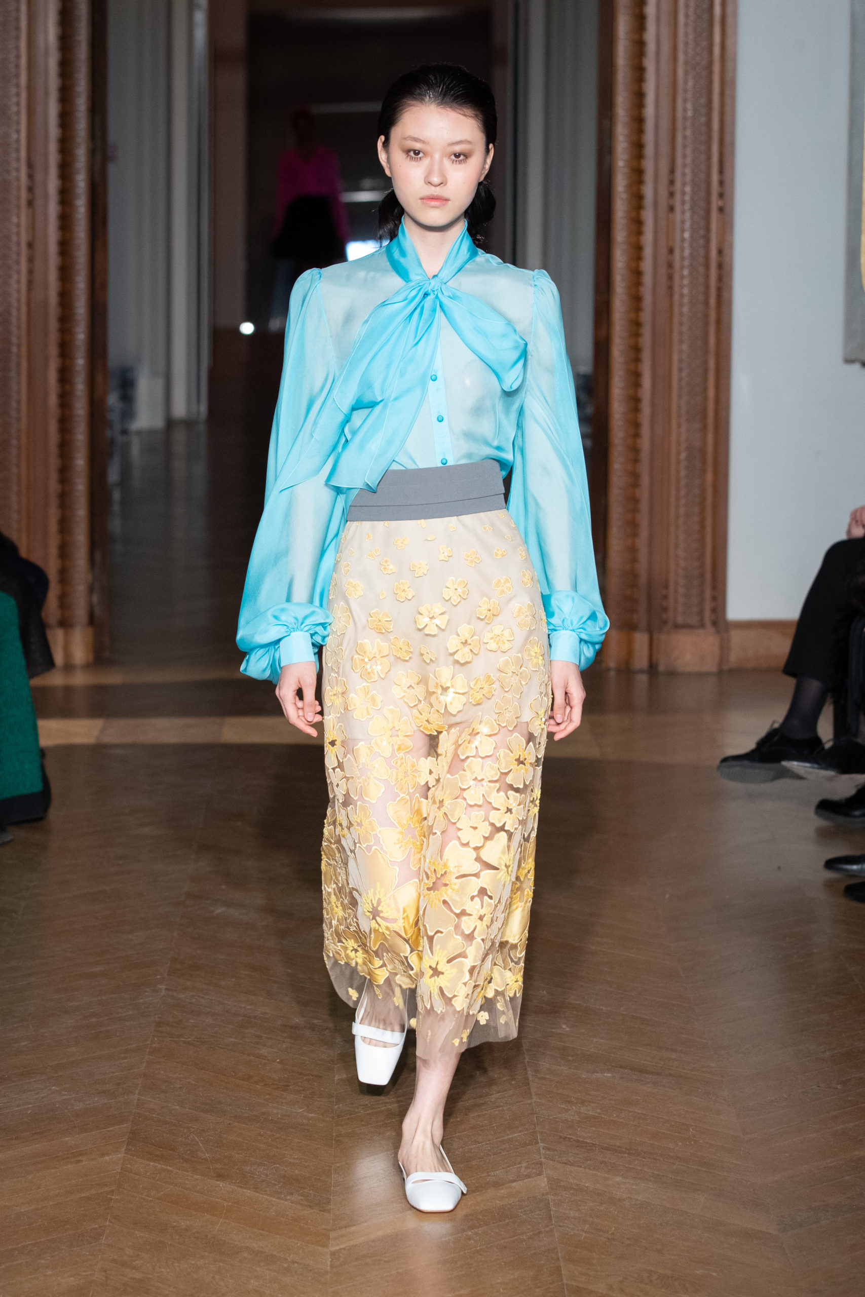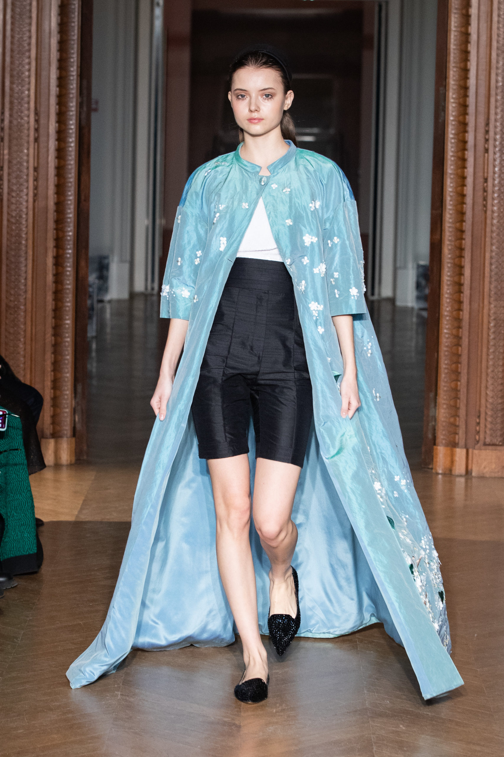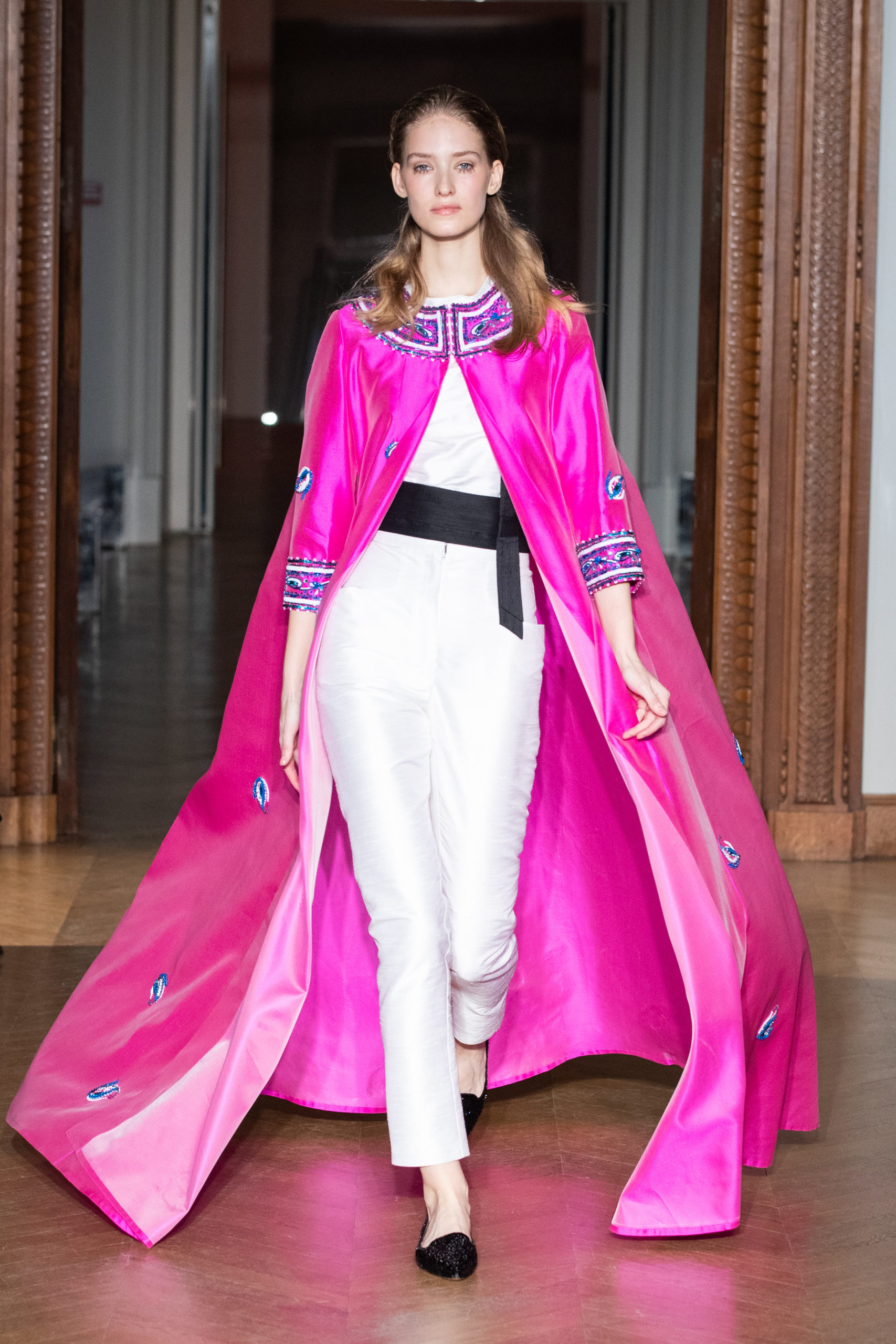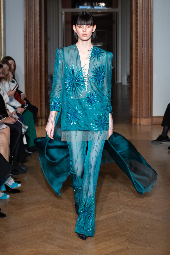 glamour et onirique. La collection est rythmée par des chemisiers délicats, des blouses avec de longues traînes, des vestes au luxe assumé…