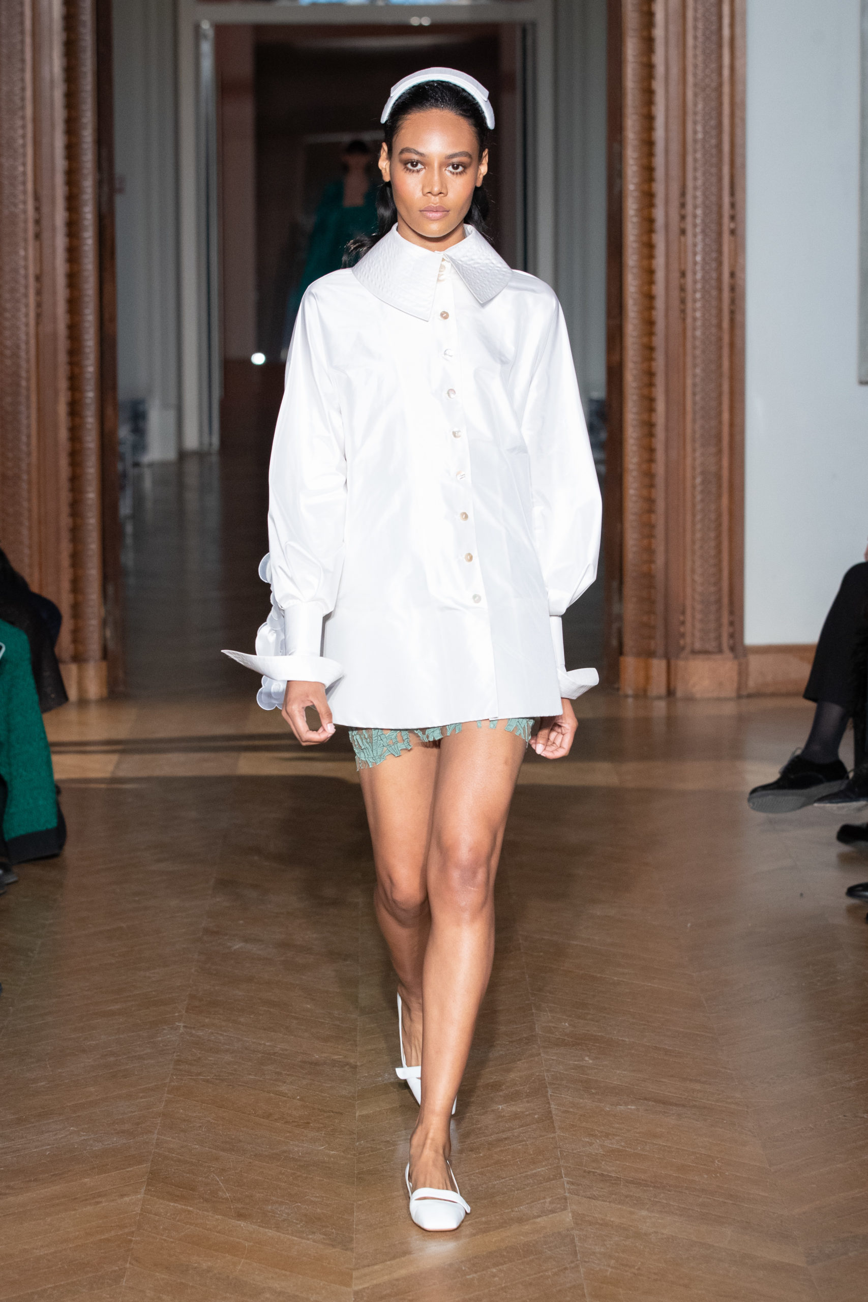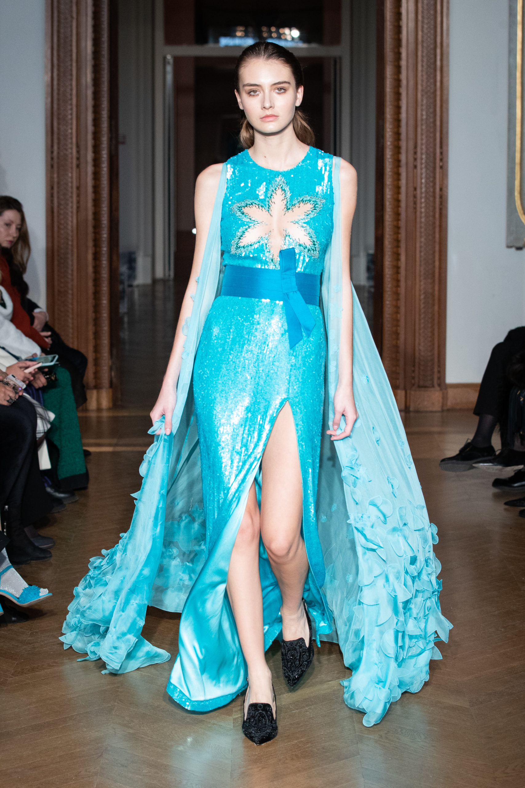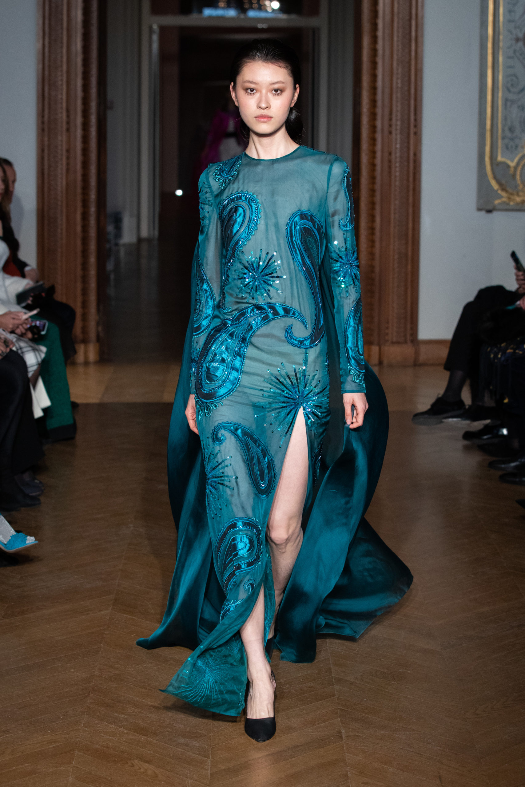 glamour et onirique. La collection est rythmée par des chemisiers délicats, des blouses avec de longues traînes, des vestes au luxe assumé…