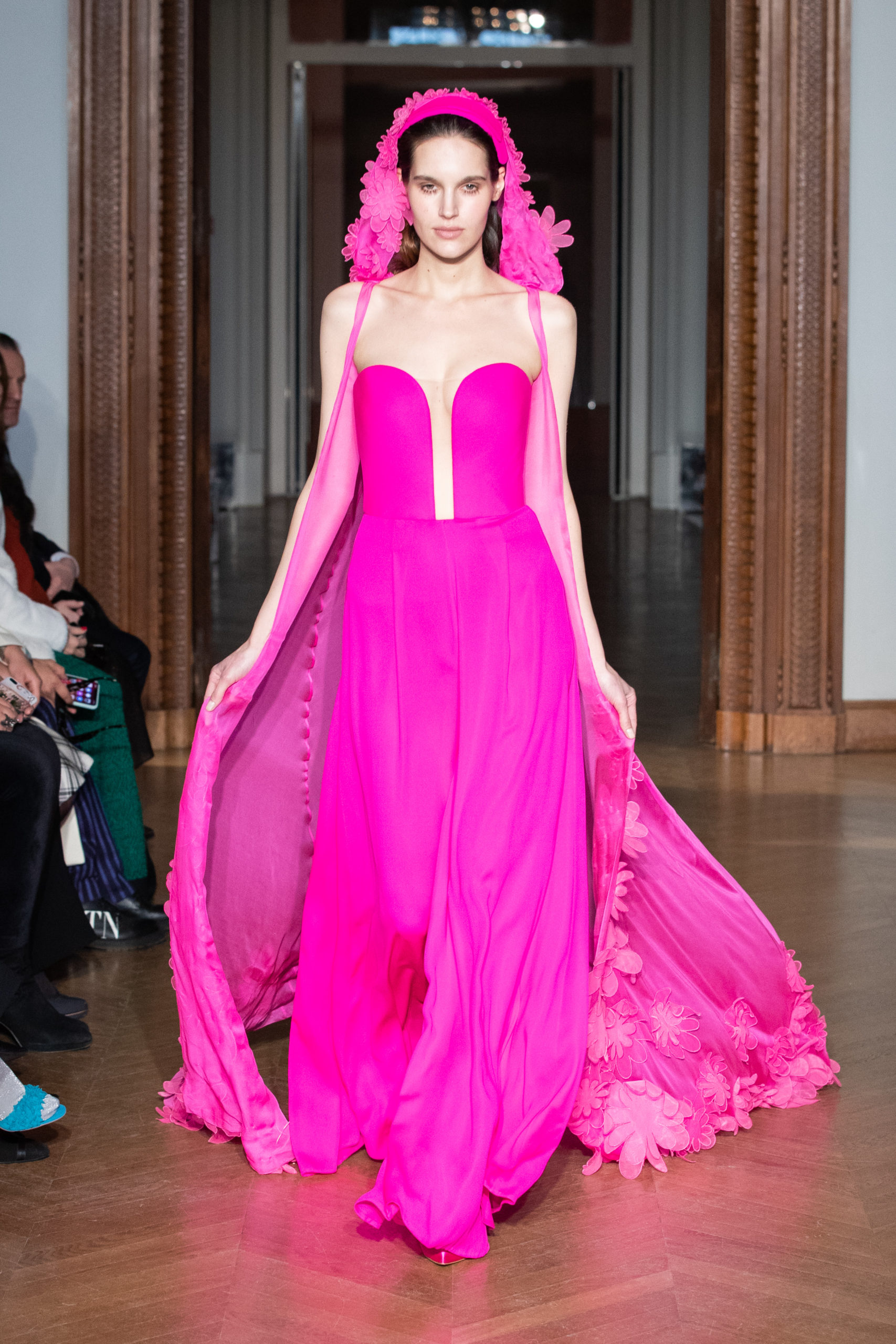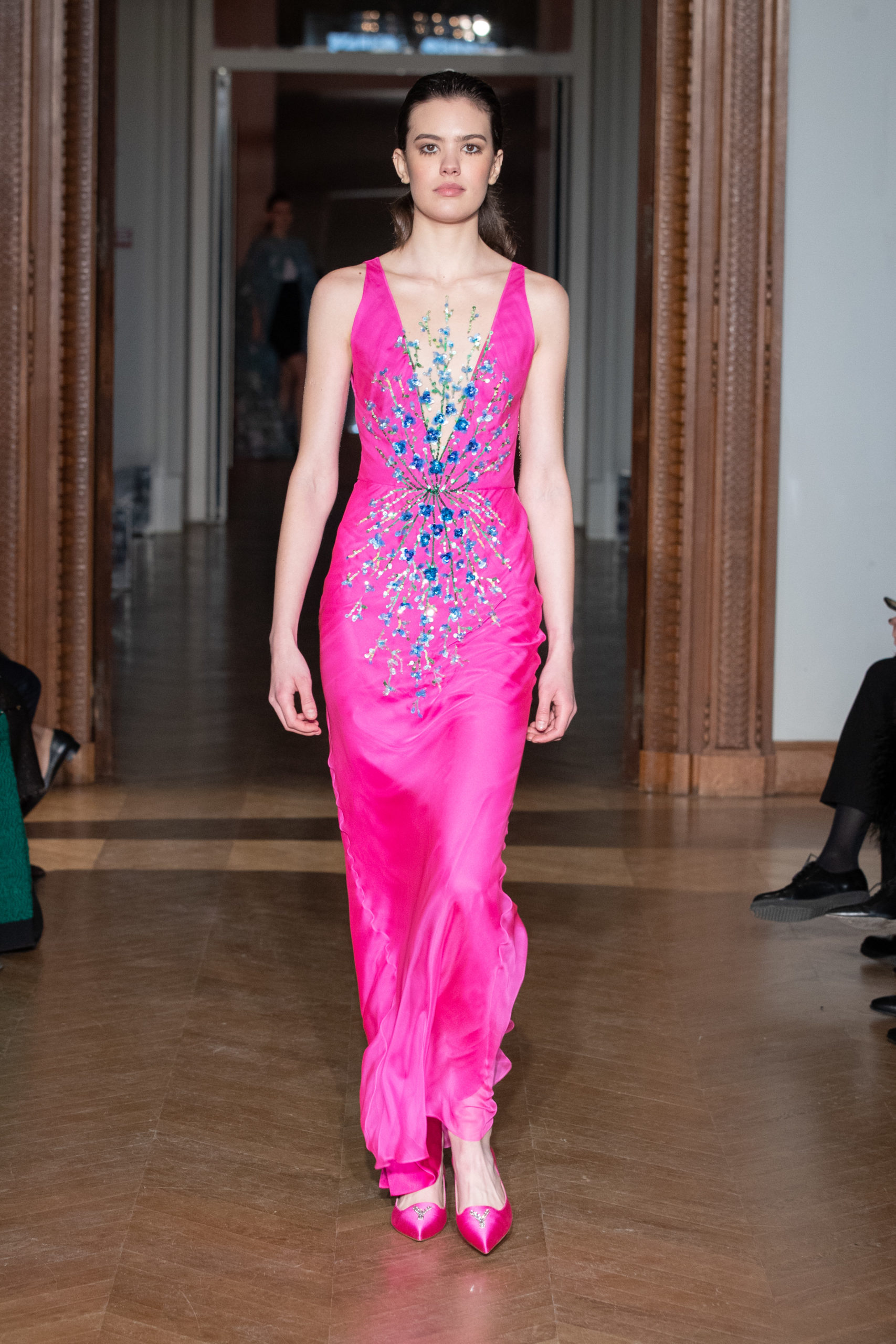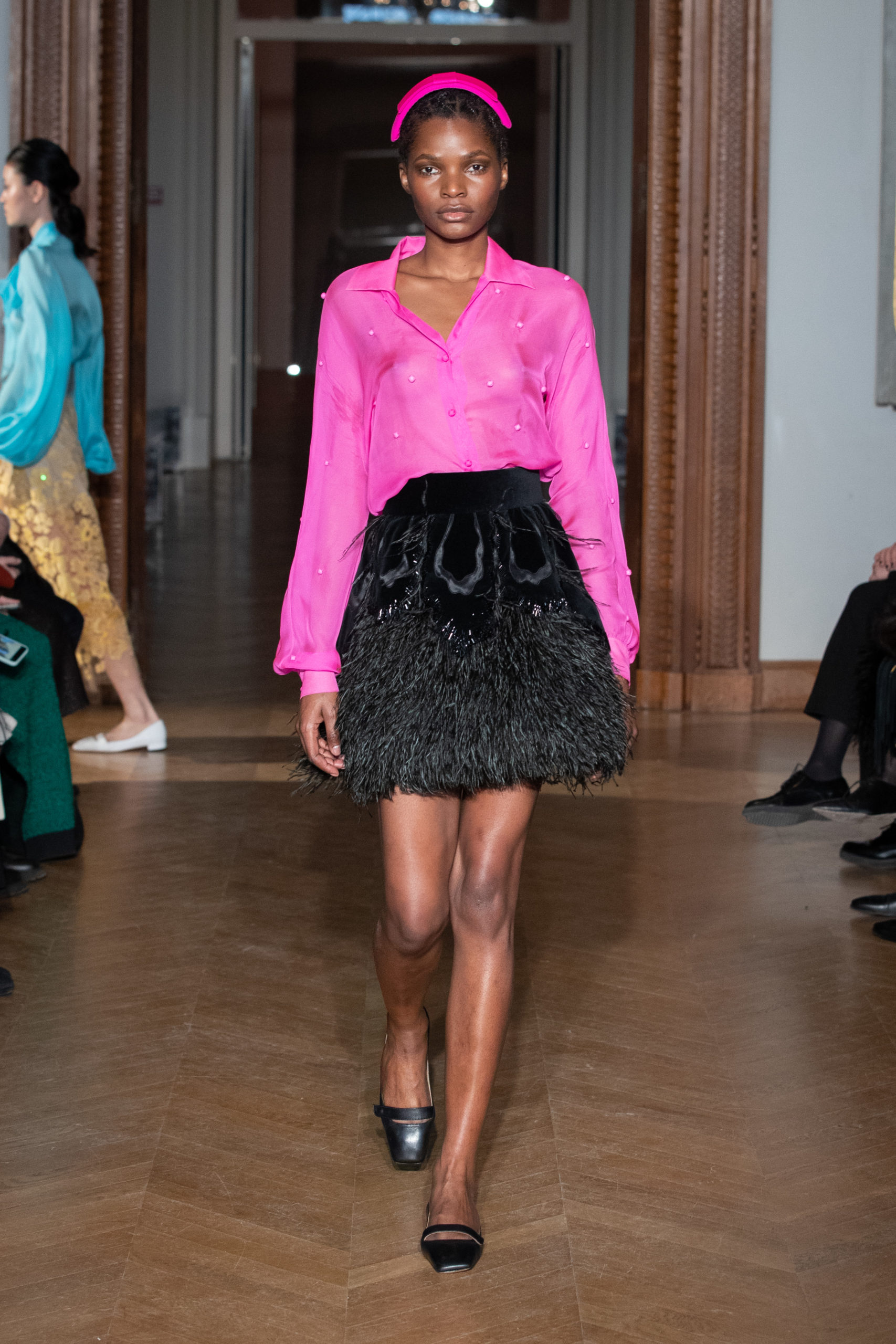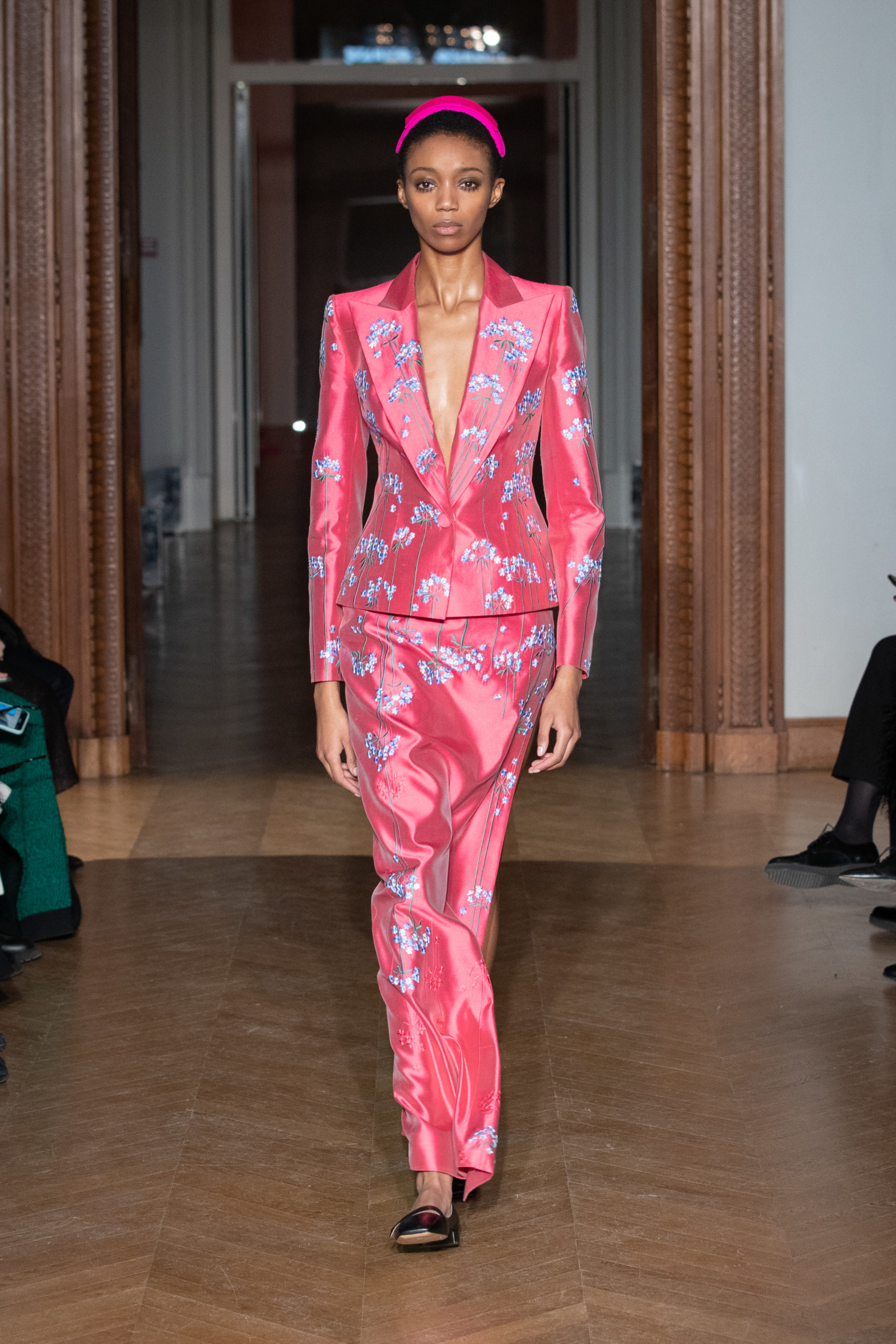 glamour et onirique. La collection est rythmée par des chemisiers délicats, des blouses avec de longues traînes, des vestes au luxe assumé…