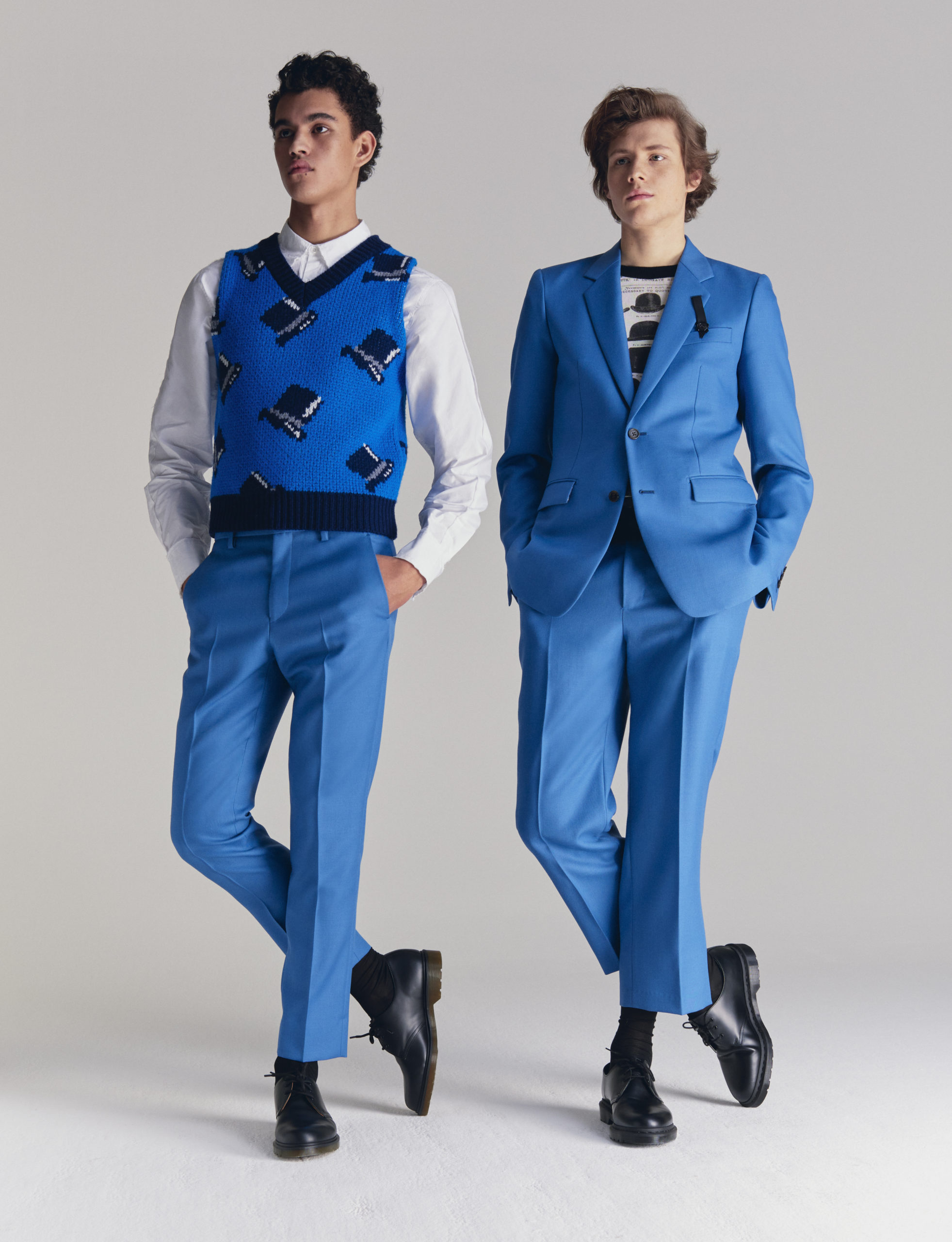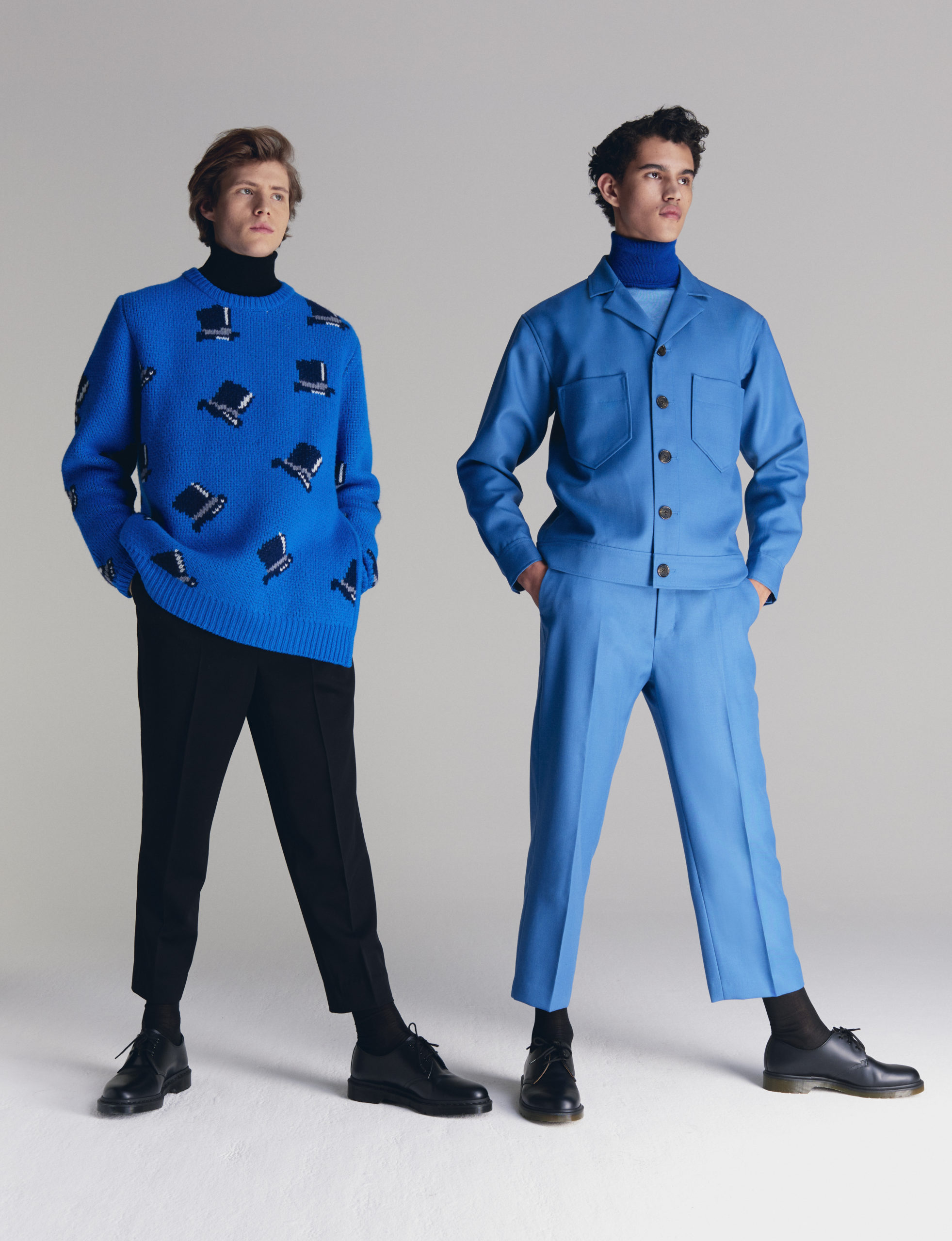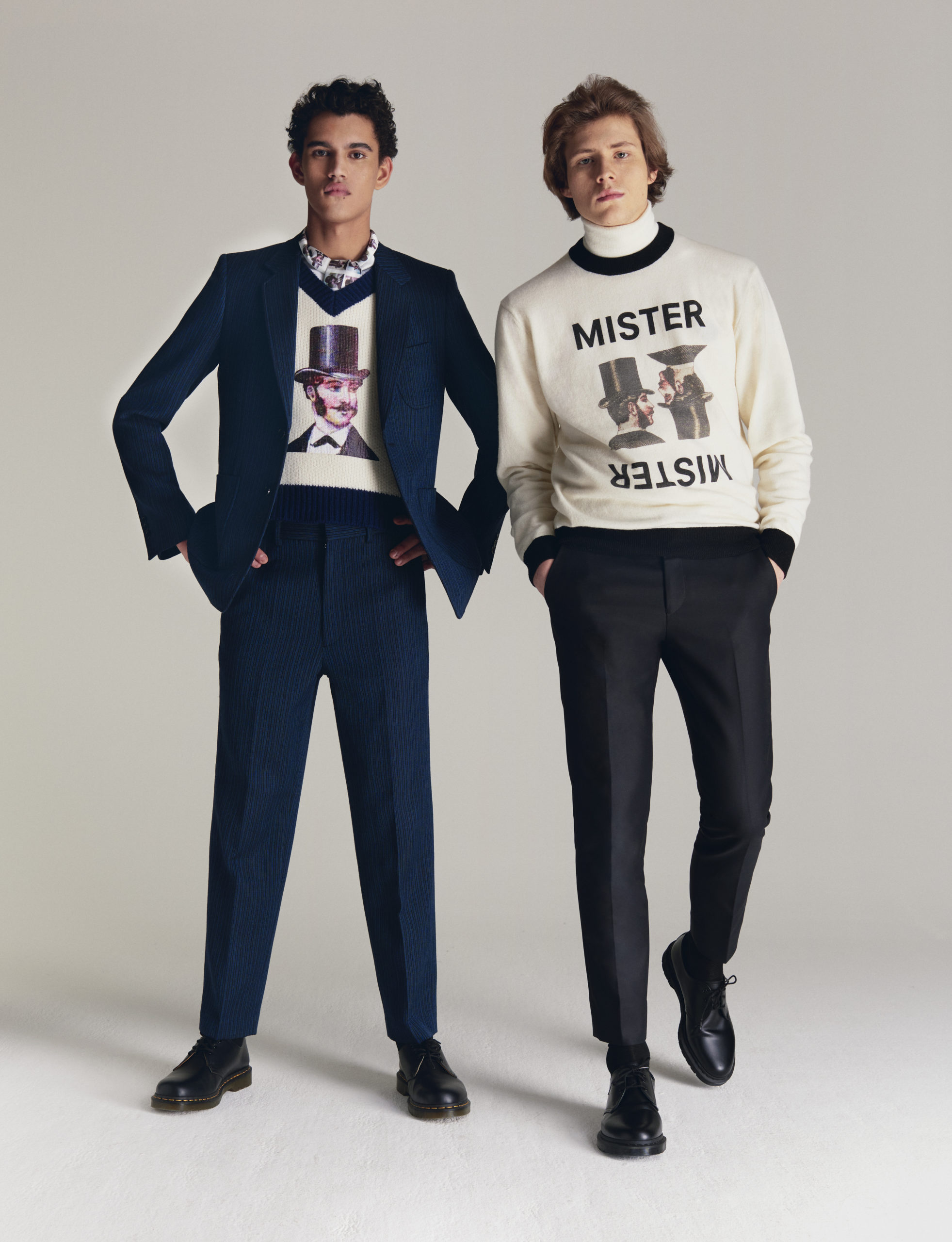 The collection embraces the modern dandy as a form of self-expression. Through a mingling of impeccable tailoring with casual wear, Viktor&Rolf Mister Mister crafts a playful take on formal wear. Homage is paid to an underlying sense of humour and irony through quirky conversational prints inspired by dandy narratives. Various top hats, either blown up or in micro patterns, executed in jacquards and trompe-l’oeil techniques, create a visual background that inspire dialogue amongst themselves.
