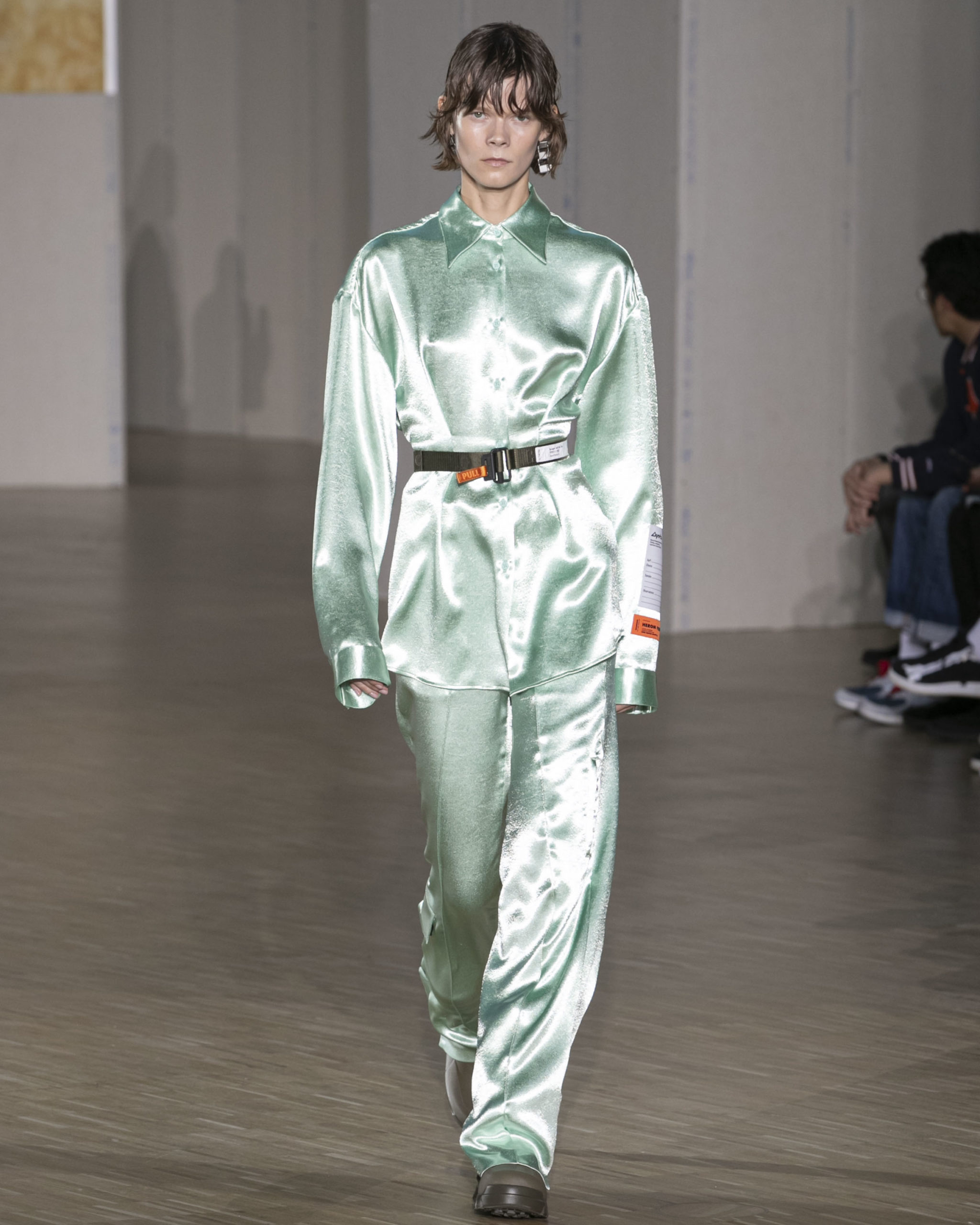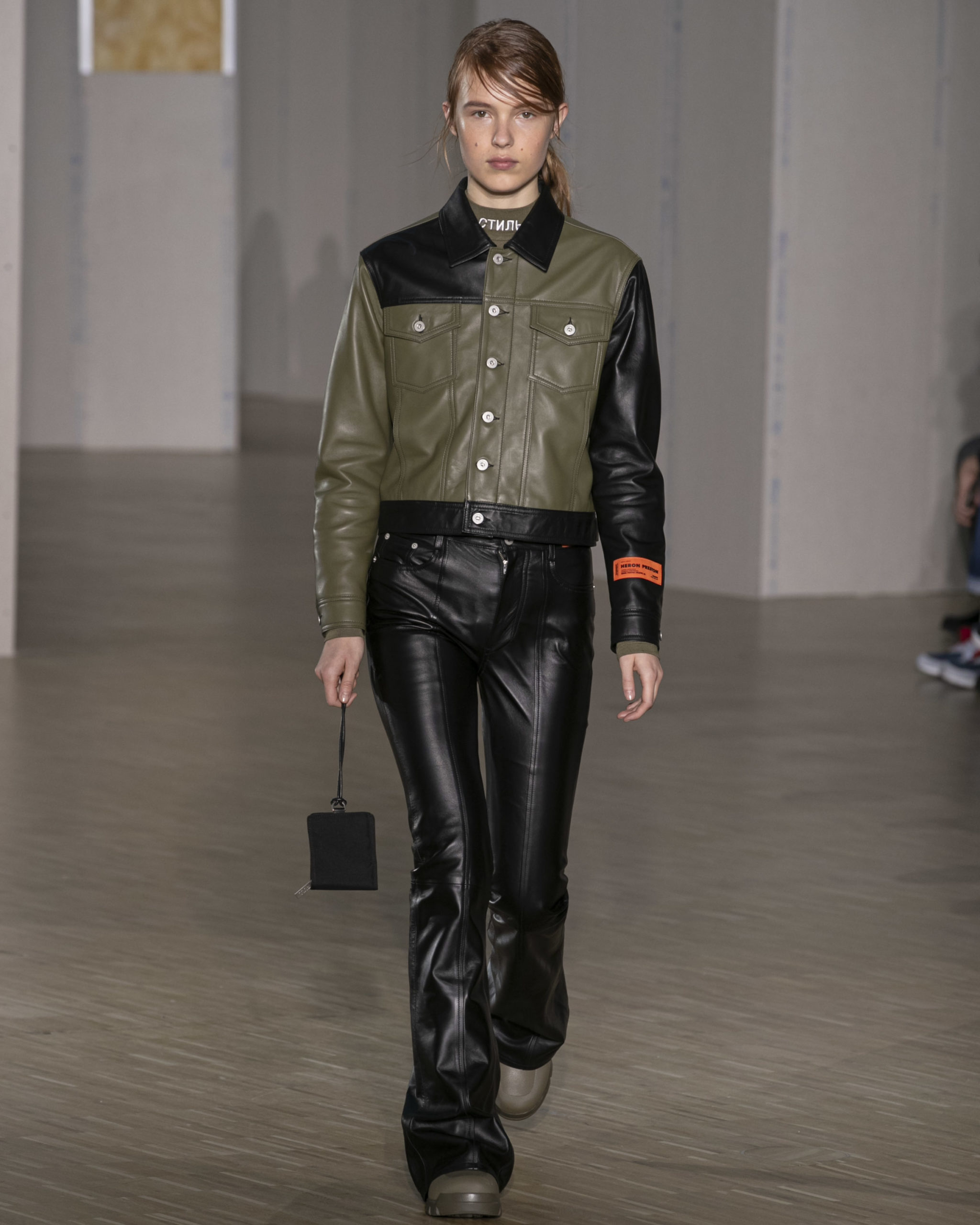 FW20 includes recycled nylons, thermo-sealed GORE-TEX suiting, guaranteed waterproof and breatheable; cordura puffers; functional pockets on dressed-up tailoring and waterproof zipper details. Waffled denim is inspired by Japanese construction worker outfits, and wool felt has a touch-reactive membrane. Women’s footwear features a spirit-level heel.