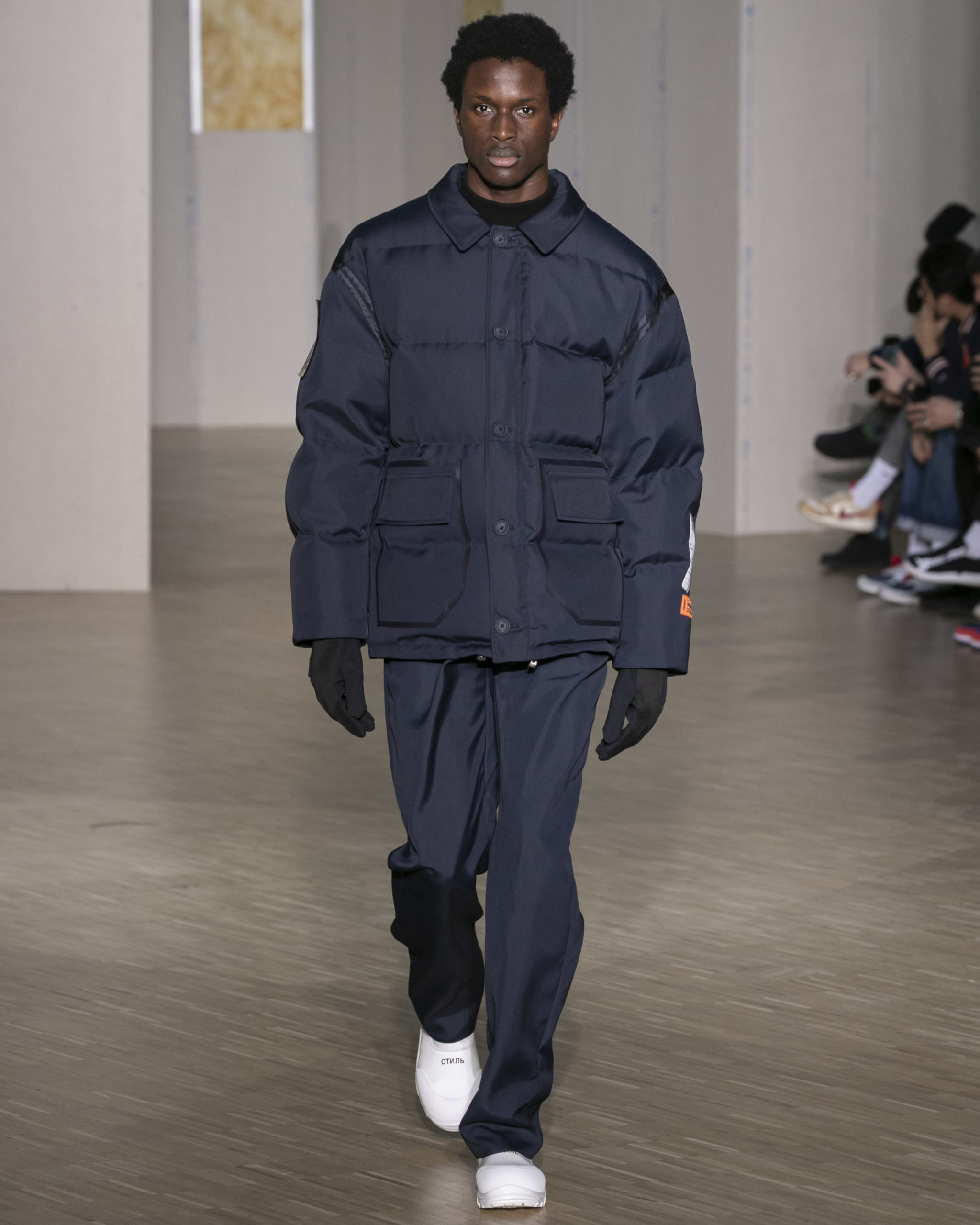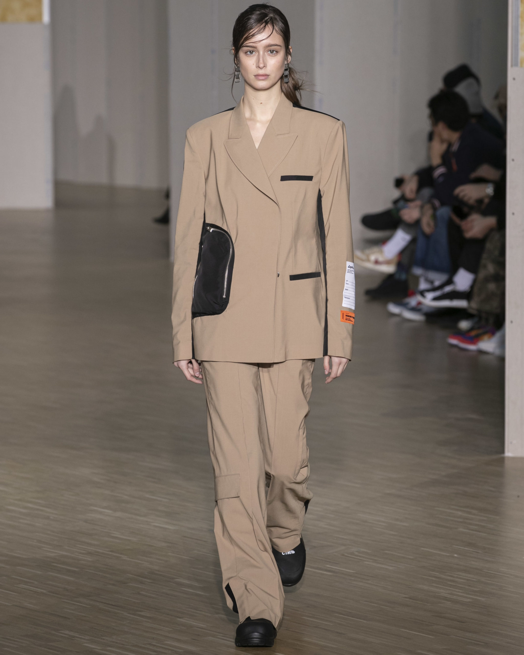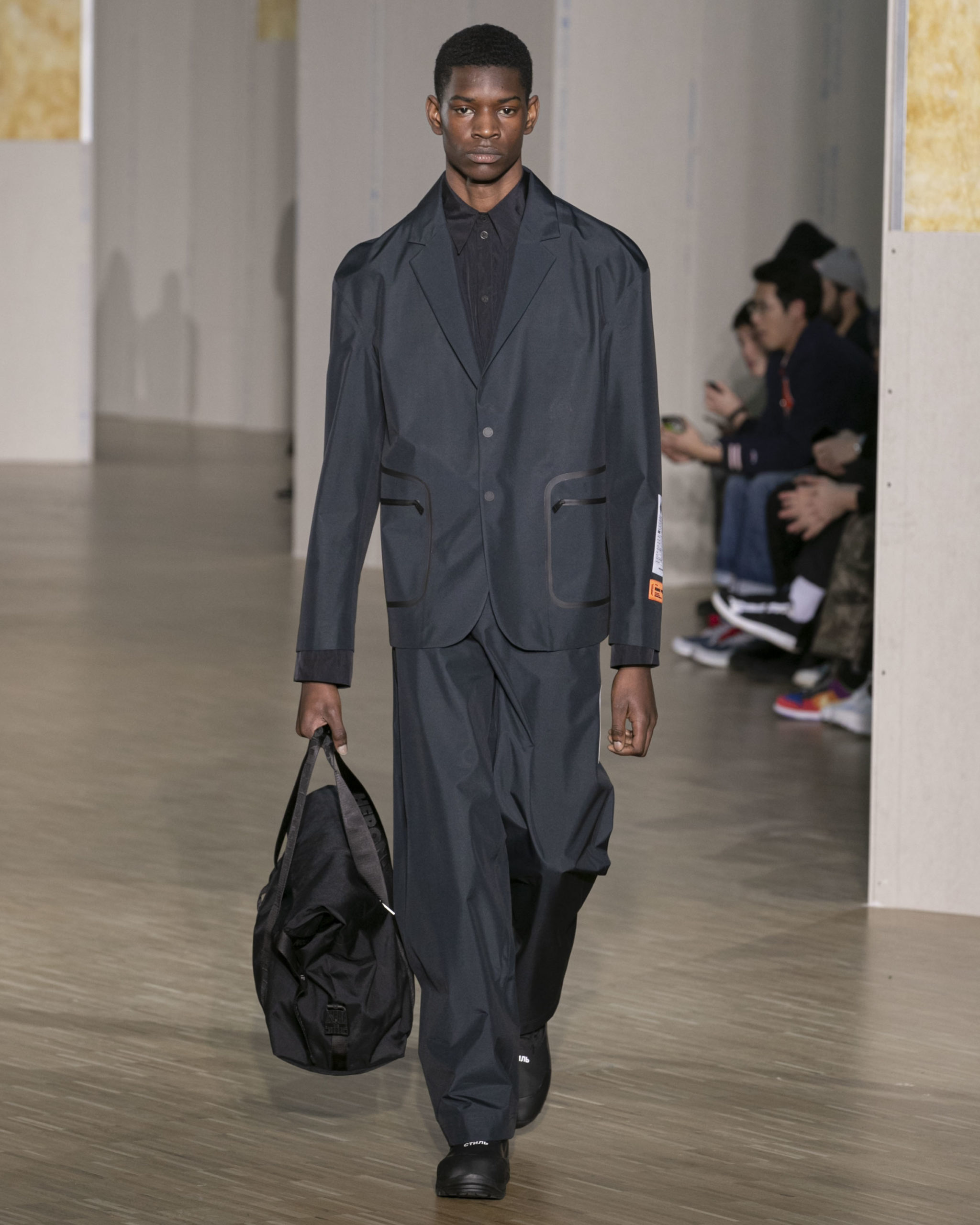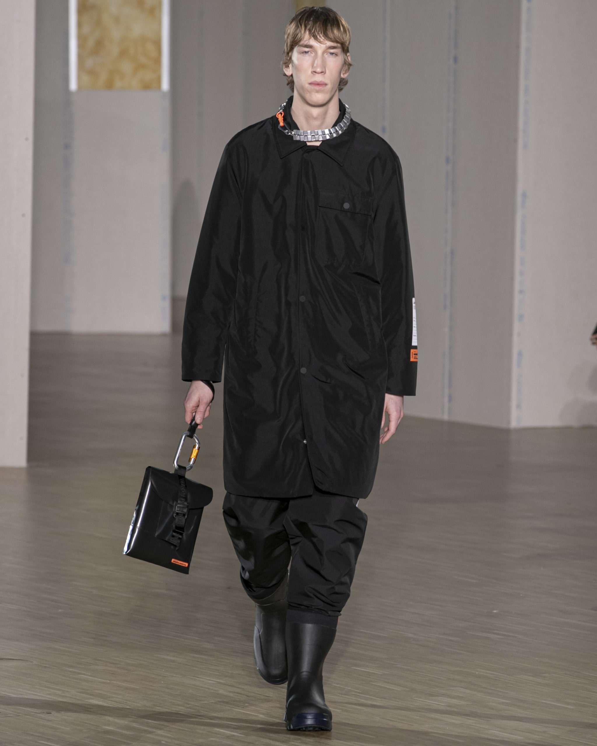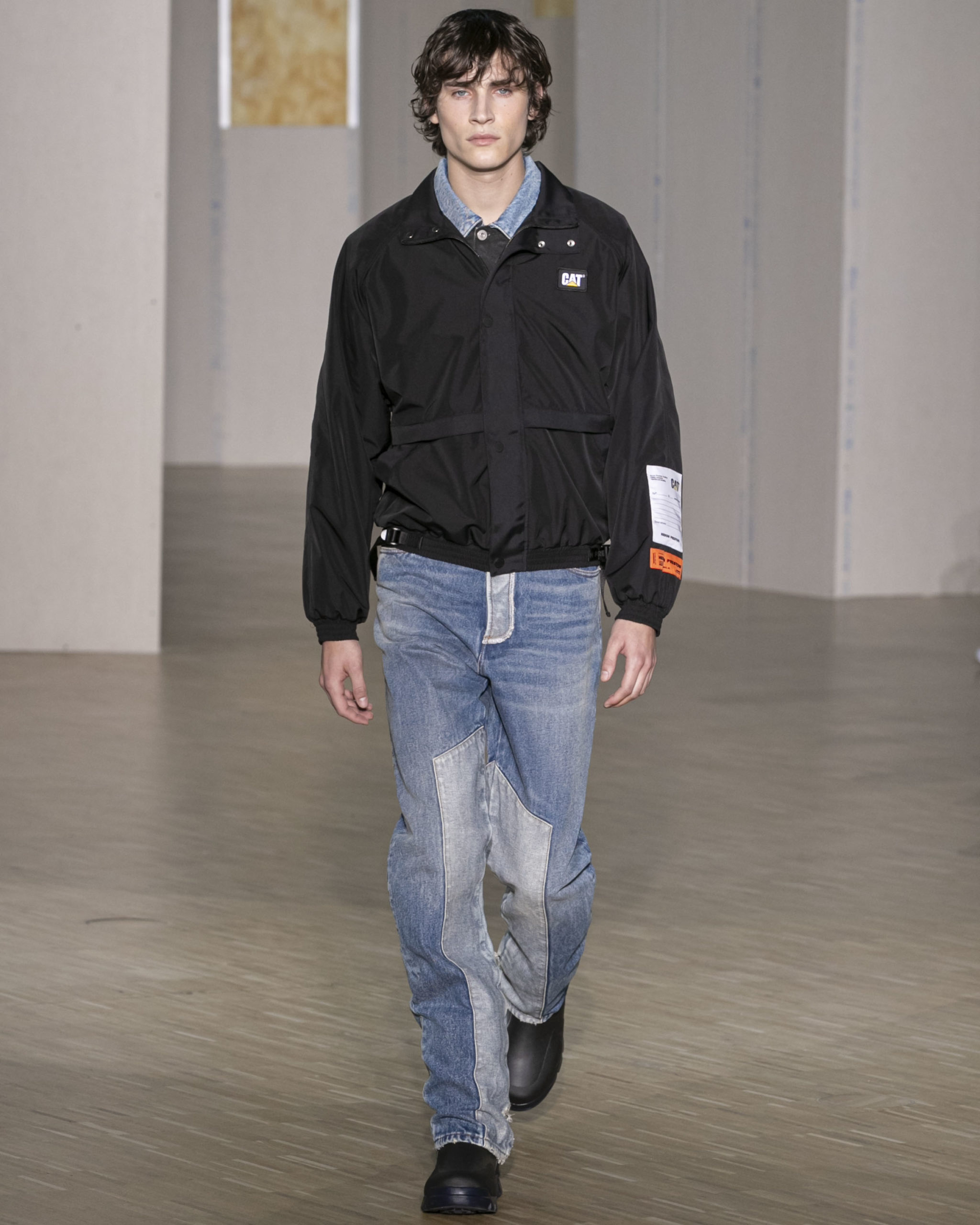 FW20 includes recycled nylons, thermo-sealed GORE-TEX suiting, guaranteed waterproof and breatheable; cordura puffers; functional pockets on dressed-up tailoring and waterproof zipper details. Waffled denim is inspired by Japanese construction worker outfits, and wool felt has a touch-reactive membrane. Women’s footwear features a spirit-level heel.