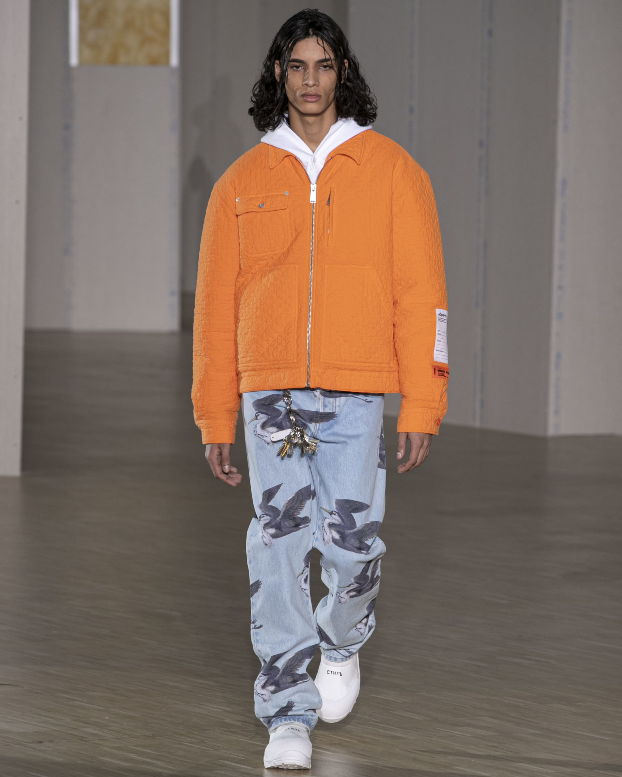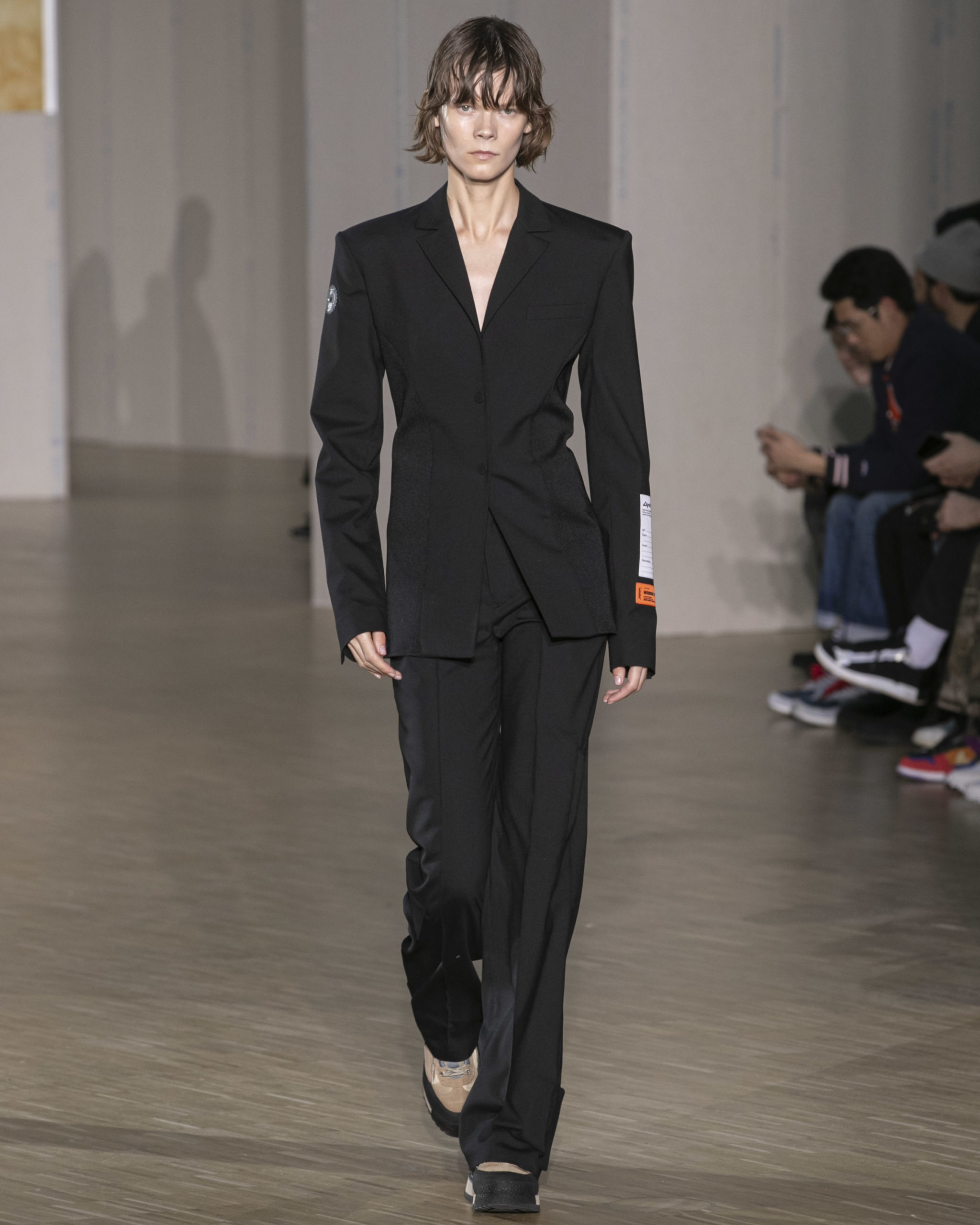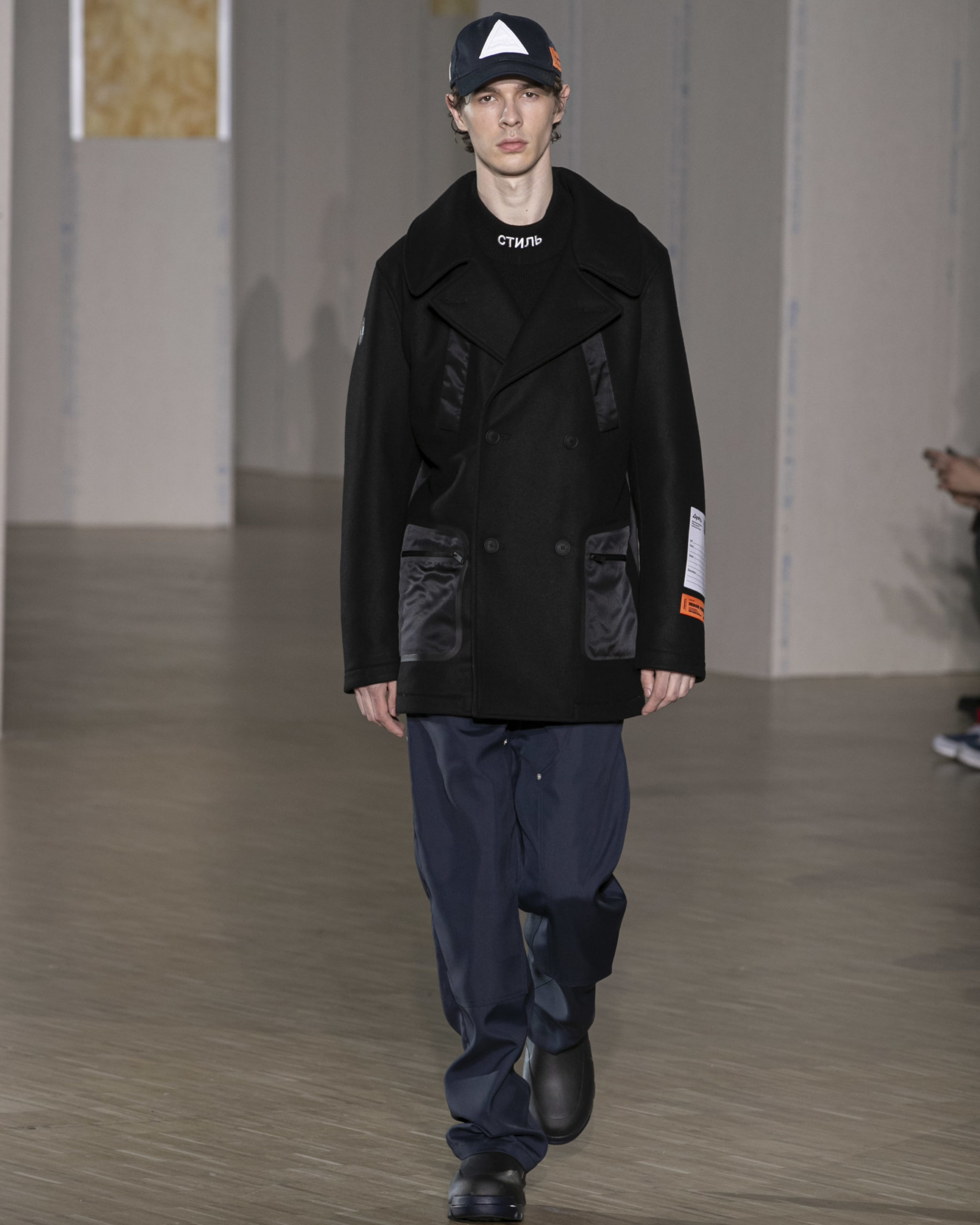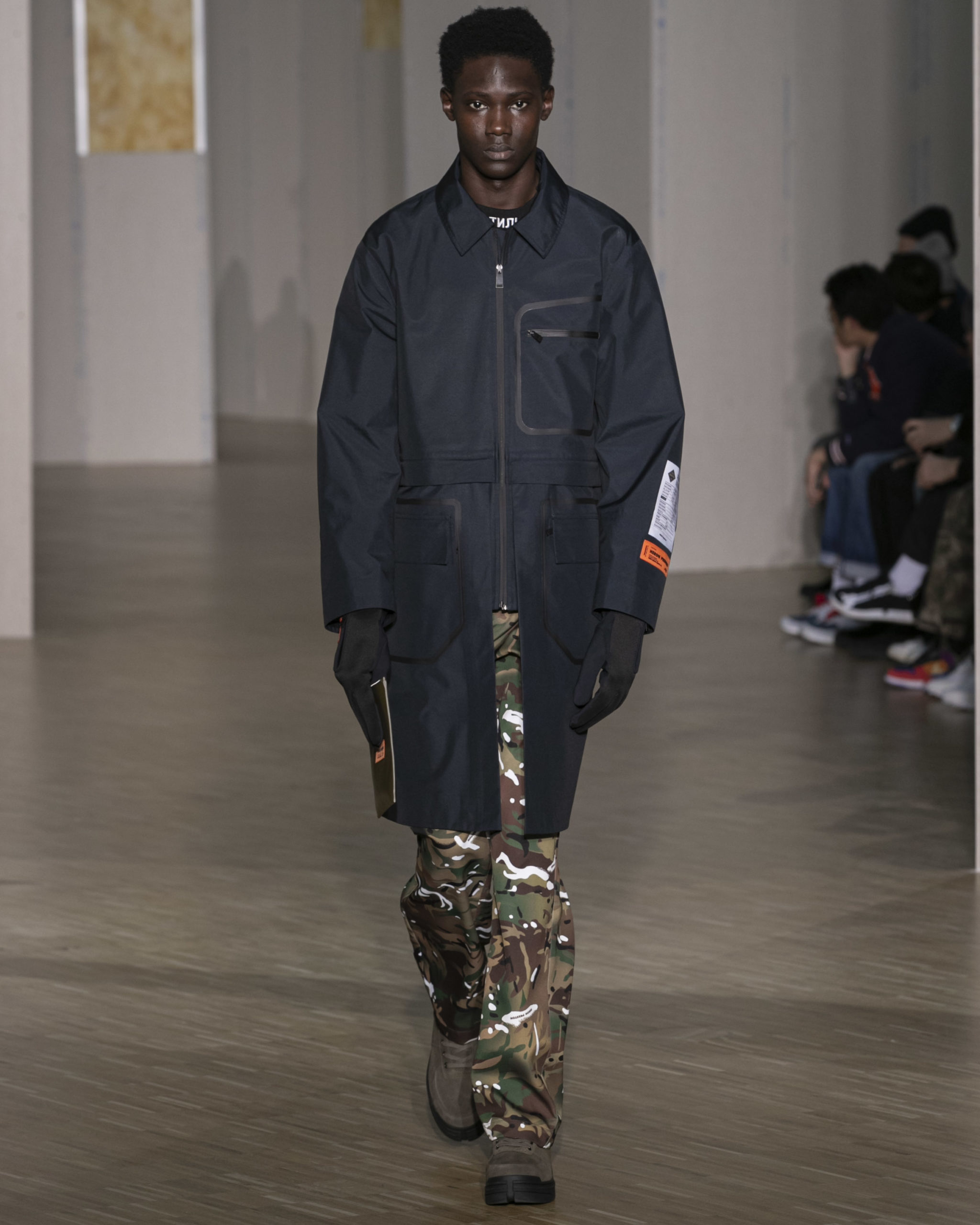 FW20 includes recycled nylons, thermo-sealed GORE-TEX suiting, guaranteed waterproof and breatheable; cordura puffers; functional pockets on dressed-up tailoring and waterproof zipper details. Waffled denim is inspired by Japanese construction worker outfits, and wool felt has a touch-reactive membrane. Women’s footwear features a spirit-level heel.