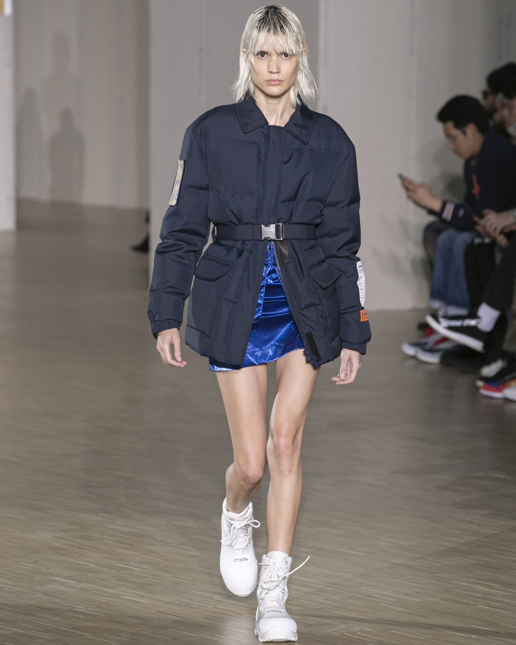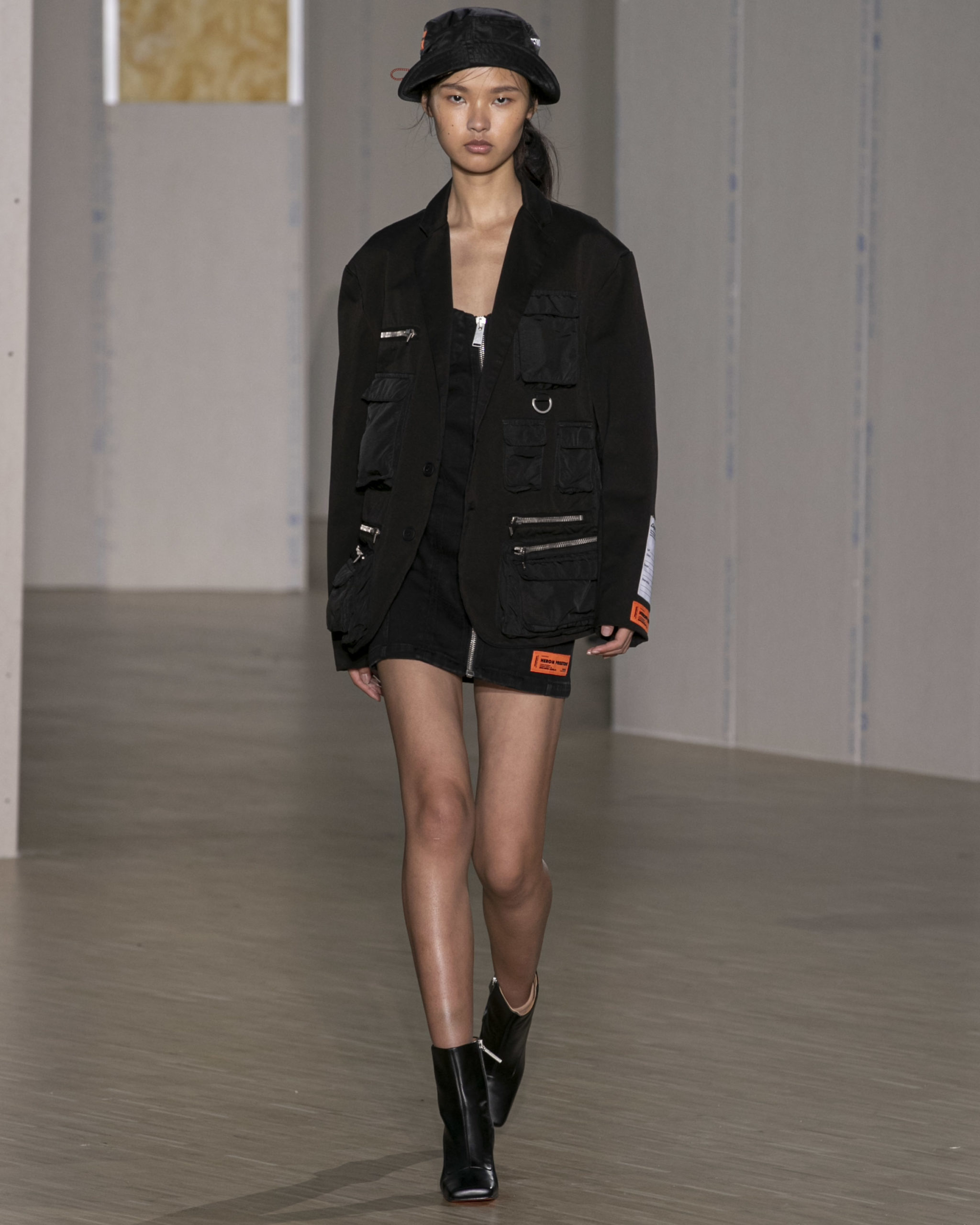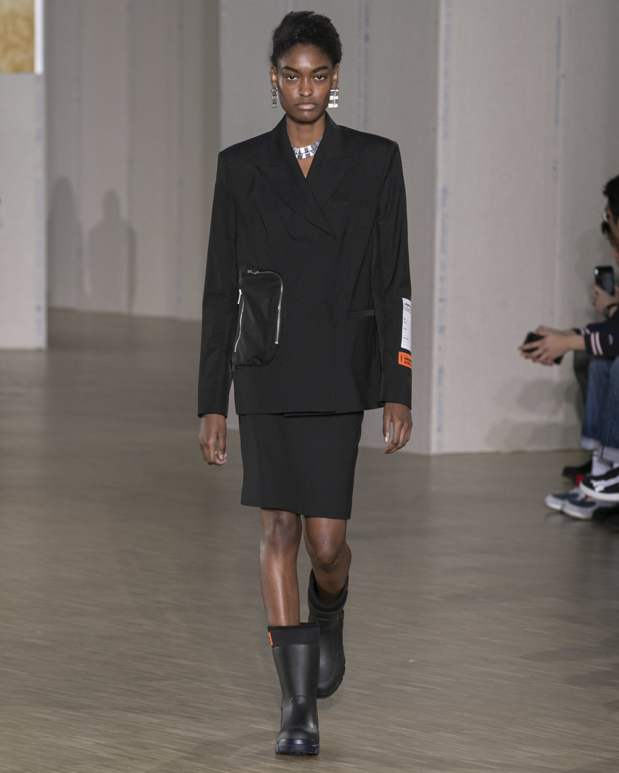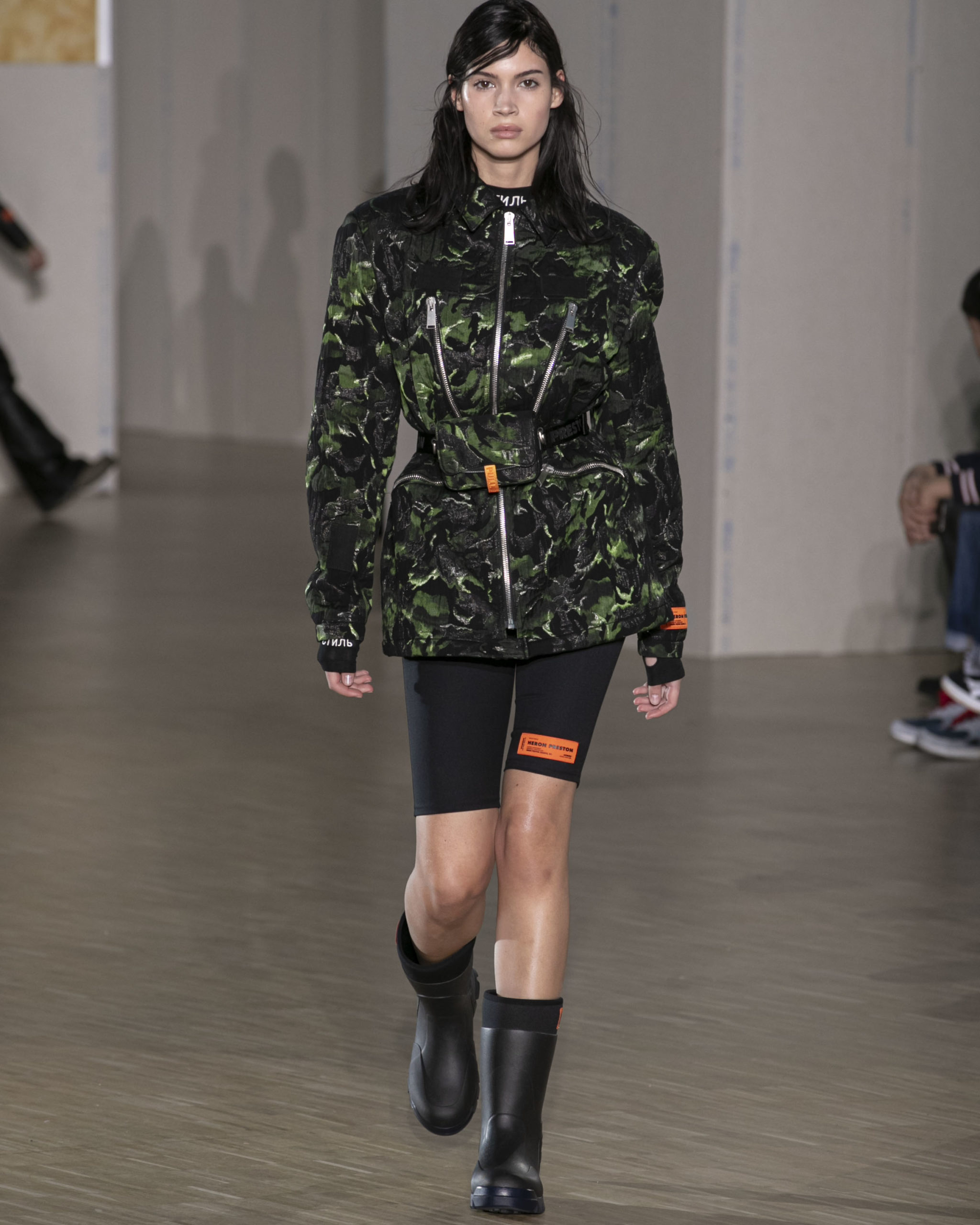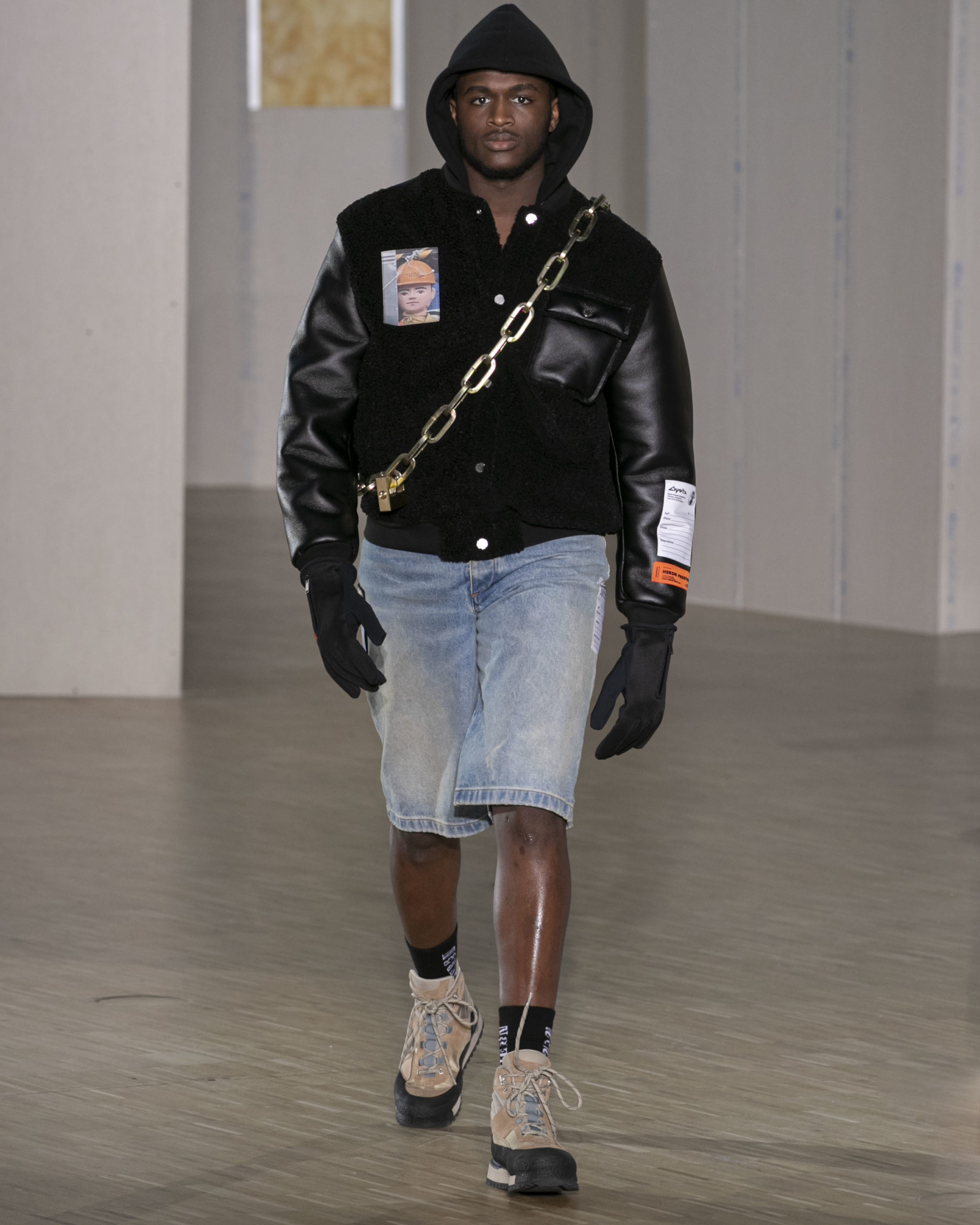 FW20 includes recycled nylons, thermo-sealed GORE-TEX suiting, guaranteed waterproof and breatheable; cordura puffers; functional pockets on dressed-up tailoring and waterproof zipper details. Waffled denim is inspired by Japanese construction worker outfits, and wool felt has a touch-reactive membrane. Women’s footwear features a spirit-level heel.
