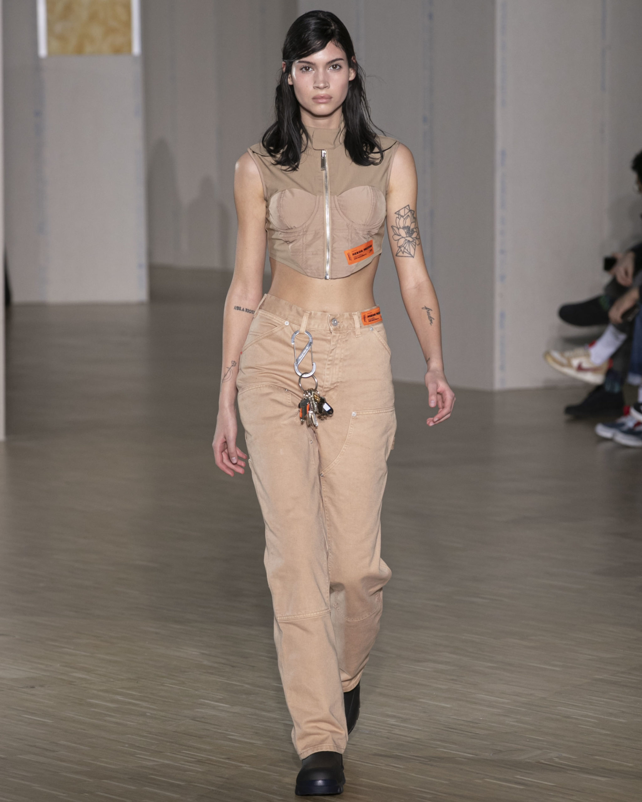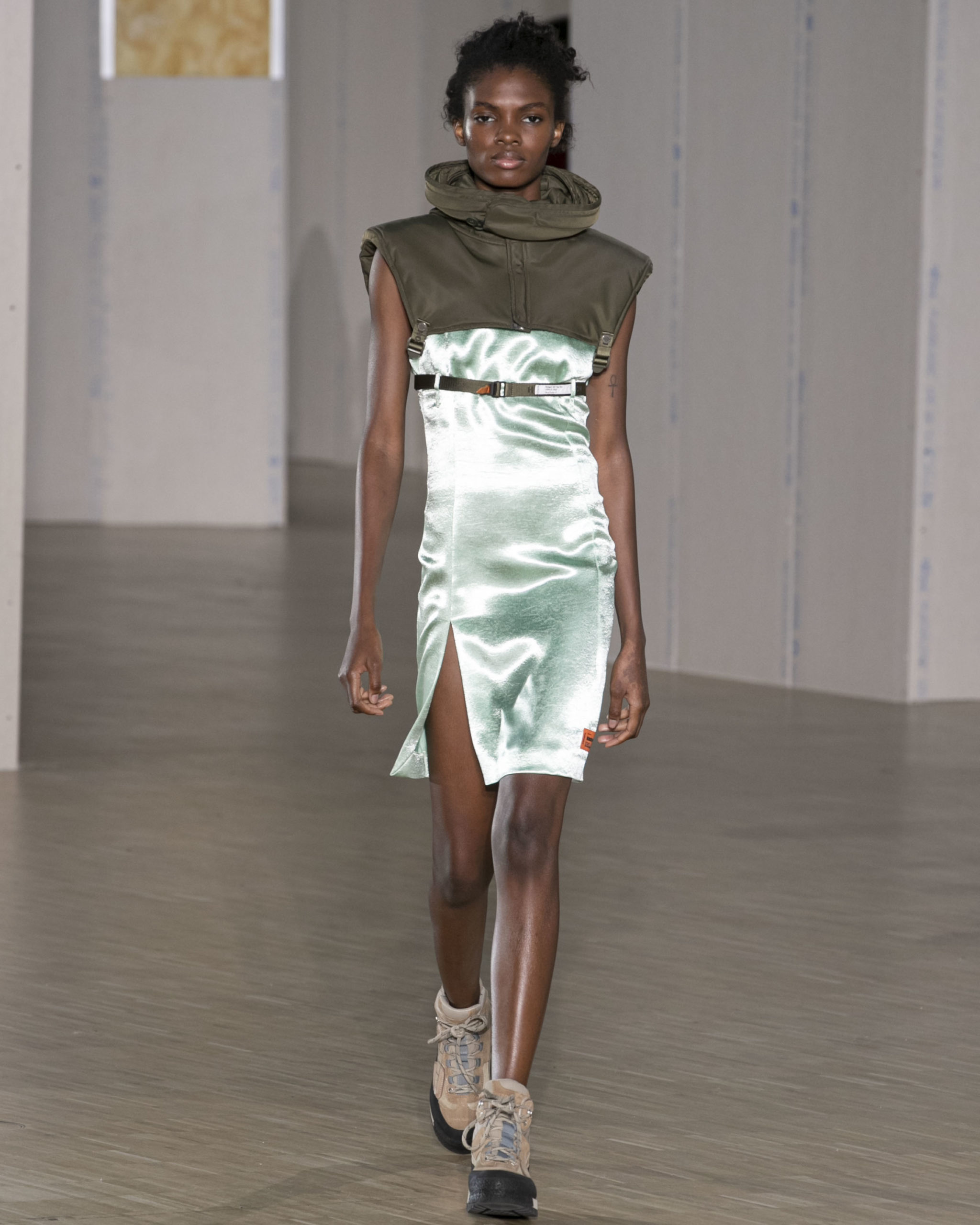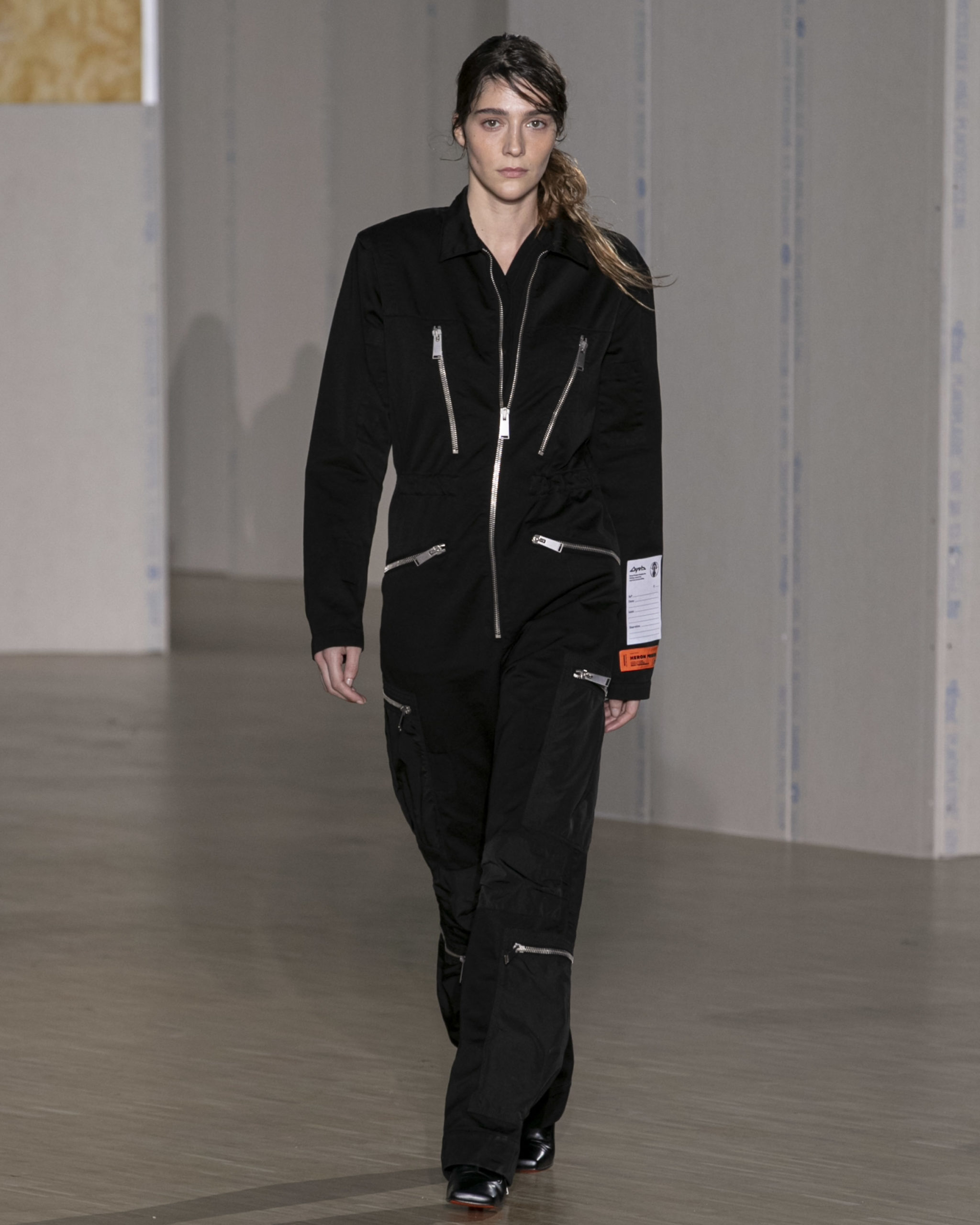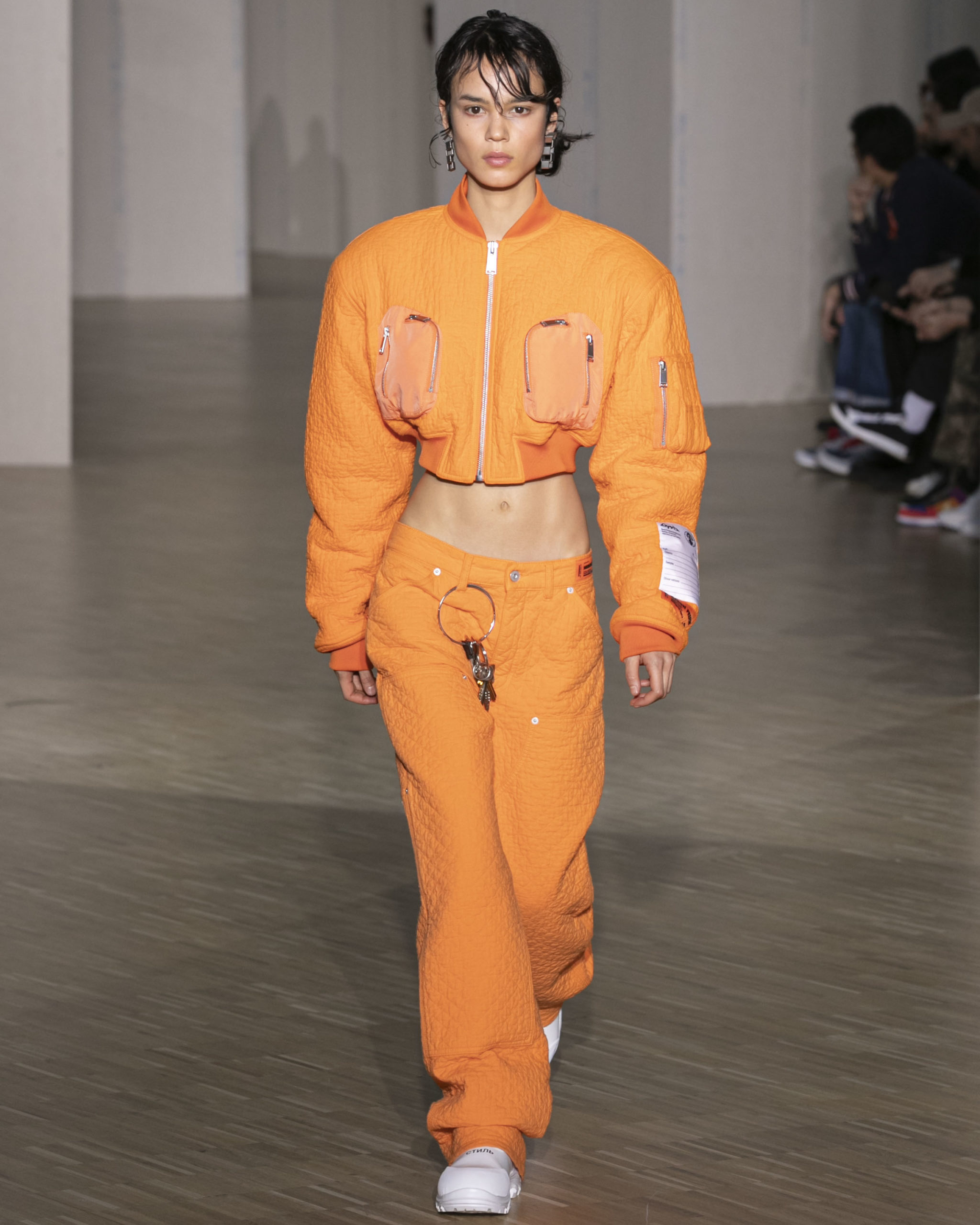 FW20 includes recycled nylons, thermo-sealed GORE-TEX suiting, guaranteed waterproof and breatheable; cordura puffers; functional pockets on dressed-up tailoring and waterproof zipper details. Waffled denim is inspired by Japanese construction worker outfits, and wool felt has a touch-reactive membrane. Women’s footwear features a spirit-level heel.