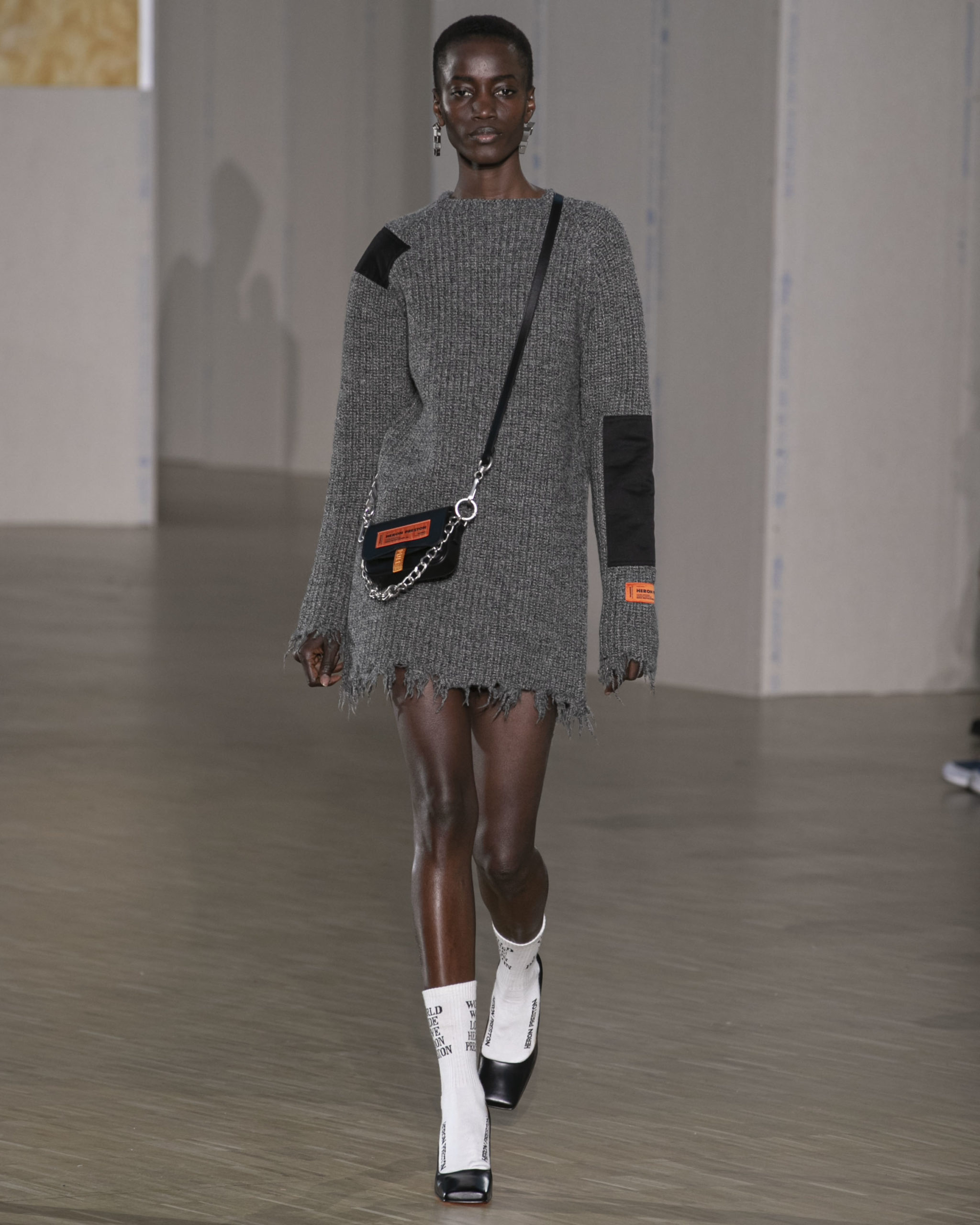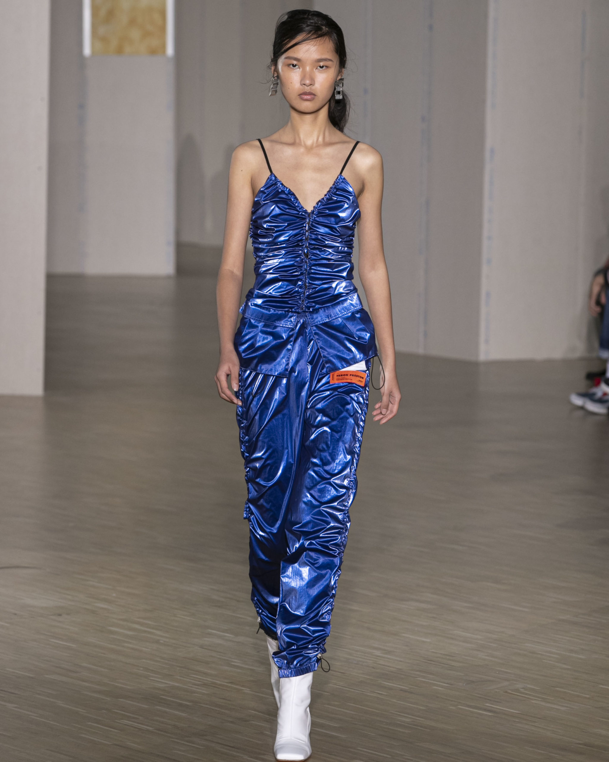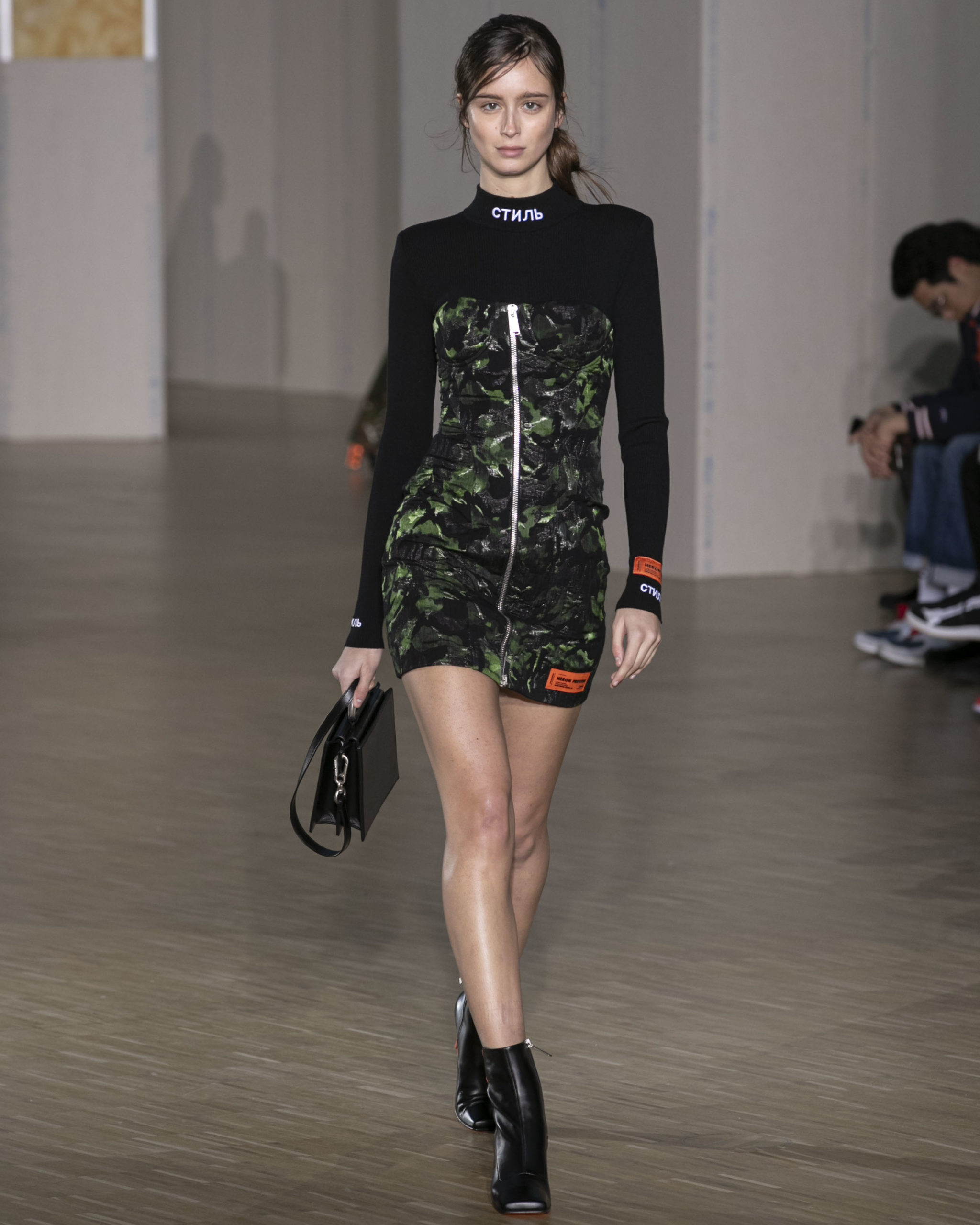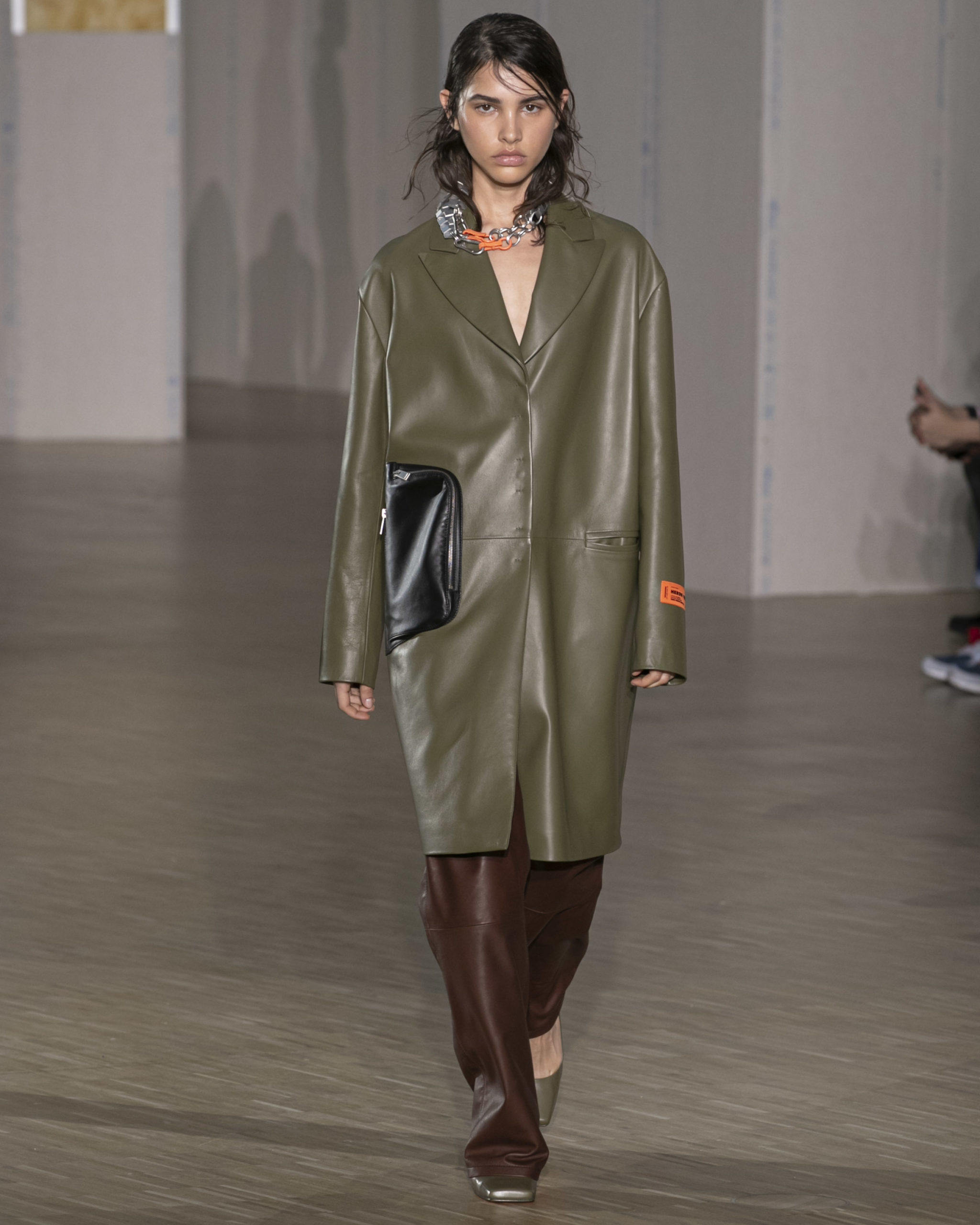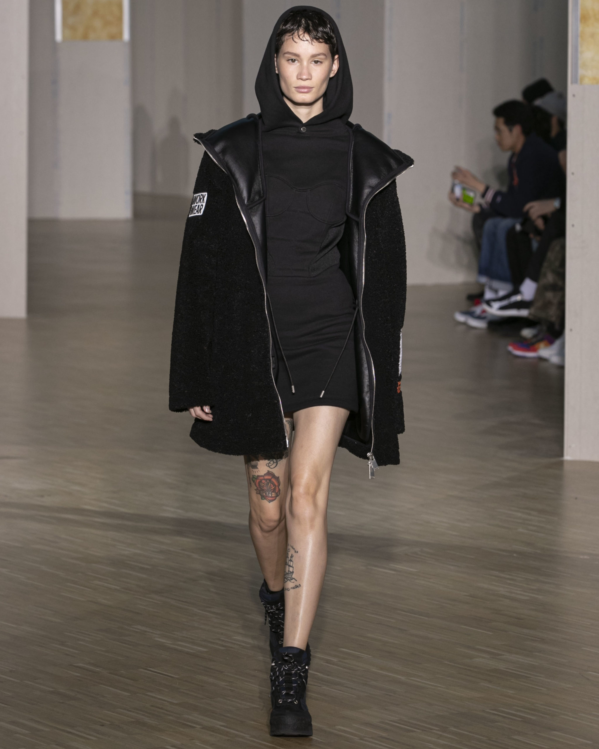 FW20 includes recycled nylons, thermo-sealed GORE-TEX suiting, guaranteed waterproof and breatheable; cordura puffers; functional pockets on dressed-up tailoring and waterproof zipper details. Waffled denim is inspired by Japanese construction worker outfits, and wool felt has a touch-reactive membrane. Women’s footwear features a spirit-level heel.