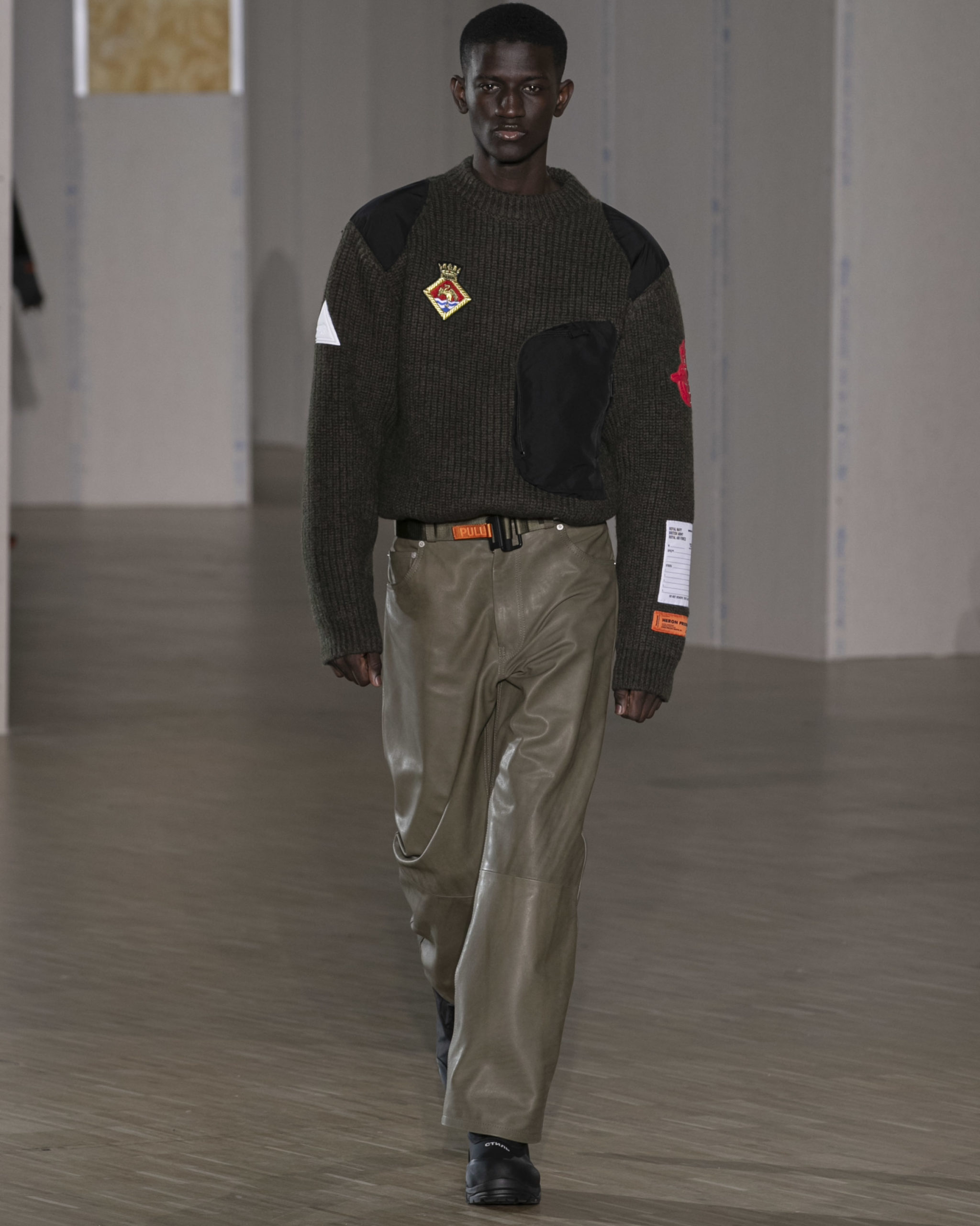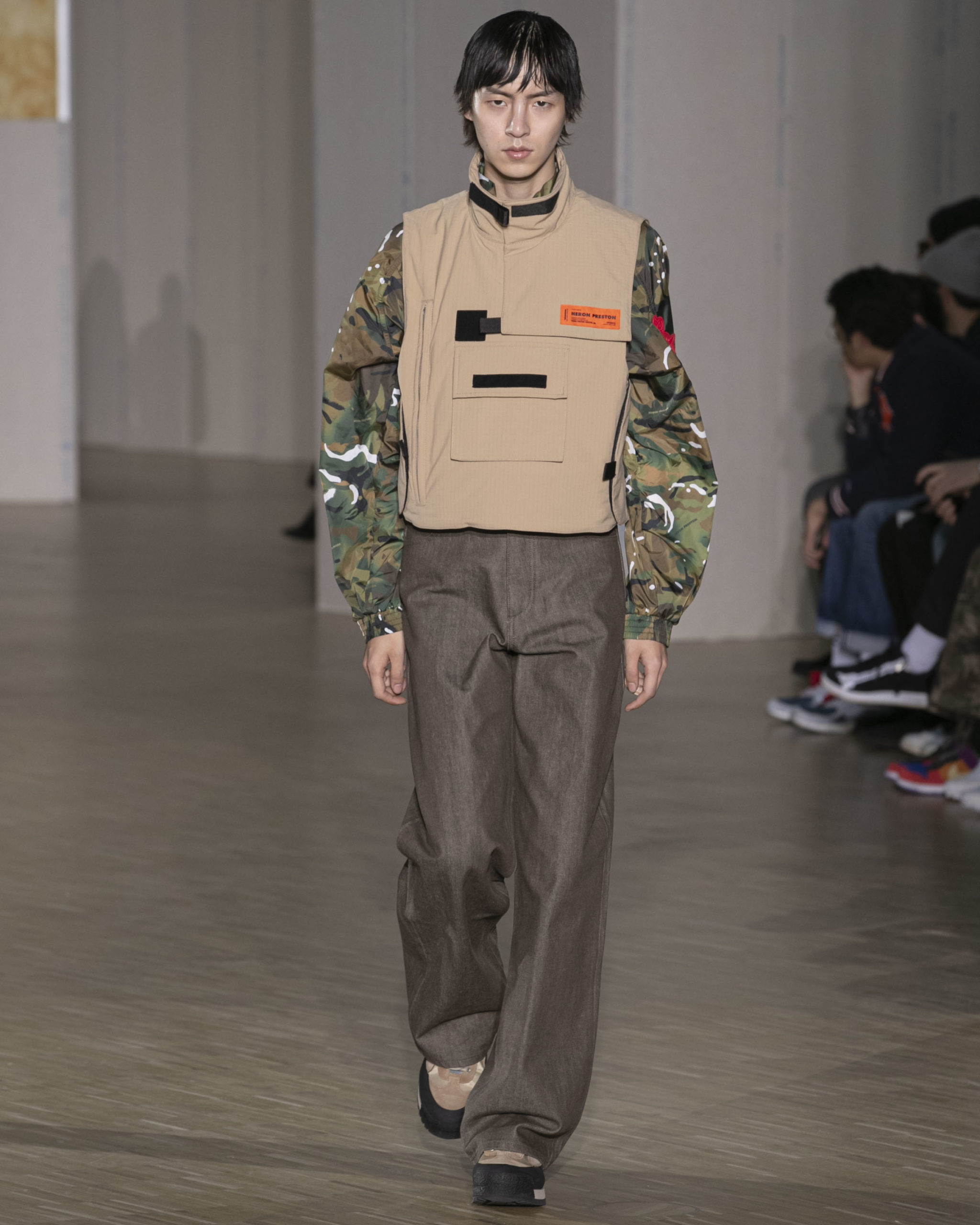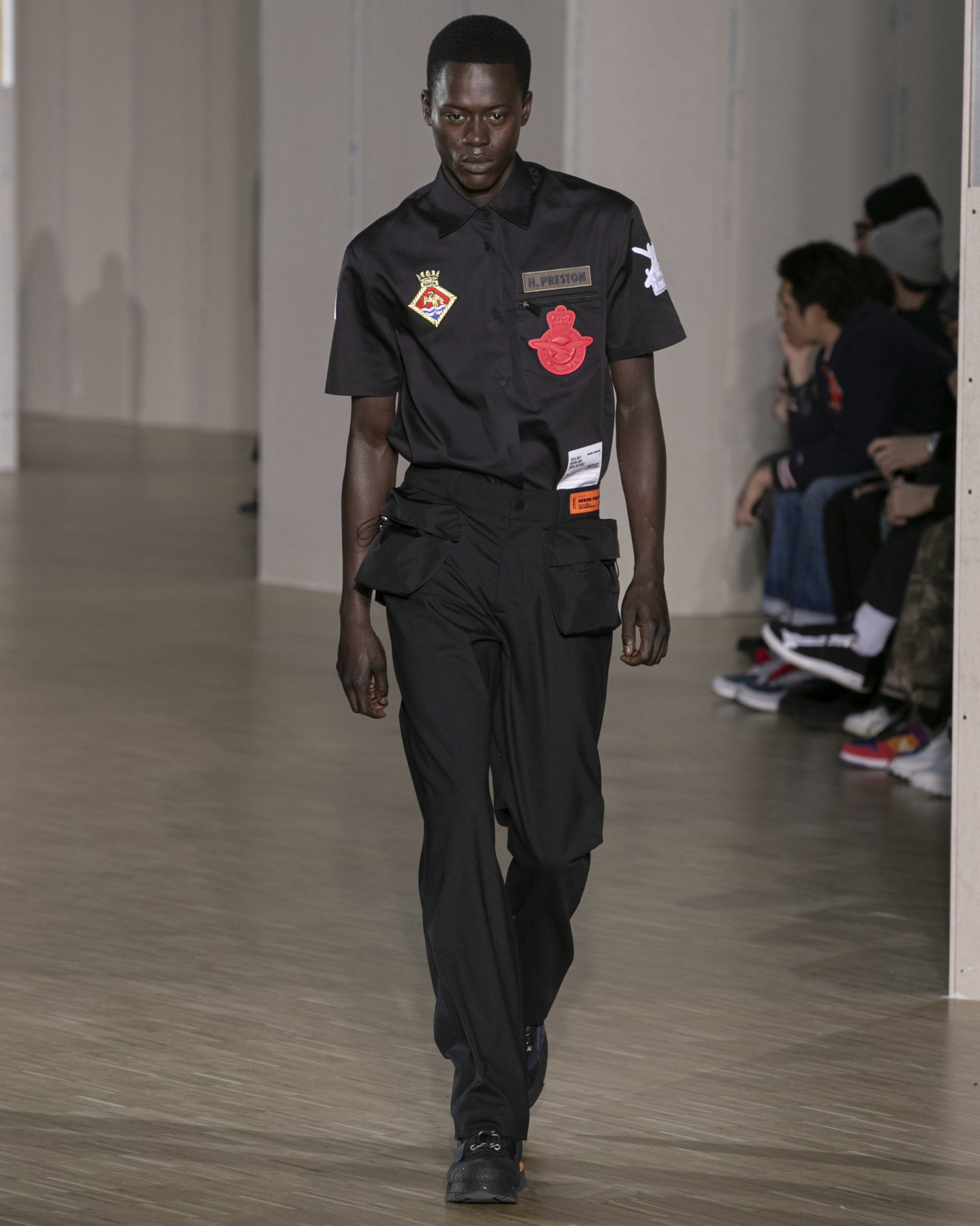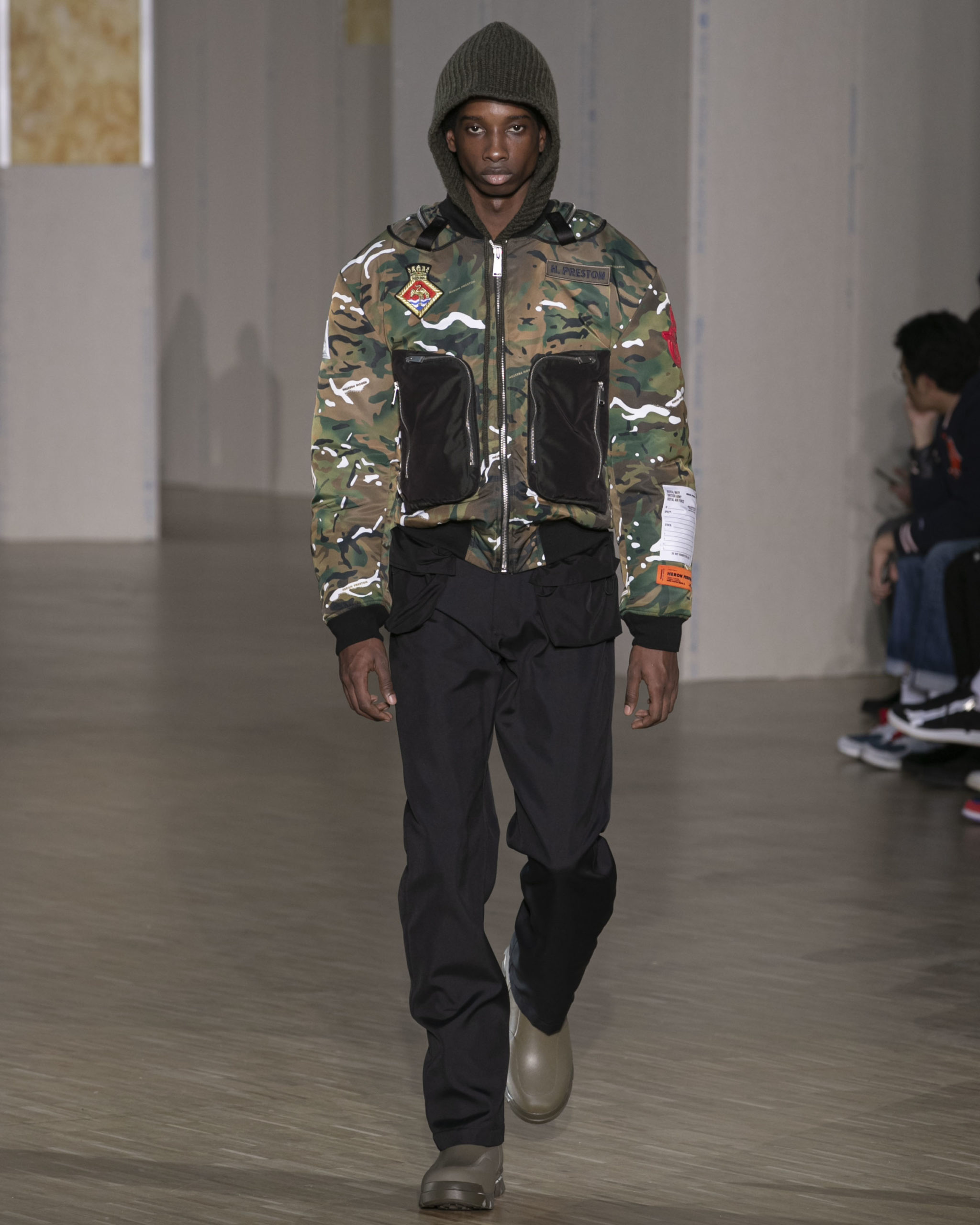 BRITISH MINISTRY OF DEFENCE COLLAB: For AW20, Preston collaborated with the British Ministry of Defence, specifically their wildlife conservation project which protects animals from poaching in Africa. Featuring an exclusive Heron patch, cargo pants and outerwear are derived from authentic apparel. Their Rhino patch is reimagined in white to highlight extinction issues. A portion of proceeds will be donated to the African Parks organization, who work directly with the Ministry of Defence.
