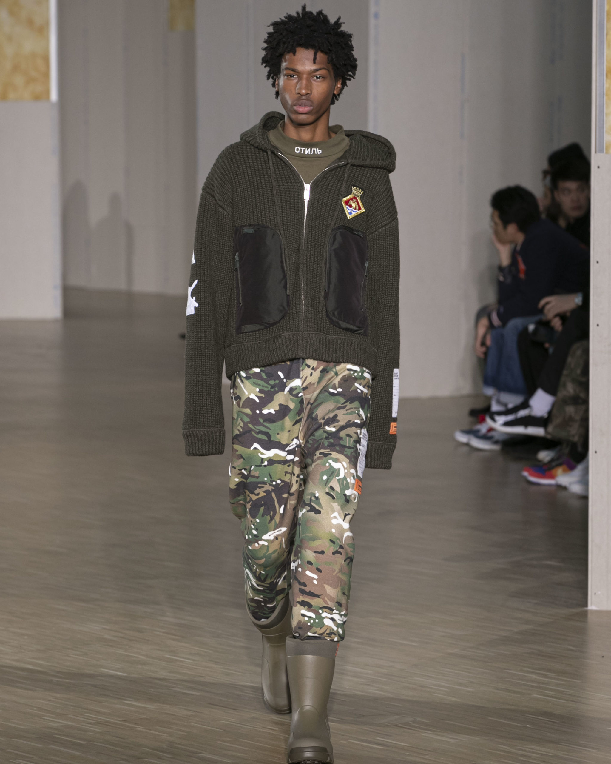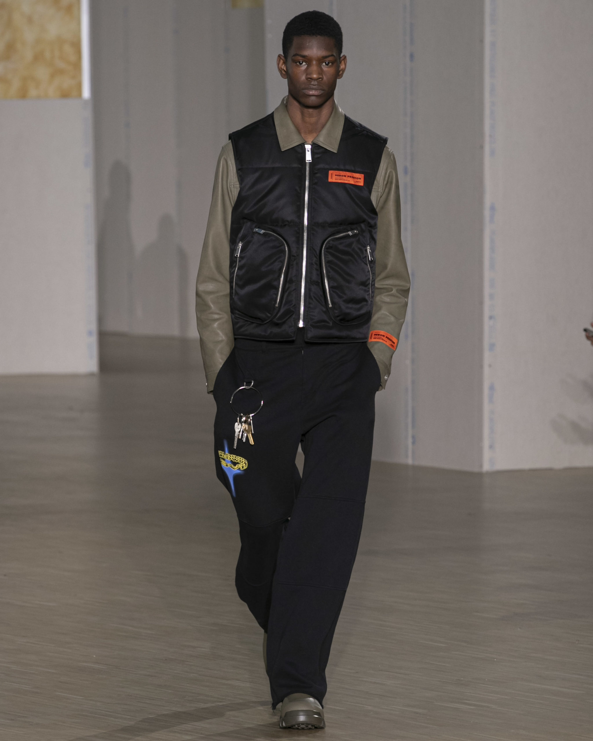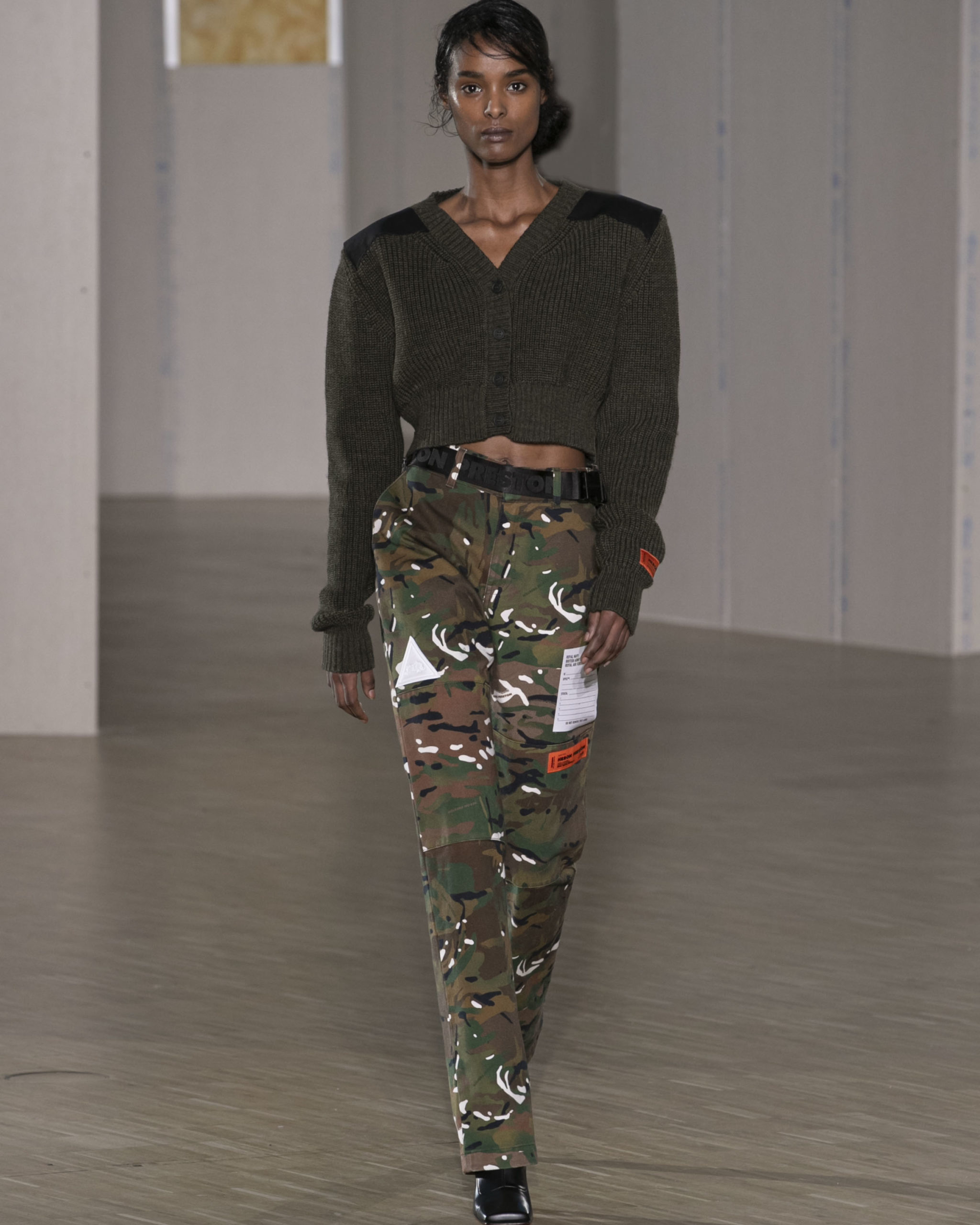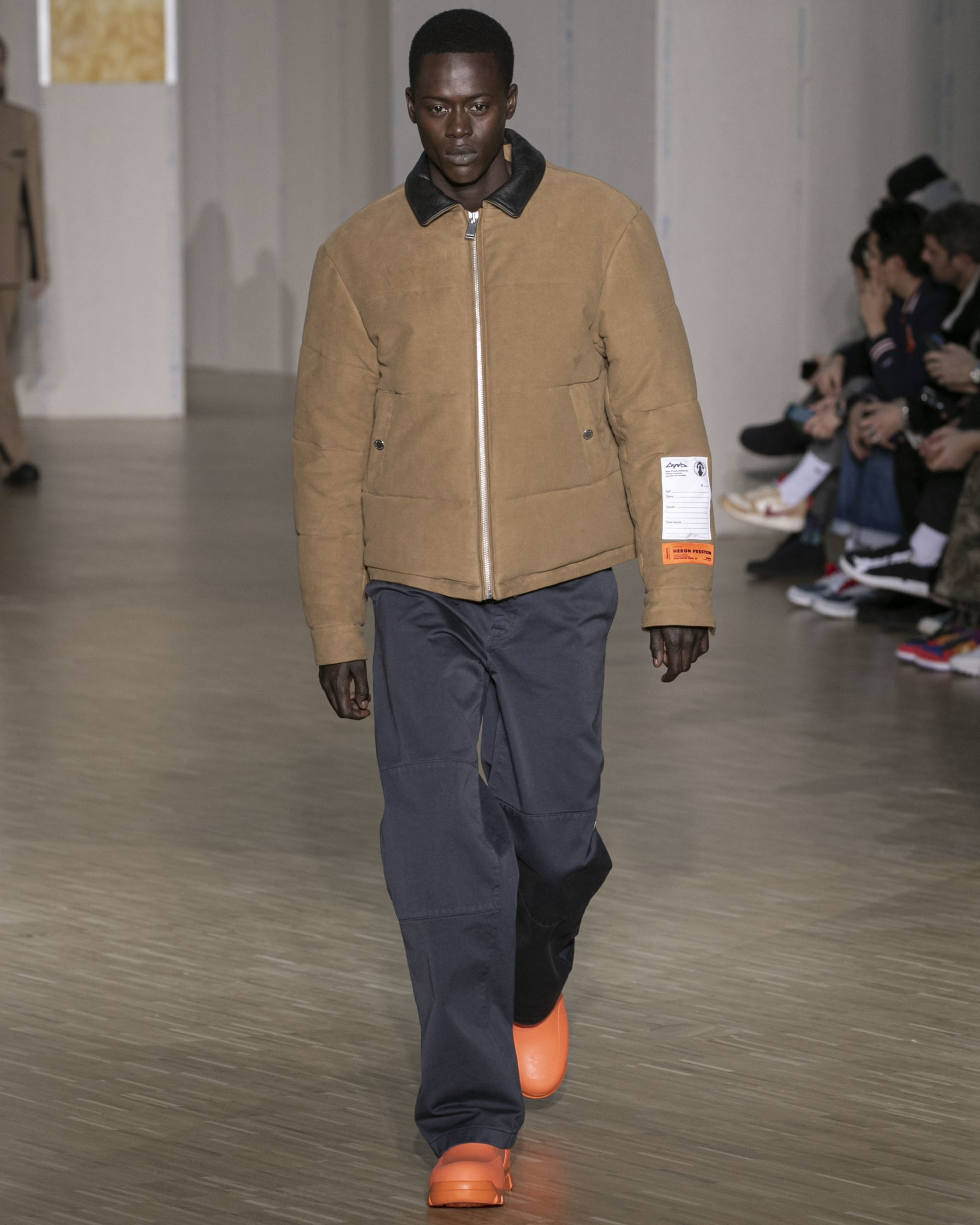 BRITISH MINISTRY OF DEFENCE COLLAB: For AW20, Preston collaborated with the British Ministry of Defence, specifically their wildlife conservation project which protects animals from poaching in Africa. Featuring an exclusive Heron patch, cargo pants and outerwear are derived from authentic apparel. Their Rhino patch is reimagined in white to highlight extinction issues. A portion of proceeds will be donated to the African Parks organization, who work directly with the Ministry of Defence.