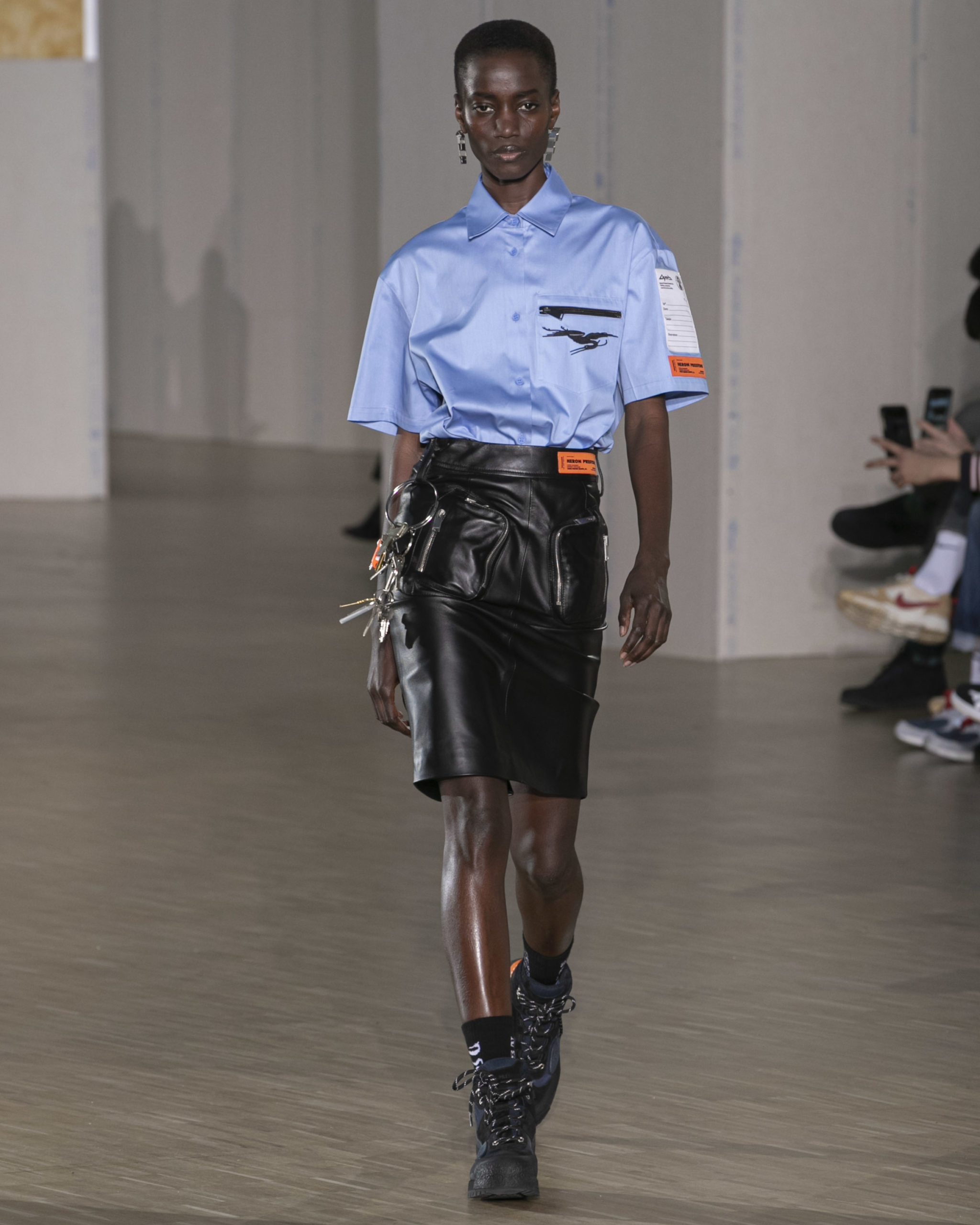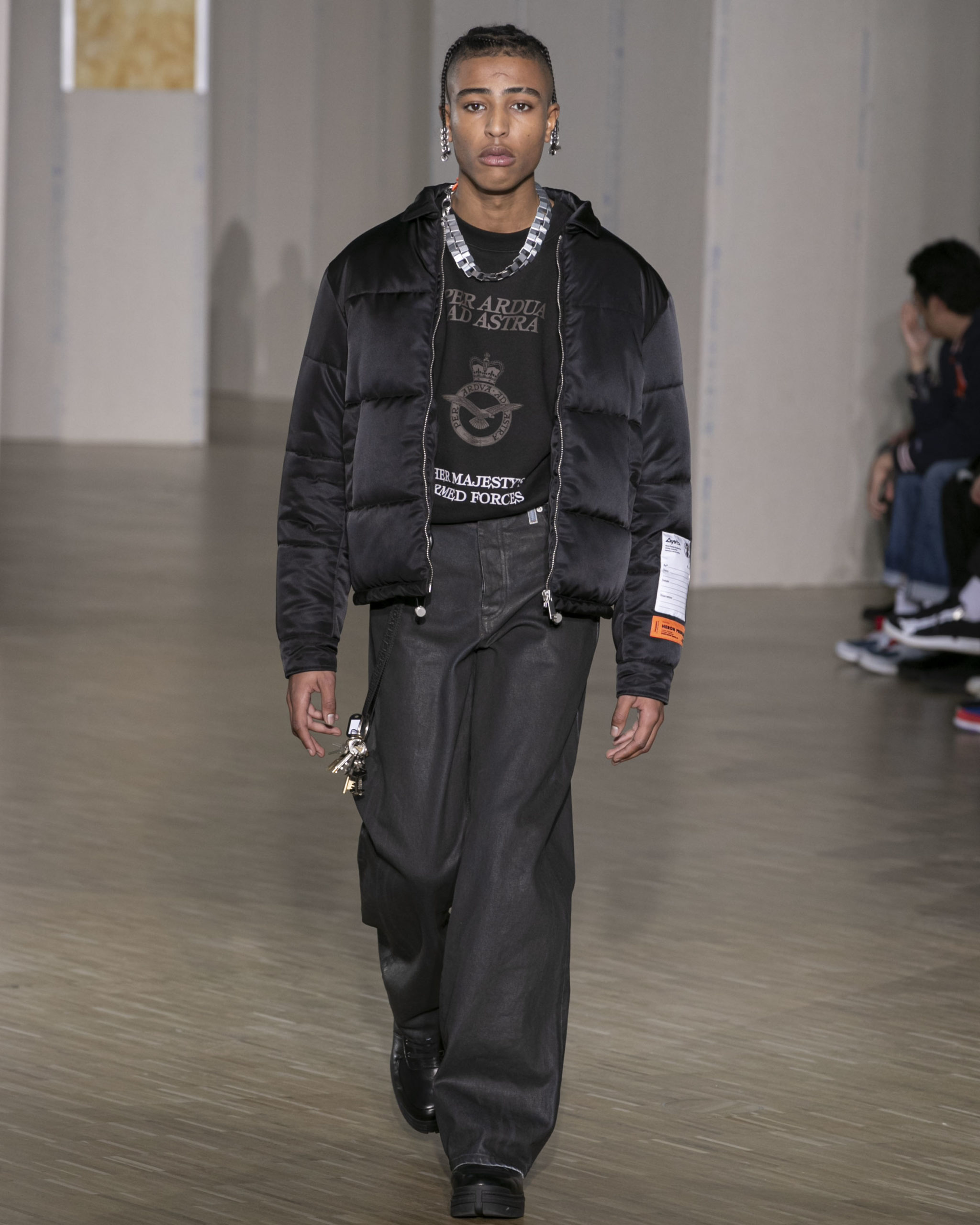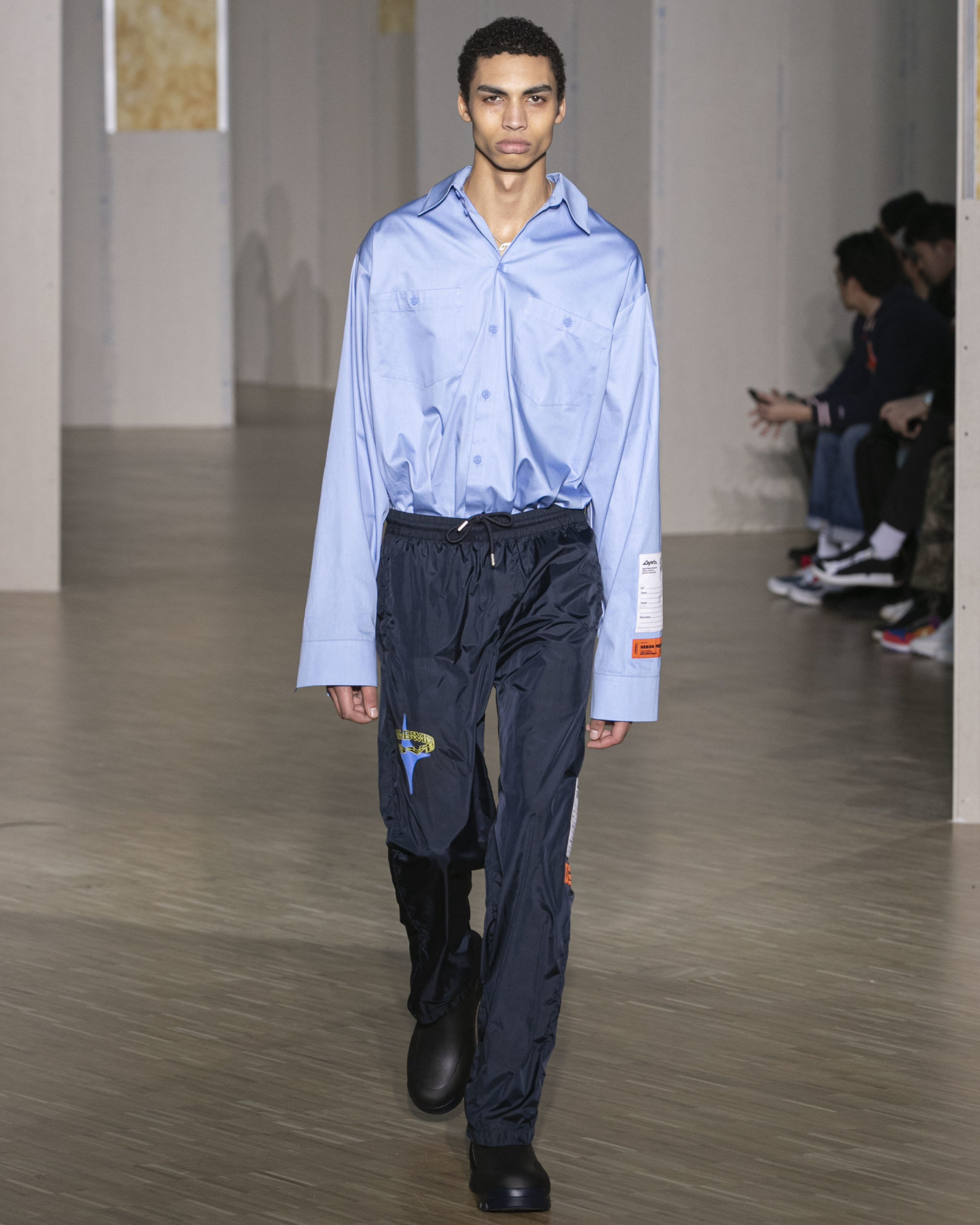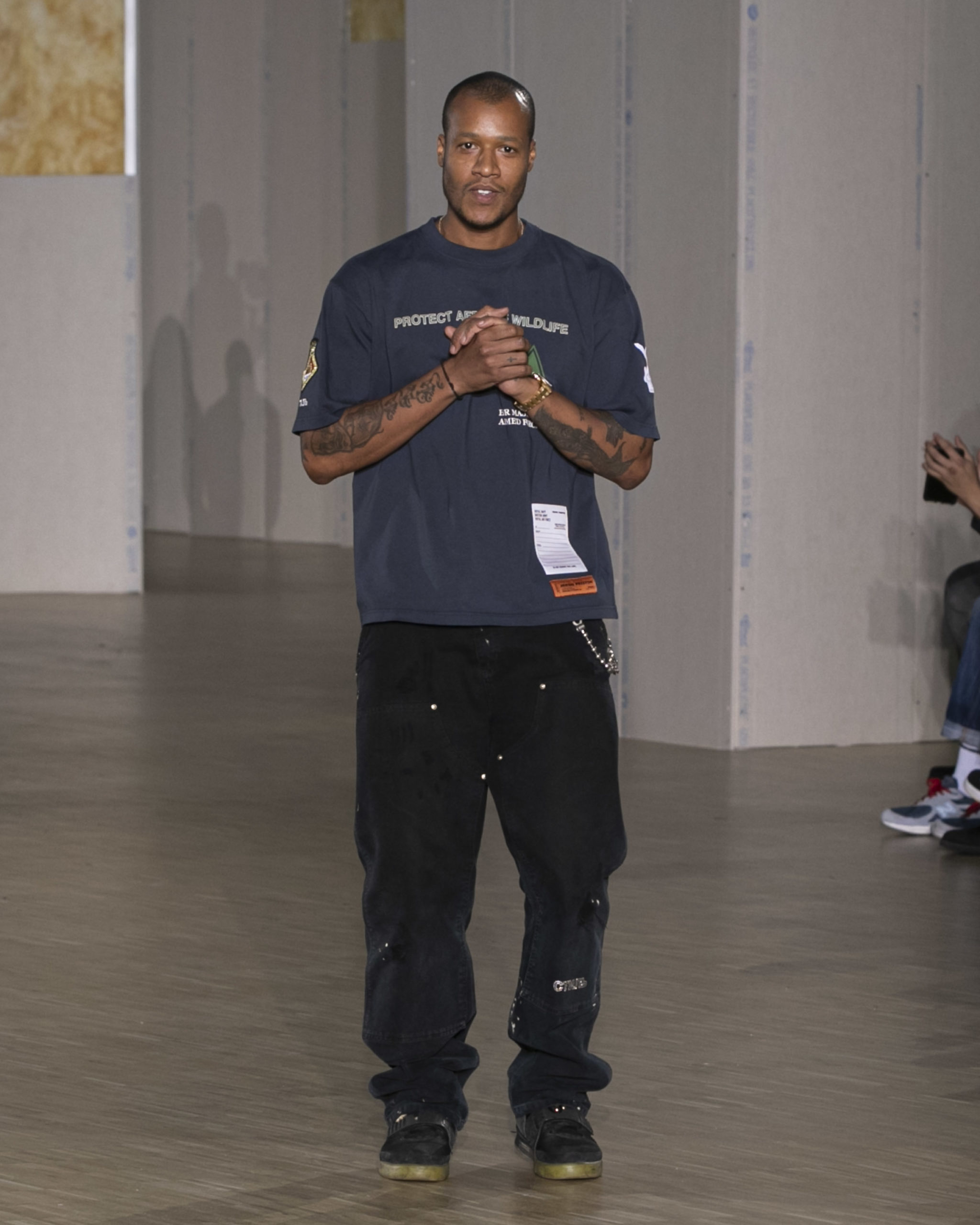 BRITISH MINISTRY OF DEFENCE COLLAB: For AW20, Preston collaborated with the British Ministry of Defence, specifically their wildlife conservation project which protects animals from poaching in Africa. Featuring an exclusive Heron patch, cargo pants and outerwear are derived from authentic apparel. Their Rhino patch is reimagined in white to highlight extinction issues. A portion of proceeds will be donated to the African Parks organization, who work directly with the Ministry of Defence.