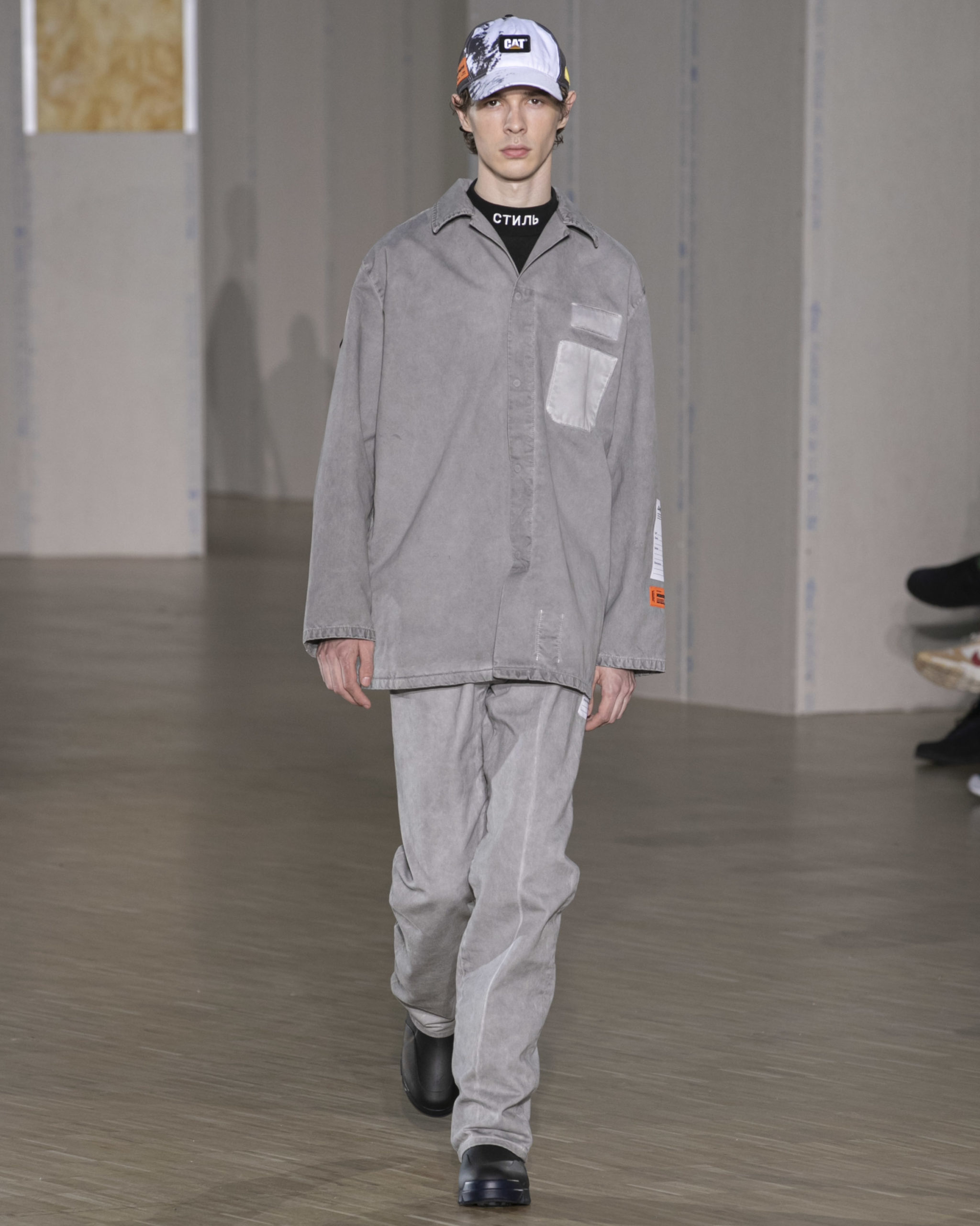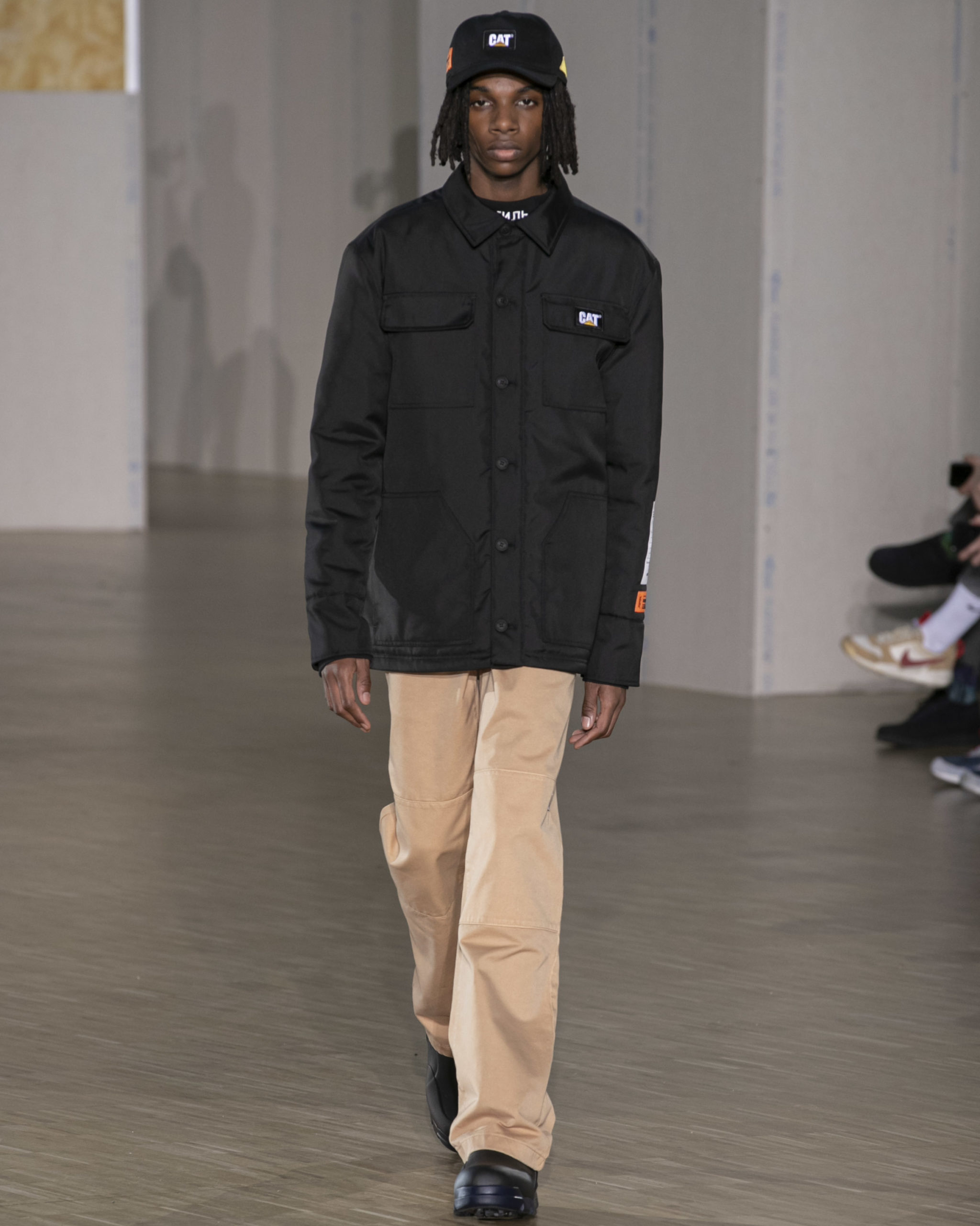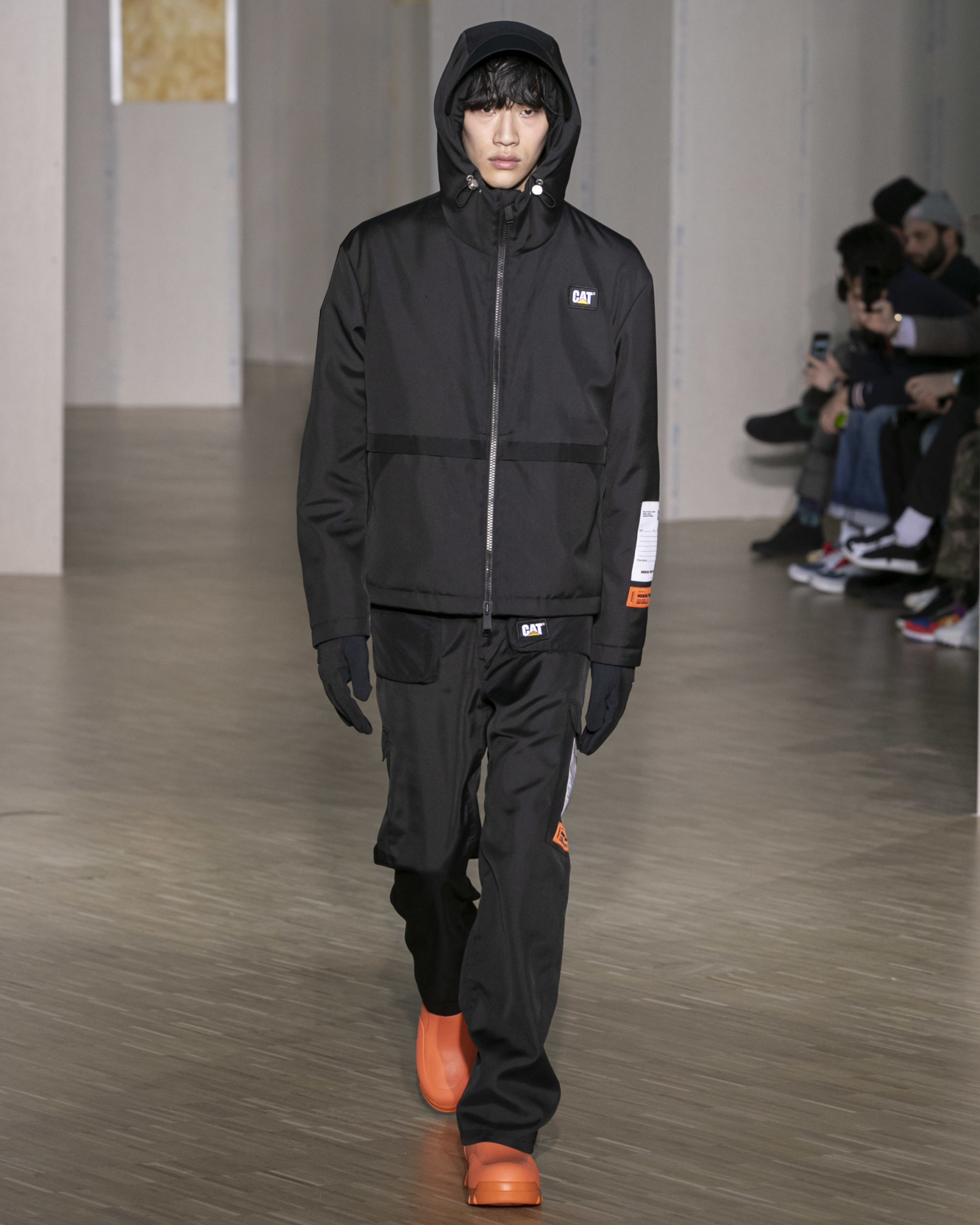 CATERPILLAR COLLAB: Authentic Cat Footwear Stormers boots with a signature orange colorway appear alongside outerwear, hoodies, t-shirts and hats. Preston found inspiration in the purpose-crafted Caterpillar workwear and rugged footwear he witnessed on construction sites all over NYC. In their everyday uniforms, these hard-working women and men are responsible for the infrastructure of our lives. Caterpillar’s mission of keeping those very workers safe and comfortable on the jobsite is integral to this collaborative capsule. Borrowing function, materials, intricate details and trims from the CAT workwear designs, and applying them to his collection, Preston understands wearing the Caterpillar logo means you are part of a community that literally built the streets.