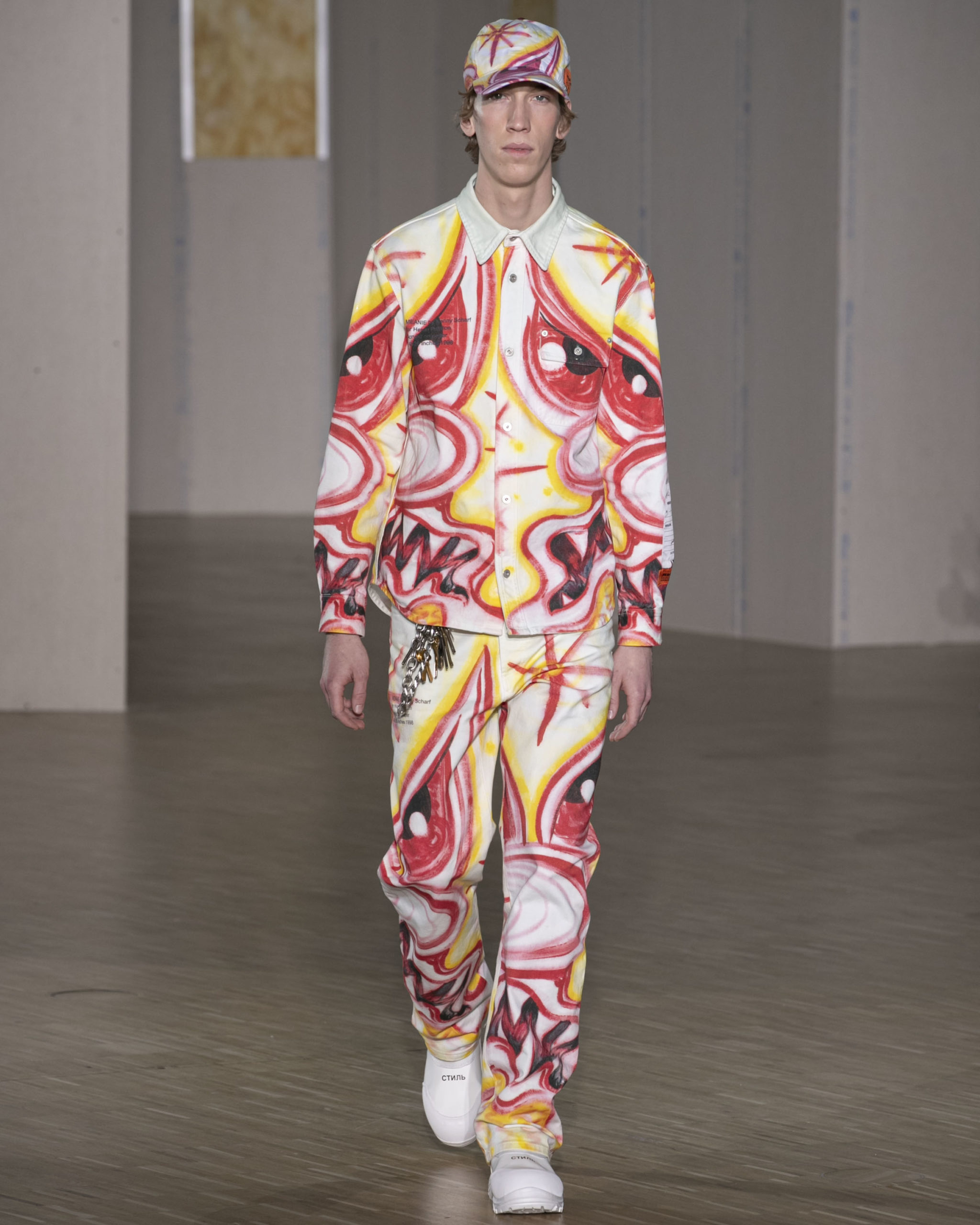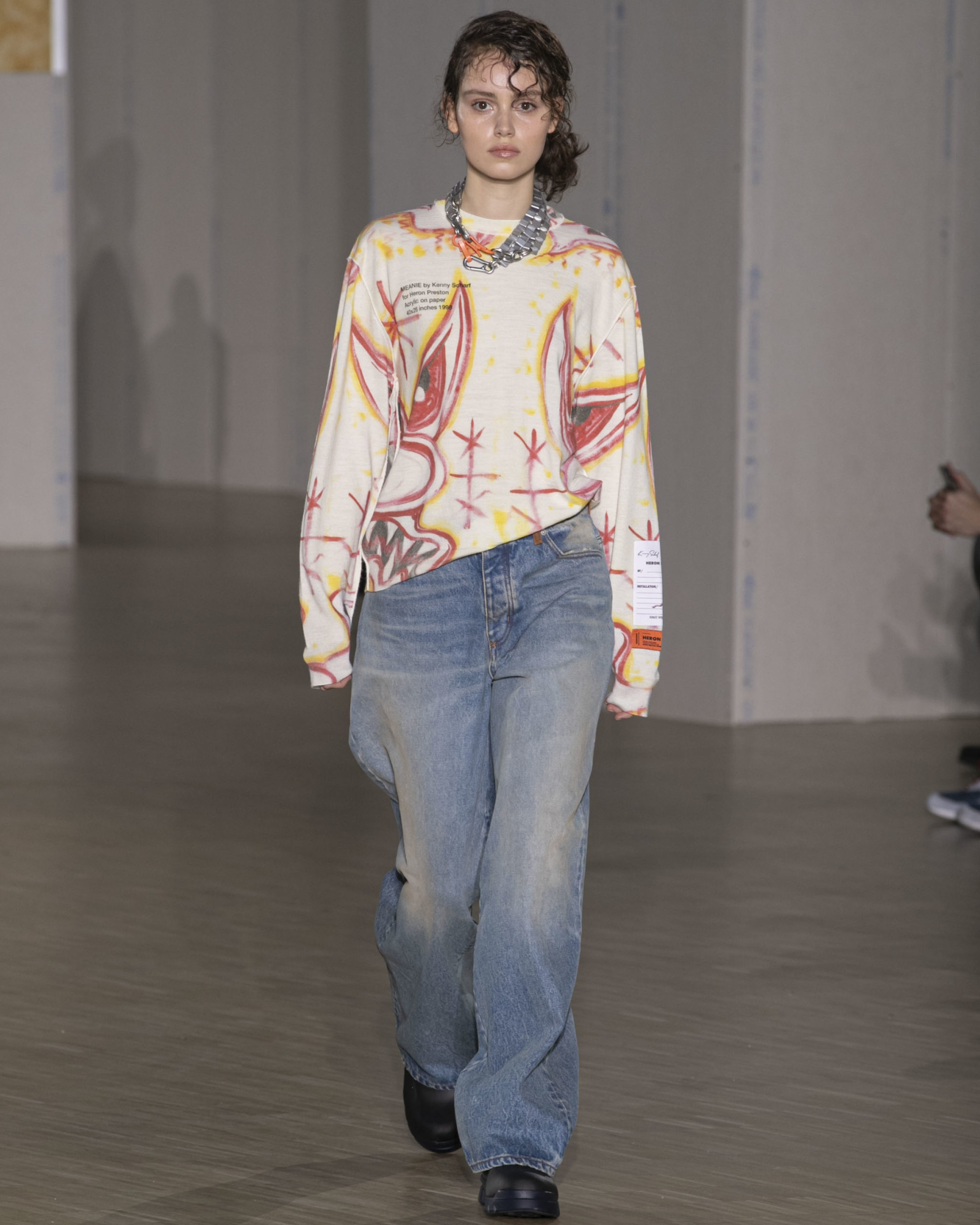 KENNY SCHARF COLLAB: “I went to Kenny’s studio in Los Angeles. I really wanted to look for a painting that I felt would be fitting for the collection,” says Preston. “The work on paper is called Meanie from 1998. We also commissioned Kenny to do another painting specifically for the collection which is my iconic Heron bird that I do every year. This is the first time that I’m having an artist reinterpret the bird, a graphic I launched in season one. Kenny Scharf is a global legend who made his name in the East Village of New York City running around with Basquiat, Keith Haring and Andy Warhol. I’ve been living in New York since 2004 and he is part of the city: the first time I experienced his work was on the street not a museum. There’s an anti-elitist vision that speaks to me and what we do.”