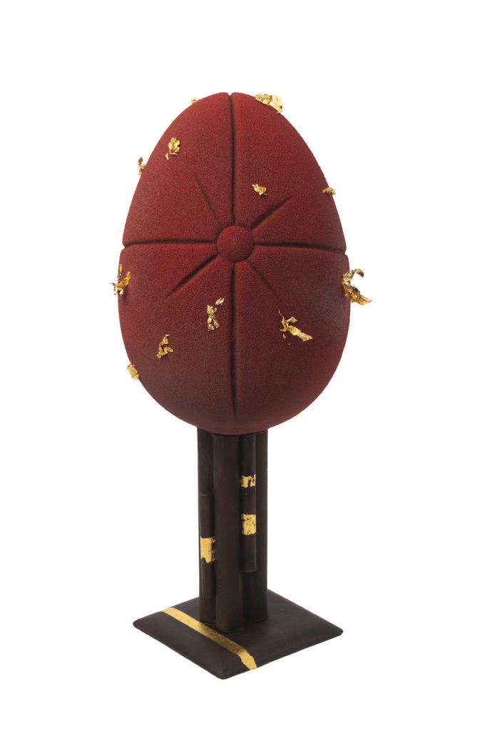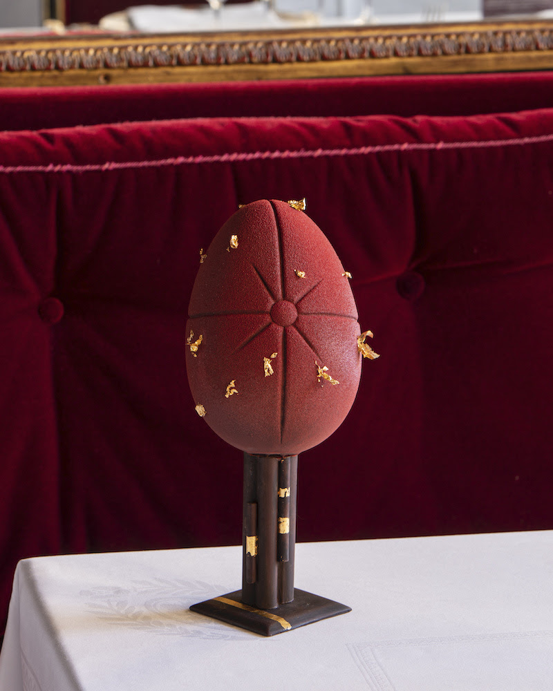 Clin d’oeil aux emblématiques banquettes en velours rouge de la grande salle du restaurant, l’édition 2020 de l’oeuf de Pâques du Grand Véfour est minutieusement sculptée à la main, pour lui donner cet aspect texturé et capitonné.