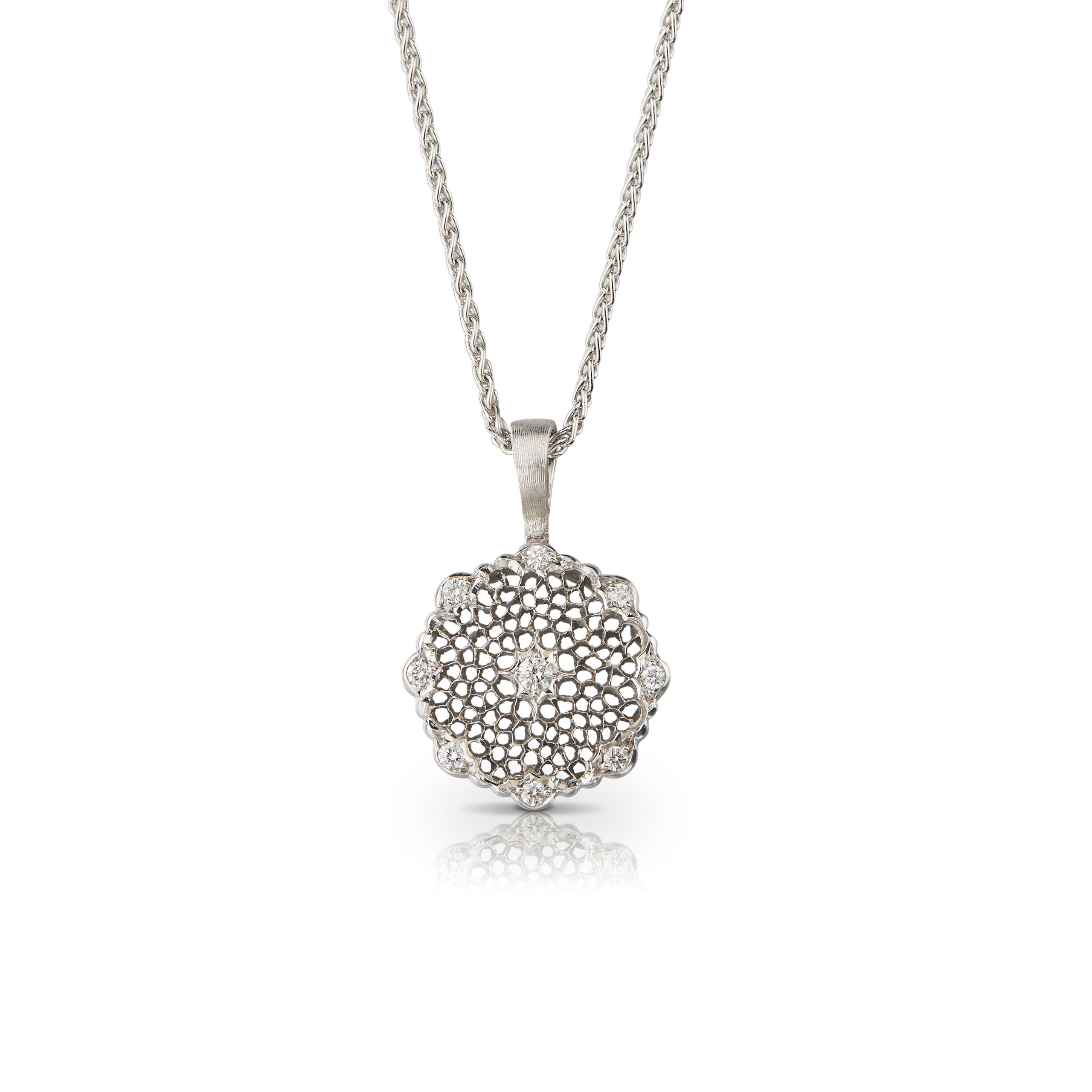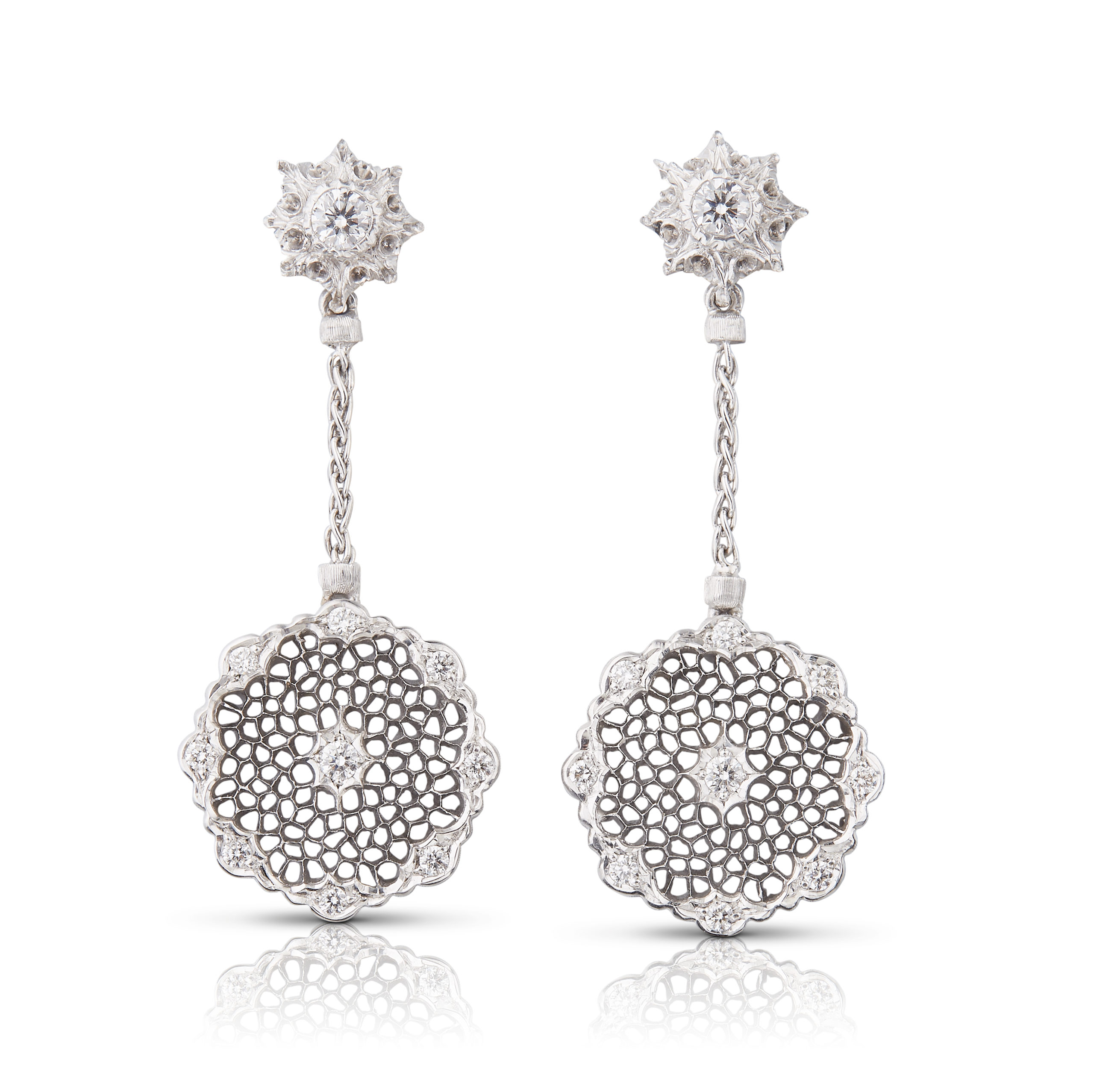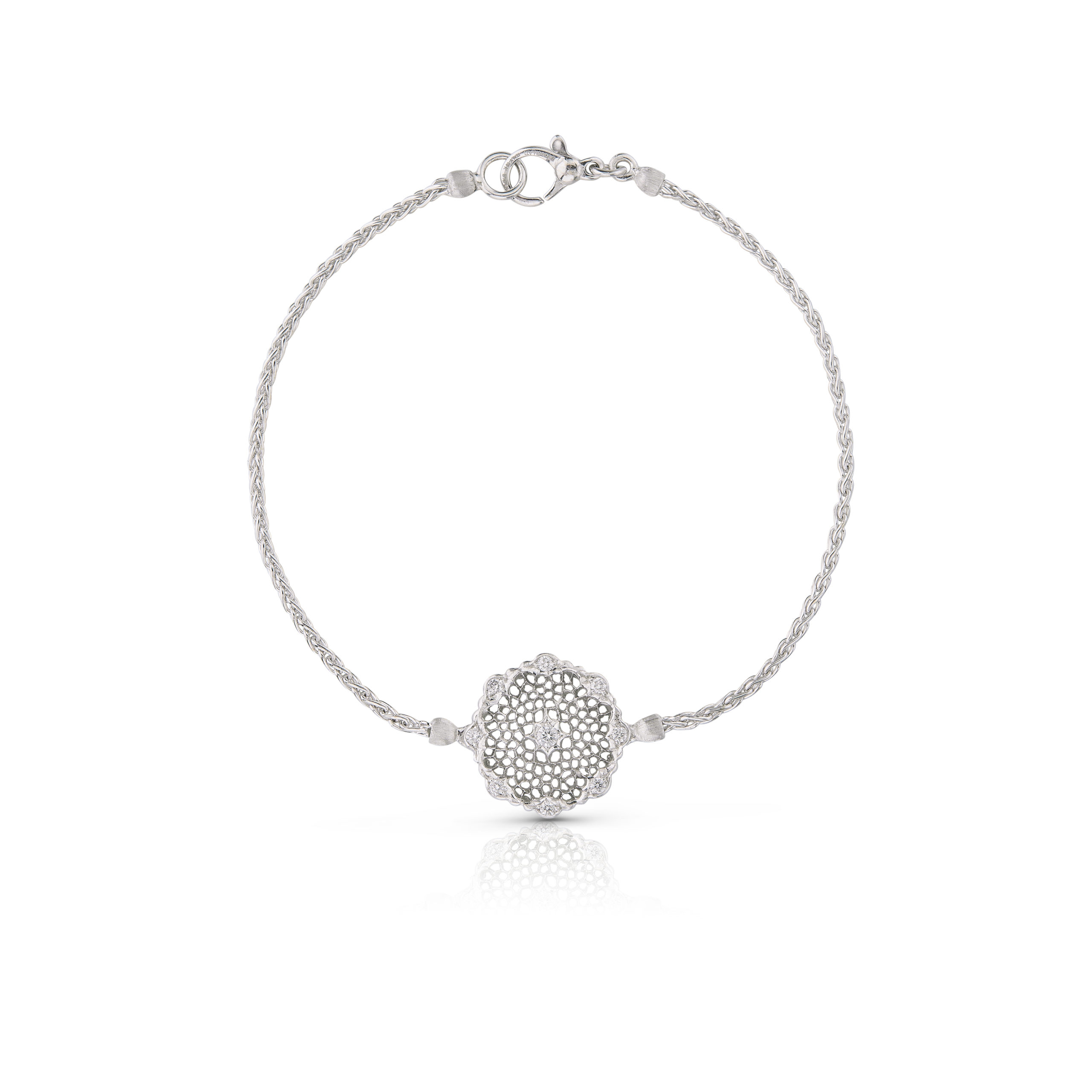 Cette ligne Mini Tulle est composée, d’une bague, de boutons d’oreilles, de boucles d’oreilles pendantes, d’un bracelet et d’un pendentif en dentelle d’or blanc gravé et diamants prix à partir de 7 700 euros.