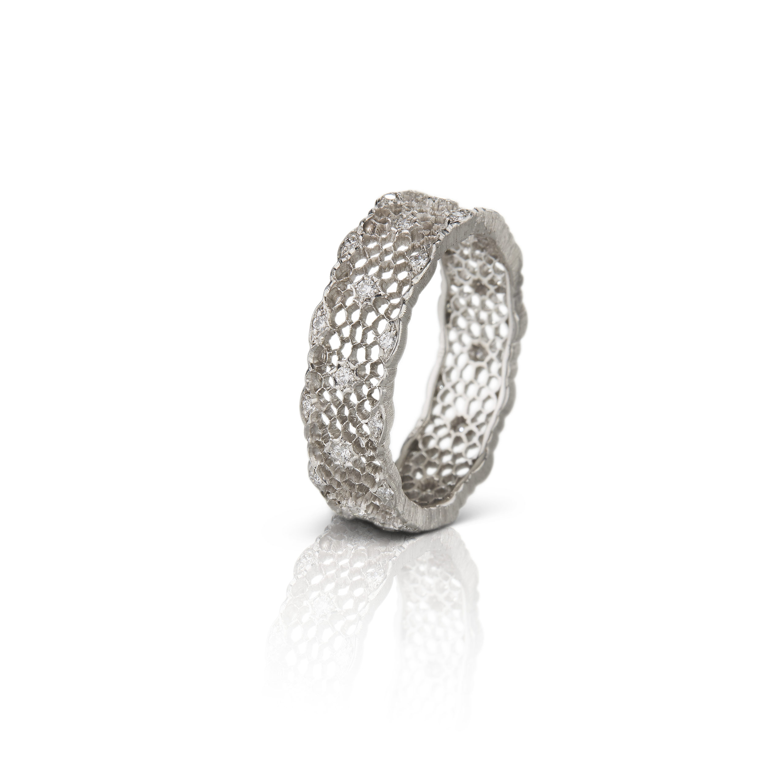 La ligne Tulle a été créée par Mario Buccellati dans les années 20, il a trouvé son inspiration dans les précieuses dentelles de Venise. Le motif de dentelle que l’on retrouve sur cette ligne rappelle aussi celui du nid d’abeille, signature de la Maison Buccellati.