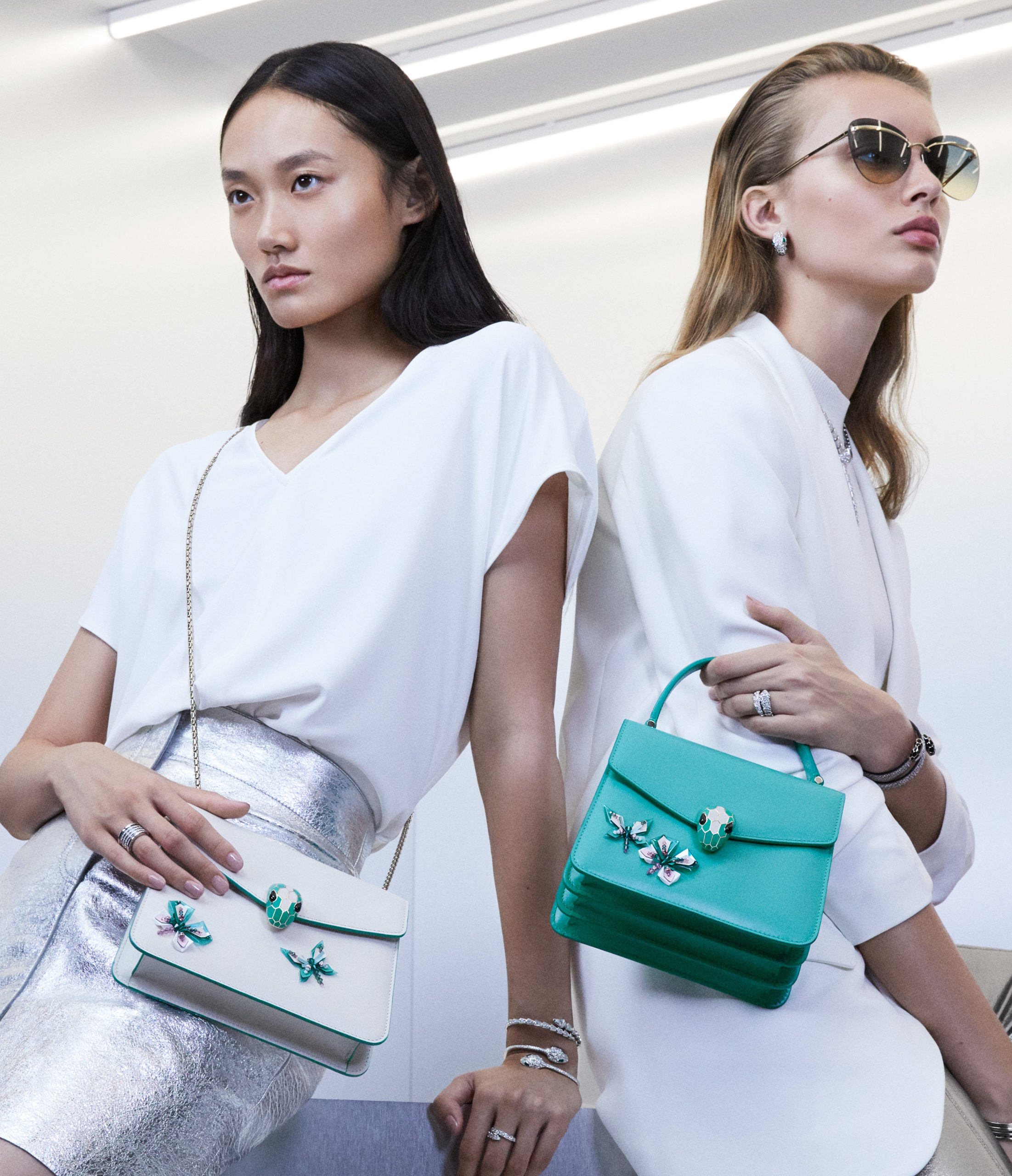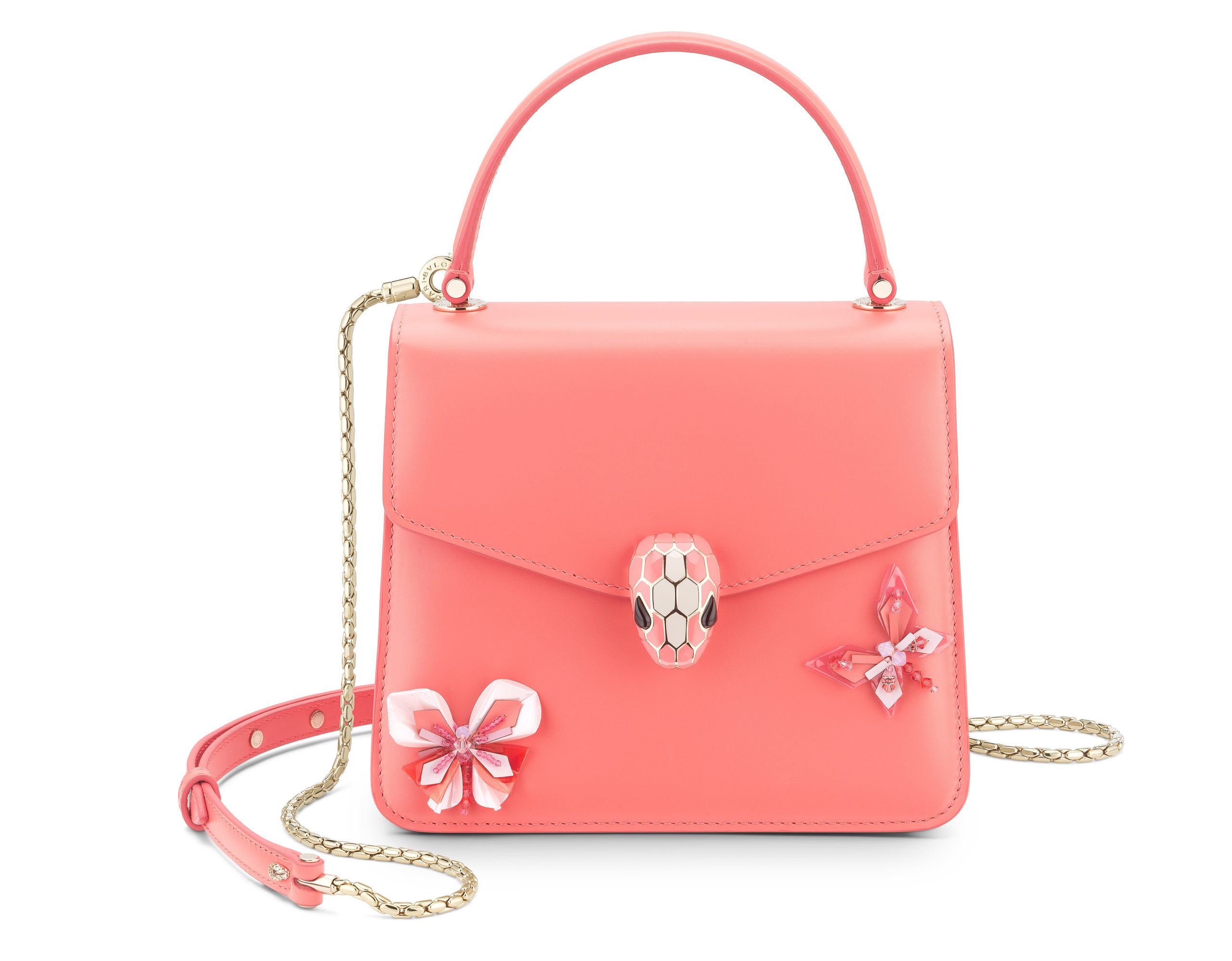 D’esprit espiègle et ultra-féminin, les battements d’ailes de ces papillons donnent vie à deux icones intemporelles de la collection Serpenti Forever – l’emblématique sac à bandoulière avec rabat et fermoir en tête de serpent et le versatile sac à bandoulière avec poignée. Les deux sont habillés de teintes pastel printanières, allant du cuir de veau White Agate rehaussés de détails couleurs Rosa di Francia et Arctic Jade, à une interprétation ton sur ton en Rosa di Francia, ou encore avec des versions lumineuses en cuir de veau Silky Coral ou Arctic Jade sublimées par des broderies ton sur ton.
