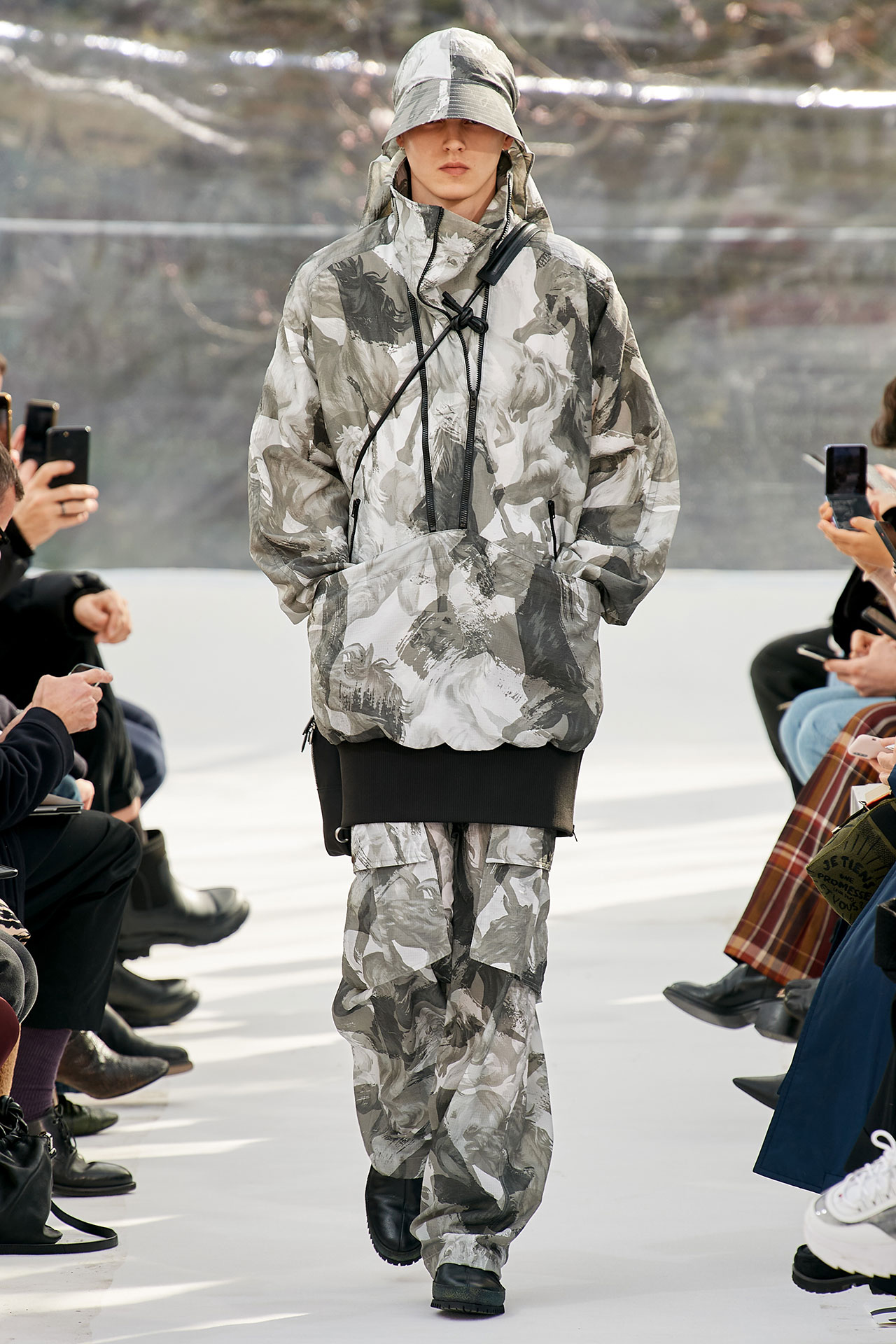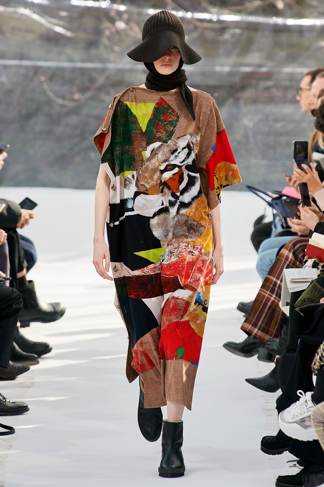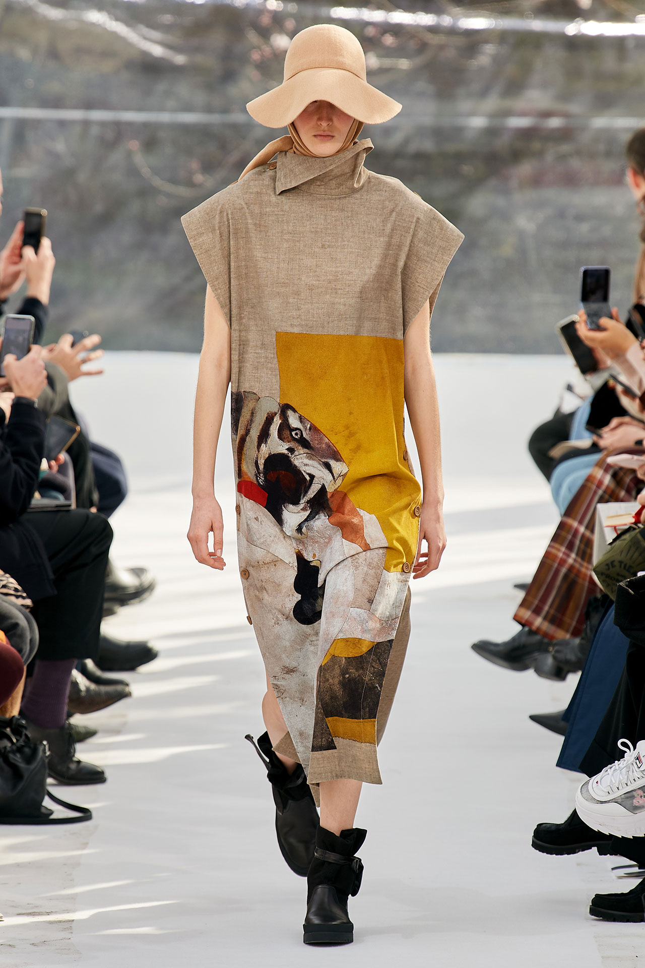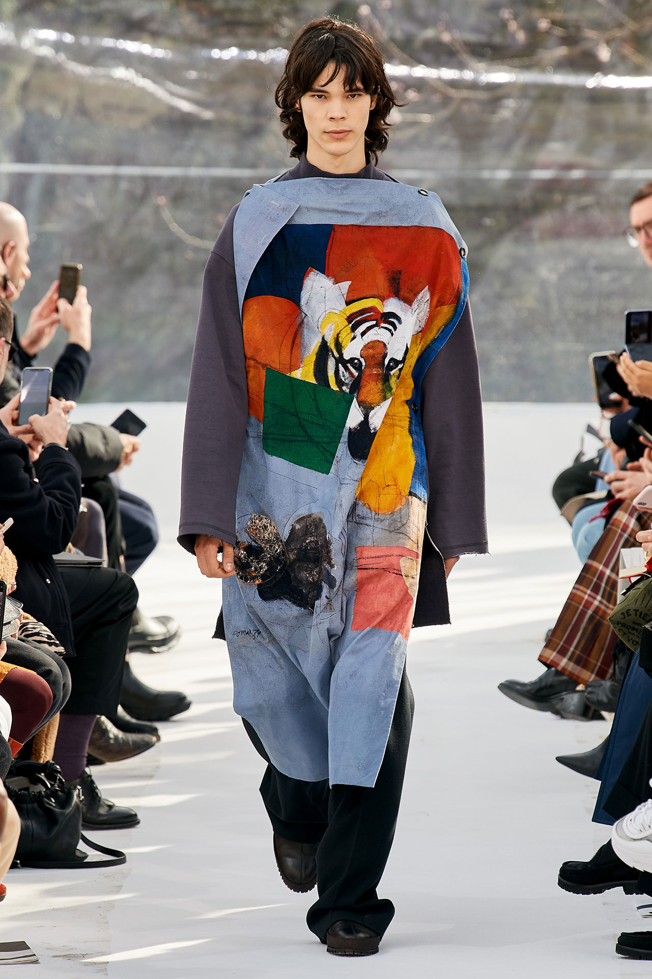 The colours come from nature, at times illuminated by camouflage prints that are in fact a trompel’oeil of roses. This organic palette composes a unique painting at each glance, like colours as passers-by, or a garment that transforms into a canvas of a giant tiger head. These are “painting-dresses”, taken from the works of neo-realist artist Júlio Pomar (1926-2018). A Lisbon painter who lived in Paris for a long time and considered one of the greatest figures of Portuguese XXth century art. In the 1980s, fascinated by tigers, Júlio Pomar created a major series of works on this feline. The amplitude of cuts, moving close and away from the body, attests to the dynamism of this wardrobe and its slender silhouette. The superimposition of materials adds to its energy. The House of KENZO, through this initial collection, celebrates the wanderers of life. The transparent tubular structure that makes up the set of the show is designed as a modular nomadic object. It will be re-used in other forms at events in the coming seasons, such as pop-up stores or presentations. KENZO is committed to recycling the set, which can be transformed into new objects.