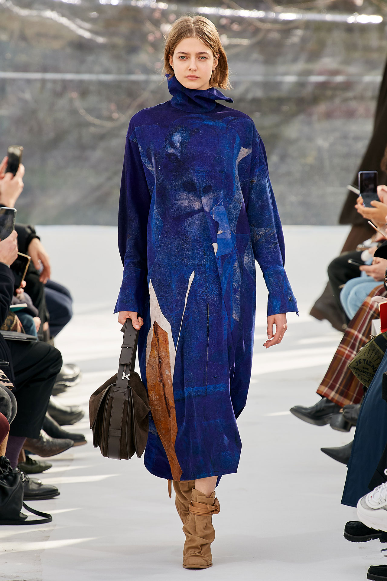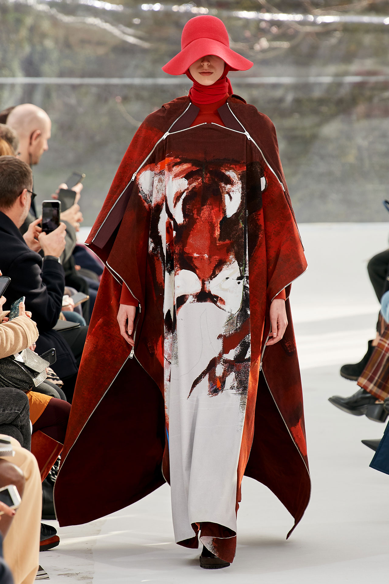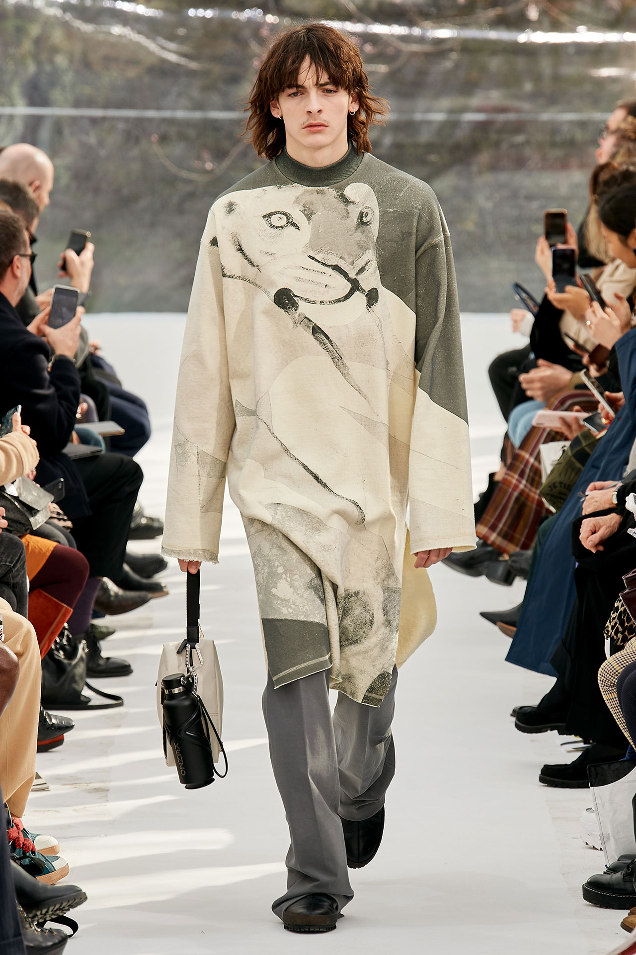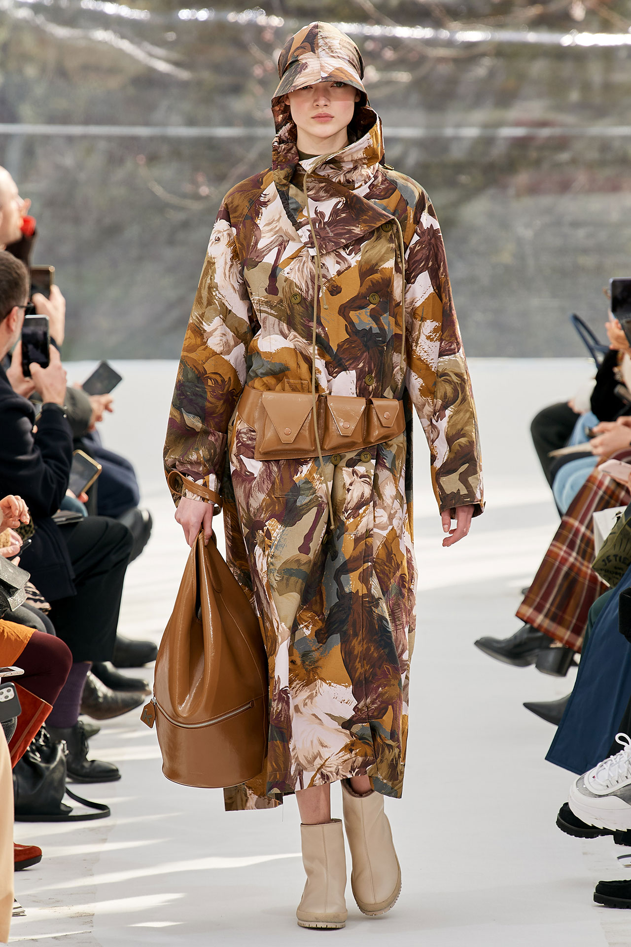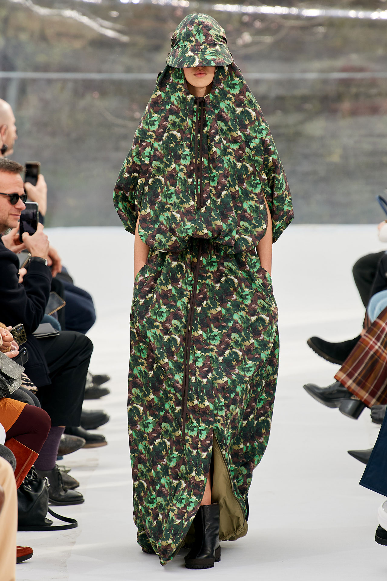 The colours come from nature, at times illuminated by camouflage prints that are in fact a trompel’oeil of roses. This organic palette composes a unique painting at each glance, like colours as passers-by, or a garment that transforms into a canvas of a giant tiger head. These are “painting-dresses”, taken from the works of neo-realist artist Júlio Pomar (1926-2018). A Lisbon painter who lived in Paris for a long time and considered one of the greatest figures of Portuguese XXth century art. In the 1980s, fascinated by tigers, Júlio Pomar created a major series of works on this feline. The amplitude of cuts, moving close and away from the body, attests to the dynamism of this wardrobe and its slender silhouette. The superimposition of materials adds to its energy. The House of KENZO, through this initial collection, celebrates the wanderers of life. The transparent tubular structure that makes up the set of the show is designed as a modular nomadic object. It will be re-used in other forms at events in the coming seasons, such as pop-up stores or presentations. KENZO is committed to recycling the set, which can be transformed into new objects.