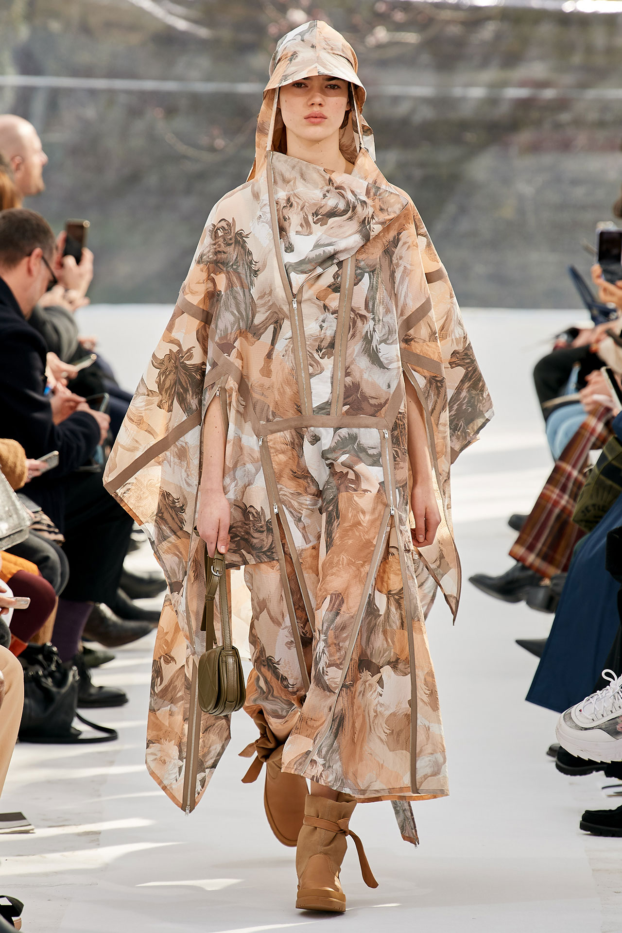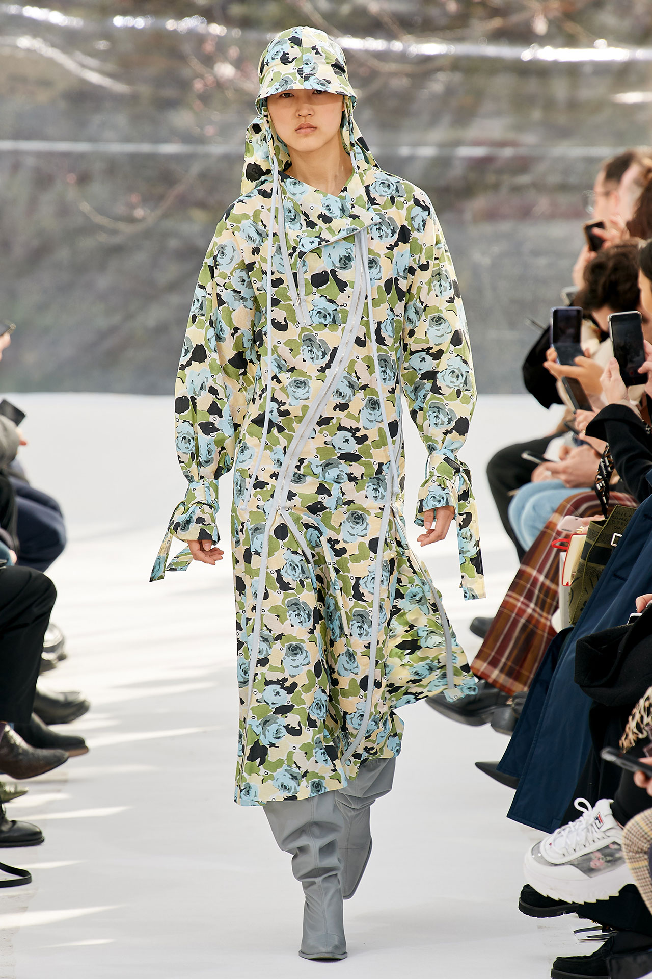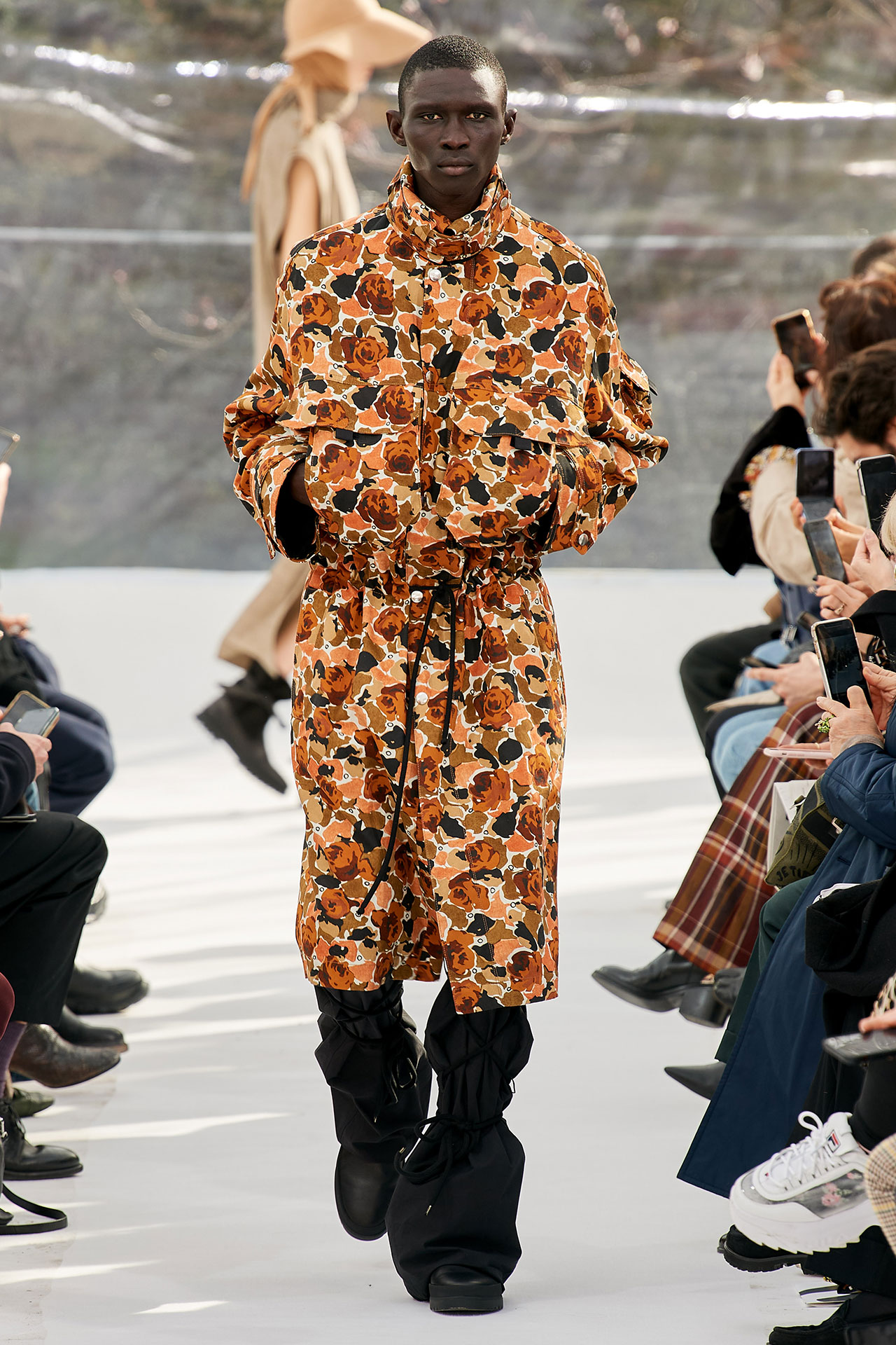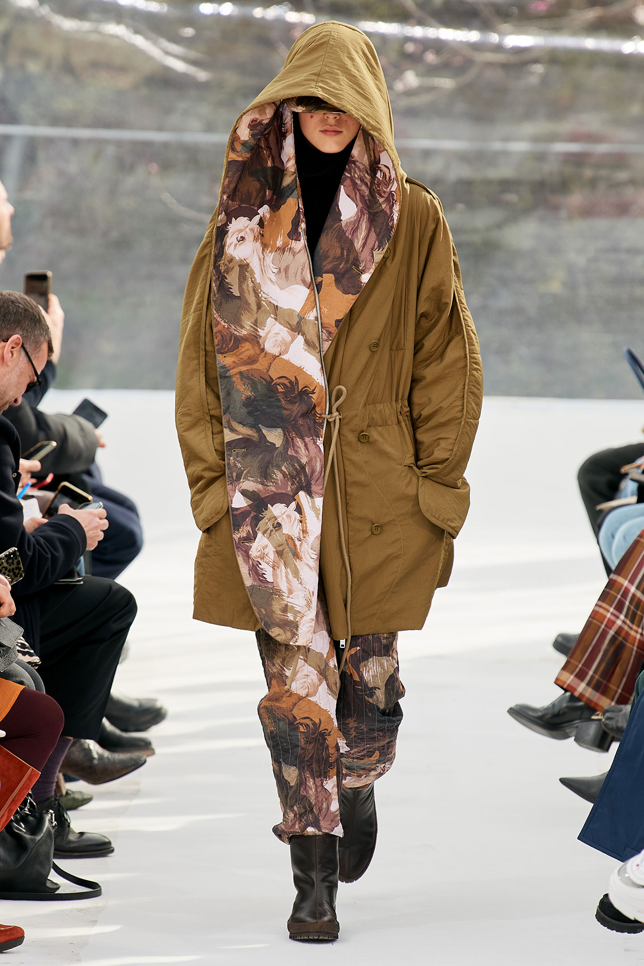 The colours come from nature, at times illuminated by camouflage prints that are in fact a trompel’oeil of roses. This organic palette composes a unique painting at each glance, like colours as passers-by, or a garment that transforms into a canvas of a giant tiger head. These are “painting-dresses”, taken from the works of neo-realist artist Júlio Pomar (1926-2018). A Lisbon painter who lived in Paris for a long time and considered one of the greatest figures of Portuguese XXth century art. In the 1980s, fascinated by tigers, Júlio Pomar created a major series of works on this feline. The amplitude of cuts, moving close and away from the body, attests to the dynamism of this wardrobe and its slender silhouette. The superimposition of materials adds to its energy. The House of KENZO, through this initial collection, celebrates the wanderers of life. The transparent tubular structure that makes up the set of the show is designed as a modular nomadic object. It will be re-used in other forms at events in the coming seasons, such as pop-up stores or presentations. KENZO is committed to recycling the set, which can be transformed into new objects.