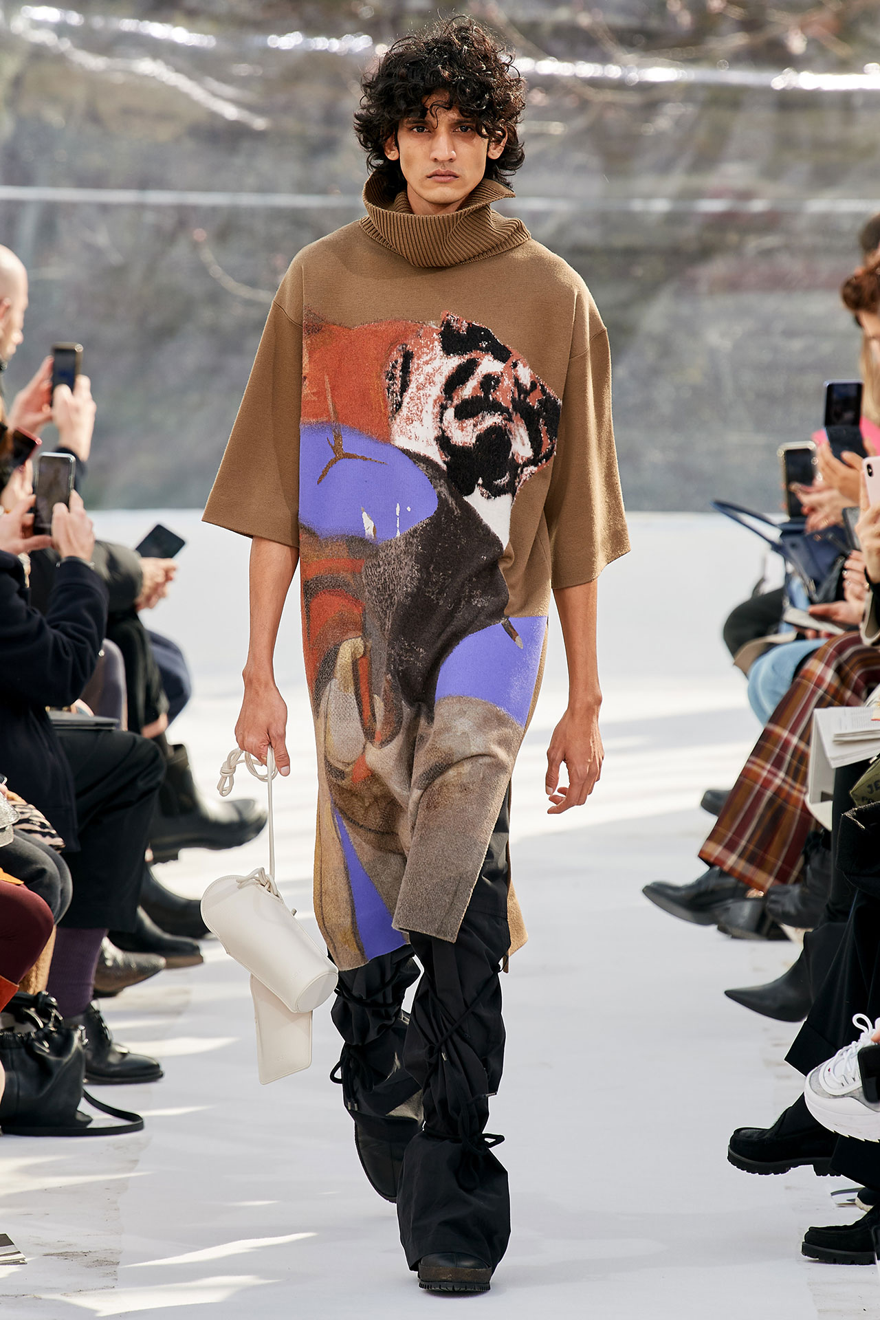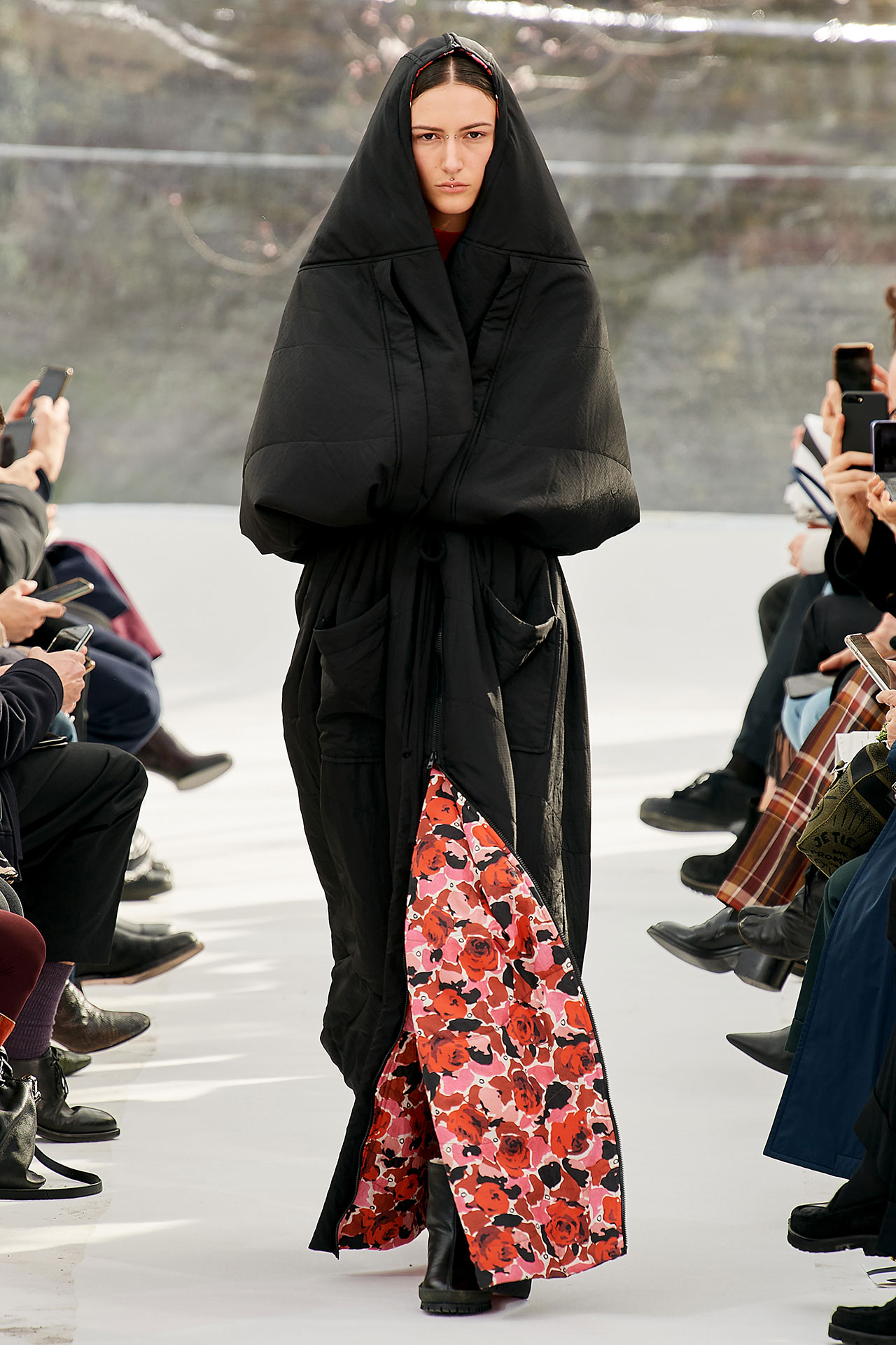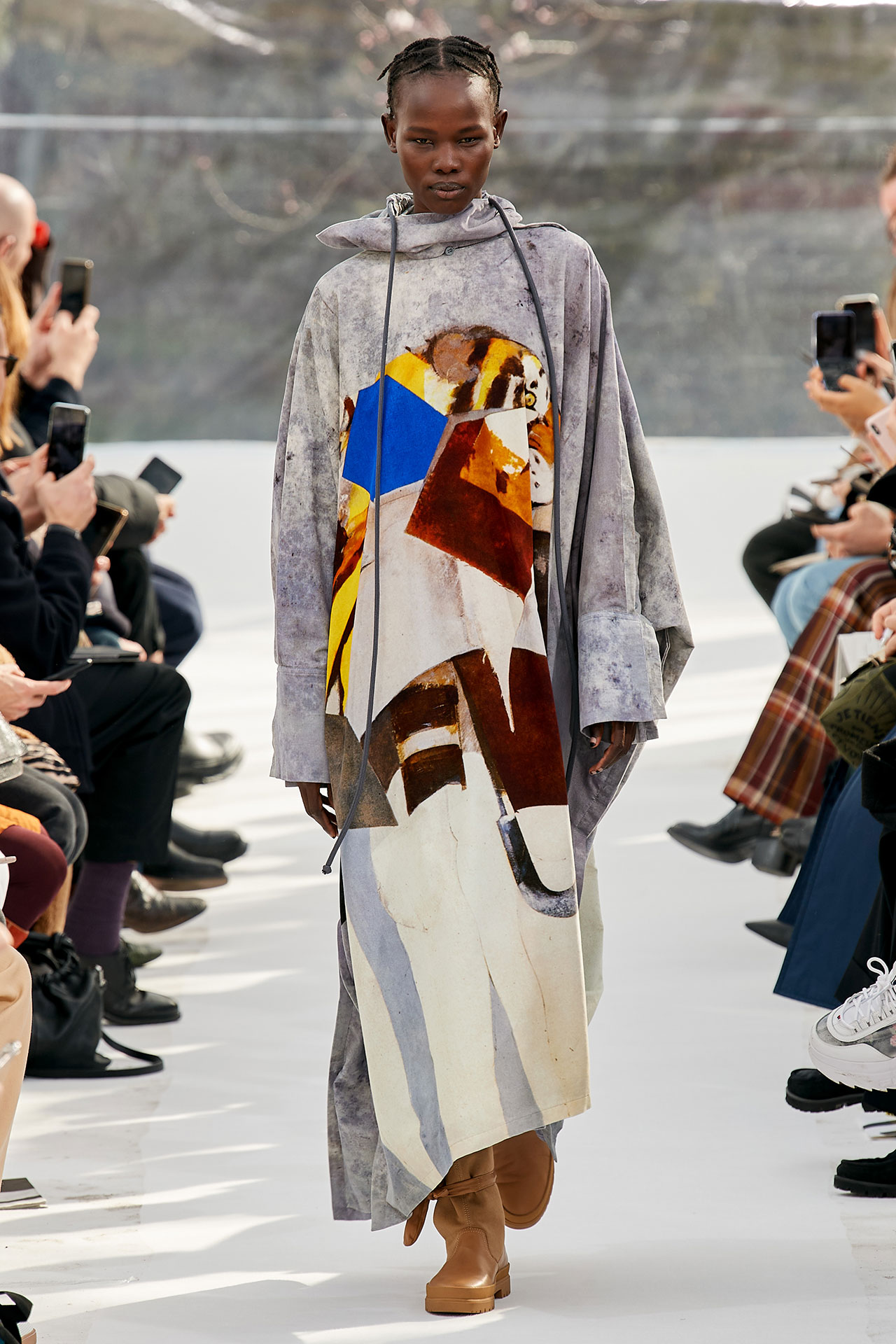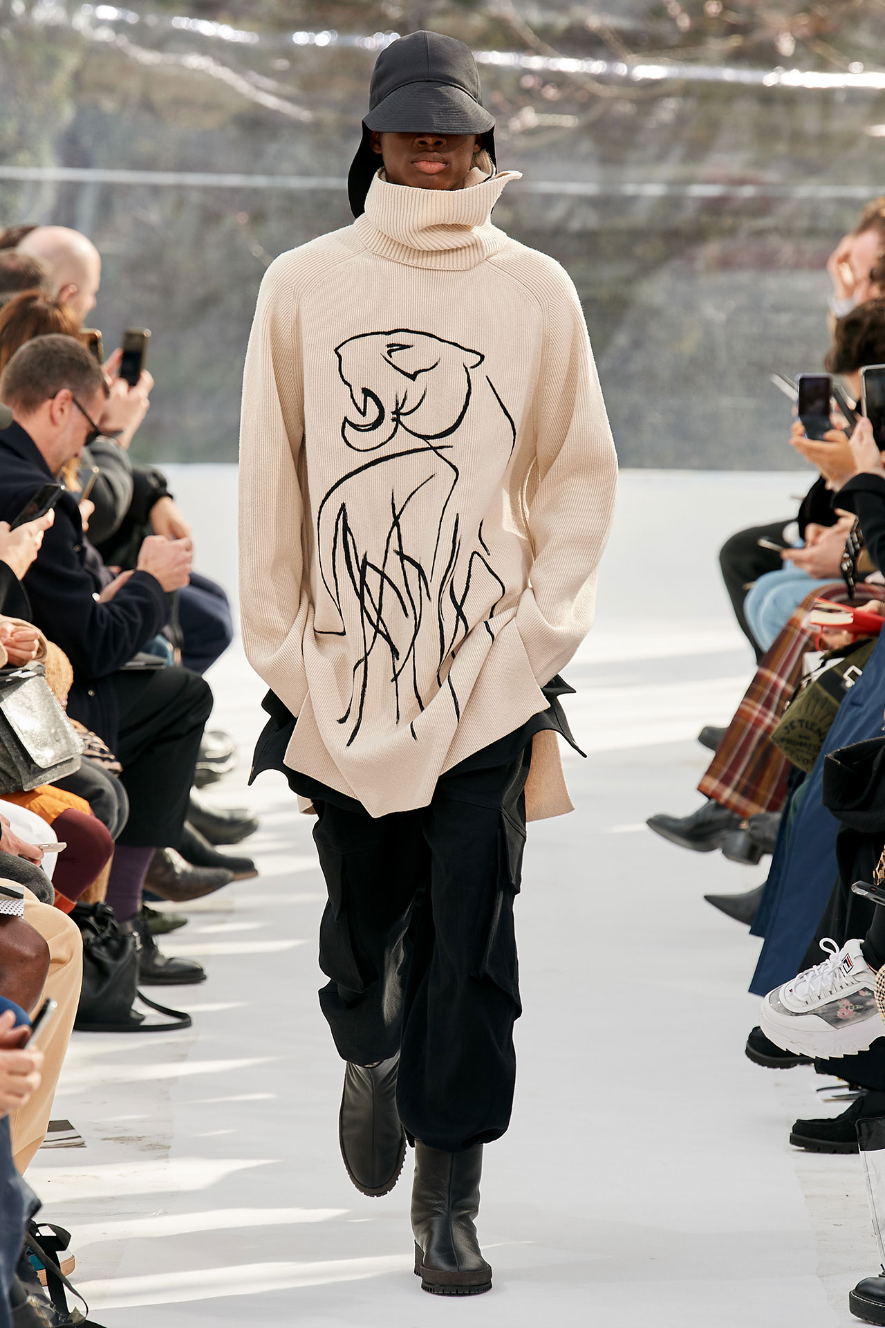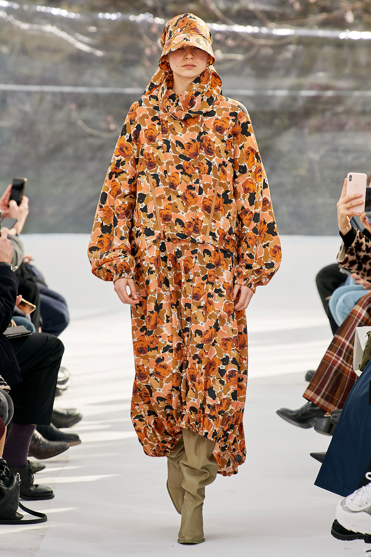 The colours come from nature, at times illuminated by camouflage prints that are in fact a trompel’oeil of roses. This organic palette composes a unique painting at each glance, like colours as passers-by, or a garment that transforms into a canvas of a giant tiger head. These are “painting-dresses”, taken from the works of neo-realist artist Júlio Pomar (1926-2018). A Lisbon painter who lived in Paris for a long time and considered one of the greatest figures of Portuguese XXth century art. In the 1980s, fascinated by tigers, Júlio Pomar created a major series of works on this feline. The amplitude of cuts, moving close and away from the body, attests to the dynamism of this wardrobe and its slender silhouette. The superimposition of materials adds to its energy. The House of KENZO, through this initial collection, celebrates the wanderers of life. The transparent tubular structure that makes up the set of the show is designed as a modular nomadic object. It will be re-used in other forms at events in the coming seasons, such as pop-up stores or presentations. KENZO is committed to recycling the set, which can be transformed into new objects.