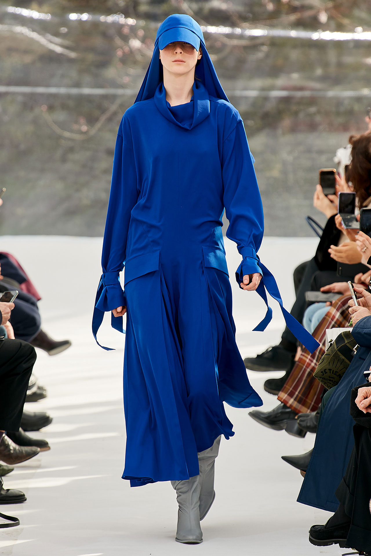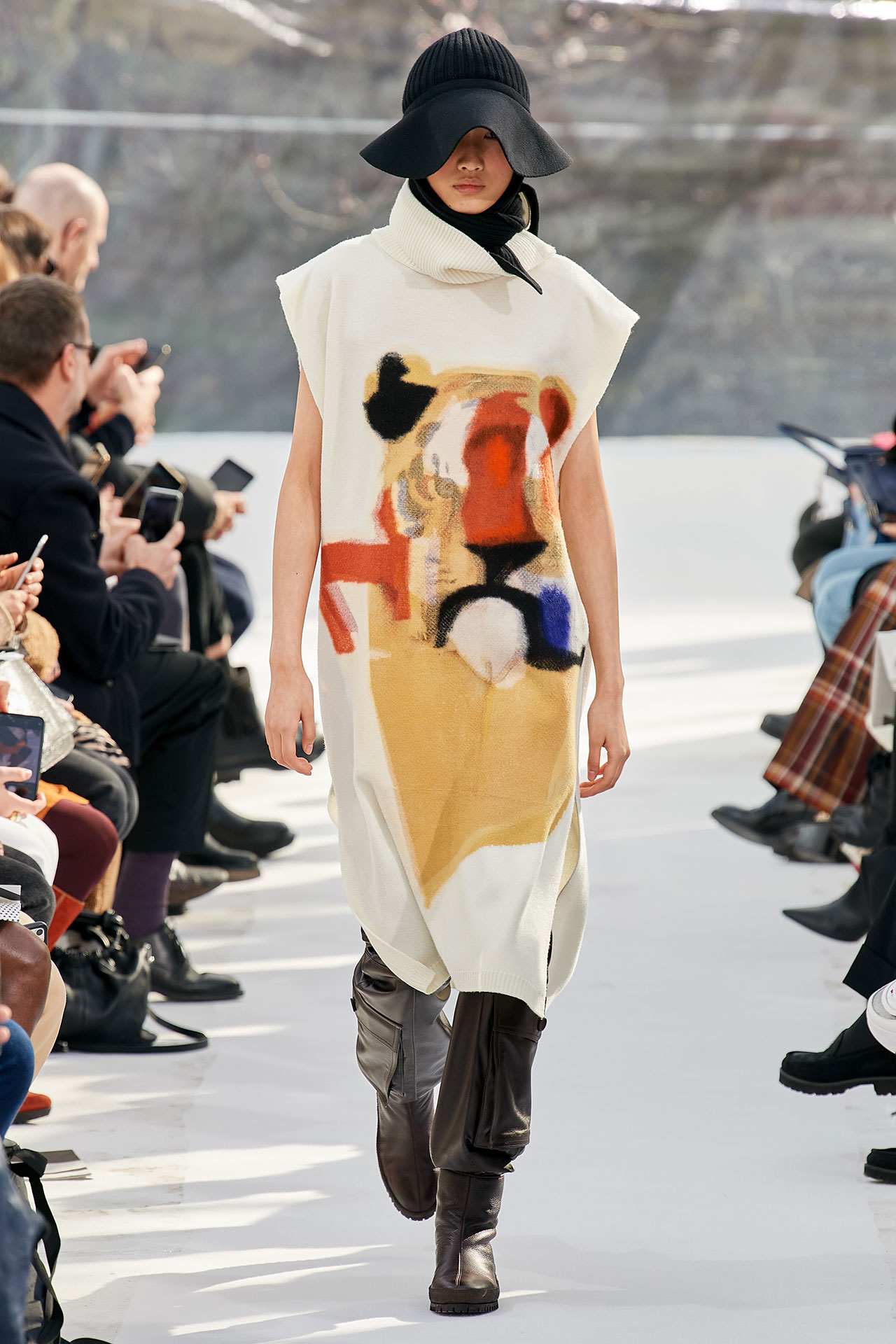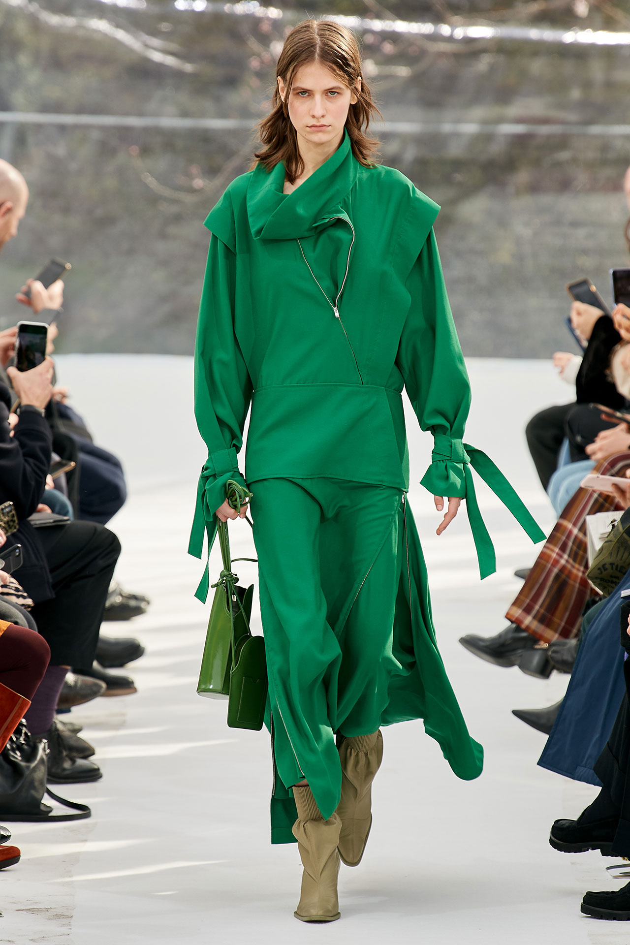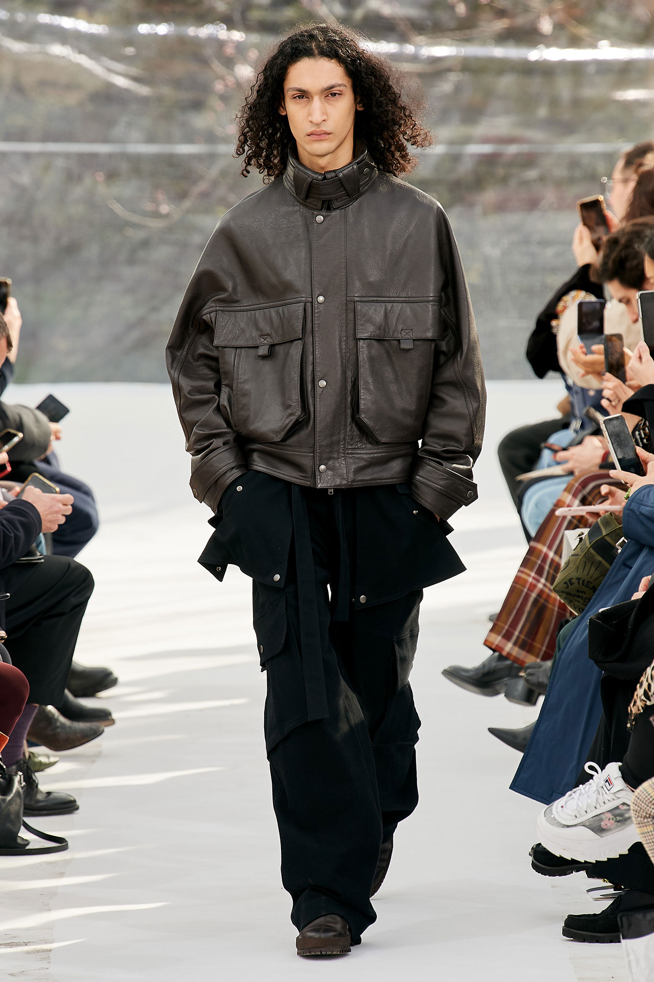 The colours come from nature, at times illuminated by camouflage prints that are in fact a trompel’oeil of roses. This organic palette composes a unique painting at each glance, like colours as passers-by, or a garment that transforms into a canvas of a giant tiger head. These are “painting-dresses”, taken from the works of neo-realist artist Júlio Pomar (1926-2018). A Lisbon painter who lived in Paris for a long time and considered one of the greatest figures of Portuguese XXth century art. In the 1980s, fascinated by tigers, Júlio Pomar created a major series of works on this feline. The amplitude of cuts, moving close and away from the body, attests to the dynamism of this wardrobe and its slender silhouette. The superimposition of materials adds to its energy. The House of KENZO, through this initial collection, celebrates the wanderers of life. The transparent tubular structure that makes up the set of the show is designed as a modular nomadic object. It will be re-used in other forms at events in the coming seasons, such as pop-up stores or presentations. KENZO is committed to recycling the set, which can be transformed into new objects.