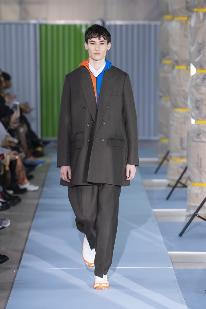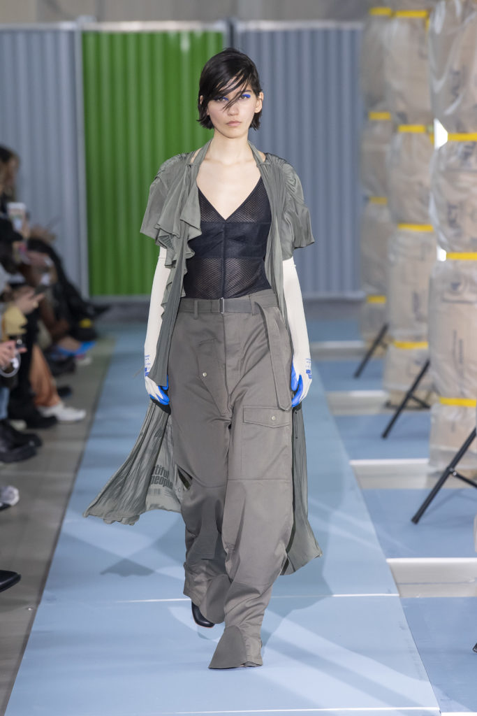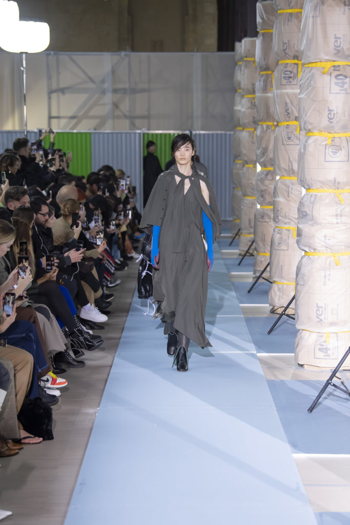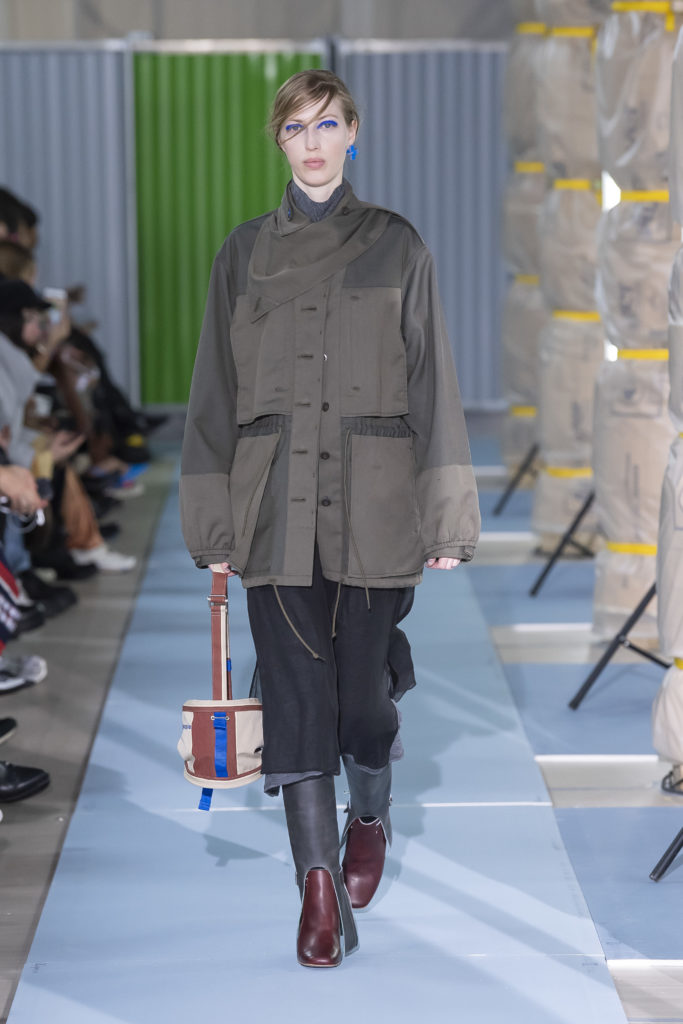 Colors are muted – black, grey, khaki – with bright brights as an accent. Transparencies and prints highlight the idea of construction.