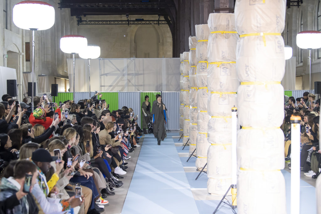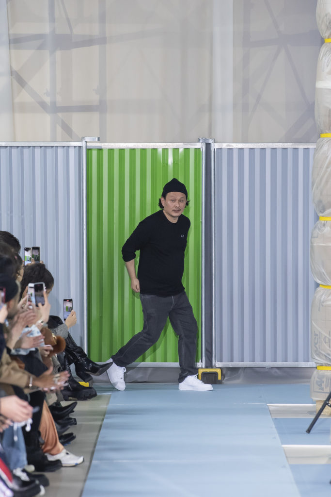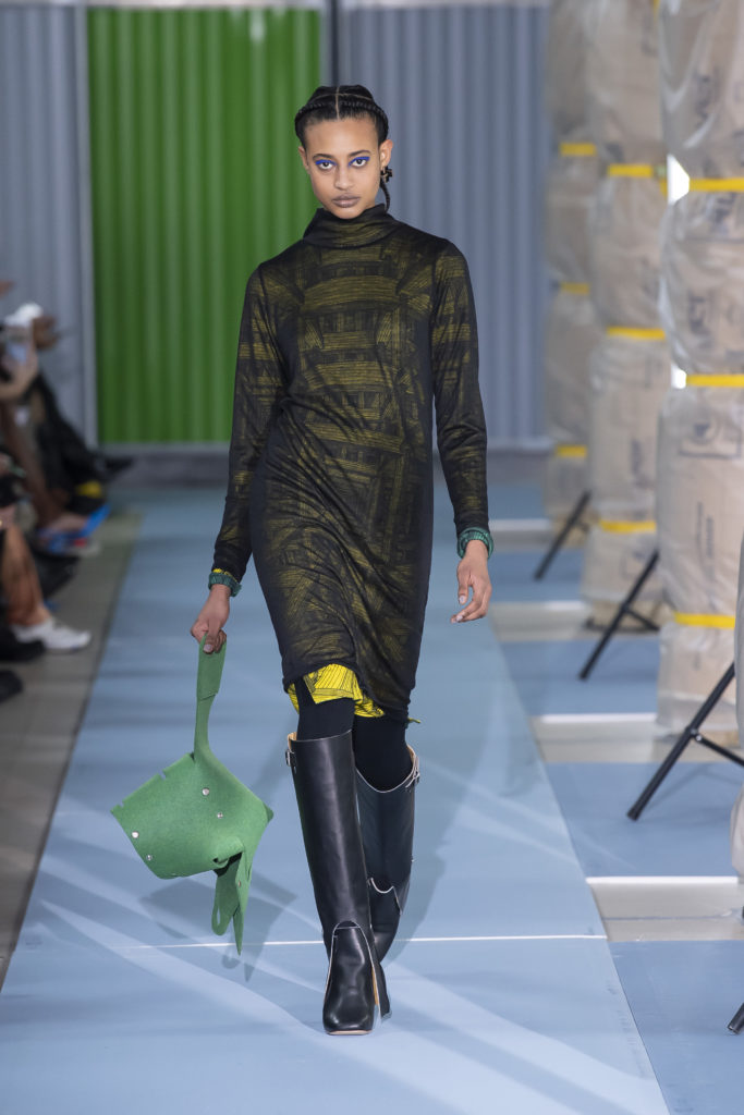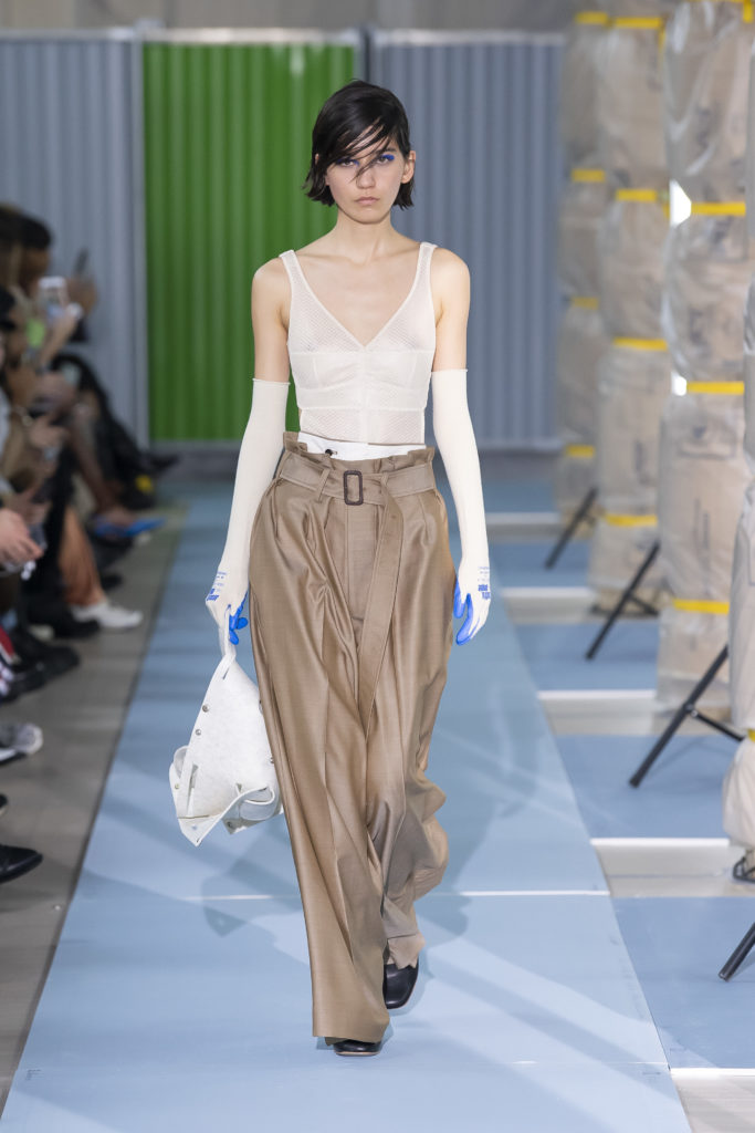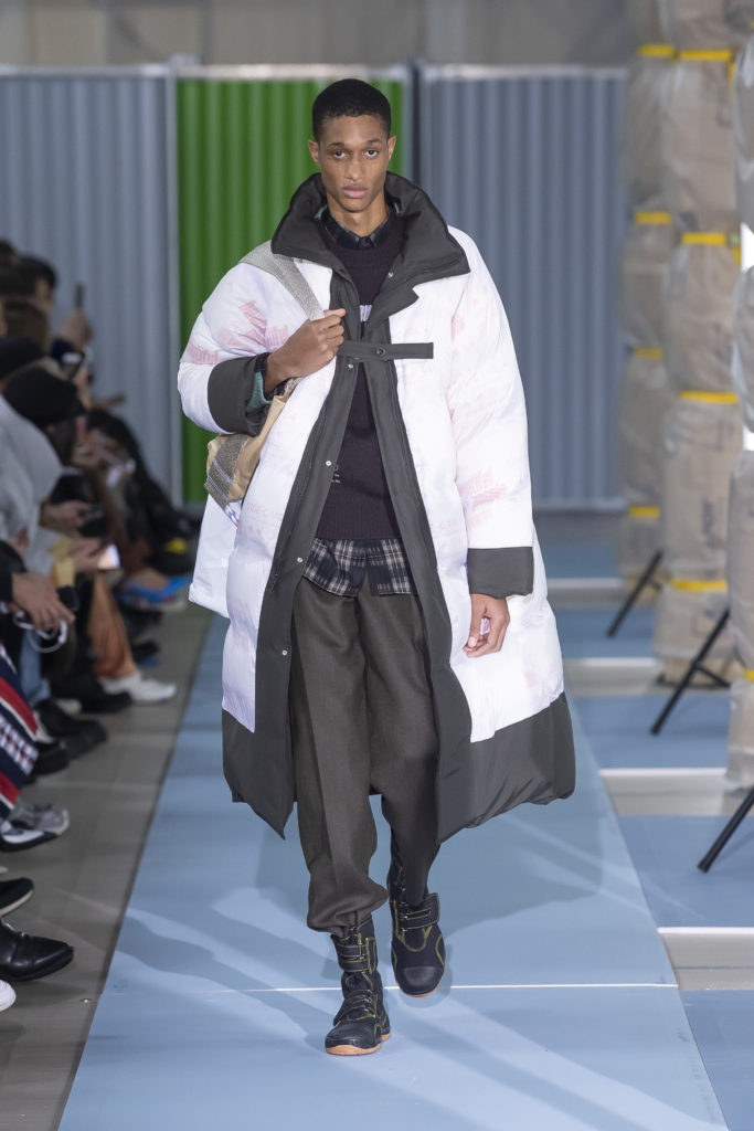 Colors are muted – black, grey, khaki – with bright brights as an accent. Transparencies and prints highlight the idea of construction.