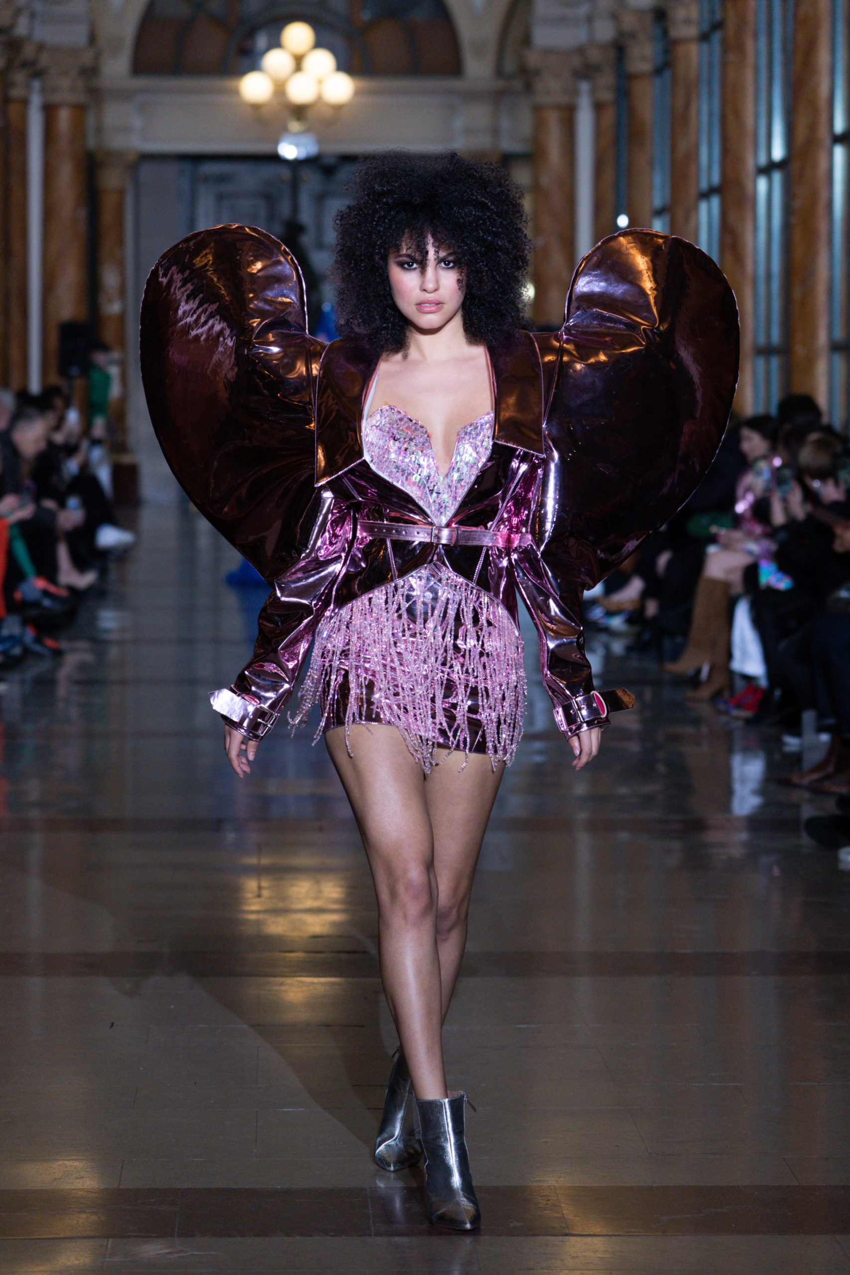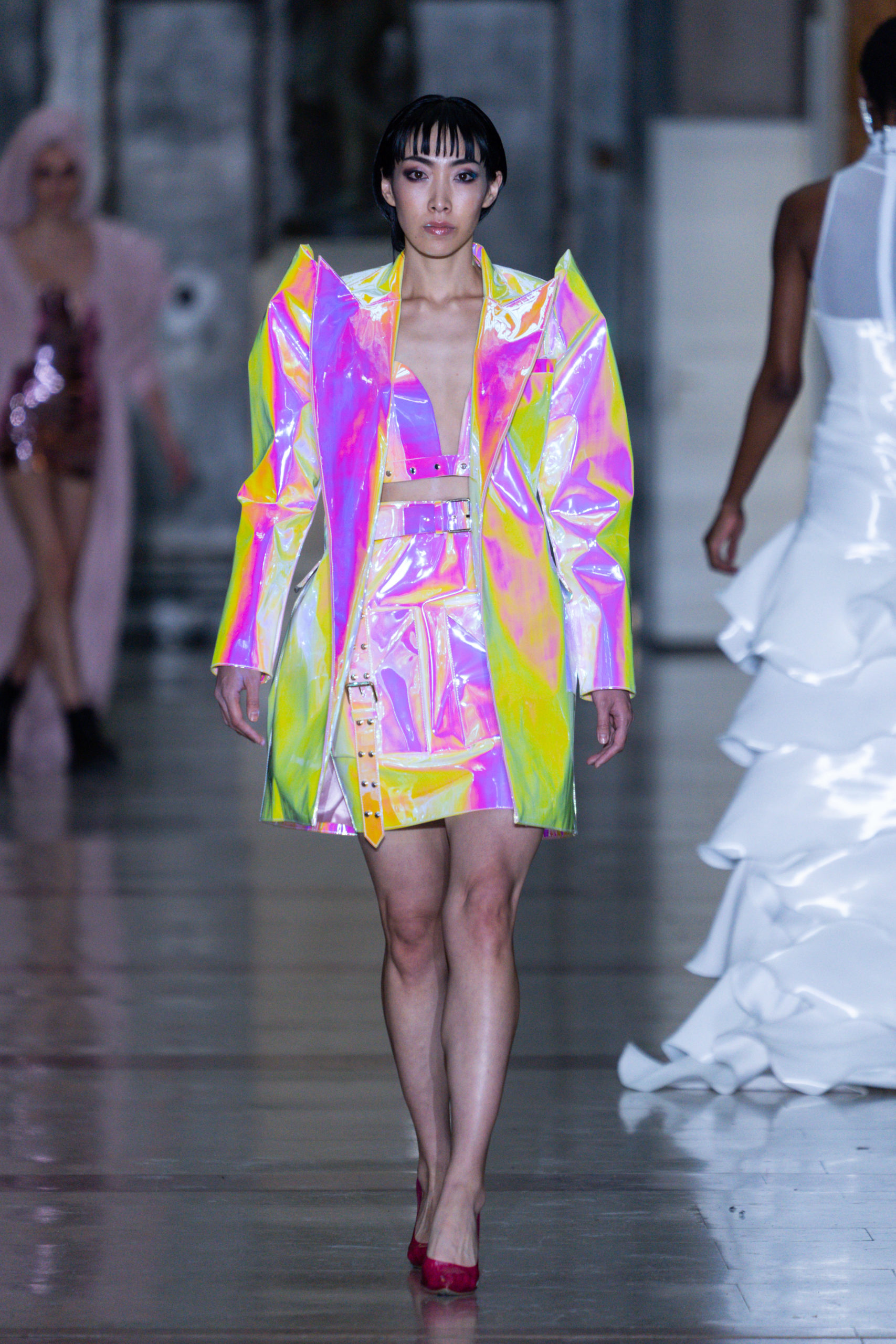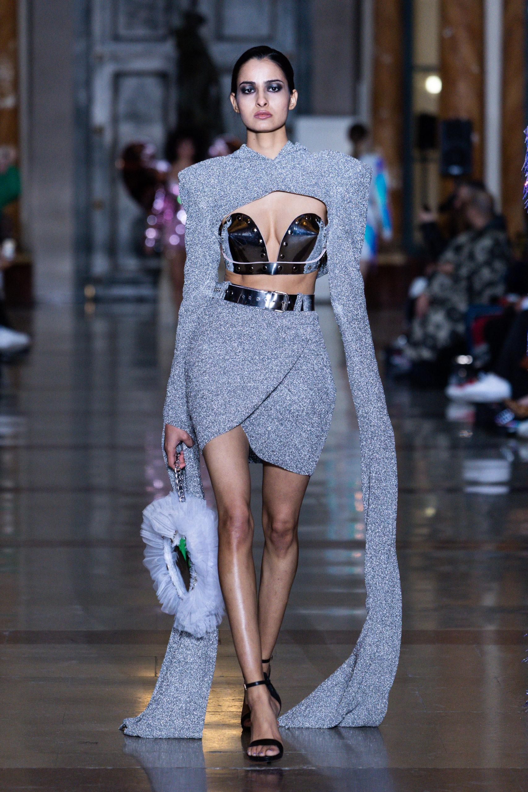 The collections of Seyit Ares are extravagant and attention catching. The young designer uses mostly leather in vibrant colors and sews in big and edgy shapes. Accessories, like the big belts, that appear in almost every of his outfits are important elements of his designs.