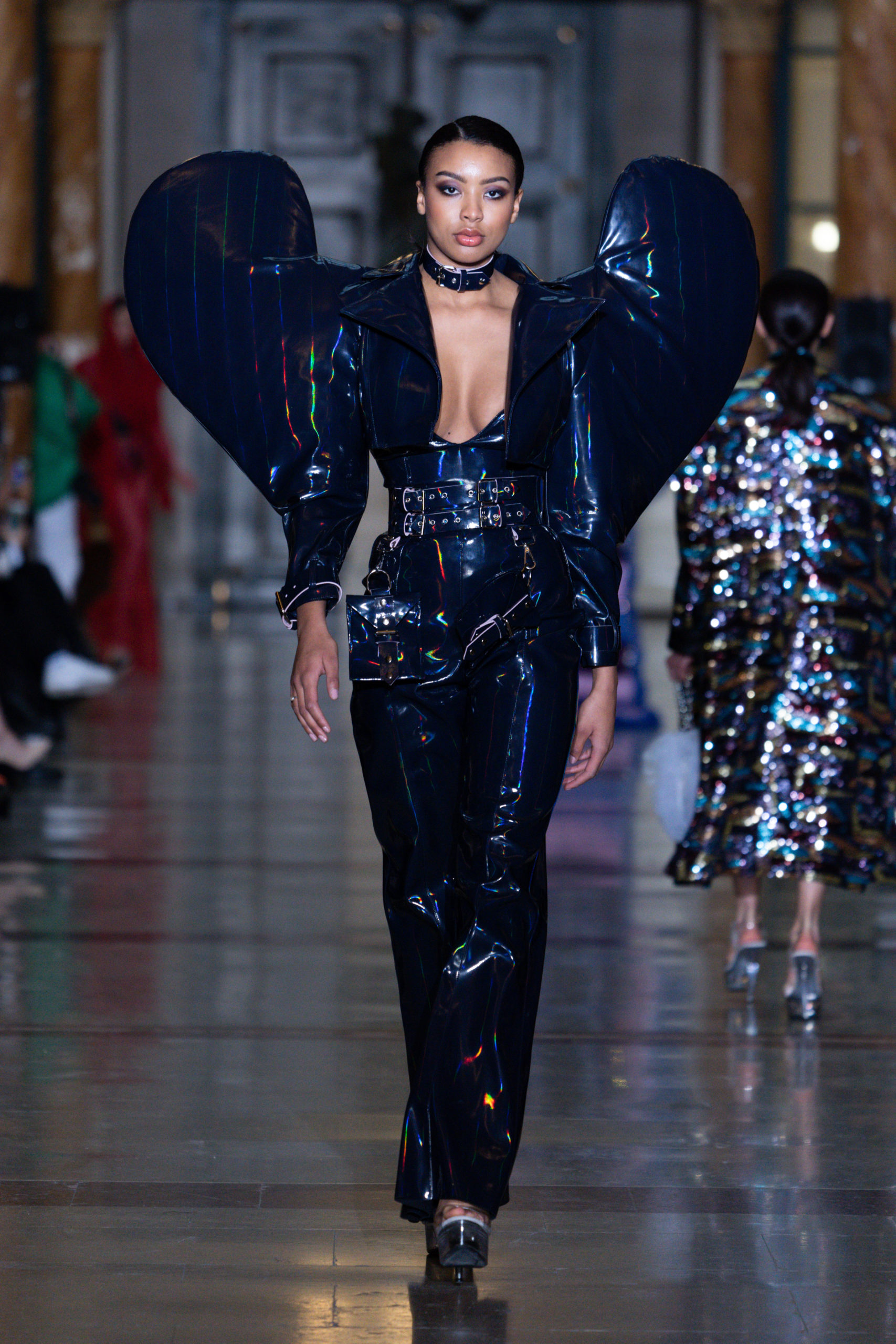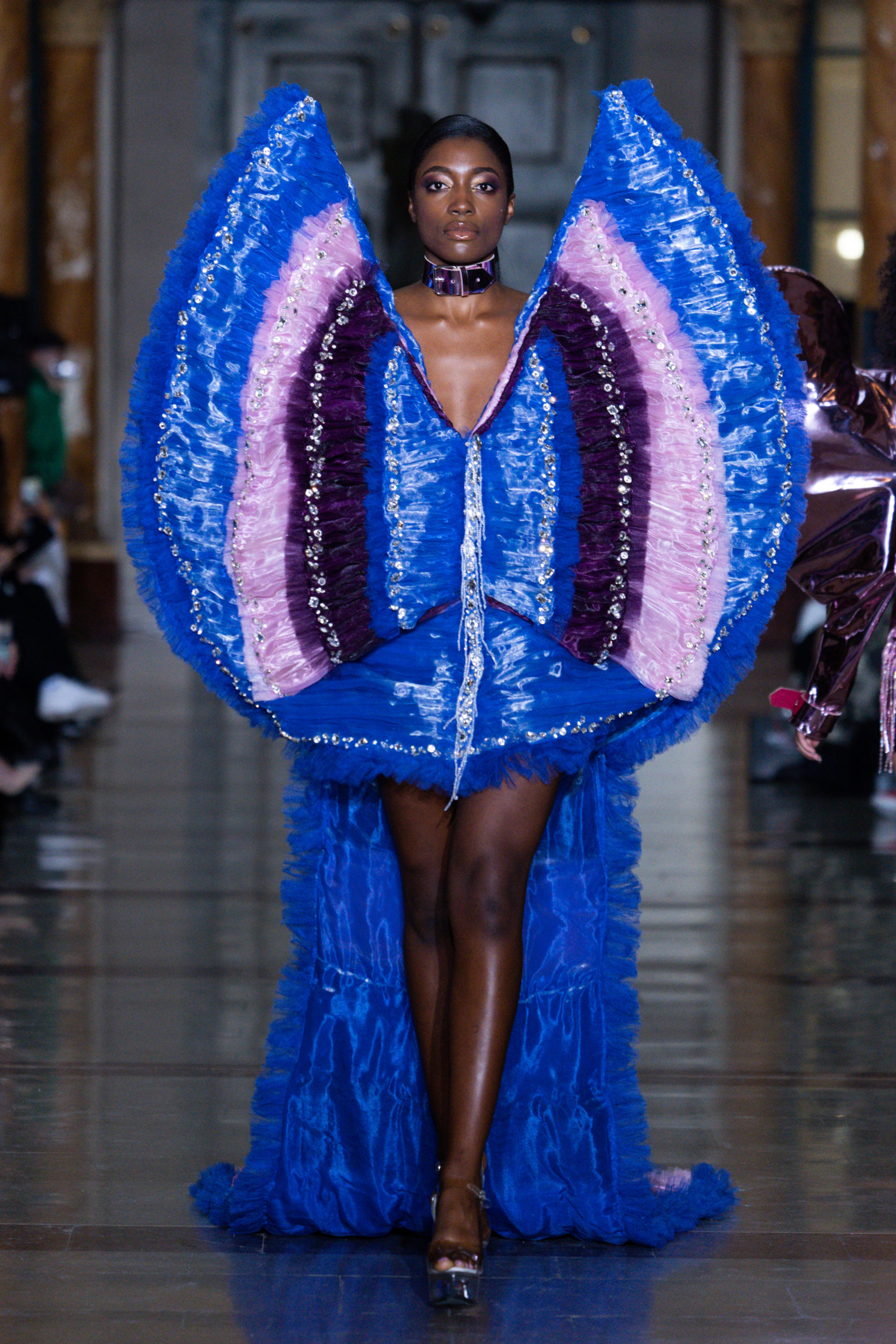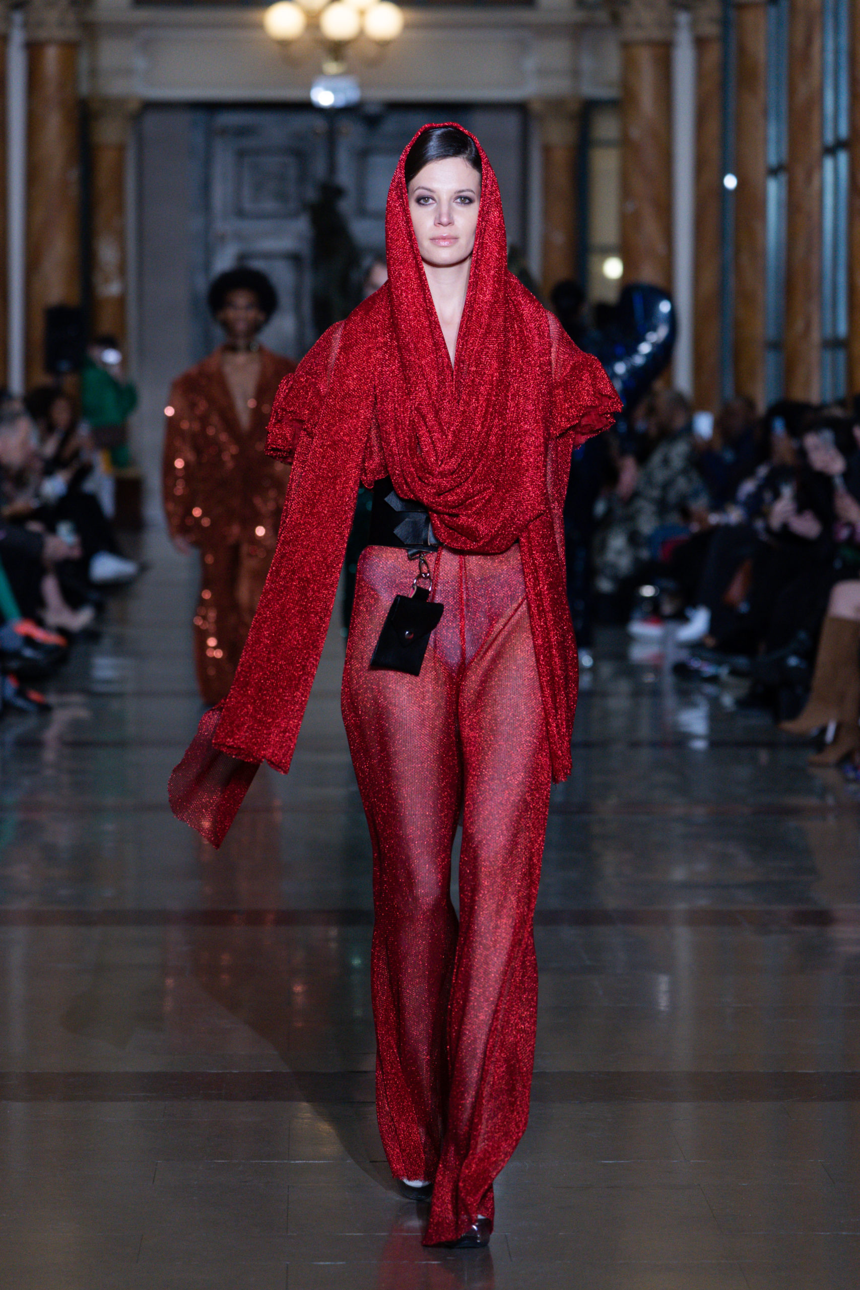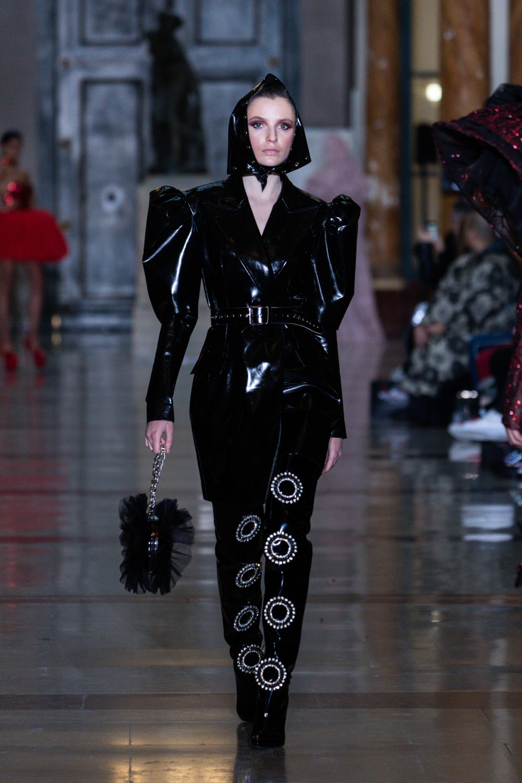 The collections of Seyit Ares are extravagant and attention catching. The young designer uses mostly leather in vibrant colors and sews in big and edgy shapes. Accessories, like the big belts, that appear in almost every of his outfits are important elements of his designs.