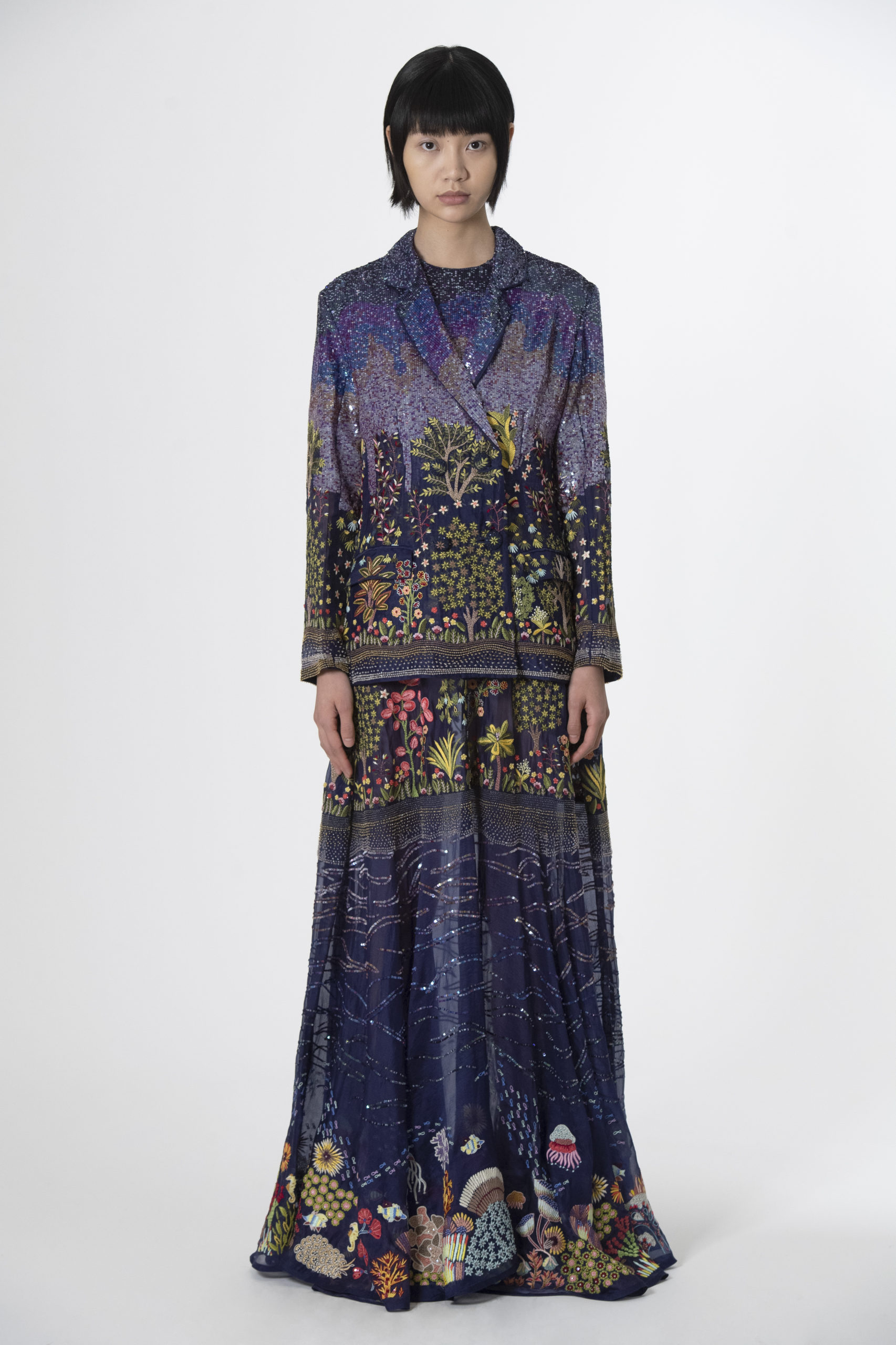 The need for refinement preceded the need for the new. Home embodies a distinct perspective this season. Pivoted around the visuals of a glorious night sky; colours like midnight blue, charcoal gray, sapphire, azure and mauve come alive through sequins, beads, silken threads on wearable and versatile fabrics like lightweight felt, crepe and organza. The inclusive spirit of easy-to-wear clothes enabled a sort of diversification of couture techniques. Shape-shifting dresses and gowns in hand embroidered flora and fauna, crafted to meet the unbridled imagination of couture, are translated into blazers, tops, trousers, knee length skirts that are functional yet instilled with a unique essence of craftsmanship. The transition from custom making couture pieces to developing a sizing friendly curation of separates, that are easy to maintain, drove the design process.