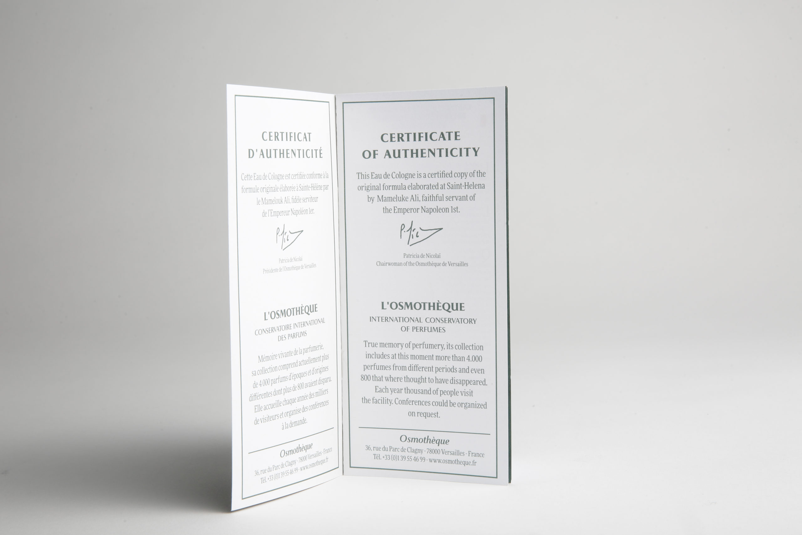 Cette Eau de Cologne, qui était utilisée quotidiennement par l’Empereur, est certifiée conforme à la formule originale par l’Osmothèque de Versailles (véritable musée des plus grands parfums de l’histoire).