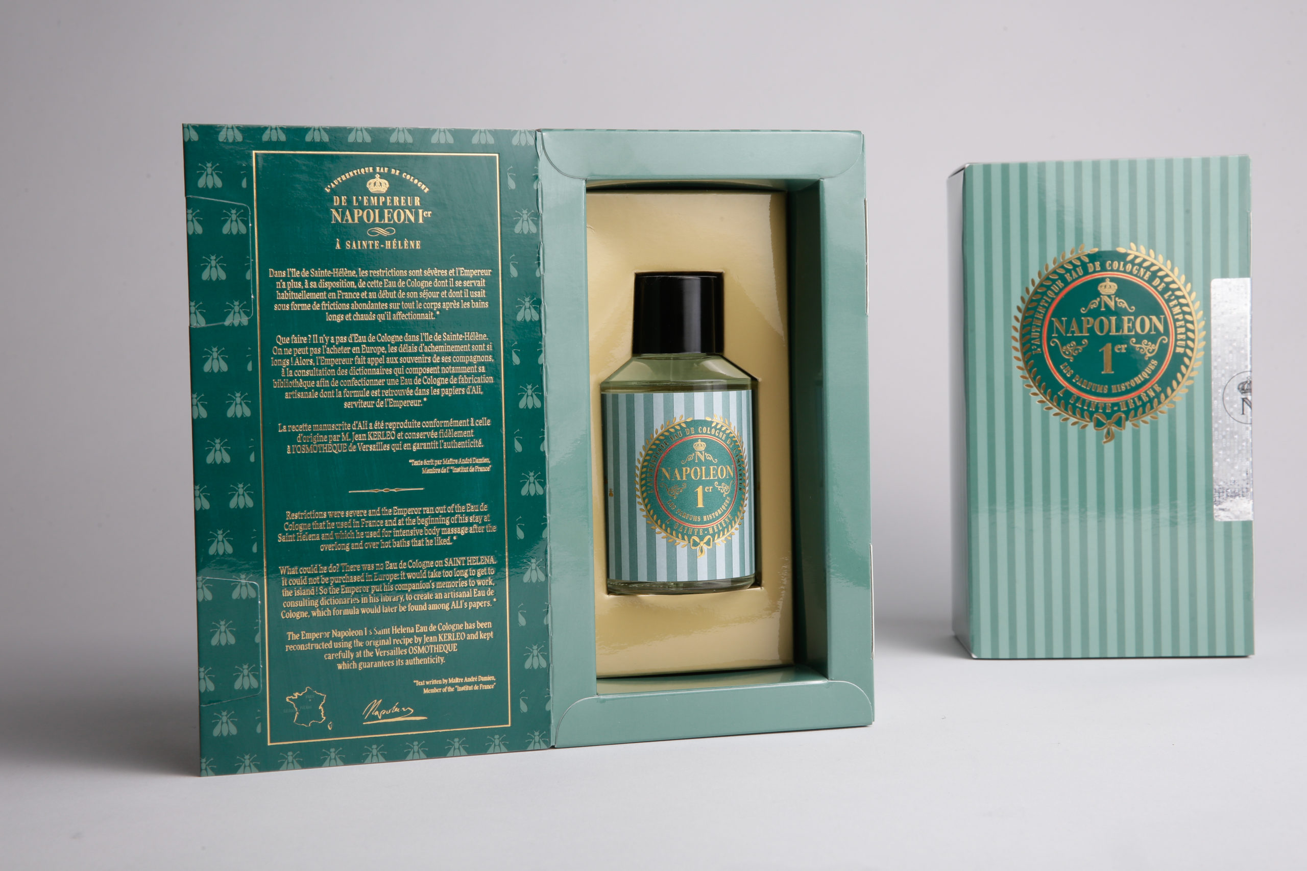 Dans les années 90, Maître André Damien, membre de l’Institut de France et grand passionné de l’histoire de Napoléon Bonaparte, acquiert certains documents et souvenirs ayant appartenu autrefois au dernier valet de l’Empereur, Louis-Etienne Saint Denis (dit le Mamelouk Ali). Au milieu de certains écrits, il trouve une mystérieuse recette qu’il fait étudier. Après quelques recherches historiques et analyses, il en résulte qu’il s’agit de la formule originale de l’Eau de Cologne qu’utilisait l’Empereur lors de son exil sur l’île de Sainte Hélène de 1815 jusqu’à sa mort en 1821.