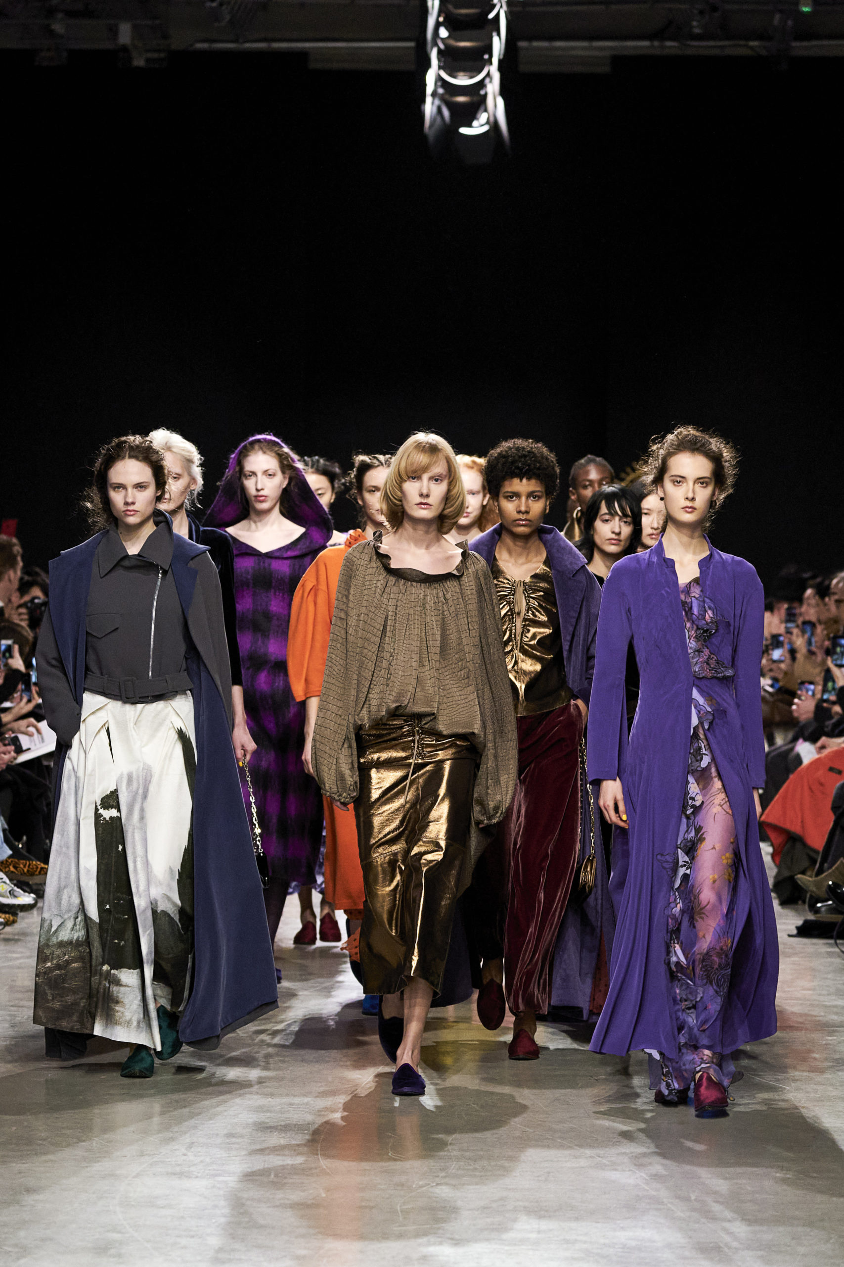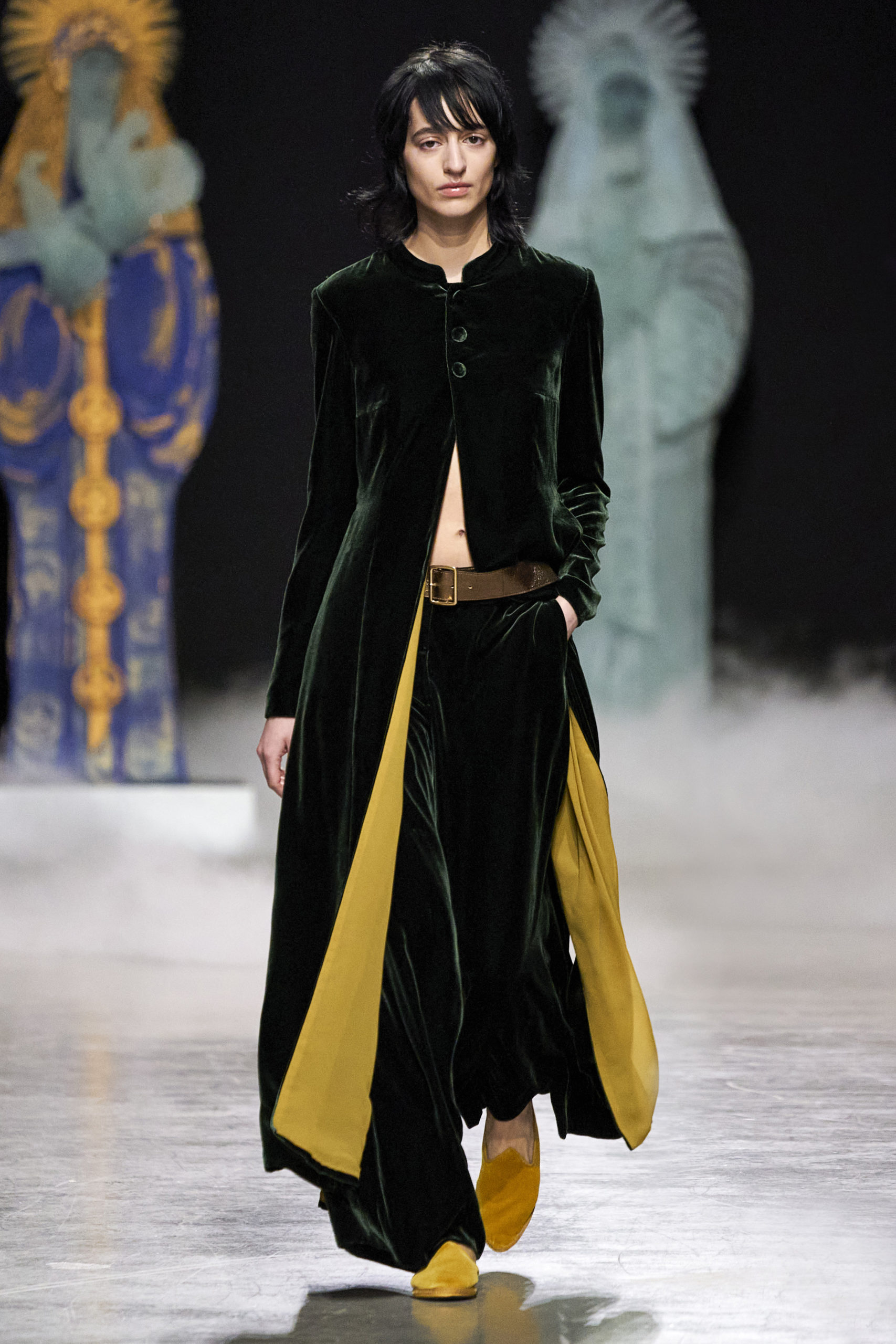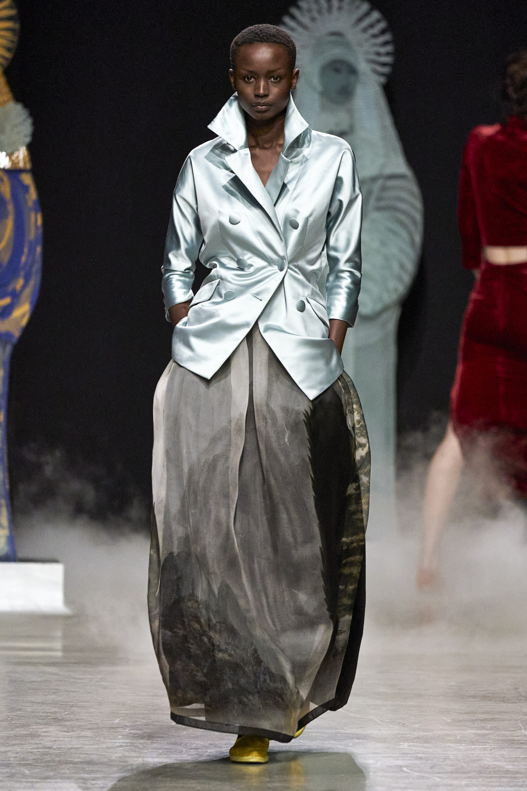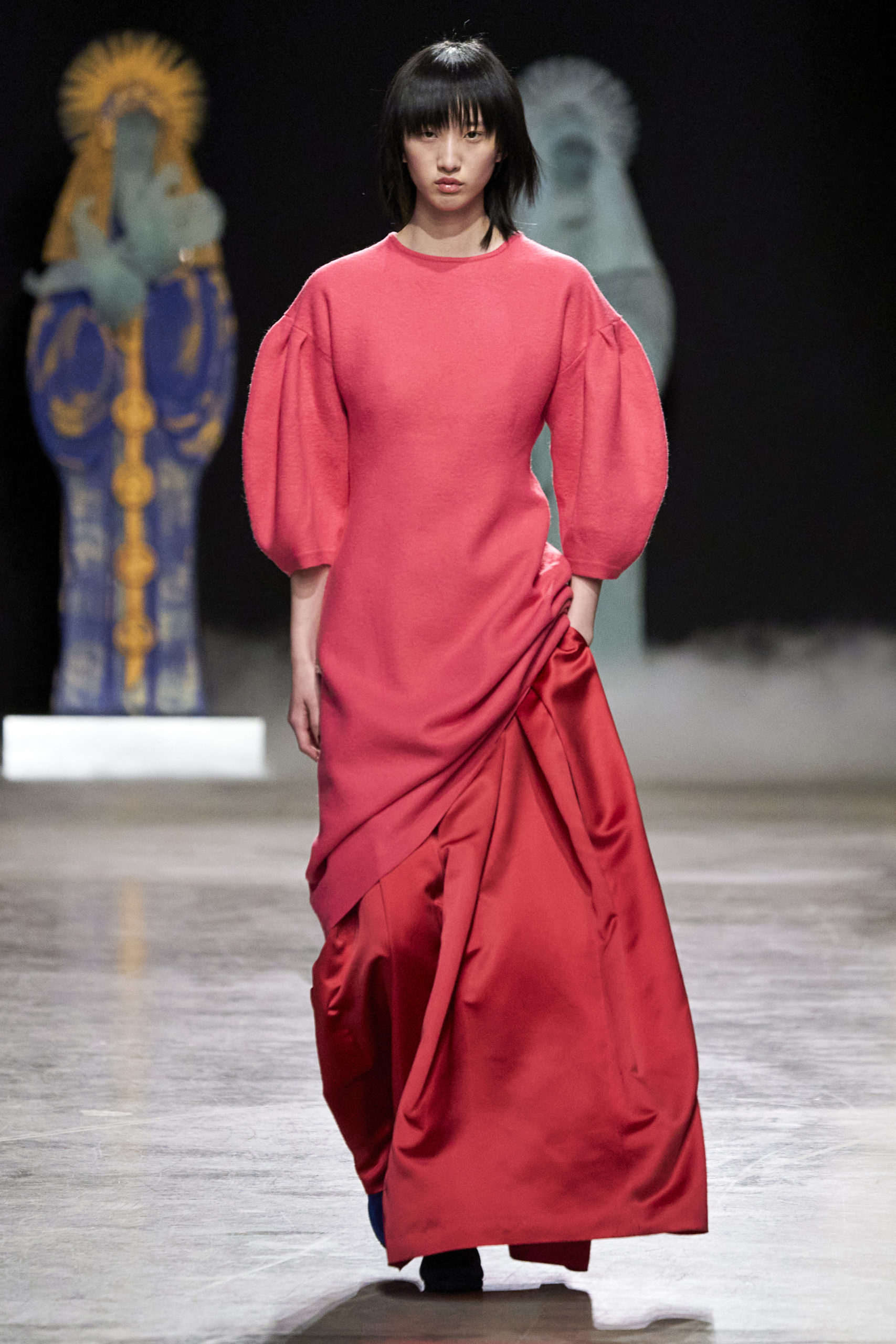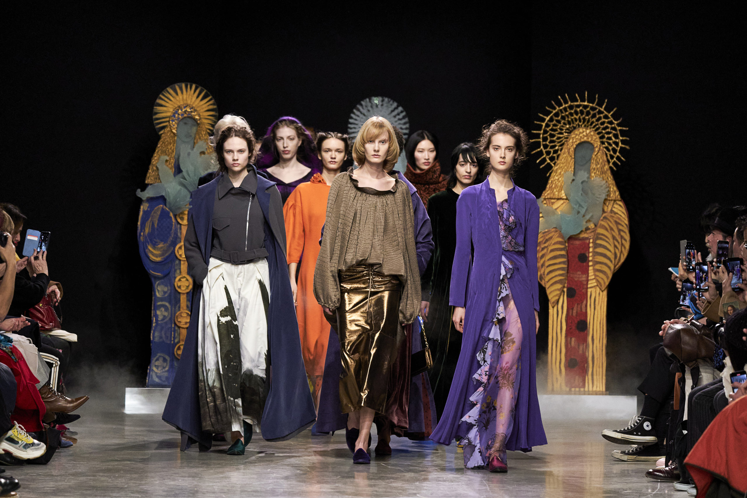 Annonciation des silhouettes, tailleurs perfecto, doudounes et jupes crayons, cache-poussière et robe drapées, mailles maximales ou caftans sur amples pantalons, mais aussi tuniques drapées, chasubles et blouses aux manches “Belle Ferronnière“, manteau de madones et jupes d’infantes, caressés de frivolités et de falbalas de soies.