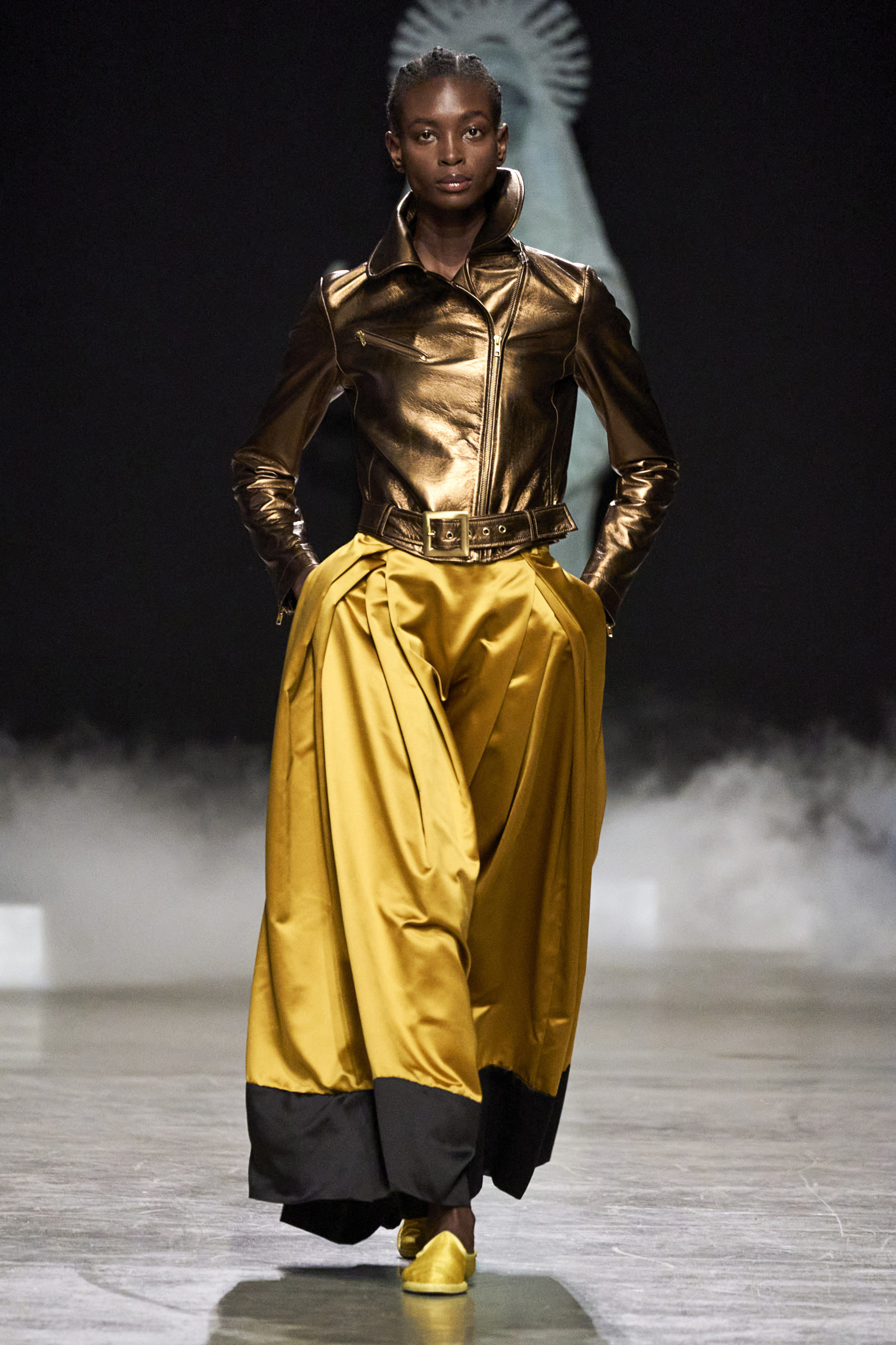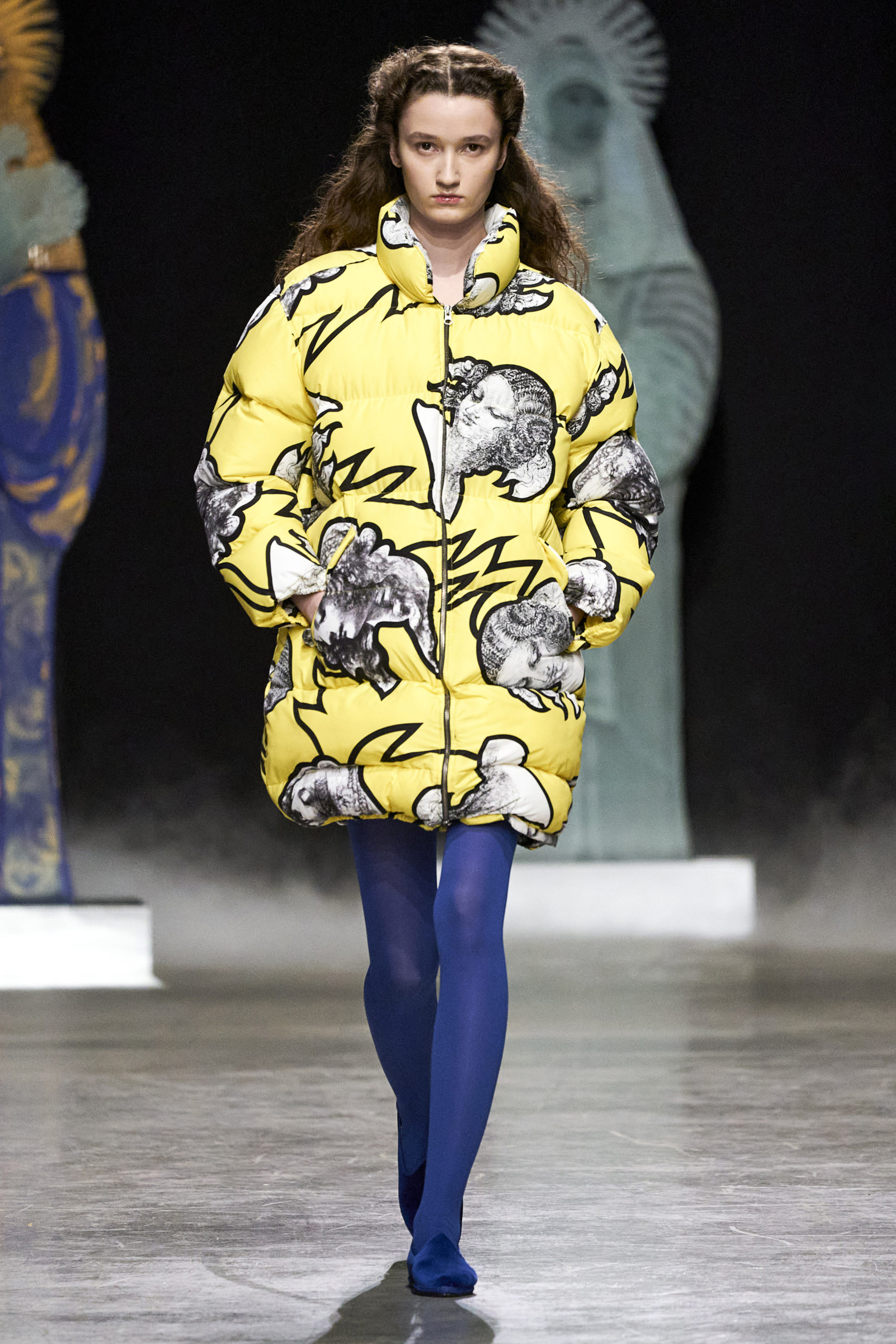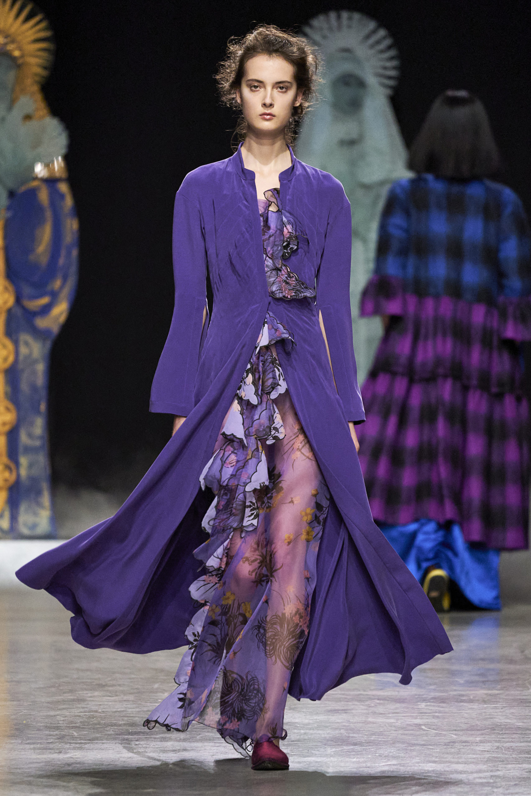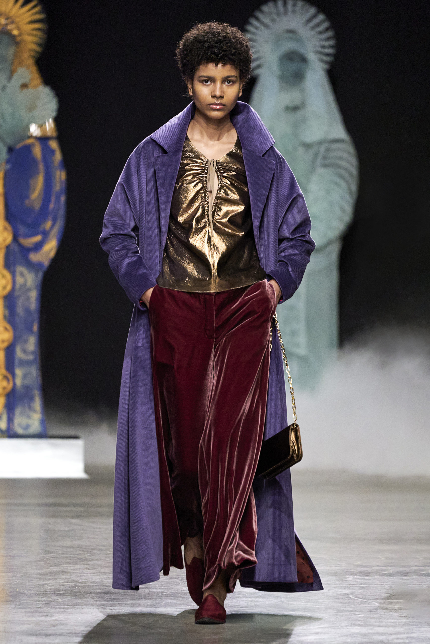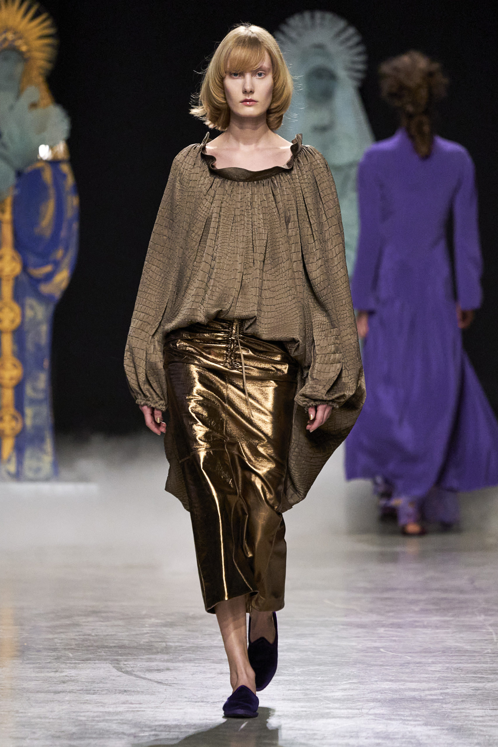Annonciation des silhouettes, tailleurs perfecto, doudounes et jupes crayons, cache-poussière et robe drapées, mailles maximales ou caftans sur amples pantalons, mais aussi tuniques drapées, chasubles et blouses aux manches “Belle Ferronnière“, manteau de madones et jupes d’infantes, caressés de frivolités et de falbalas de soies.