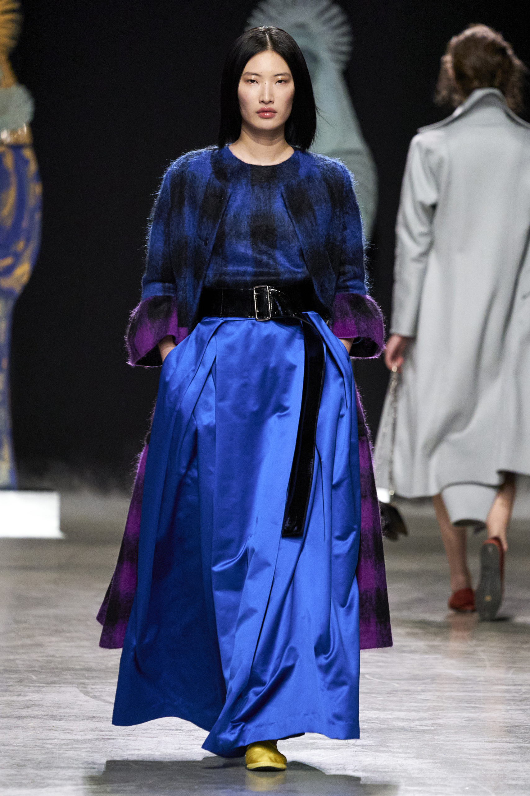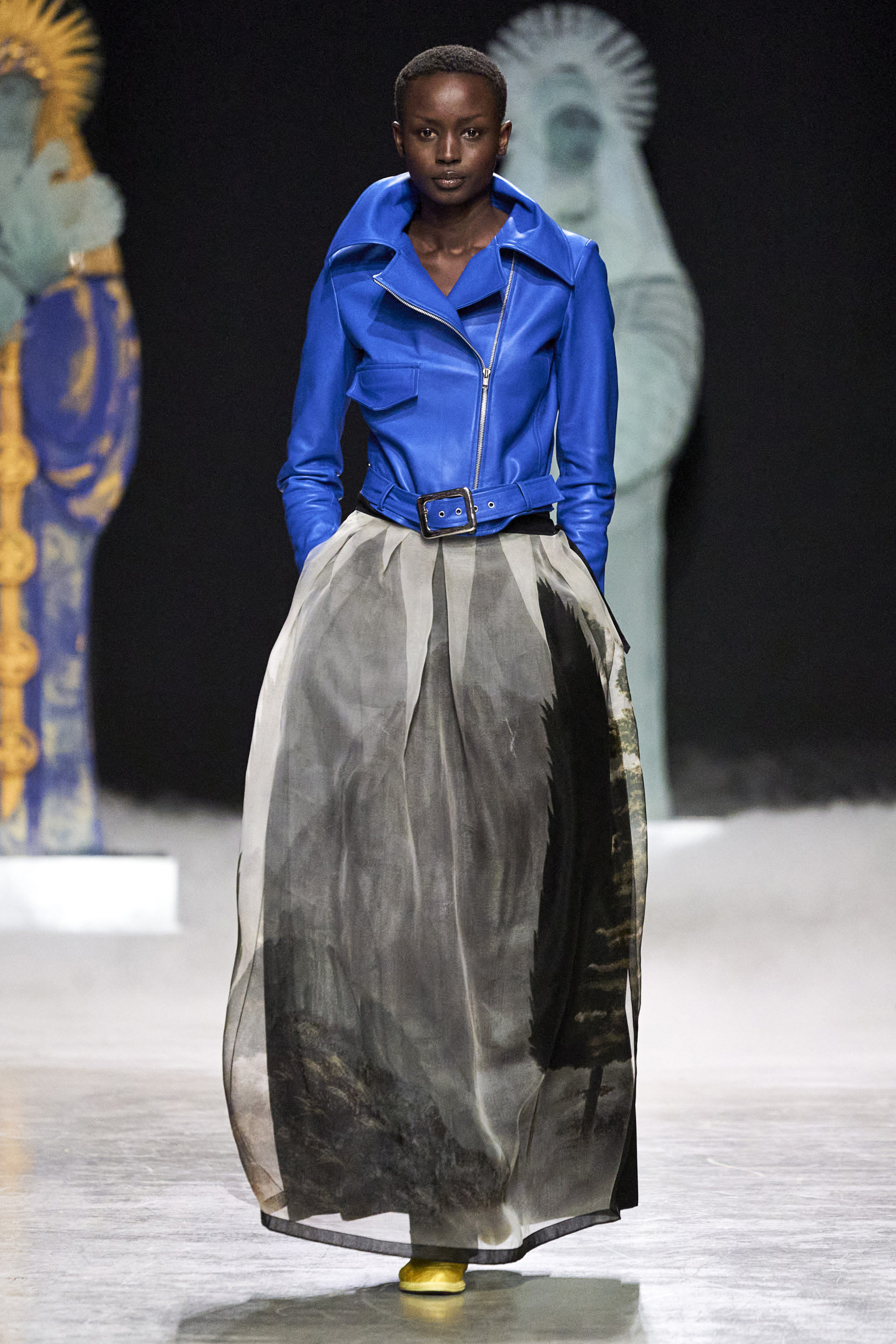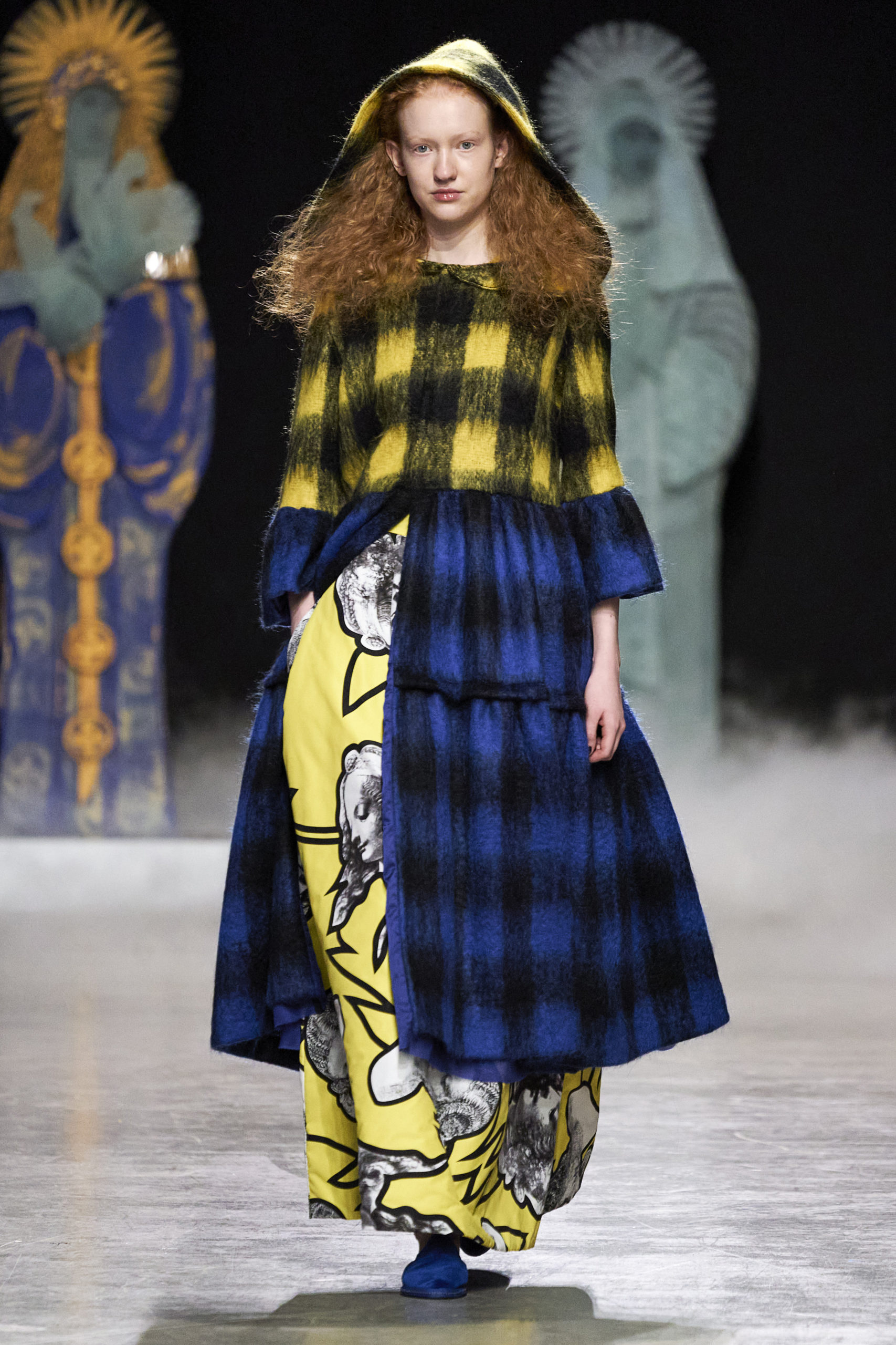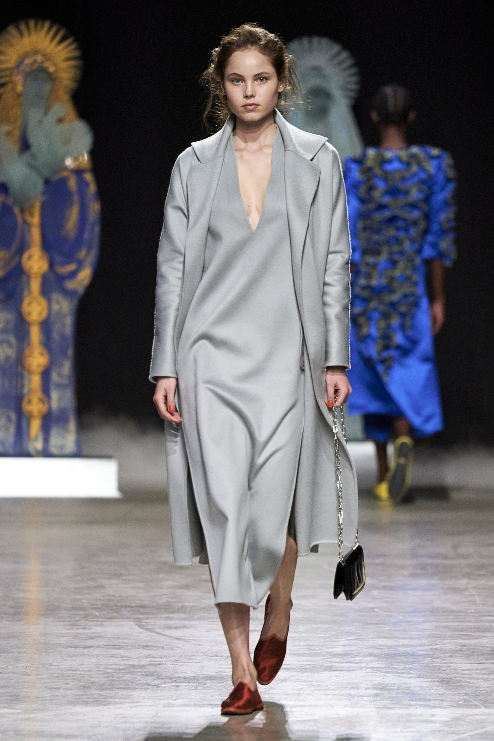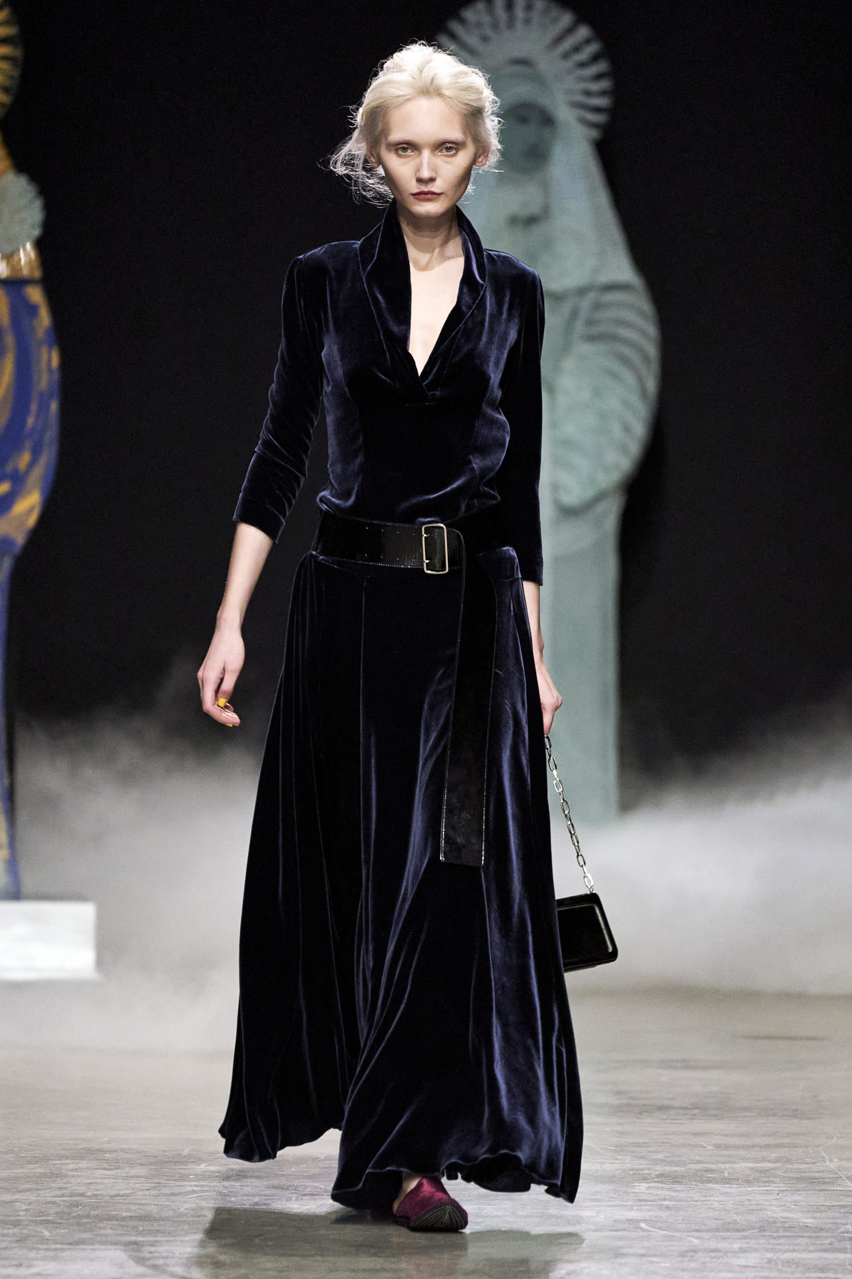 Annonciation des silhouettes, tailleurs perfecto, doudounes et jupes crayons, cache-poussière et robe drapées, mailles maximales ou caftans sur amples pantalons, mais aussi tuniques drapées, chasubles et blouses aux manches “Belle Ferronnière“, manteau de madones et jupes d’infantes, caressés de frivolités et de falbalas de soies.