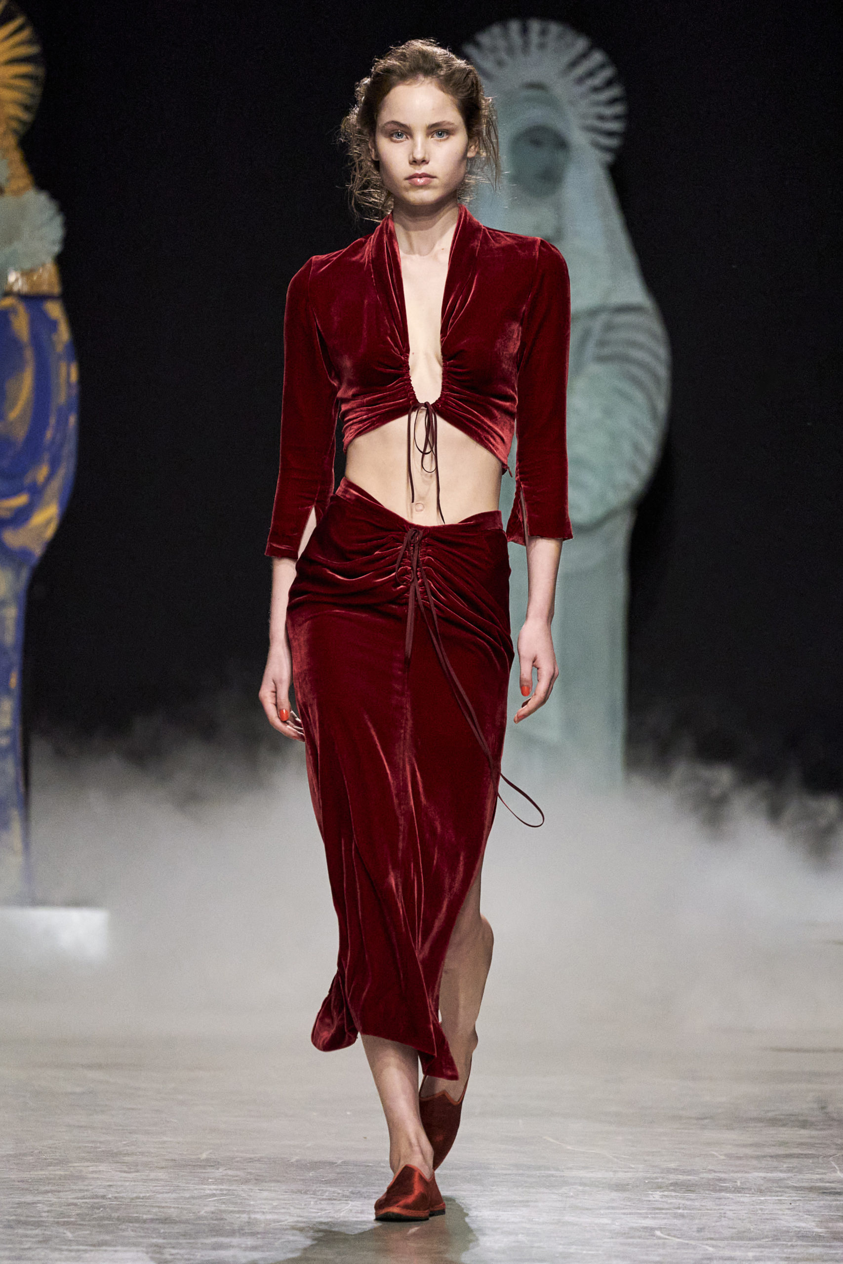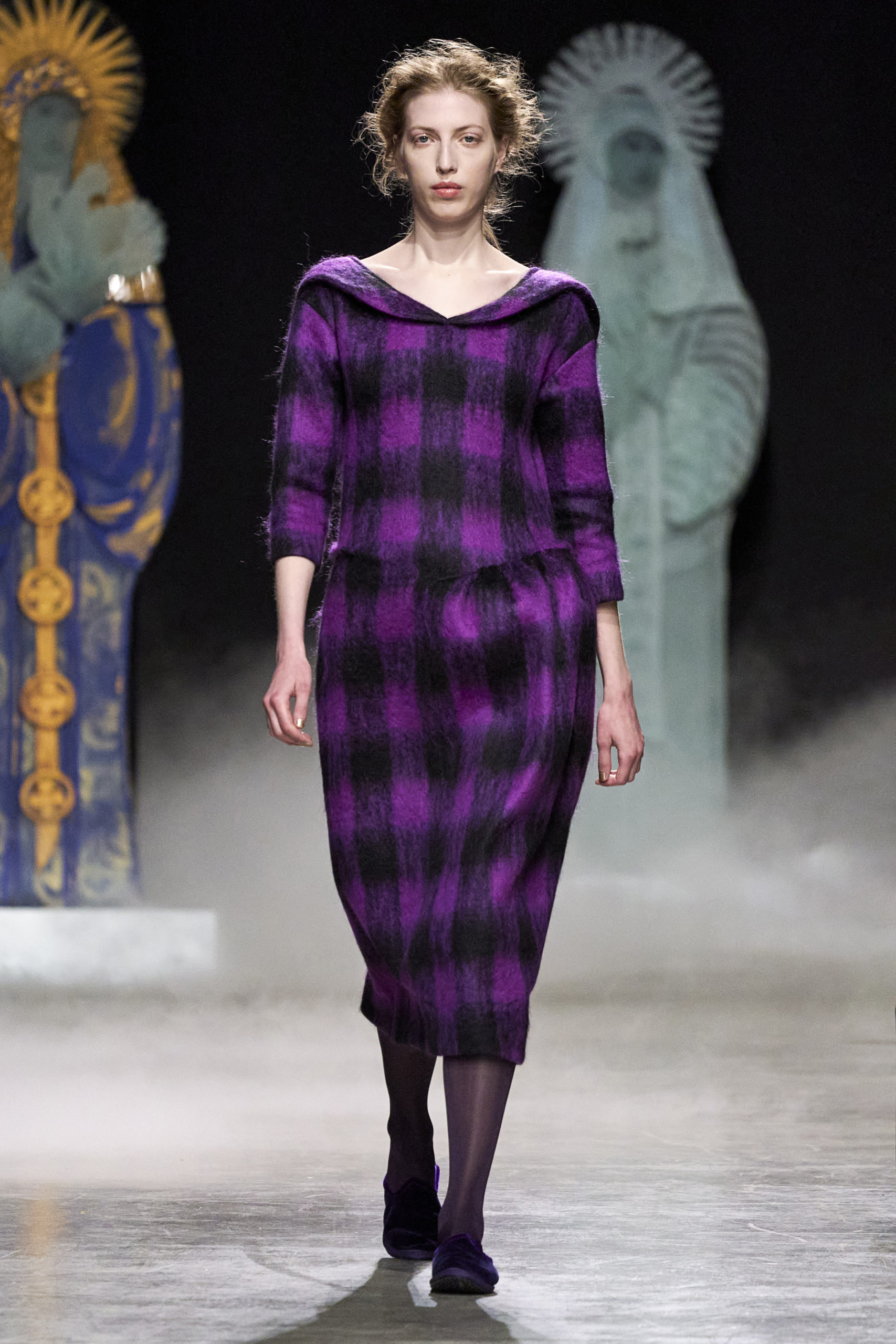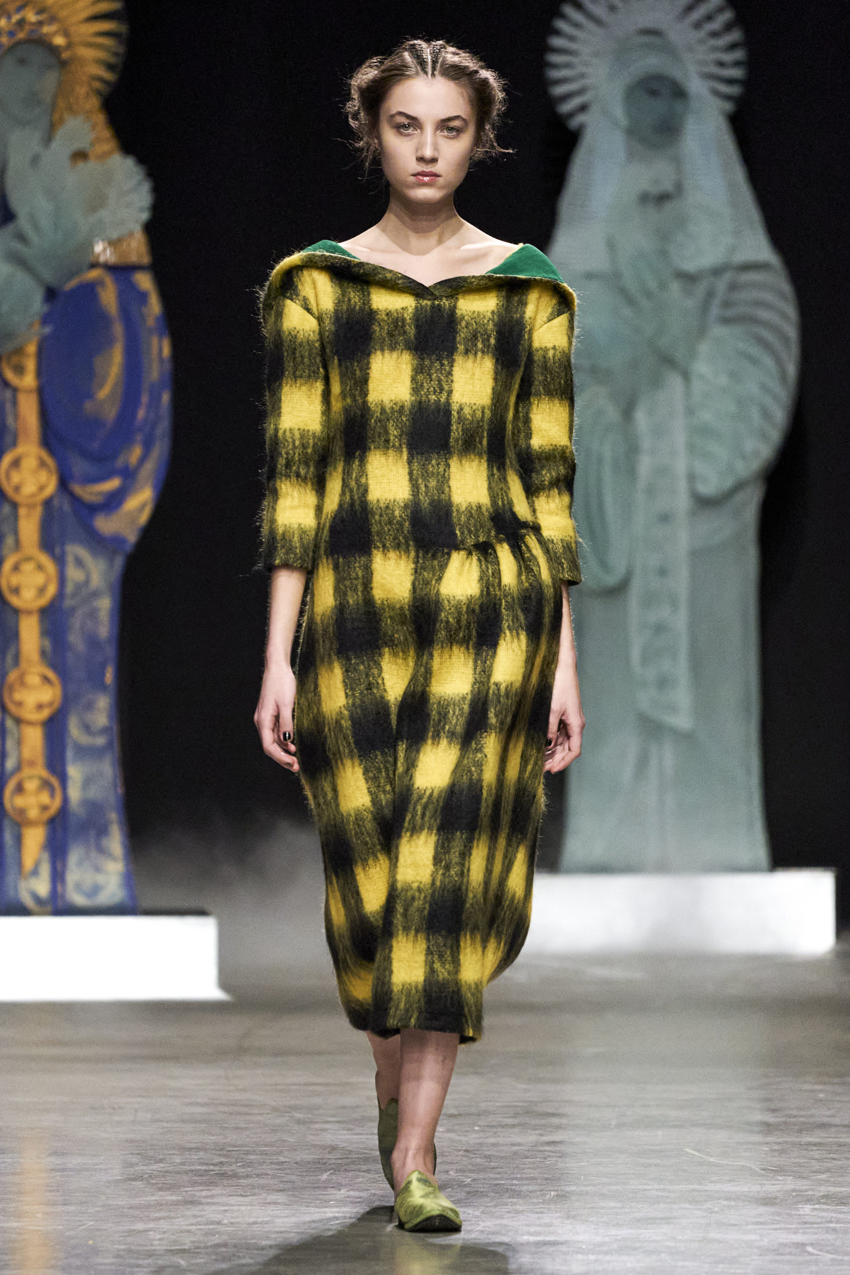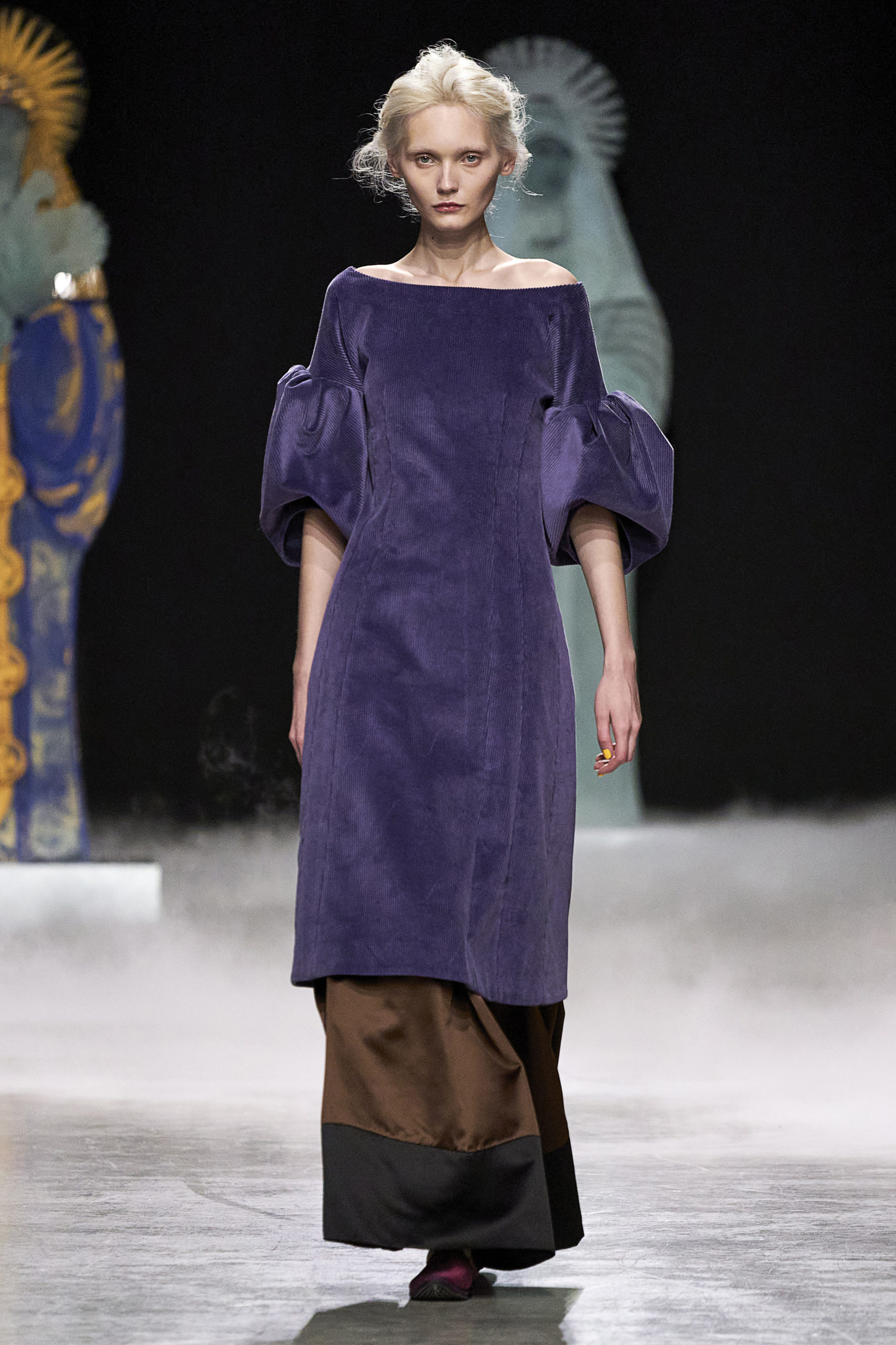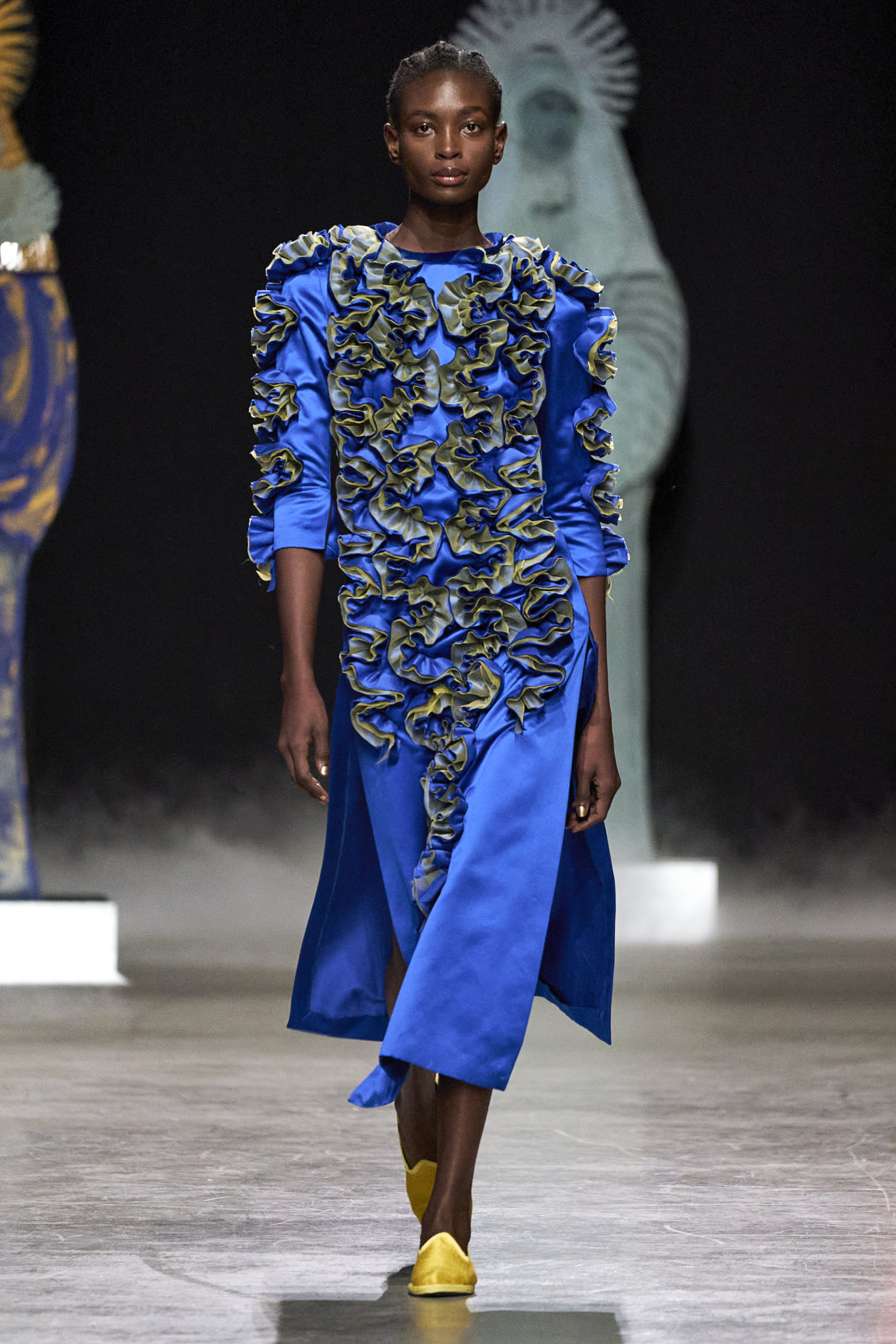 Annonciation des silhouettes, tailleurs perfecto, doudounes et jupes crayons, cache-poussière et robe drapées, mailles maximales ou caftans sur amples pantalons, mais aussi tuniques drapées, chasubles et blouses aux manches “Belle Ferronnière“, manteau de madones et jupes d’infantes, caressés de frivolités et de falbalas de soies.