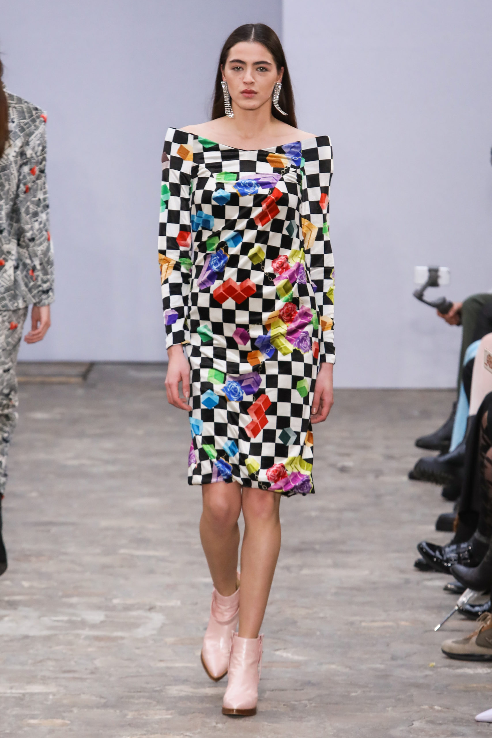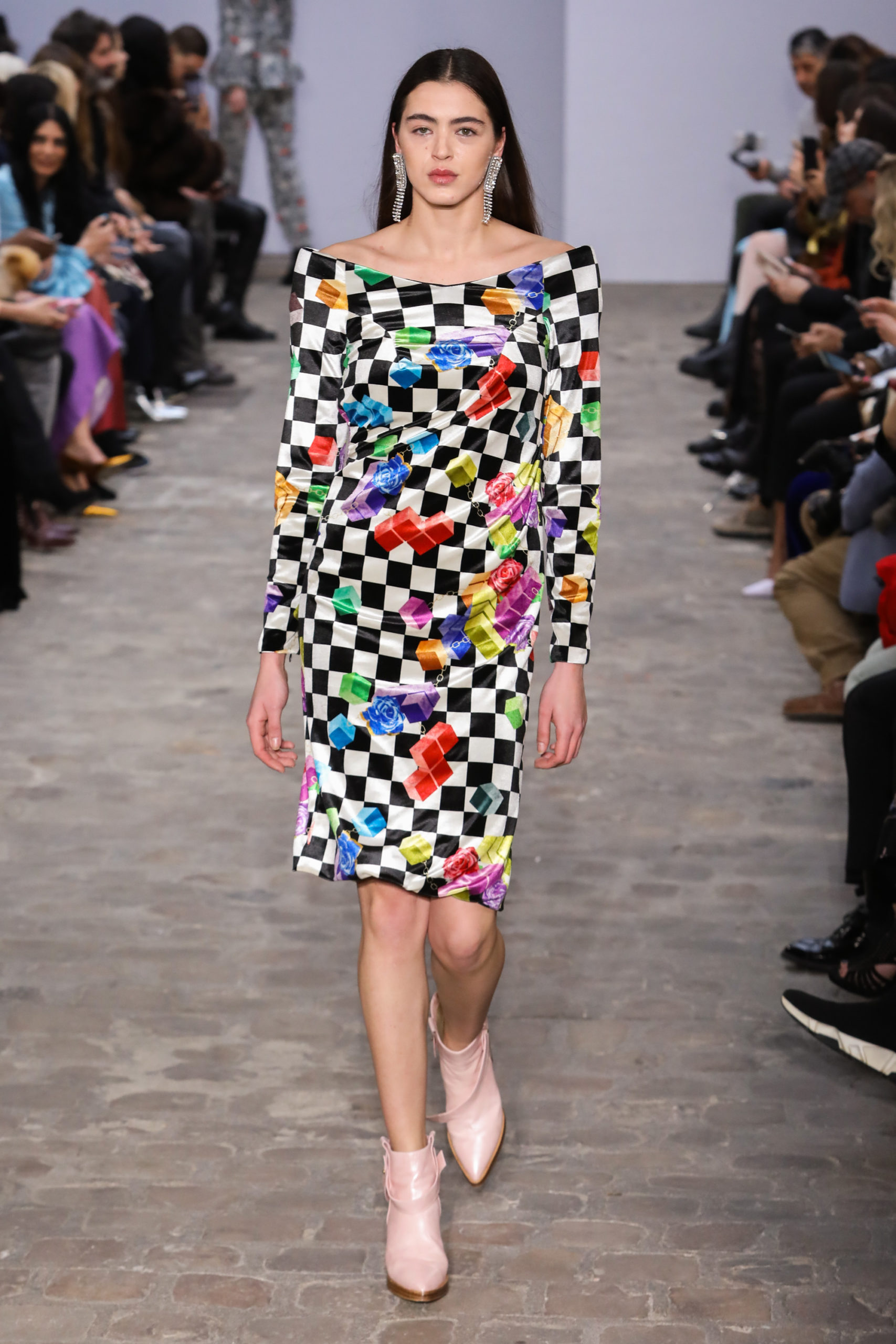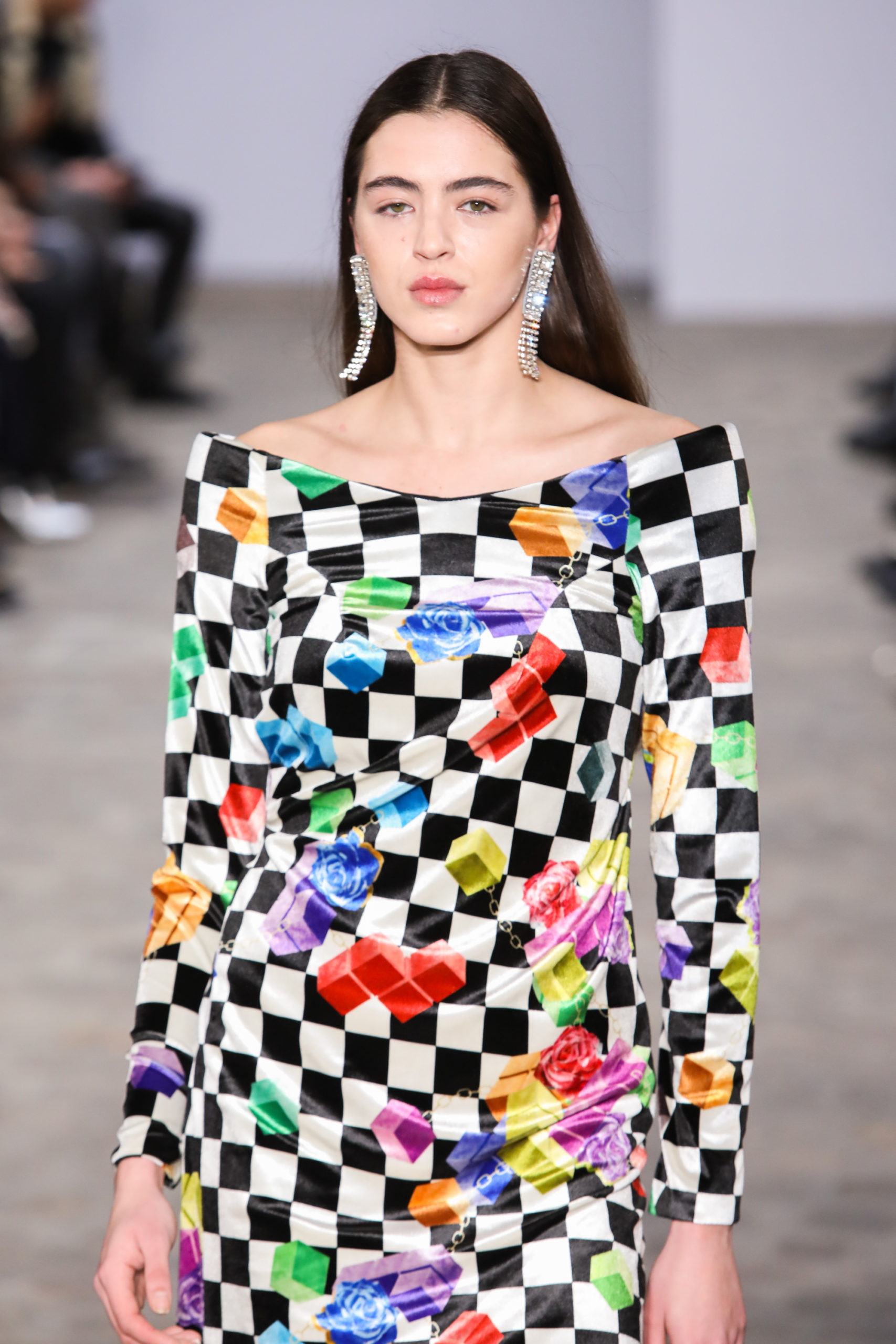The Fall/Winter 2020 collection was inspired by the puzzle game Tetris. The designer transferred her passion for video games to garments. With a mix of cubism and pixel art, she created the prints for the opulent velvet dress and skirt. The prints were hand-drawn by designer, composed of tetrominoes and other motifs. The fabric was ordered and manufactured in France and Italy. The use of organdie, silk, satin, and velvet for the empire and mermaid flared dress, extols the female shape. The use of virgin wool for the oversize coat brings out stronger and higher quality. The use of cotton is comfortable and easy to wear.