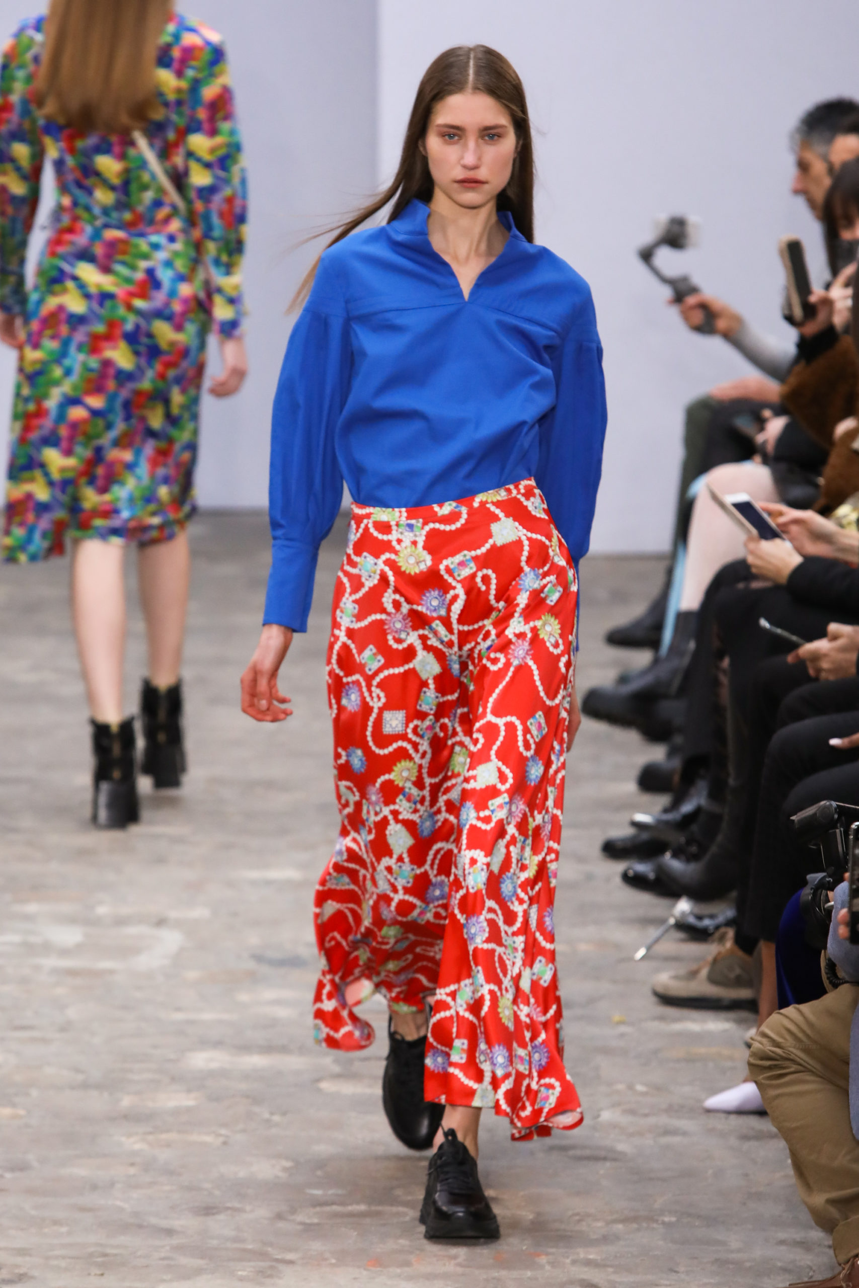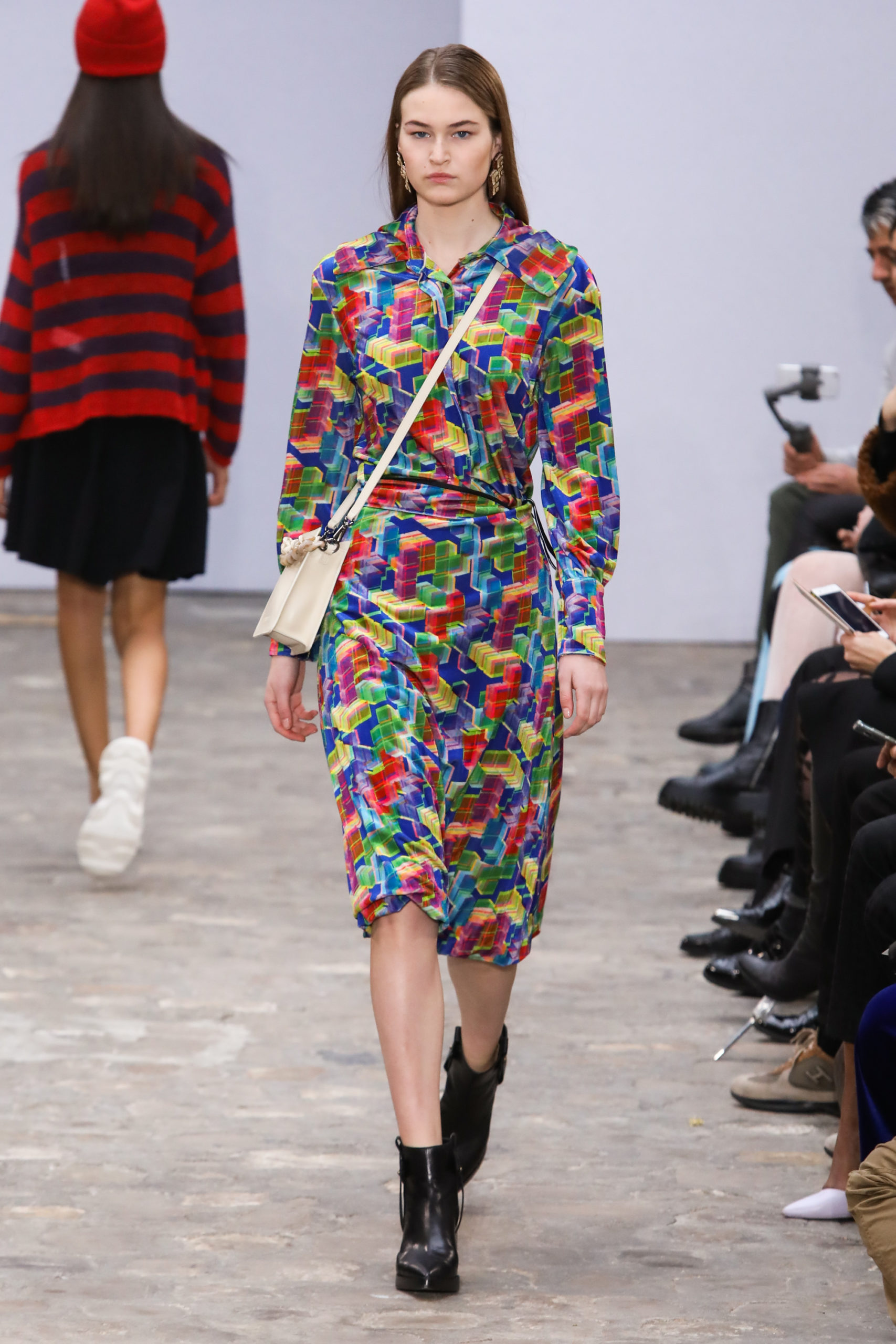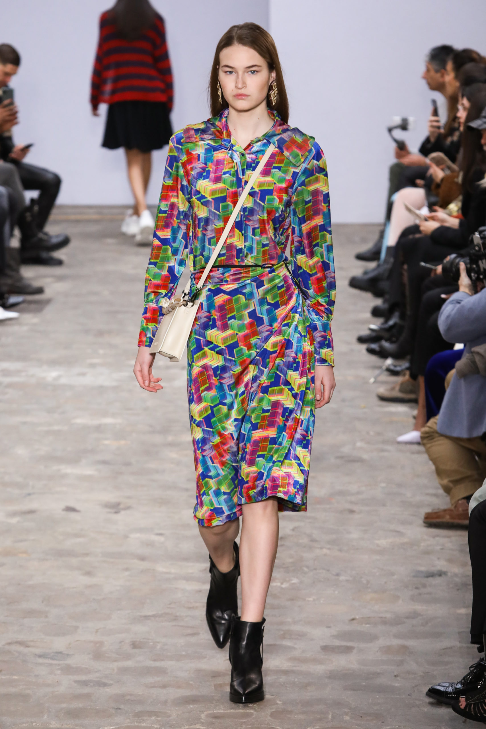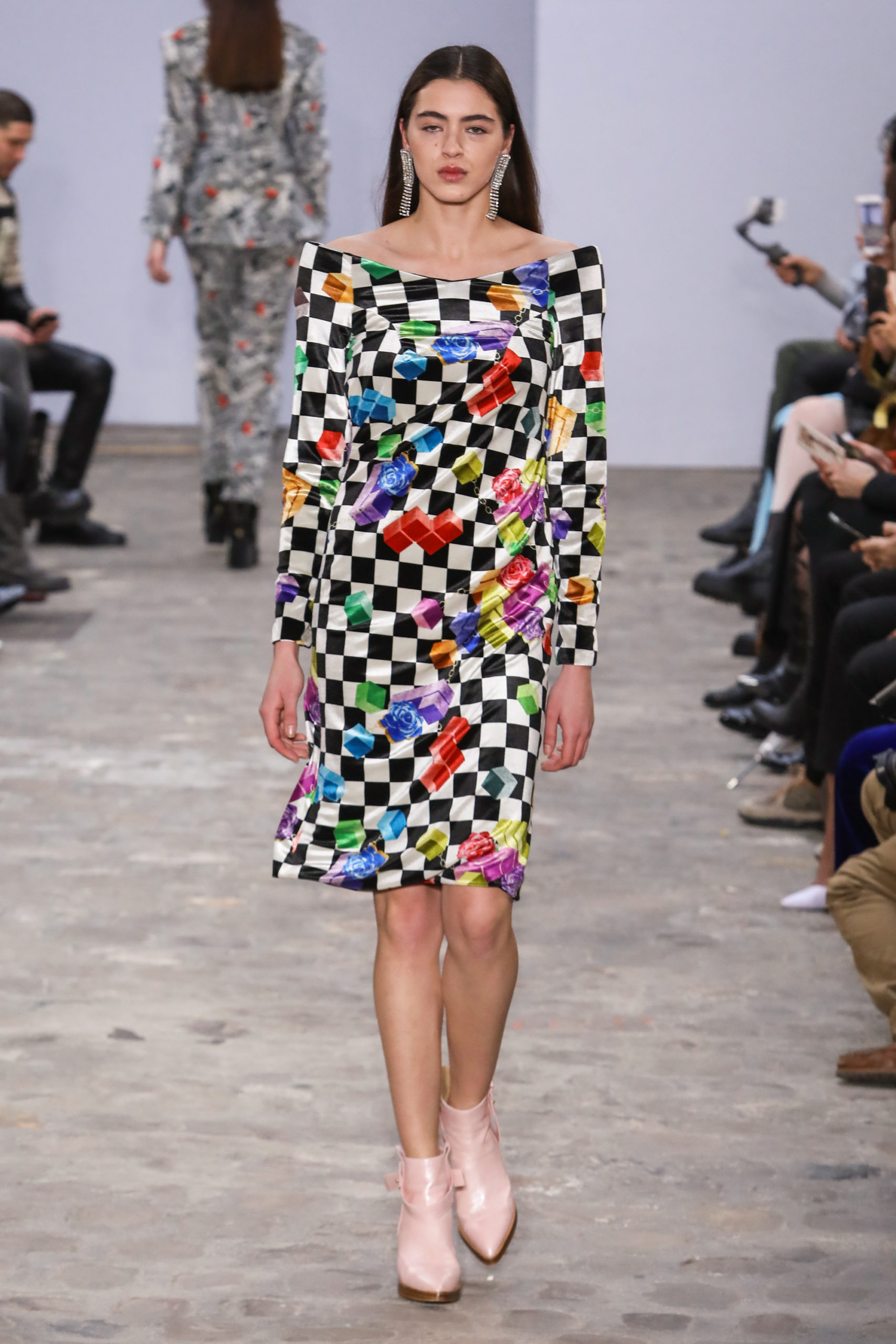 The Fall/Winter 2020 collection was inspired by the puzzle game Tetris. The designer transferred her passion for video games to garments. With a mix of cubism and pixel art, she created the prints for the opulent velvet dress and skirt. The prints were hand-drawn by designer, composed of tetrominoes and other motifs. The fabric was ordered and manufactured in France and Italy. The use of organdie, silk, satin, and velvet for the empire and mermaid flared dress, extols the female shape. The use of virgin wool for the oversize coat brings out stronger and higher quality. The use of cotton is comfortable and easy to wear.