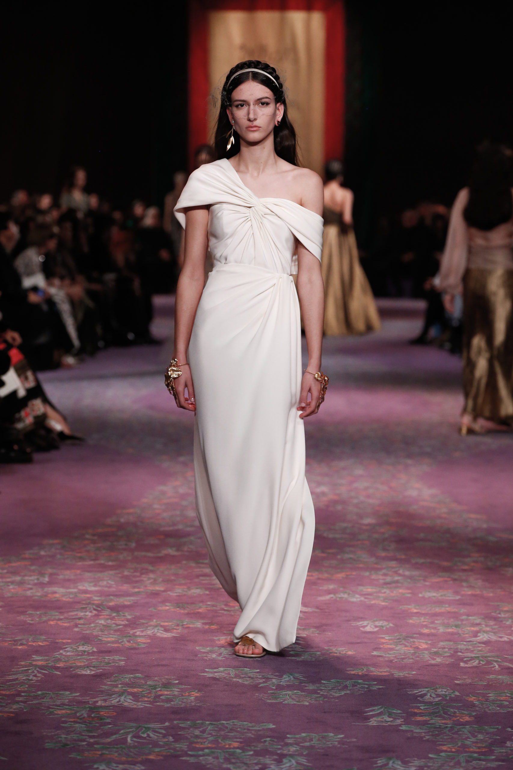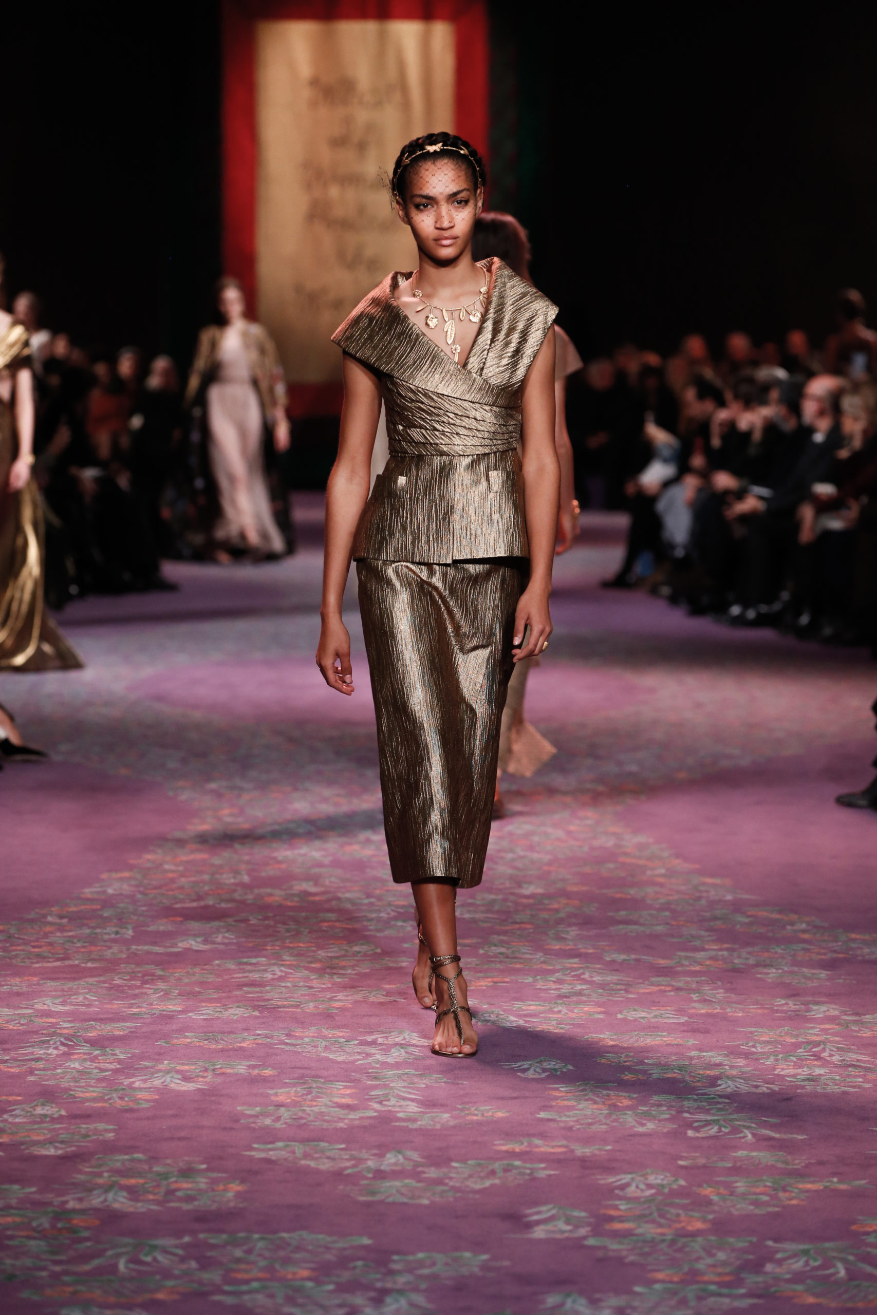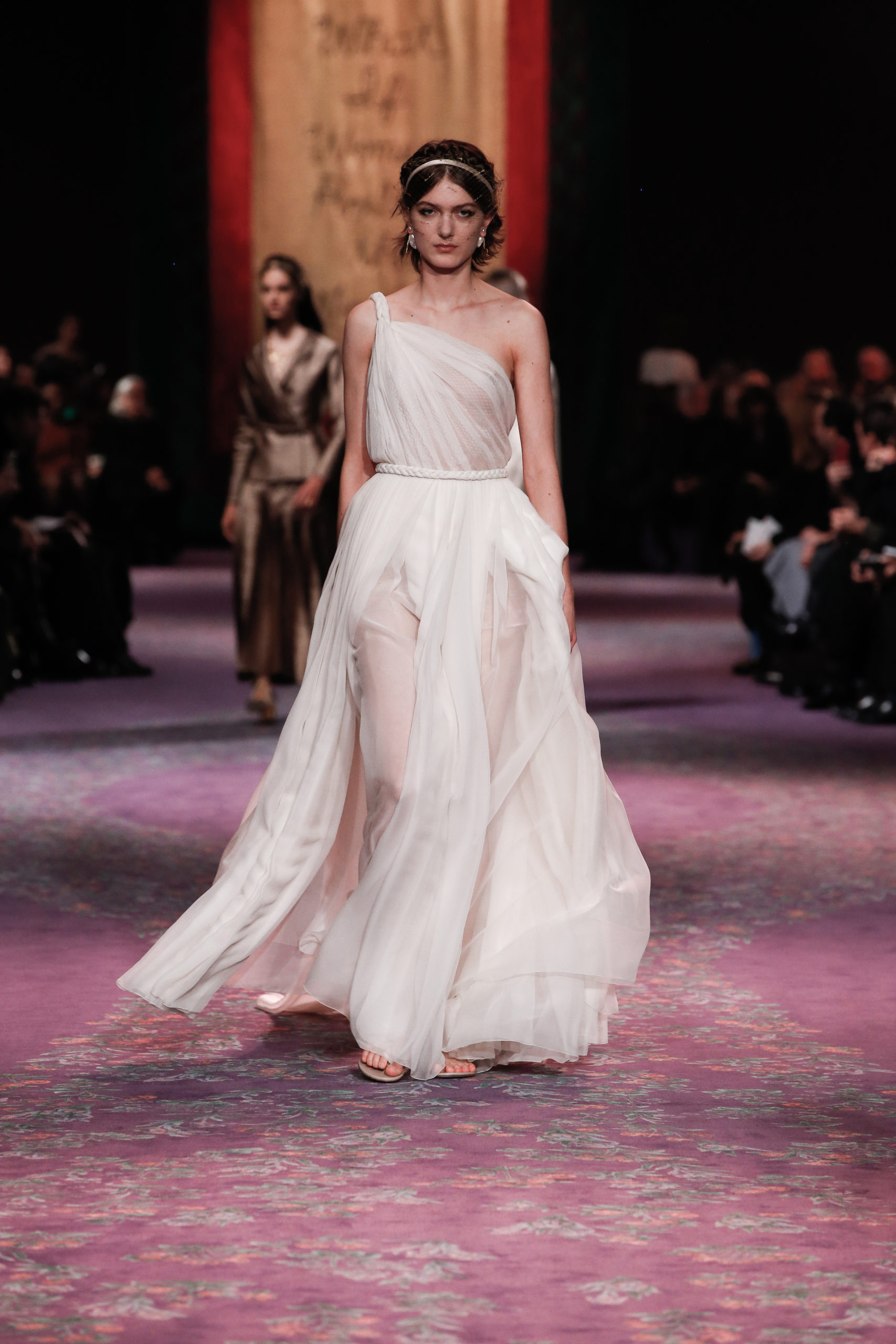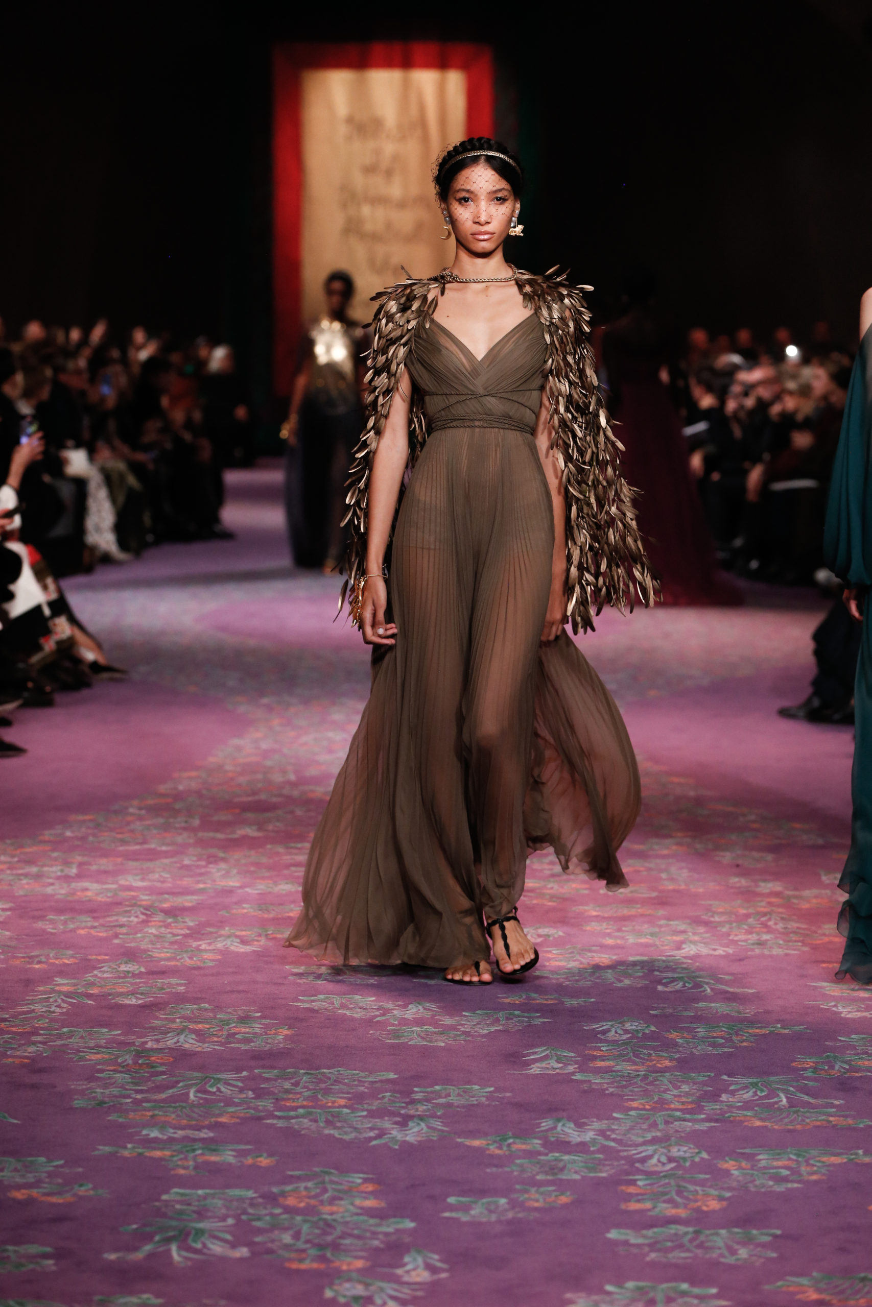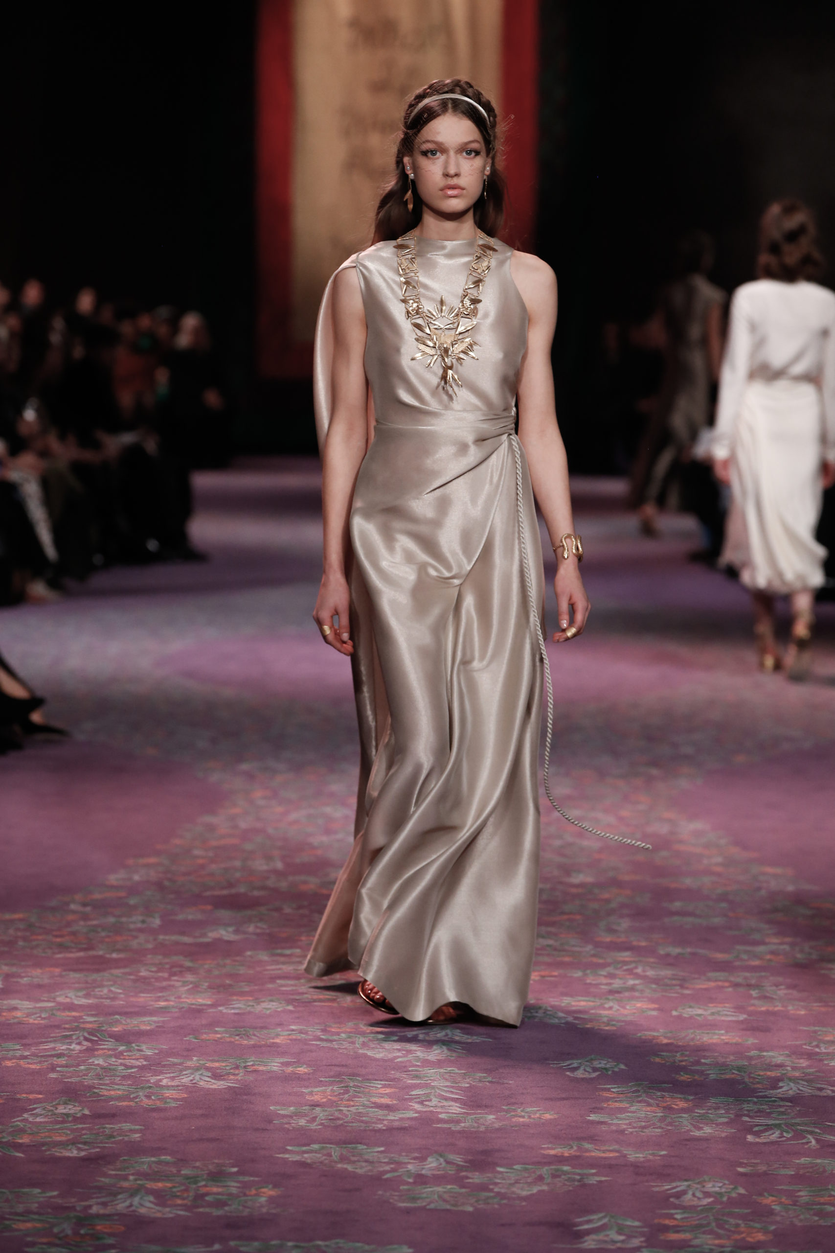 A l’occasion de la collection haute couture printemps-été 2020, Maria Grazia Chiuri poursuit sa réflexion engagée sur la complexité des rapports entre féminisme et féminité. Écrin du défilé, l’œuvre monumentale The Female Divine, spécialement conçue par l’artiste américaine Judy Chicago et figurant le corps d’une déesse, illumine les silhouettes à la beauté triomphante. Reflet de cette puissance créative, le péplum, au caractère essentiel et atemporel, est sublimé par le savoir-faire virtuose de Dior. Une palette de couleurs douces et des tissus plus masculins, magnifiés par l’or, ponctuent ces modèles d’exception empreints de spiritualité.