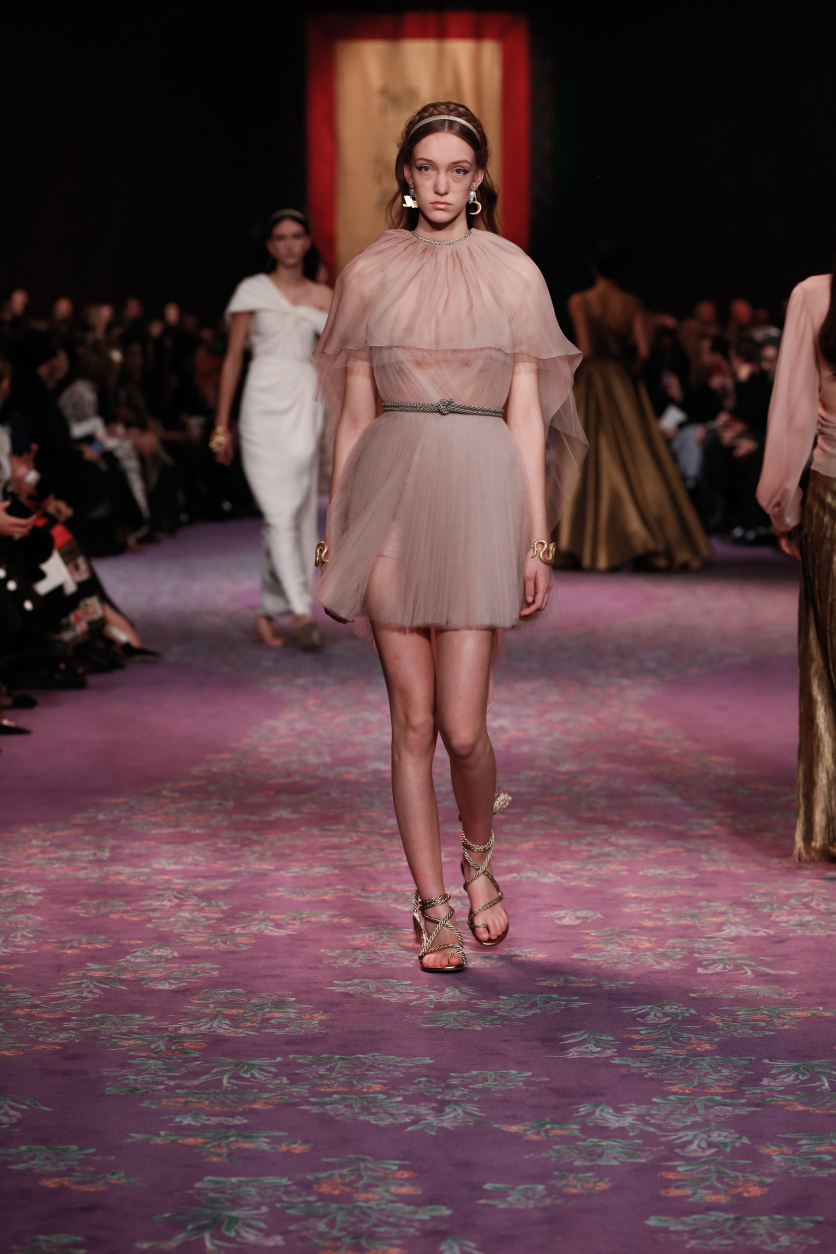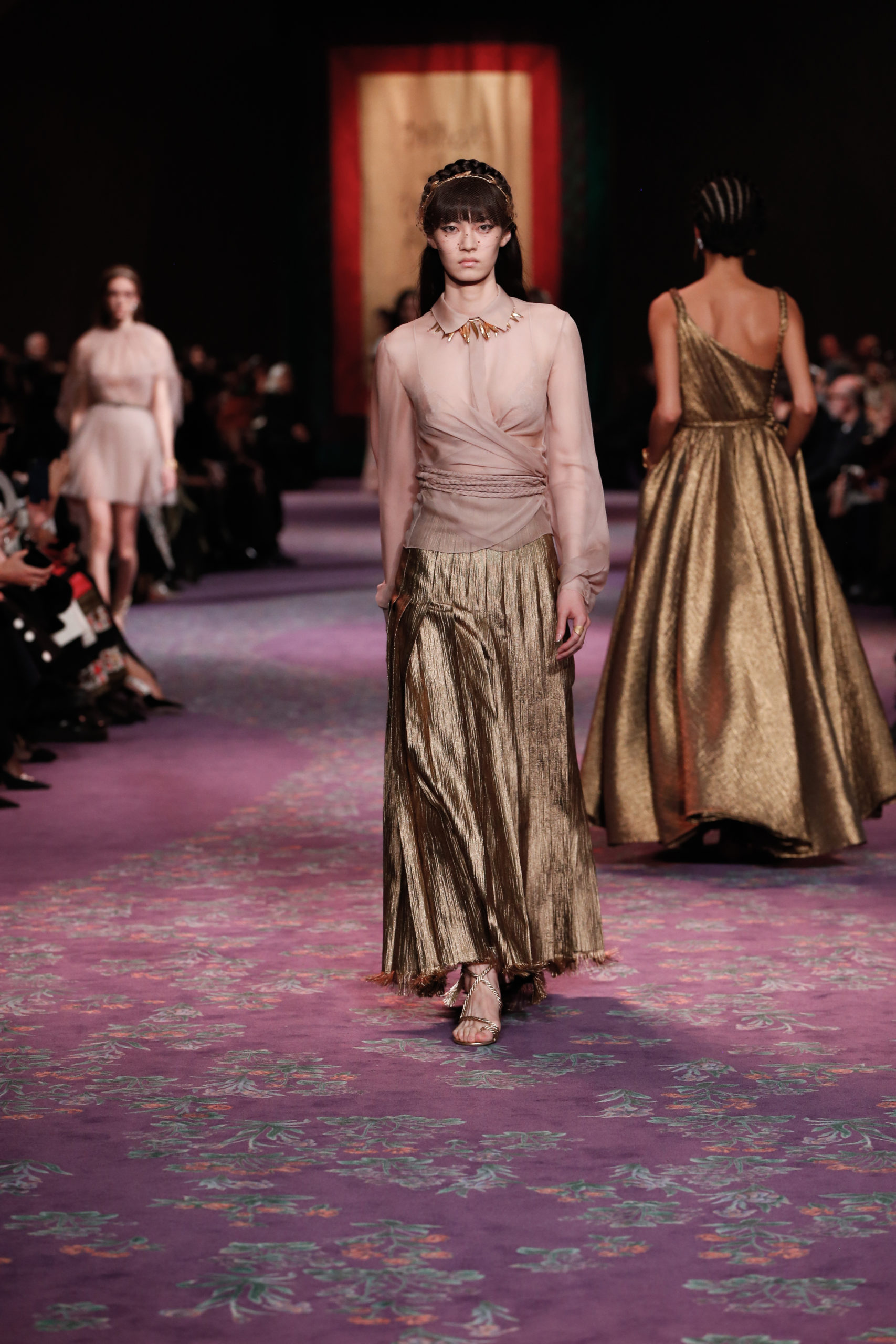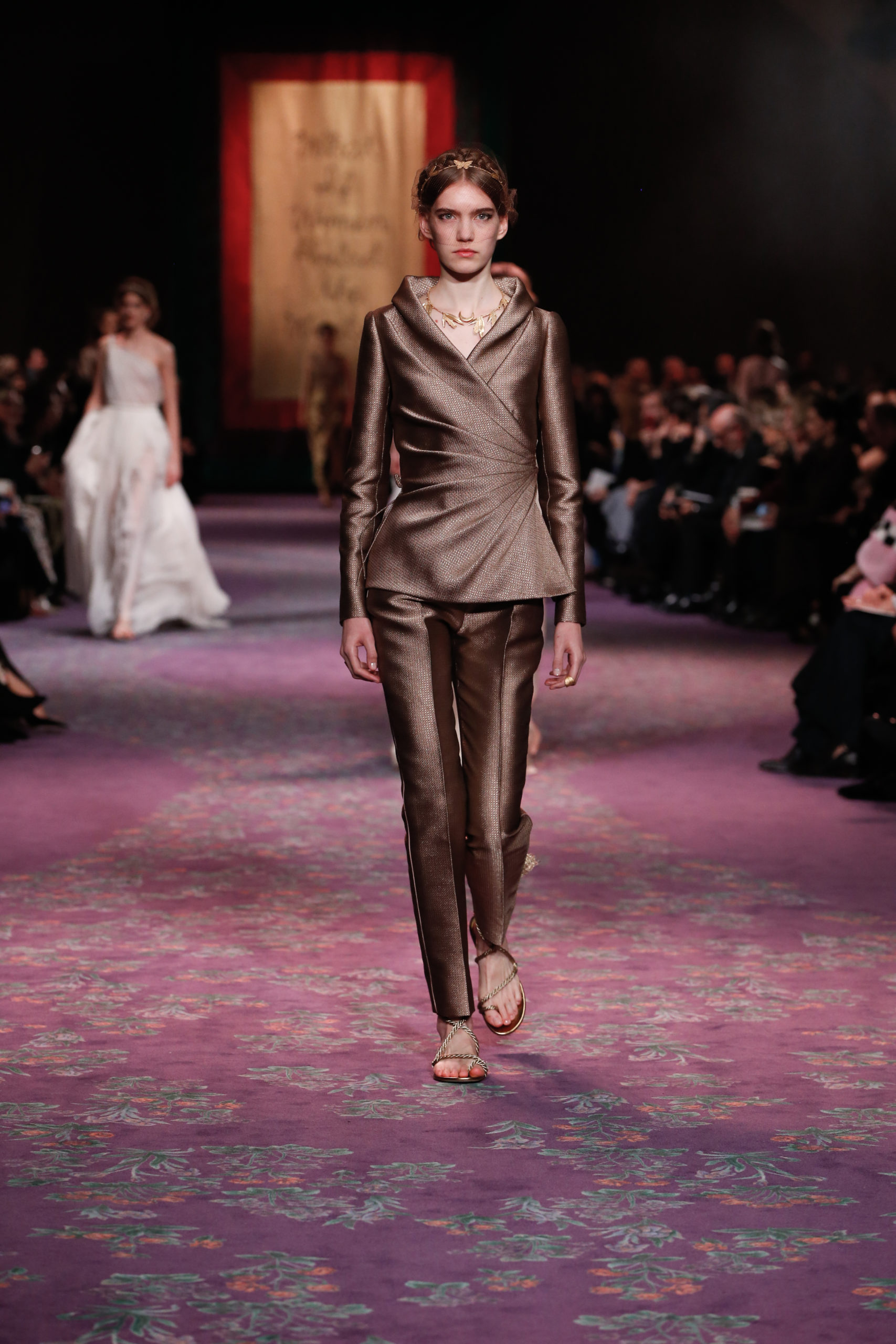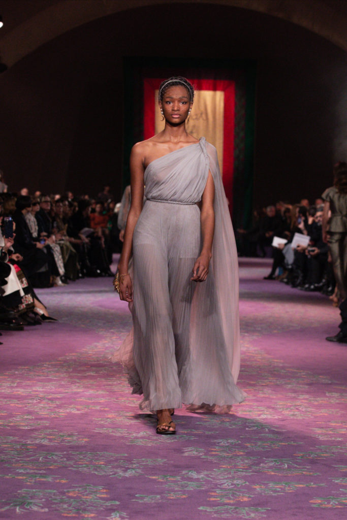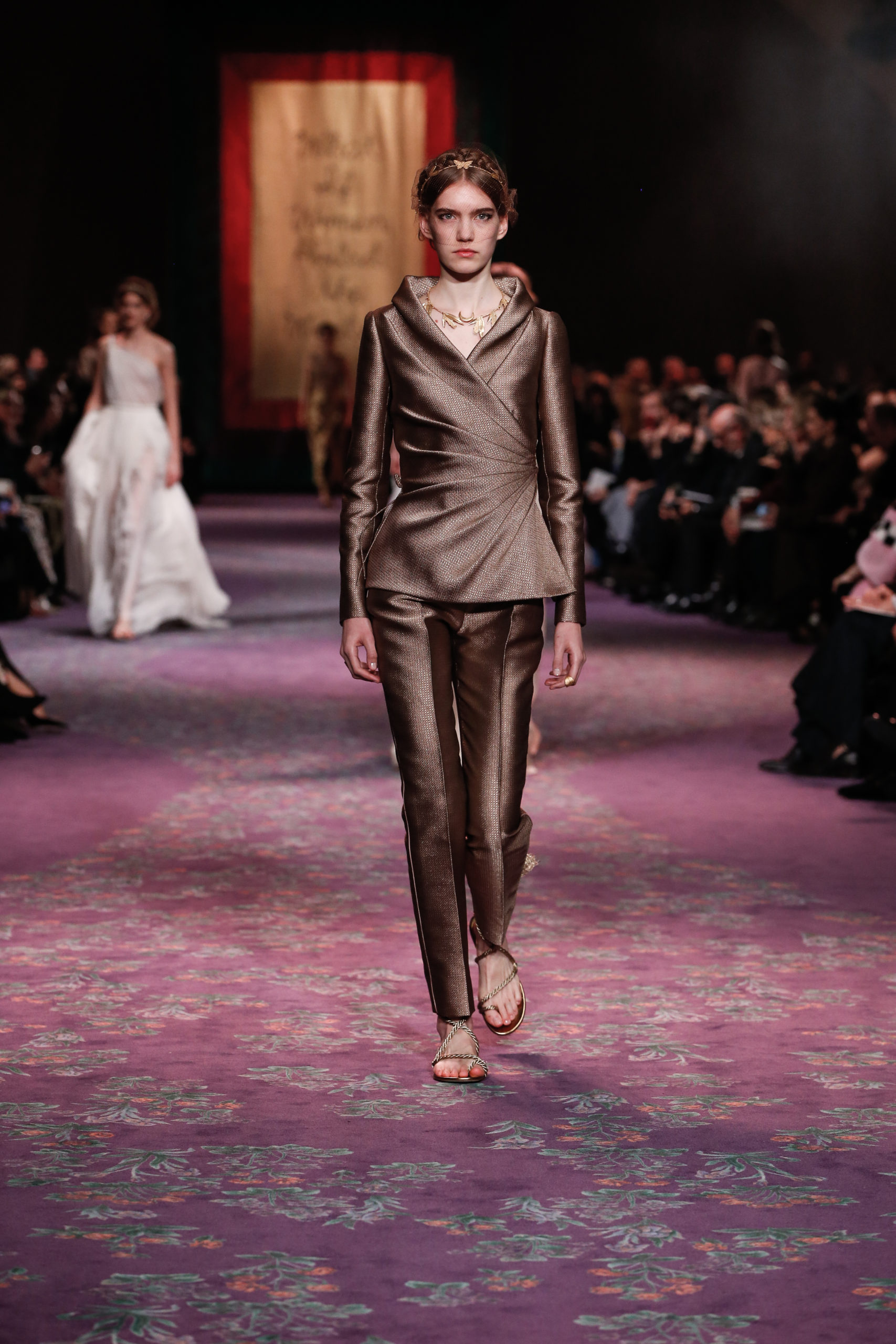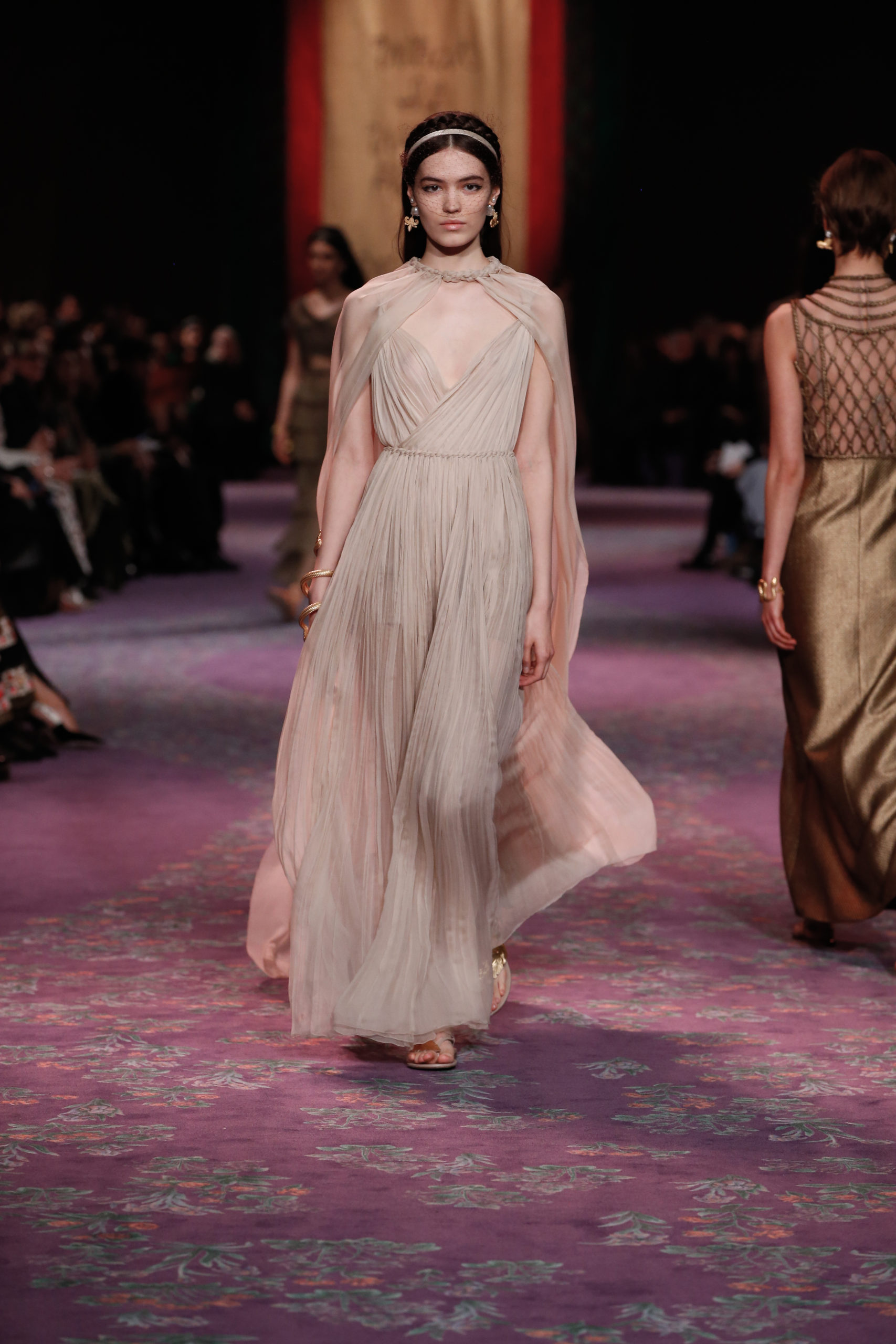 A l’occasion de la collection haute couture printemps-été 2020, Maria Grazia Chiuri poursuit sa réflexion engagée sur la complexité des rapports entre féminisme et féminité. Écrin du défilé, l’œuvre monumentale The Female Divine, spécialement conçue par l’artiste américaine Judy Chicago et figurant le corps d’une déesse, illumine les silhouettes à la beauté triomphante. Reflet de cette puissance créative, le péplum, au caractère essentiel et atemporel, est sublimé par le savoir-faire virtuose de Dior. Une palette de couleurs douces et des tissus plus masculins, magnifiés par l’or, ponctuent ces modèles d’exception empreints de spiritualité.