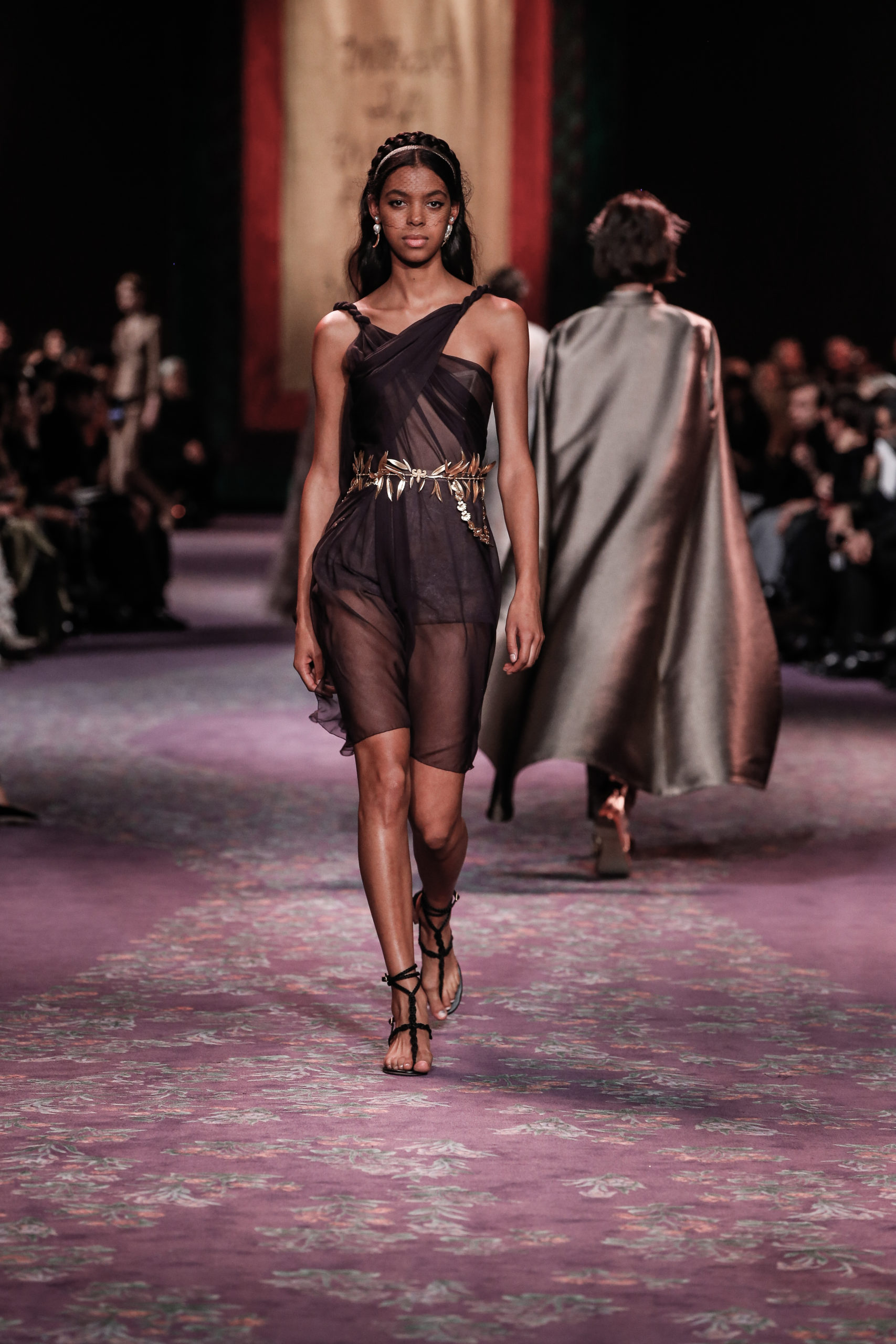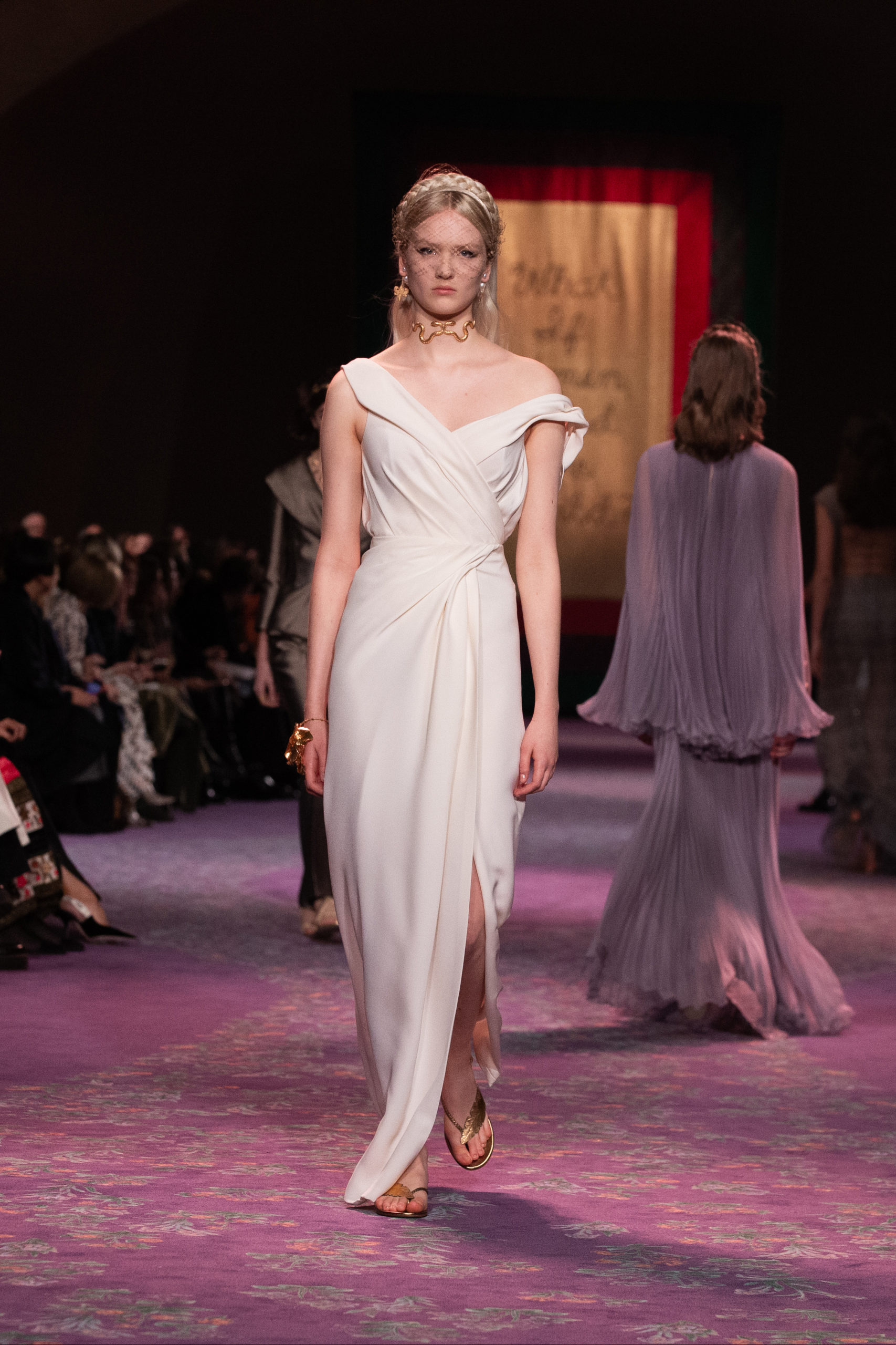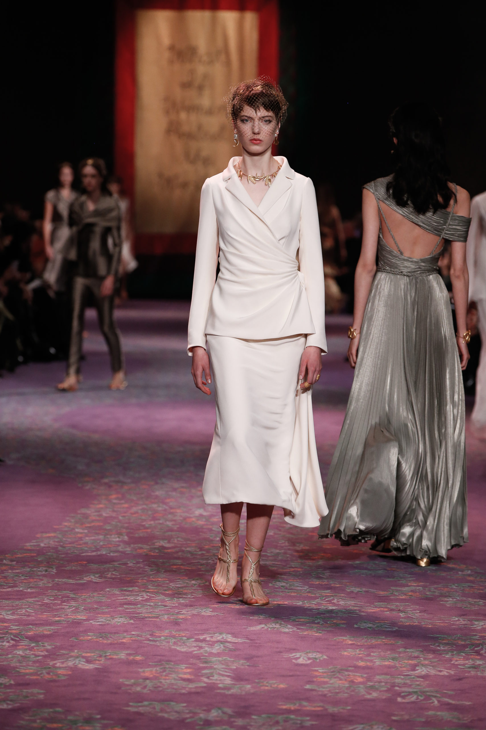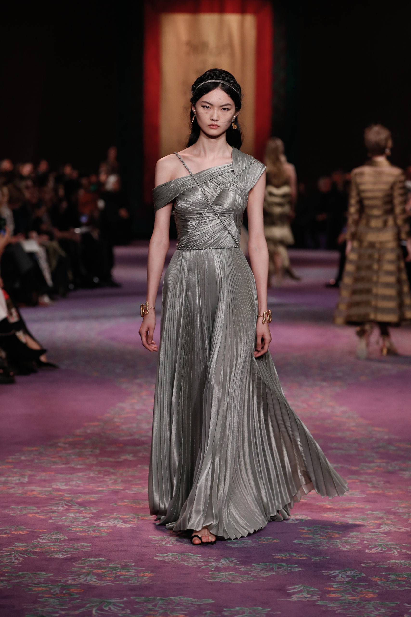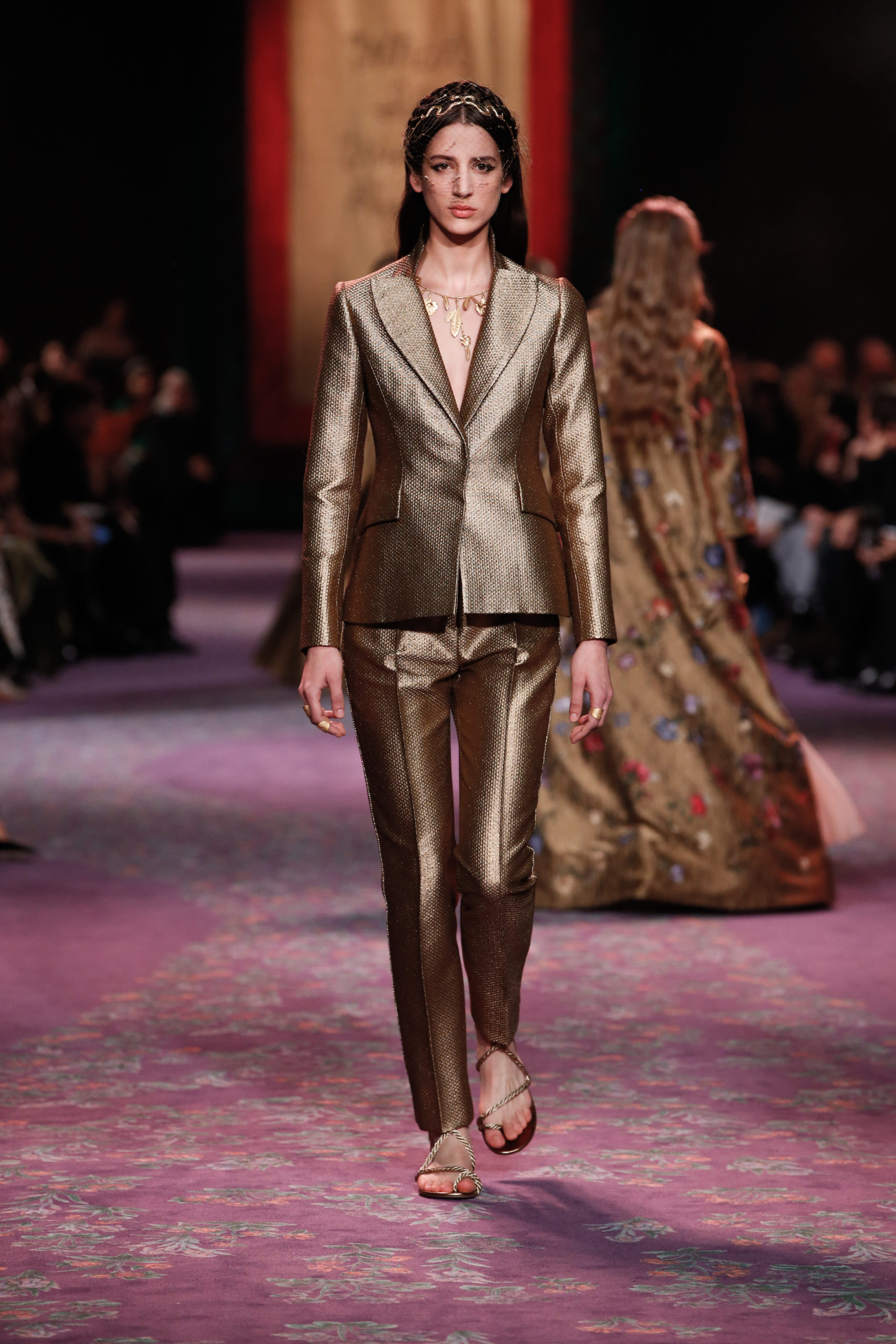 A l’occasion de la collection haute couture printemps-été 2020, Maria Grazia Chiuri poursuit sa réflexion engagée sur la complexité des rapports entre féminisme et féminité. Écrin du défilé, l’œuvre monumentale The Female Divine, spécialement conçue par l’artiste américaine Judy Chicago et figurant le corps d’une déesse, illumine les silhouettes à la beauté triomphante. Reflet de cette puissance créative, le péplum, au caractère essentiel et atemporel, est sublimé par le savoir-faire virtuose de Dior. Une palette de couleurs douces et des tissus plus masculins, magnifiés par l’or, ponctuent ces modèles d’exception empreints de spiritualité.