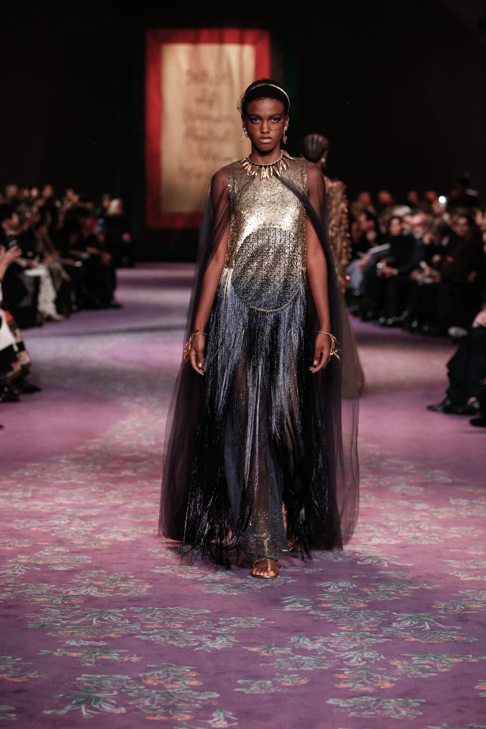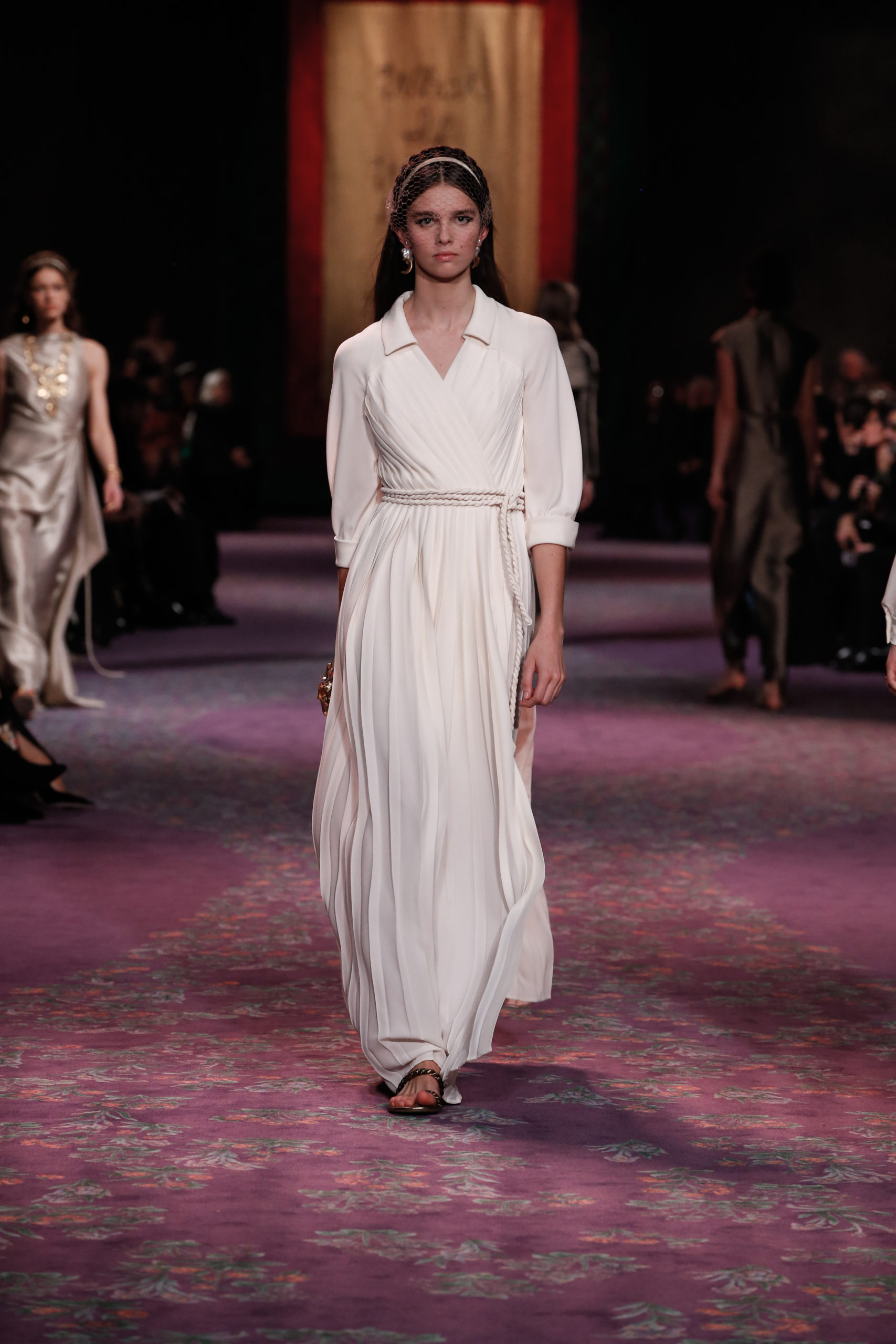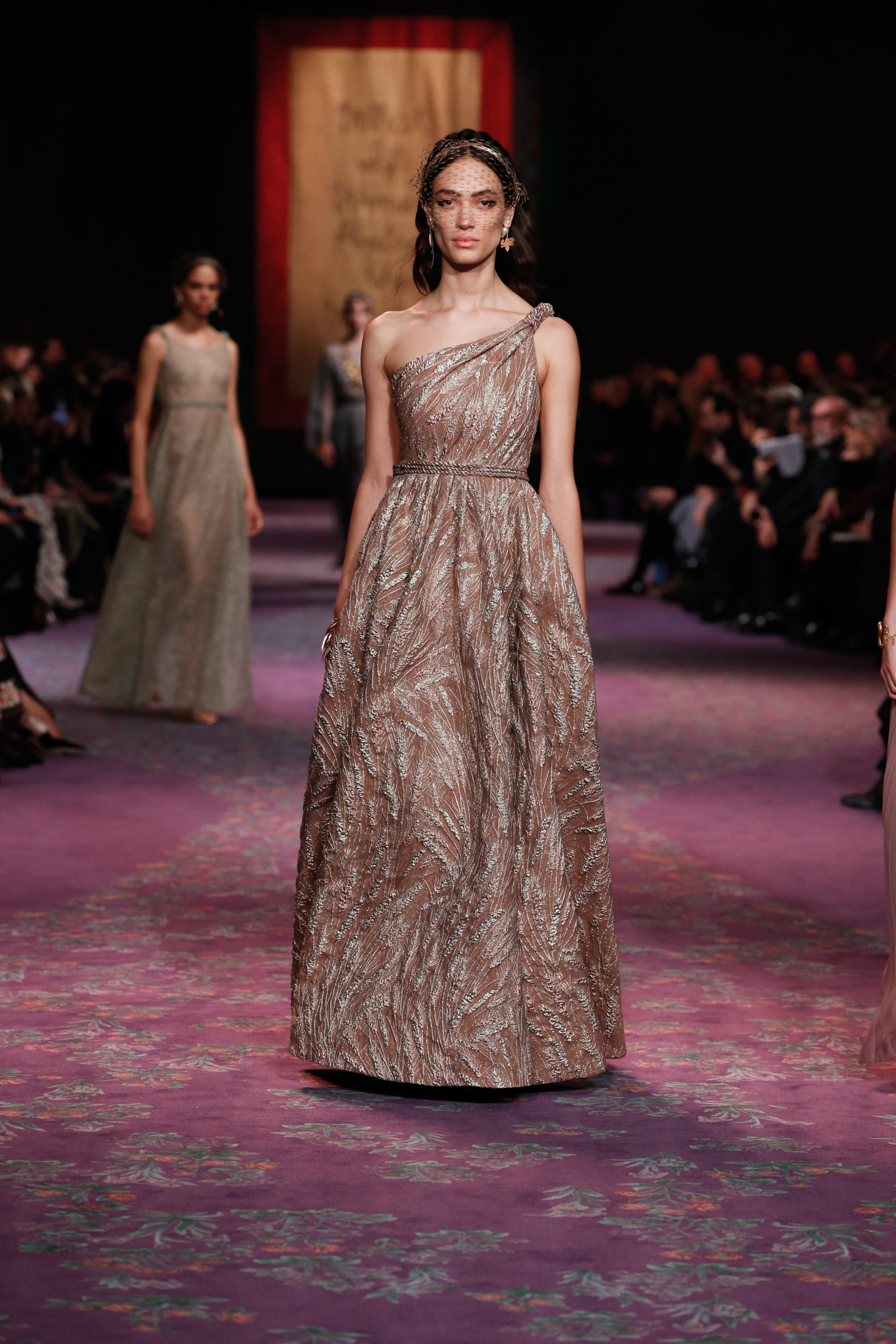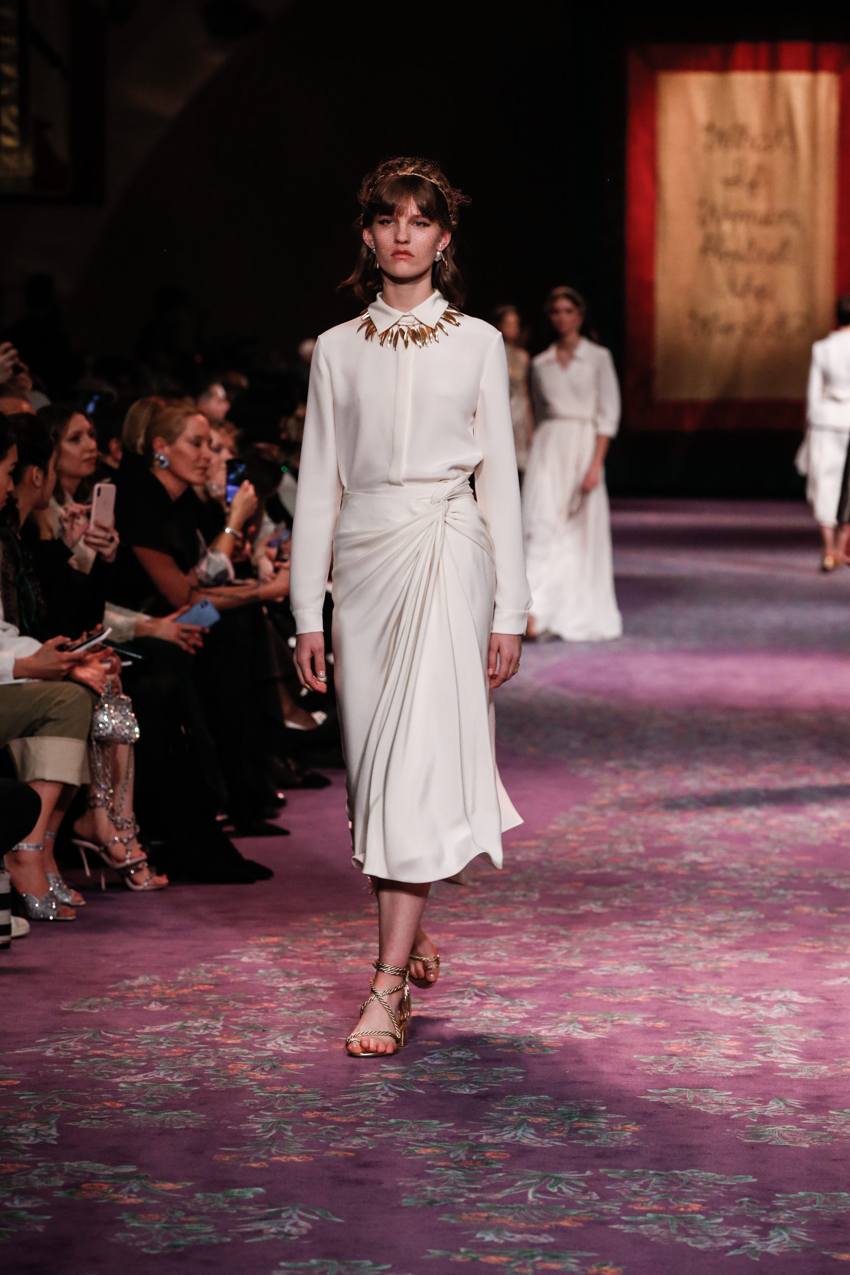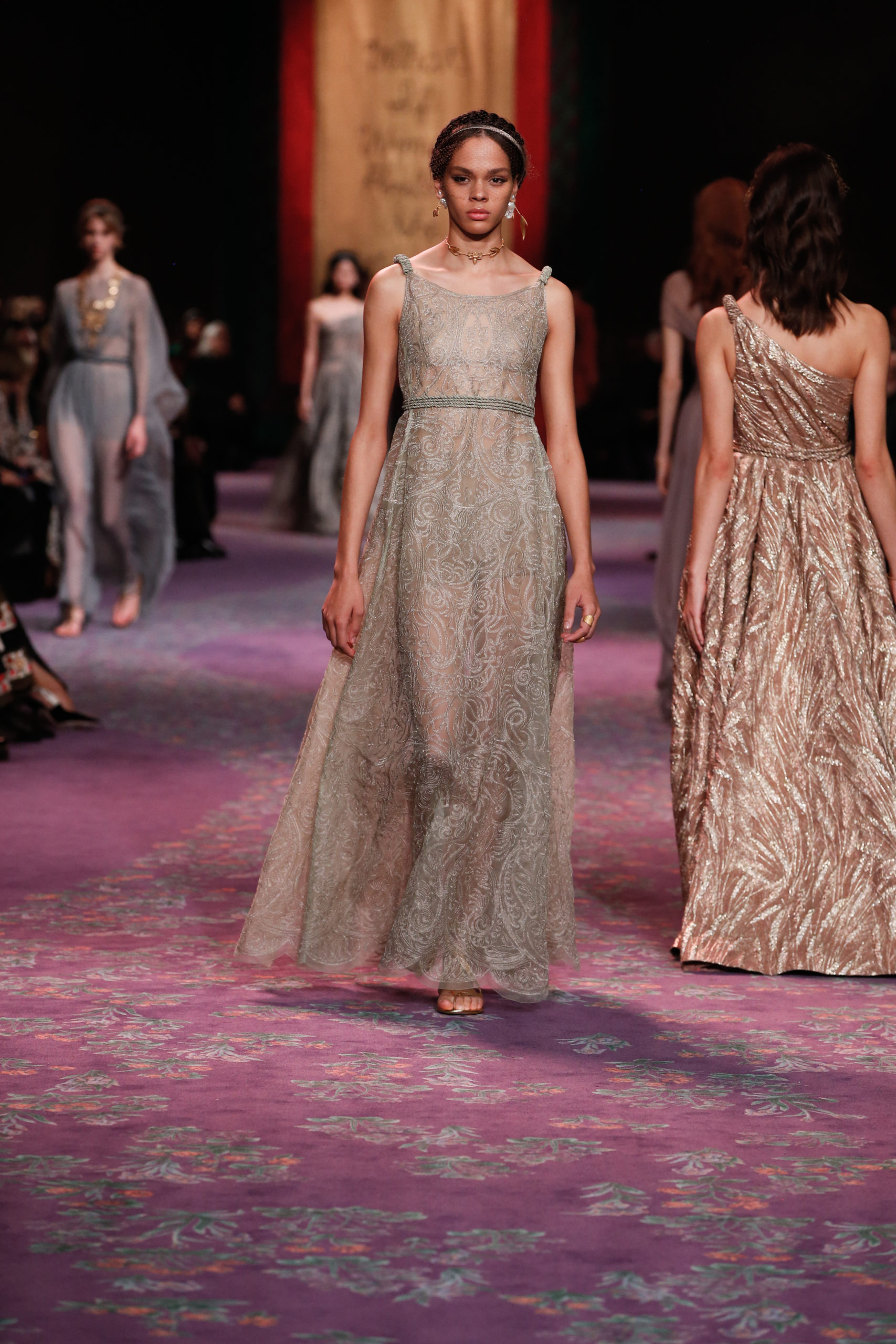 A l’occasion de la collection haute couture printemps-été 2020, Maria Grazia Chiuri poursuit sa réflexion engagée sur la complexité des rapports entre féminisme et féminité. Écrin du défilé, l’œuvre monumentale The Female Divine, spécialement conçue par l’artiste américaine Judy Chicago et figurant le corps d’une déesse, illumine les silhouettes à la beauté triomphante. Reflet de cette puissance créative, le péplum, au caractère essentiel et atemporel, est sublimé par le savoir-faire virtuose de Dior. Une palette de couleurs douces et des tissus plus masculins, magnifiés par l’or, ponctuent ces modèles d’exception empreints de spiritualité.