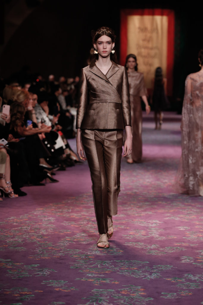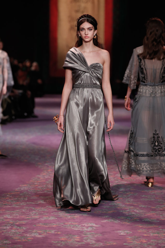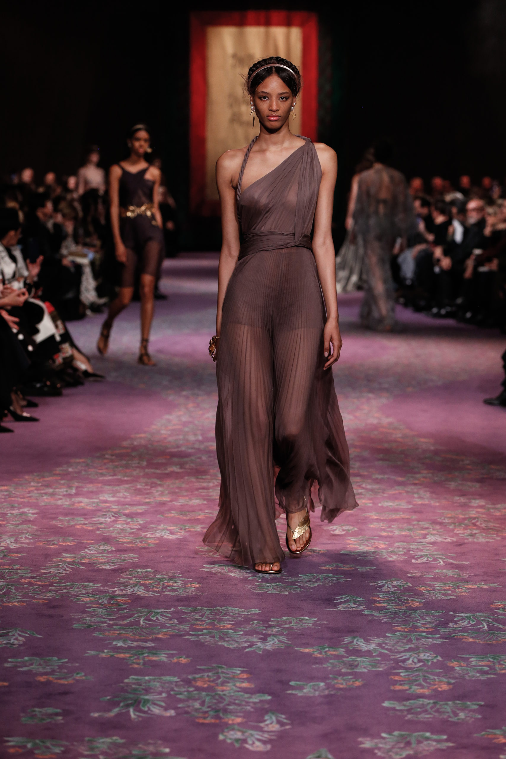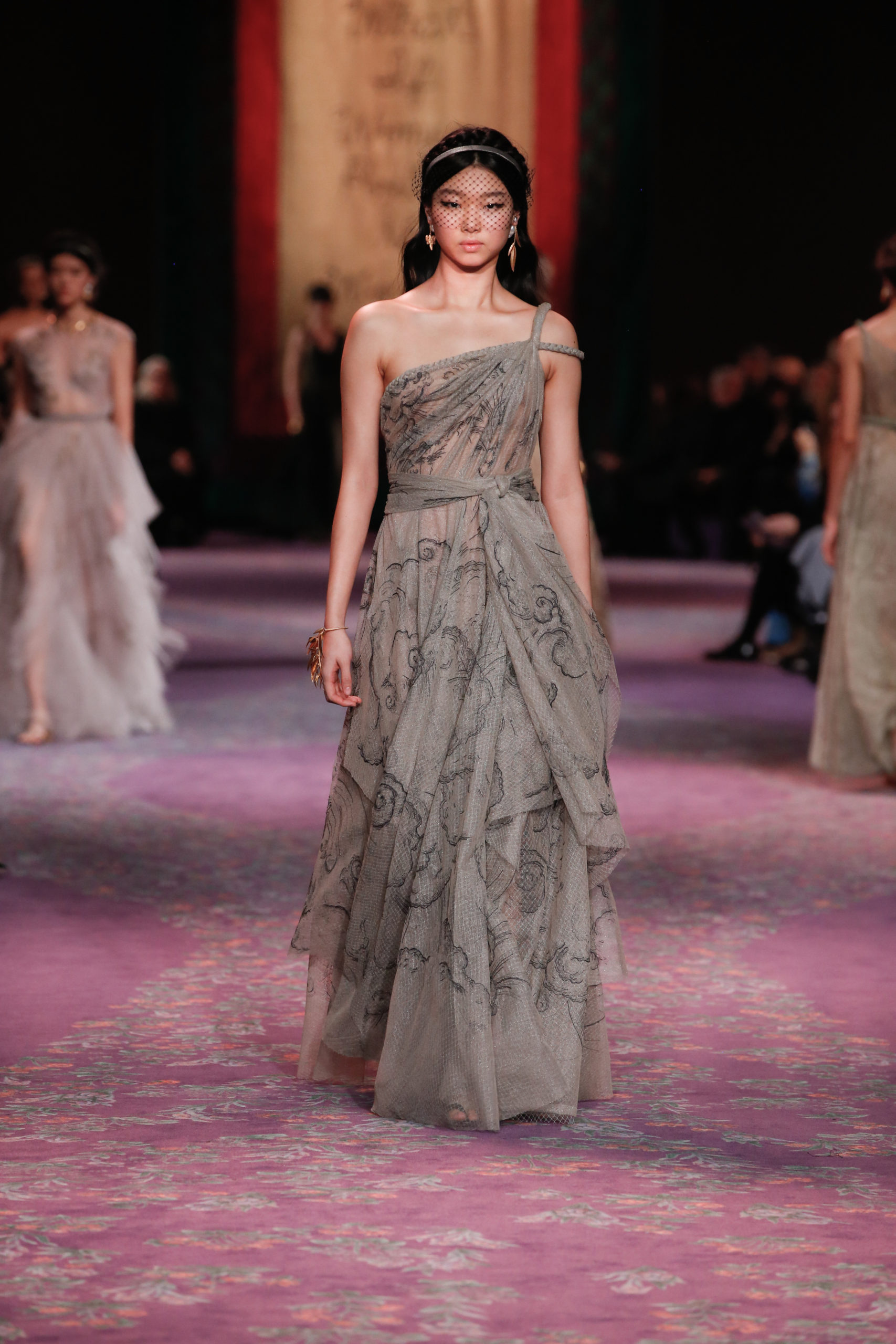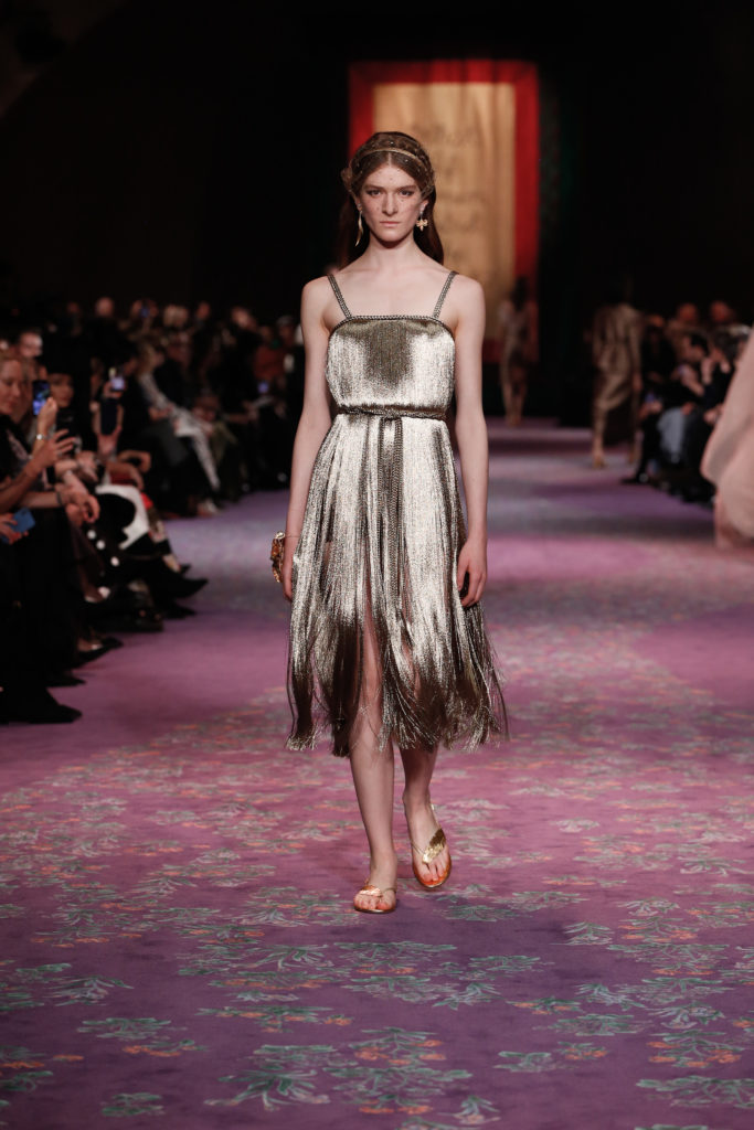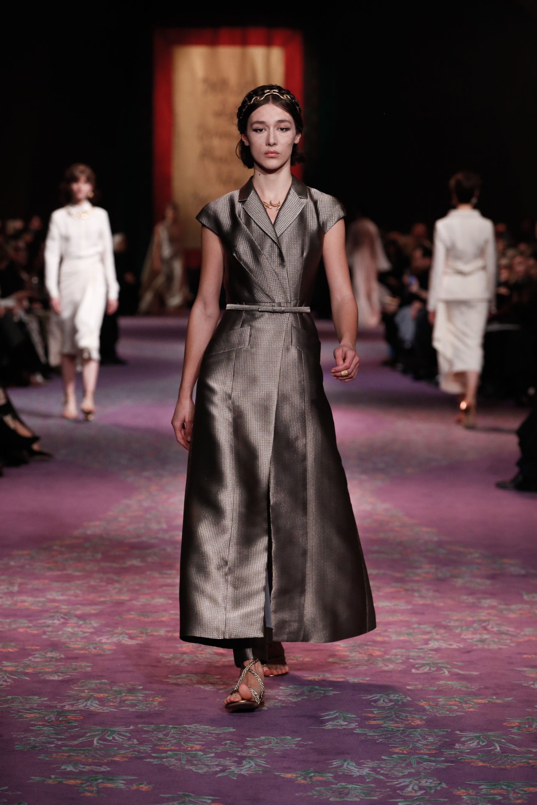 A l’occasion de la collection haute couture printemps-été 2020, Maria Grazia Chiuri poursuit sa réflexion engagée sur la complexité des rapports entre féminisme et féminité. Écrin du défilé, l’œuvre monumentale The Female Divine, spécialement conçue par l’artiste américaine Judy Chicago et figurant le corps d’une déesse, illumine les silhouettes à la beauté triomphante. Reflet de cette puissance créative, le péplum, au caractère essentiel et atemporel, est sublimé par le savoir-faire virtuose de Dior. Une palette de couleurs douces et des tissus plus masculins, magnifiés par l’or, ponctuent ces modèles d’exception empreints de spiritualité.