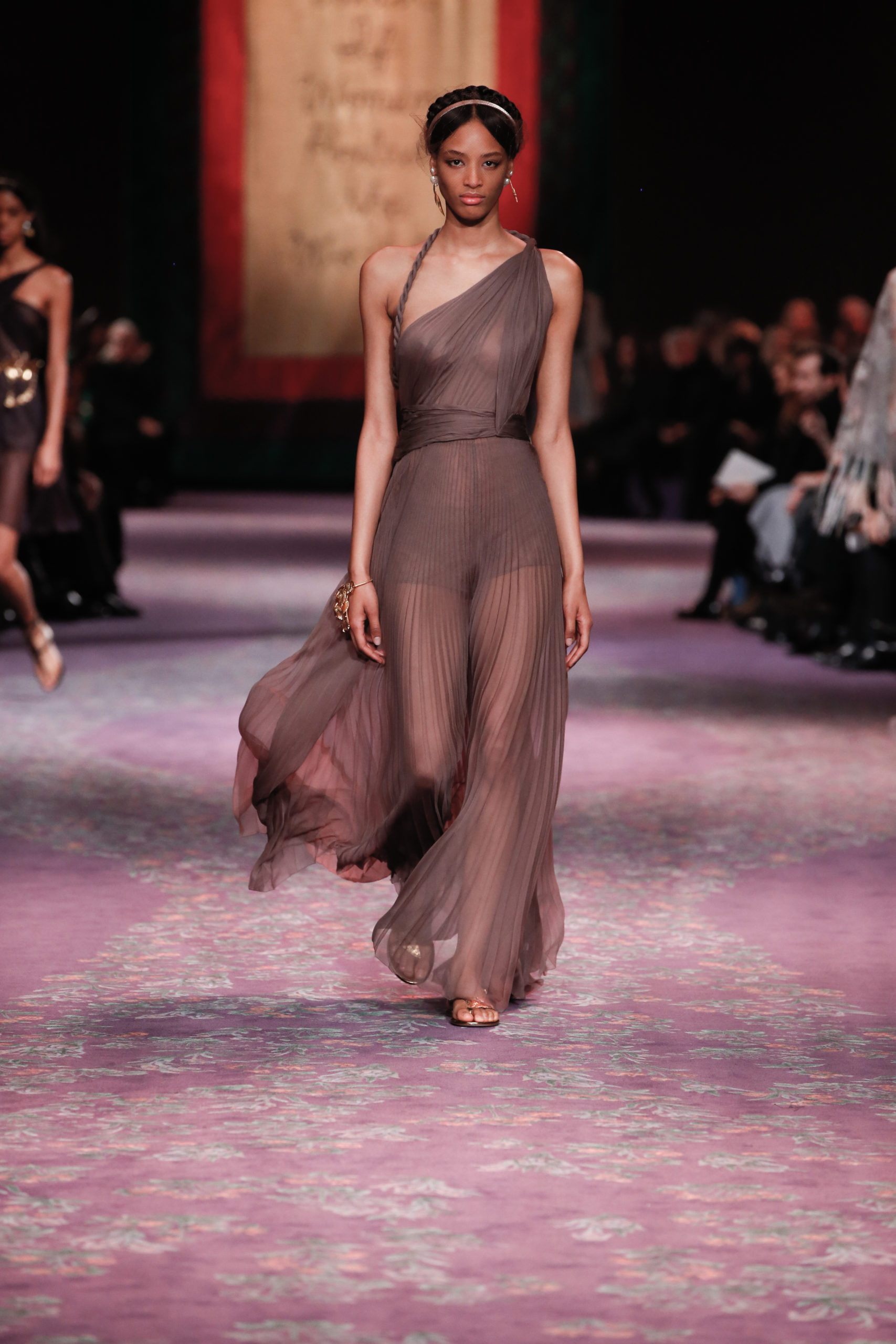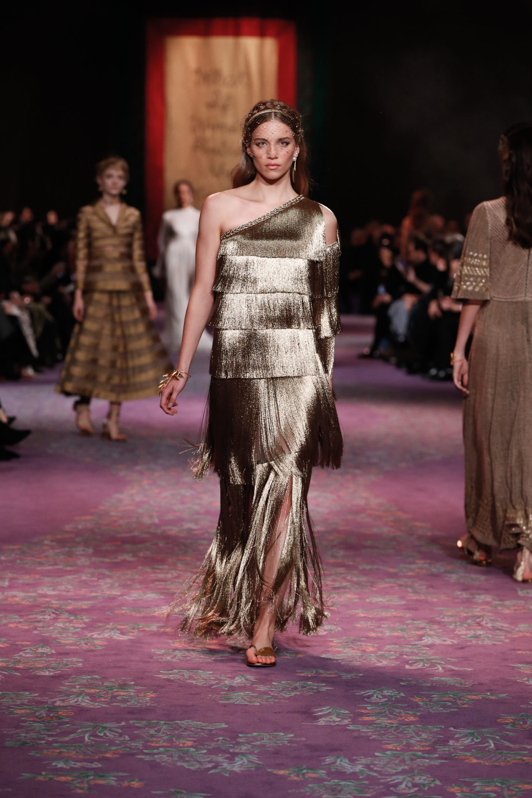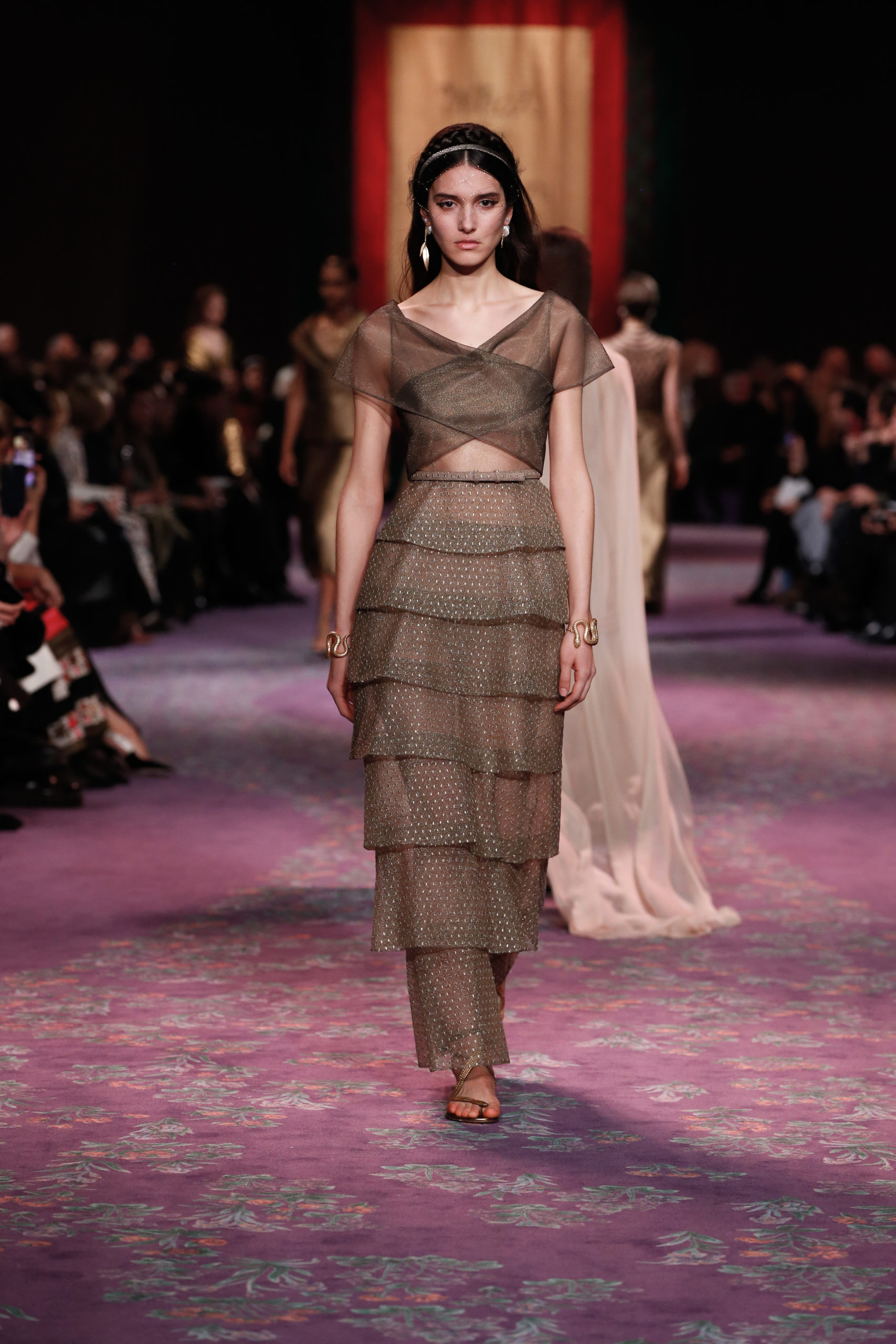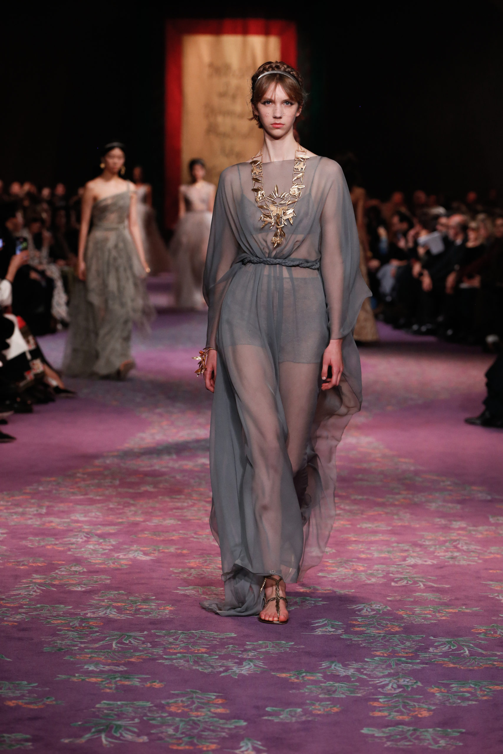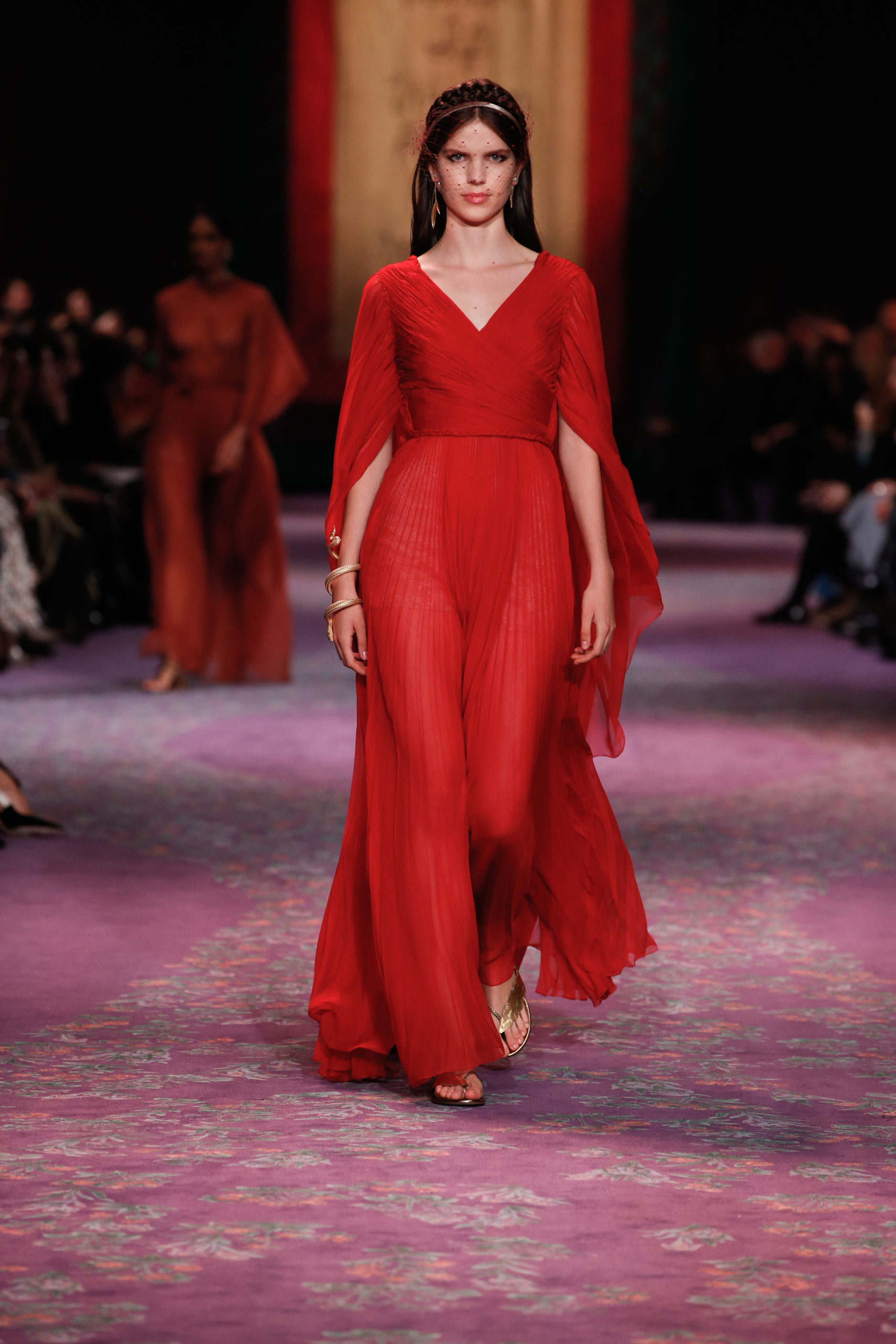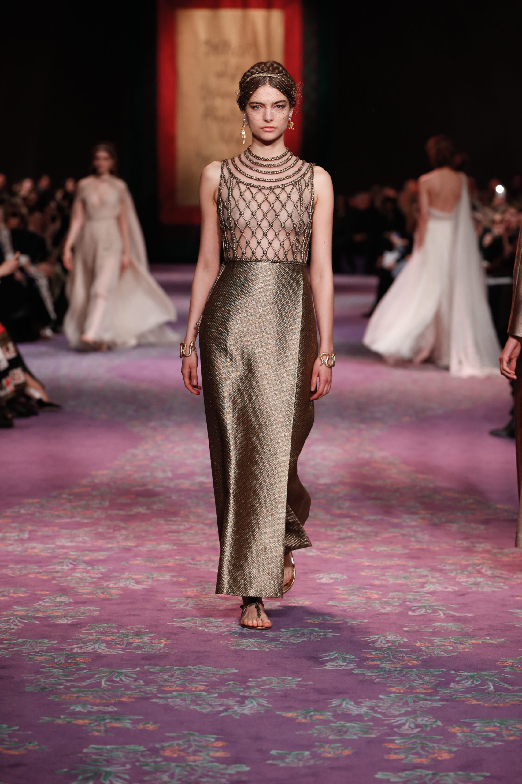A l’occasion de la collection haute couture printemps-été 2020, Maria Grazia Chiuri poursuit sa réflexion engagée sur la complexité des rapports entre féminisme et féminité. Écrin du défilé, l’œuvre monumentale The Female Divine, spécialement conçue par l’artiste américaine Judy Chicago et figurant le corps d’une déesse, illumine les silhouettes à la beauté triomphante. Reflet de cette puissance créative, le péplum, au caractère essentiel et atemporel, est sublimé par le savoir-faire virtuose de Dior. Une palette de couleurs douces et des tissus plus masculins, magnifiés par l’or, ponctuent ces modèles d’exception empreints de spiritualité.